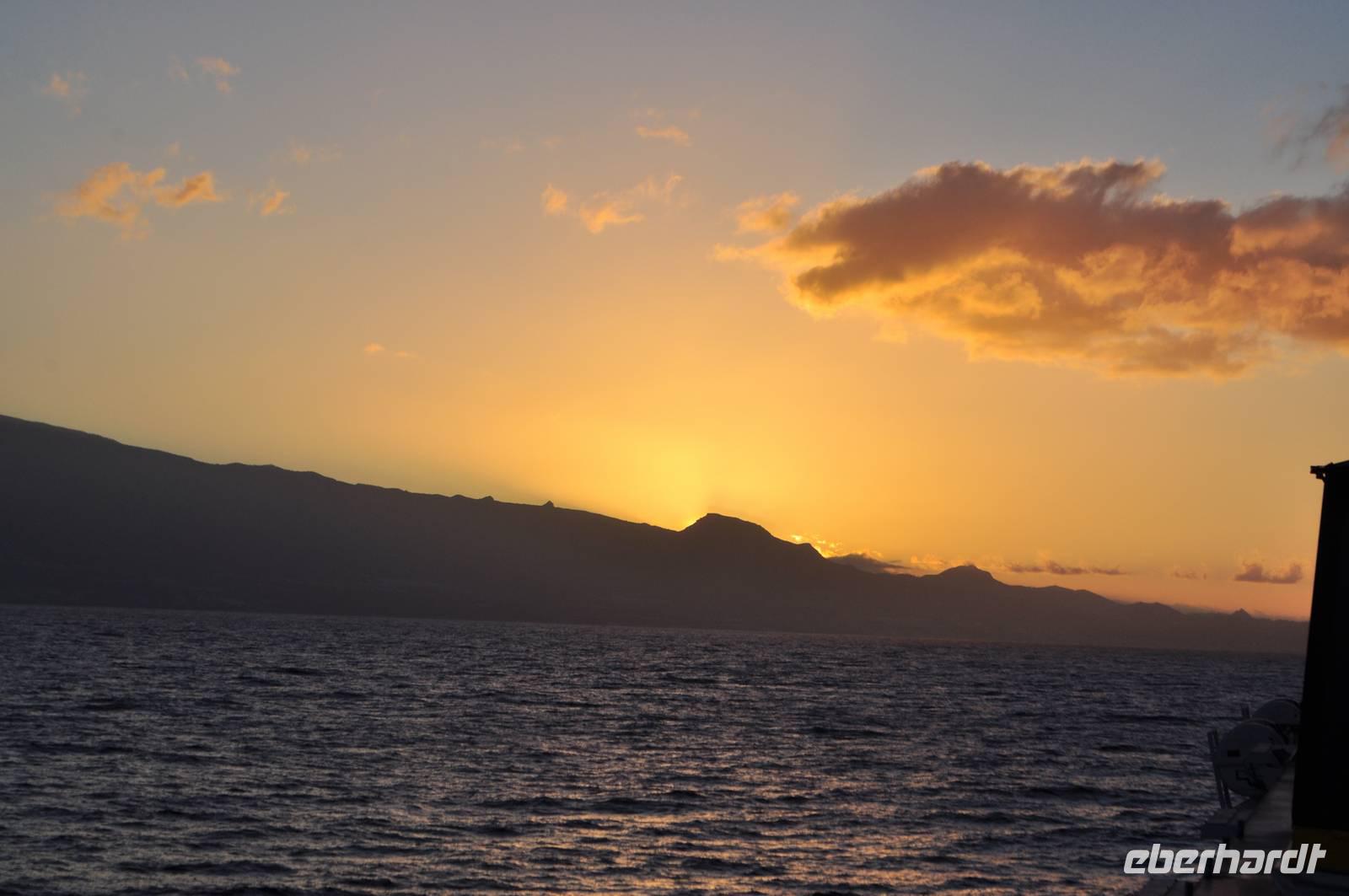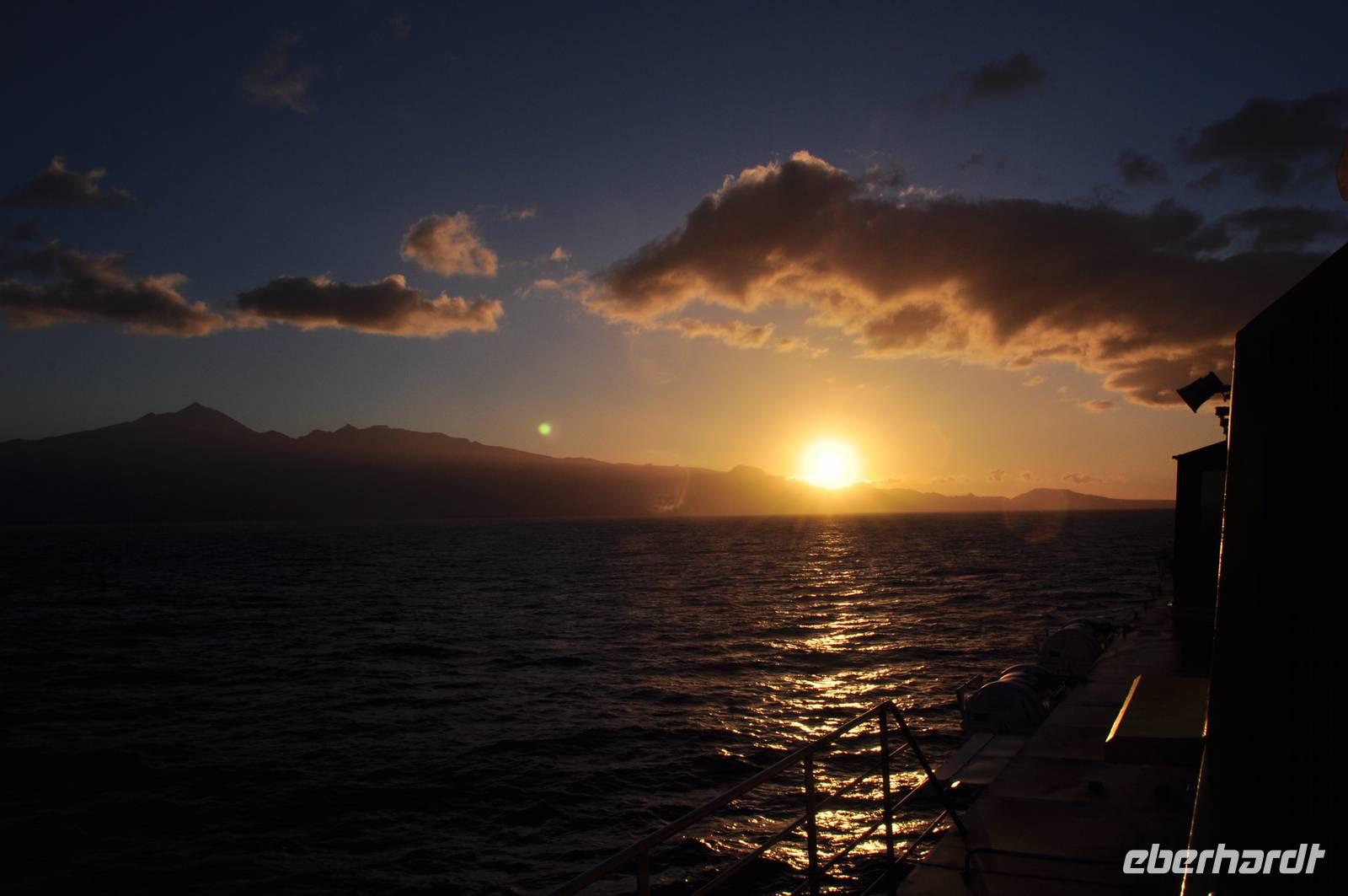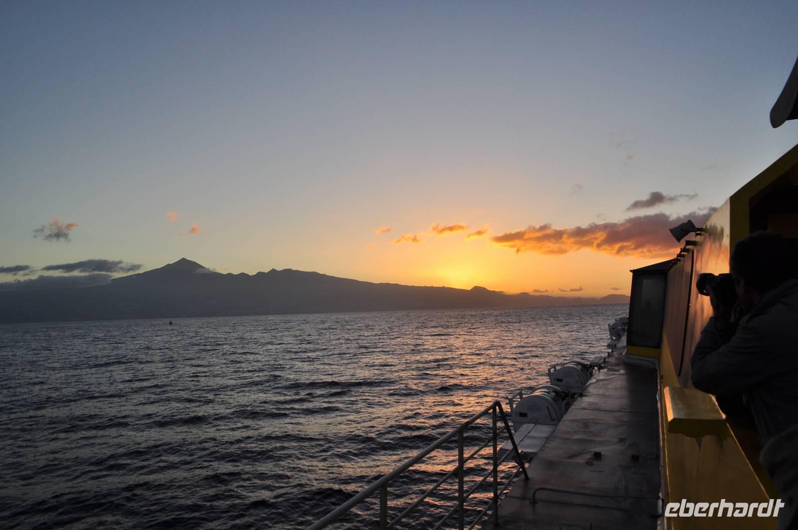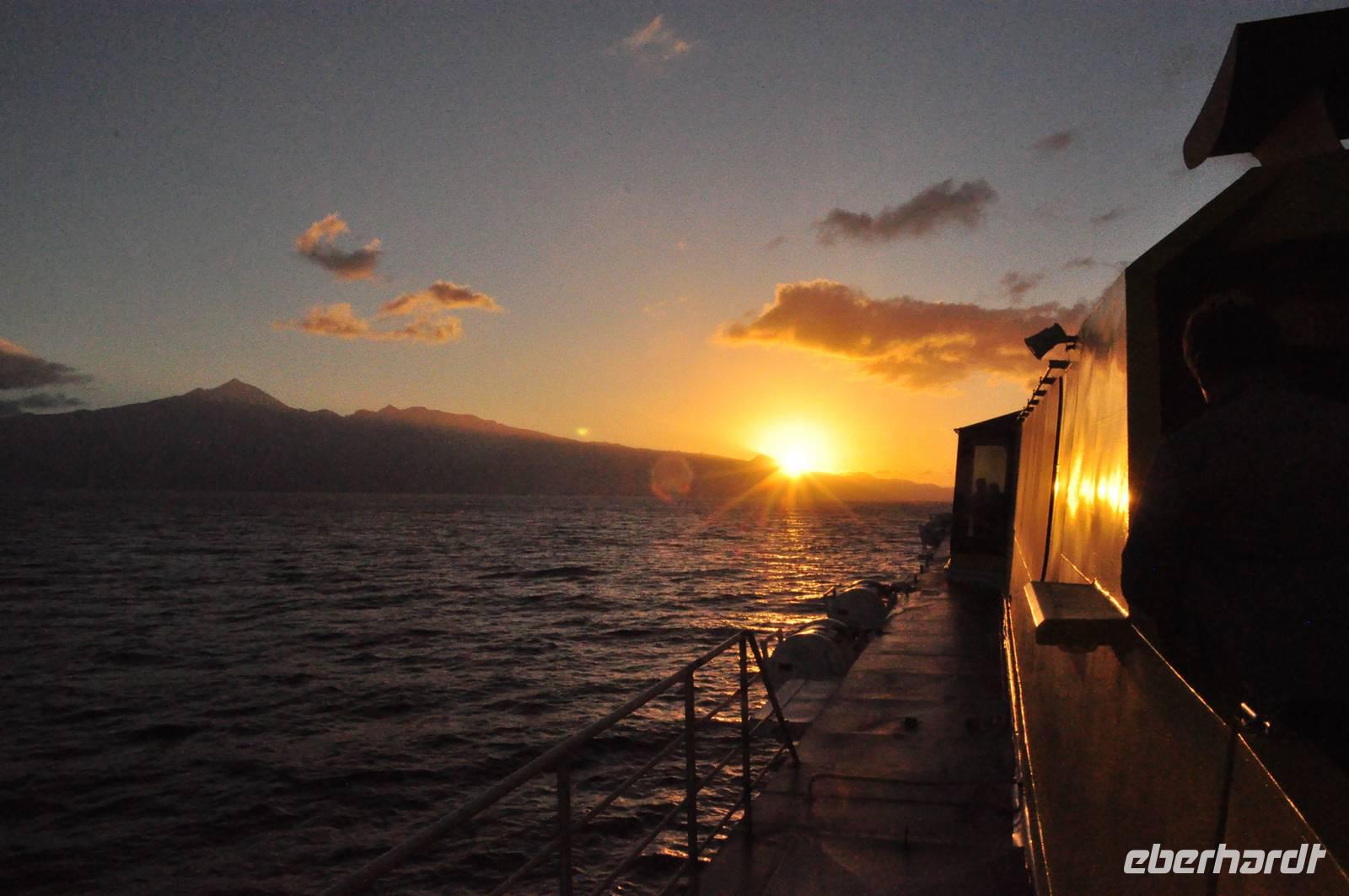 70 km/h fegt dieses Geschoss über das Wasser. In ca. 3 Stunden geht es über den Atlantik und über die Insel La Gomera nach Los Cristianos auf Teneriffa. Um 5.30 Uhr legt sie ab und erreicht pünktlich gegen 8.30 Uhr Teneriffa. Auf dem Weg von La Gomera nach Teneriffa erleben wir einen wunderschönen Sonnenaufgang über dem Teide.