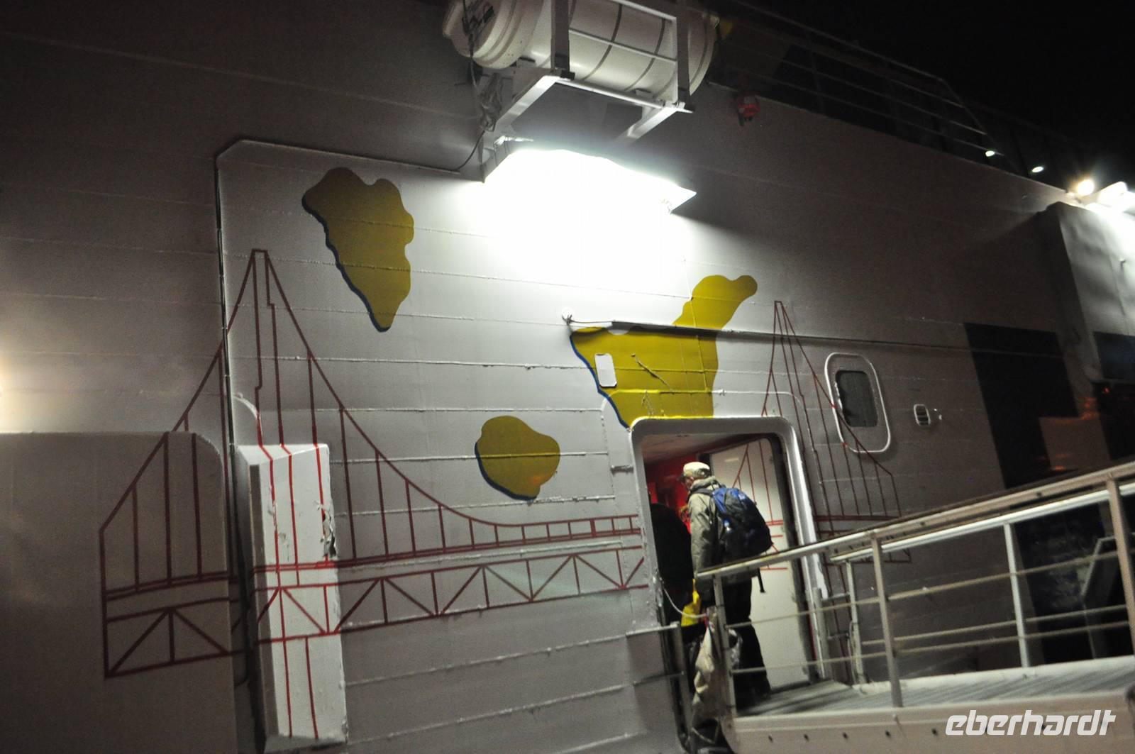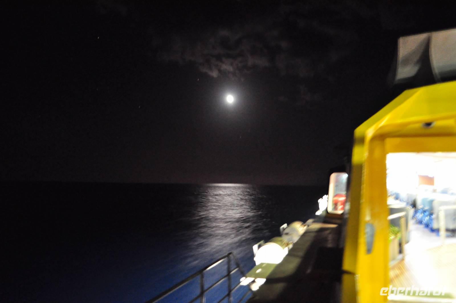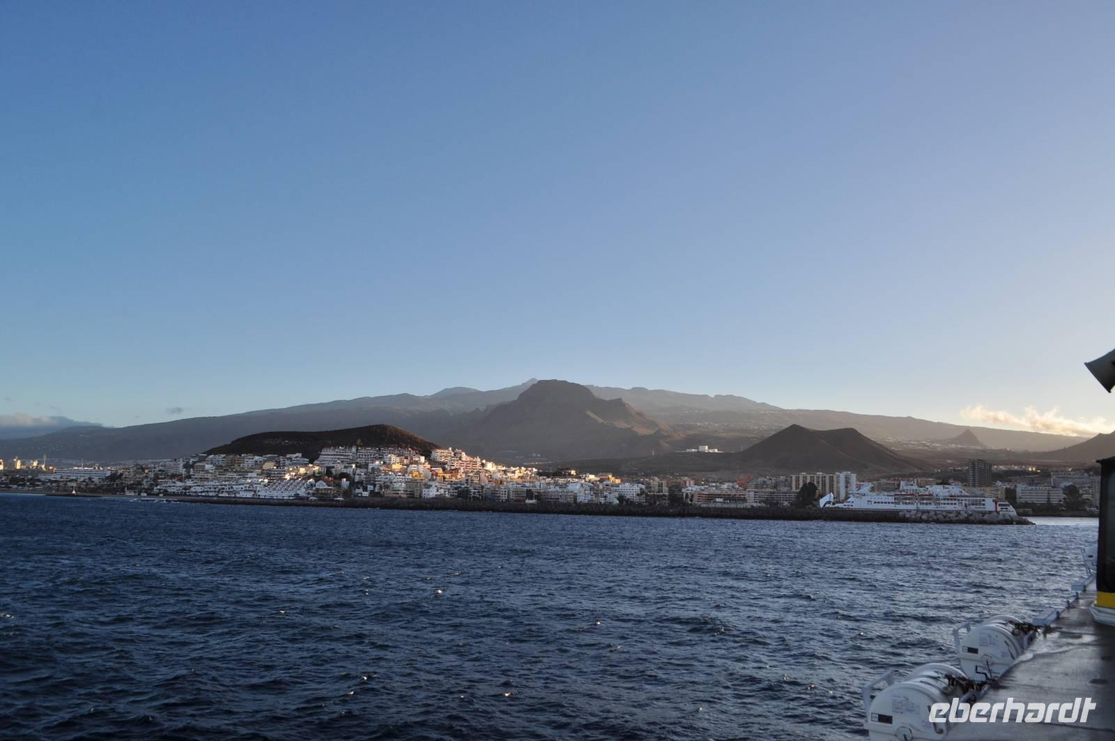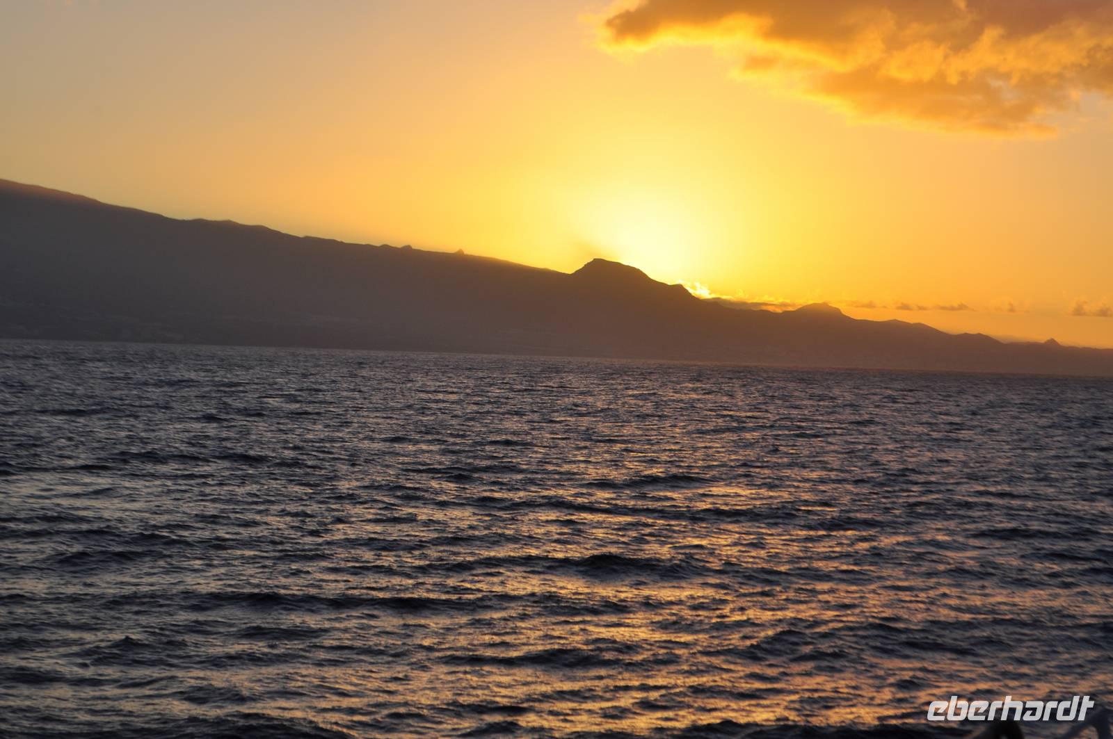 70 km/h fegt dieses Geschoss über das Wasser. In ca. 3 Stunden geht es über den Atlantik und über die Insel La Gomera nach Los Cristianos auf Teneriffa. Um 5.30 Uhr legt sie ab und erreicht pünktlich gegen 8.30 Uhr Teneriffa. Auf dem Weg von La Gomera nach Teneriffa erleben wir einen wunderschönen Sonnenaufgang über dem Teide.