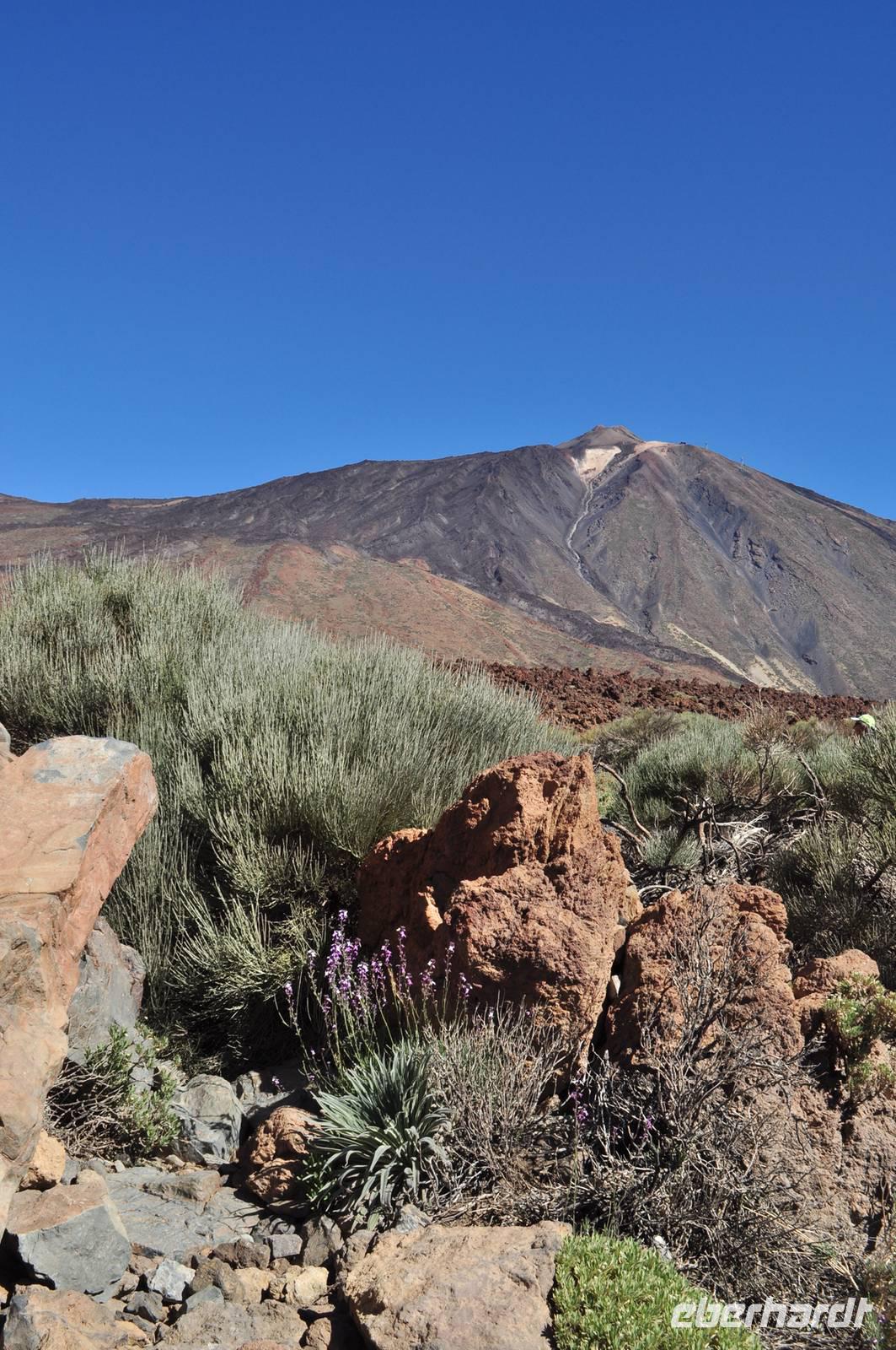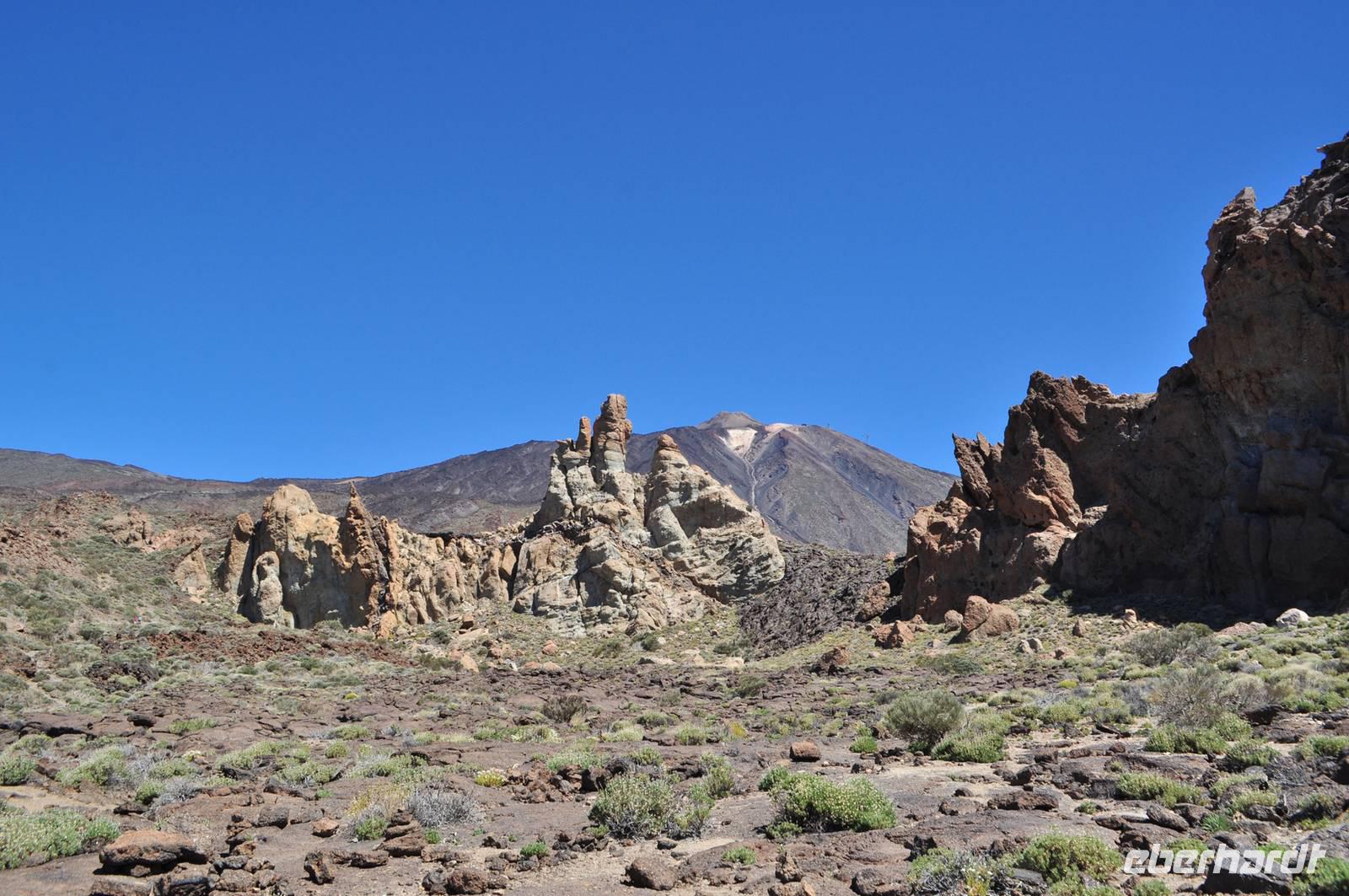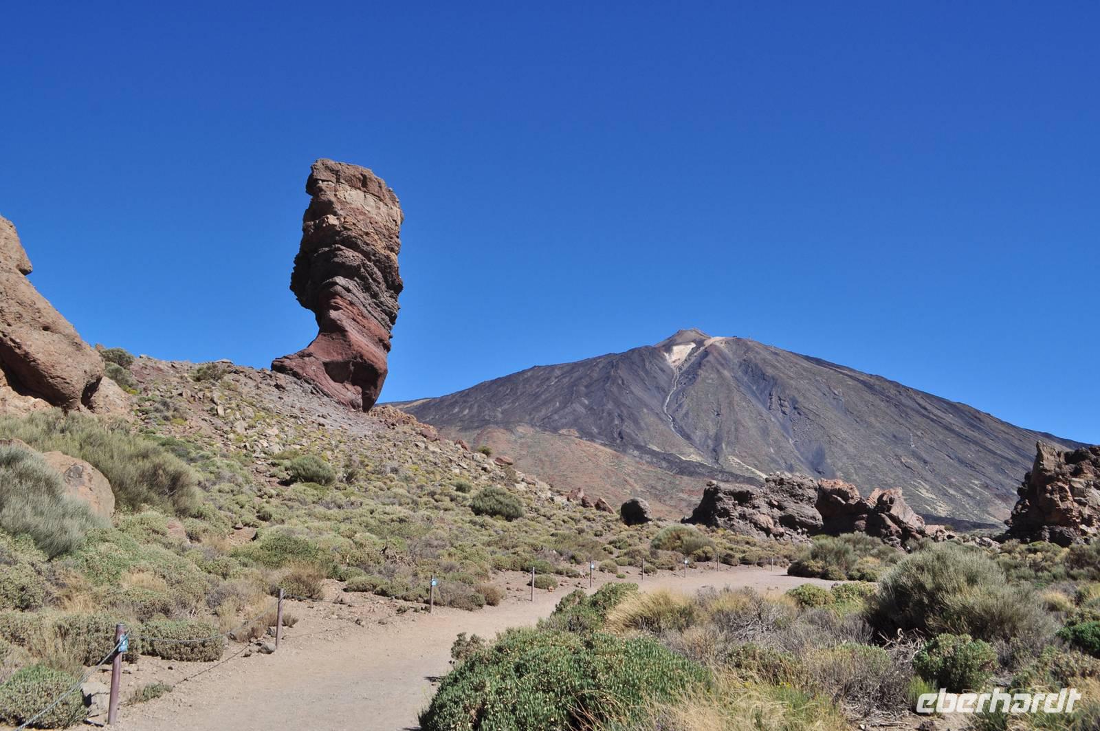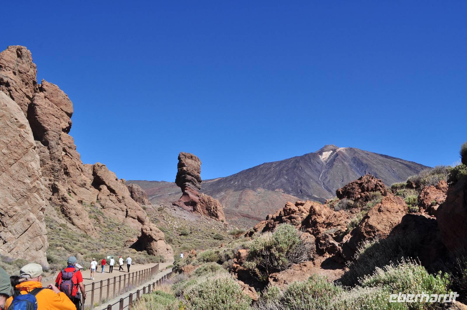 Wir passieren die Canadas und machen einen kurzen Fotostopp am Schuh der Königin, einem felsigen Damenschuh. Im Hintergrund liegt der mächtige Teide vor blauem Himmel.