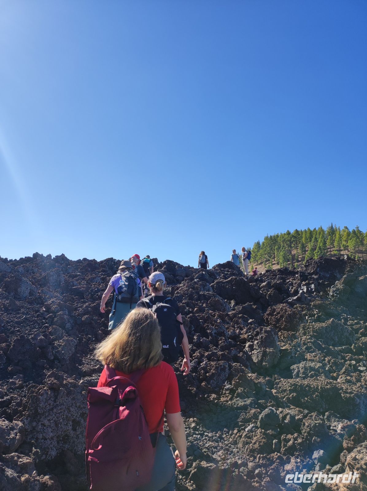 Wieder pünktlich um 9 Uhr startete unser Bus in Richtung Nordwesten wo unser Startpunkt der heutigen Wanderung lag. Unser Busfahrer zeigte seinen können und manövrierte uns durch die sehr engen auf keinen Fall für Busse geeigneten Gassen zu unserem Ziel. Zuerst führte uns die Route durch einen Nadelwald und wir gewannen langsam an Höhe, die Bäumen wurden kleiner und weniger. Nach ungefähr der Hälfte der Wanderung wurden wir mit einem wunderschönen Ausblick auf den Teide – den höchsten Punkt Teneriffas belohnt. Wenige Minuten später erreichten wir die höchste Stelle unserer heutigen Wanderung und befanden uns tatsächlich über den Wolken. Einige füllten sich ihre Wasserflasche in einer der Quellen mit frischem und eiskalten Wasser auf, bevor wir uns dann weiter zu dem Highlight der Wanderung machten. Kaum einer aus der Gruppe vermutete das man die Aussicht von vorhin noch übertrumpfen könnte, aber Carsten belehrte uns eines Besseren. Wir erreichten ein riesiges versteinertes Lava Feld und im Hintergrund den mächtigen Teide. Wir überquerten den schon vor hunderten von Jahren versteinerten Lavefluss und konnten es kaum glauben das wir uns wirklich auf versteinerter Lava befinden. Und schon war unsere Wanderung beendet, mit all diesen neuen Eindrücken fuhren wir zu unserer heutigen Einkehrmöglichkeit. Angekommen in dem kleinem Tapas Restaurant wurden wir auch sofort schon mit viel typisch kanarischer Hausmannskost sprichwörtlich überwältigt, und die temperamentvolle Köchin sah es gar nicht gern, wenn man nur wenige essen wollte. Nach dem wir unter den strengen Blick der Köchin aufgegessen haben ging es dann auch schon wieder zurück in das Hotel. Im Hotel angekommen mussten wir uns nicht nur von der Wanderung, sondern auch von dem leckeren und reichhaltigen Essen erholen.