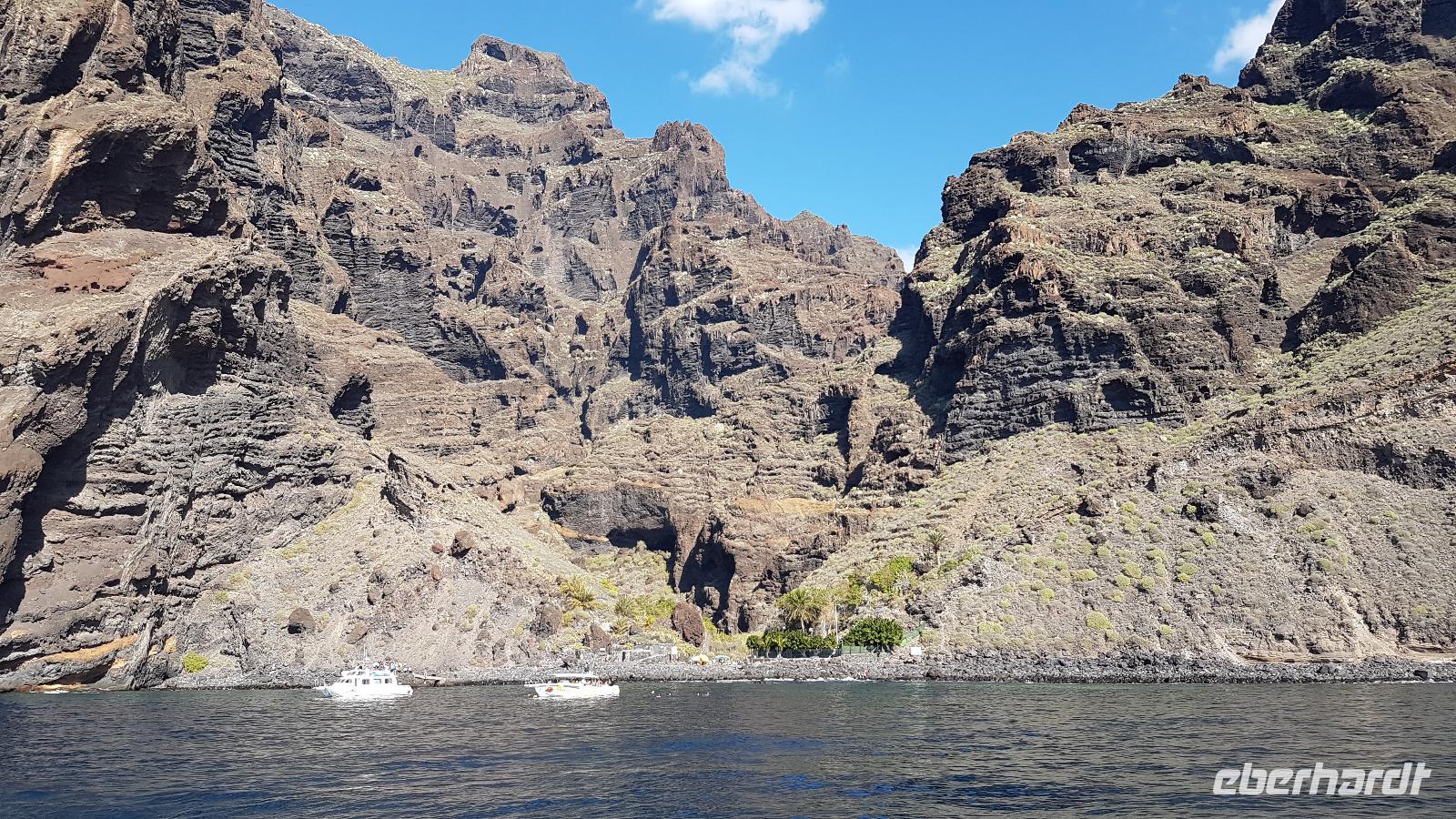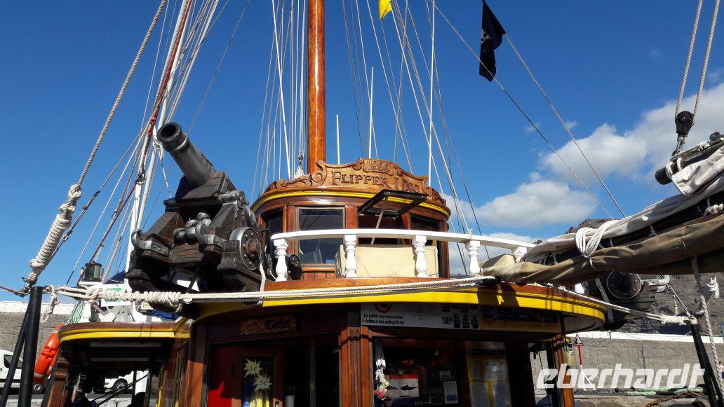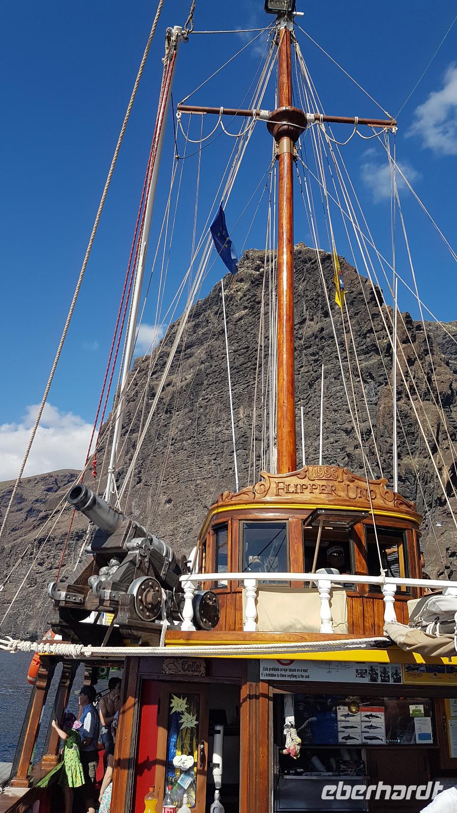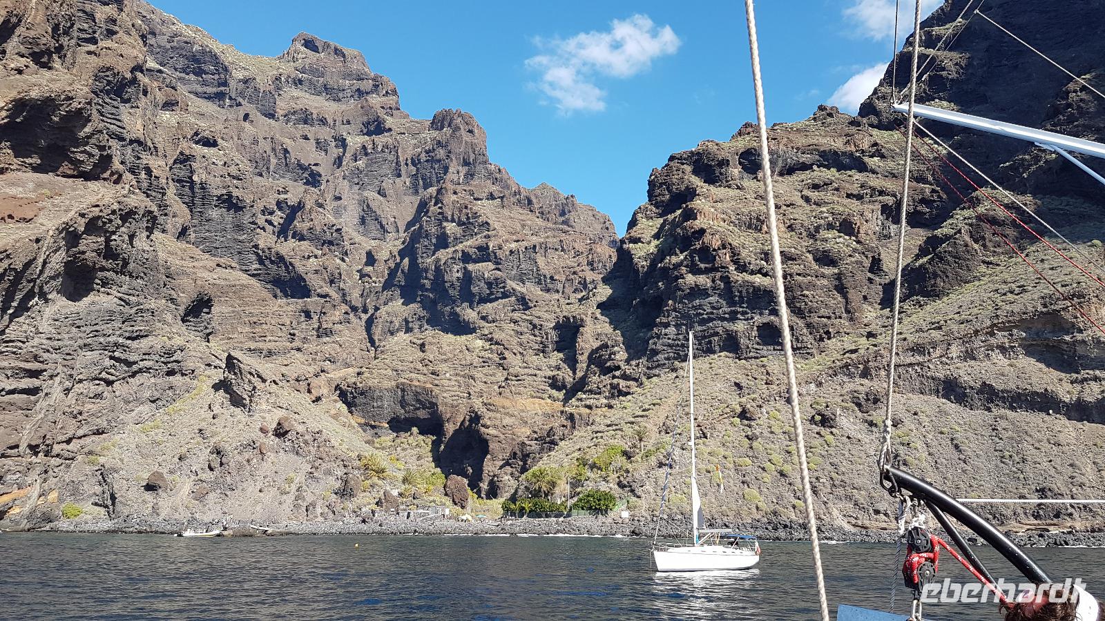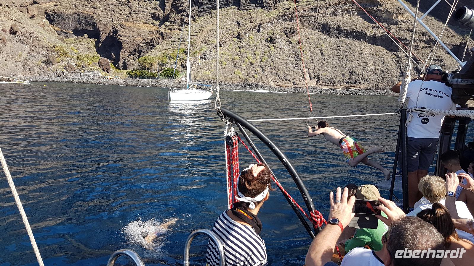 Im Hafen von Los Gigantes erwartet uns bereits das Segelboot, was uns aufs Meer hinaus bringt. Wir halten Ausschau und fiebern der ersten Delfinsichtung entgegen...und wirklich, sie sind da und umkreisen auch unser Boot. Die Fotoapparate klicken. Aber auch der Blick gen Insel erstaunt uns und lässt uns die hohe Steilküste bewundern. Natürlich werfen wir Anker in einer Bucht, in die die Mascaschlucht endet. Nun können die Gäste ein erfrischendes Bad im Atlantik nehmen. Die Mutigsten schwindgen sich an einem Seil ins Meer. Für das leibliche Wohl ist natürlich auch gesorgt, bevor es in den Hafen zurück geht.