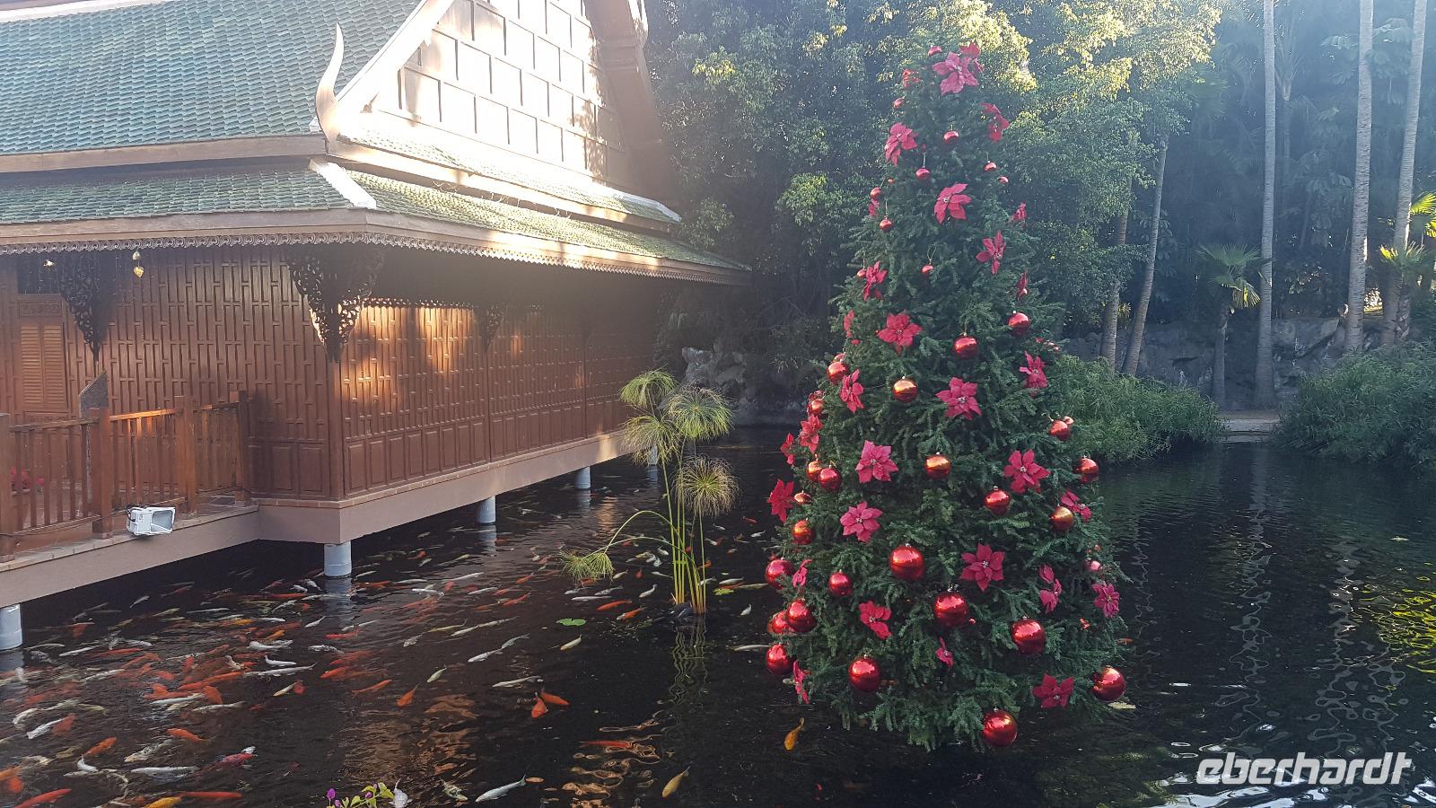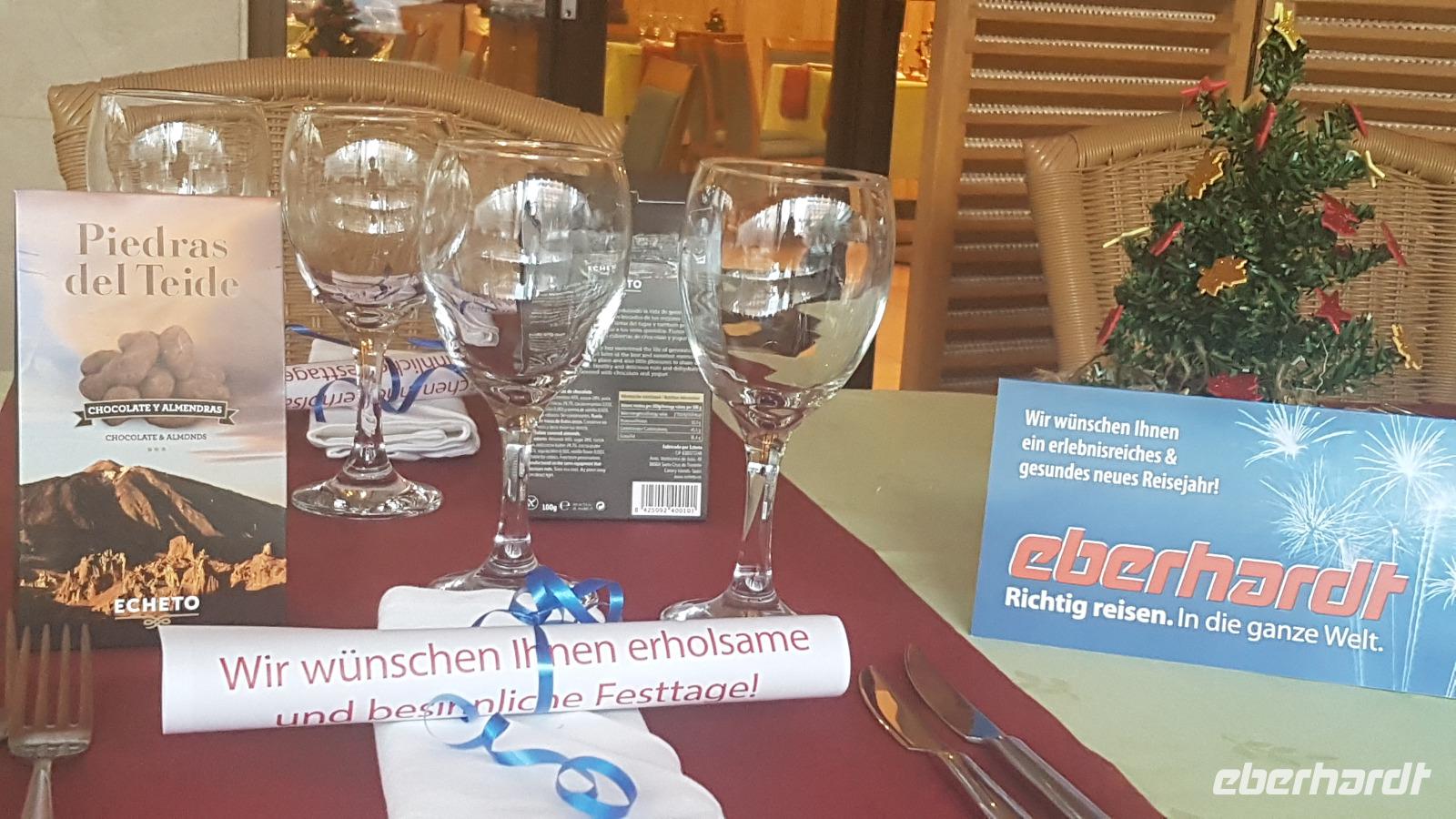 Die Tafel ist festlich gedeckt und ich habe von Eberhardt-TRAVEL kleine Geschenke und Weihnachtsgrüße verteilt. Nach dem Essen treffen wir uns noch in der Bar und lassen den Abend dort ausklingen.