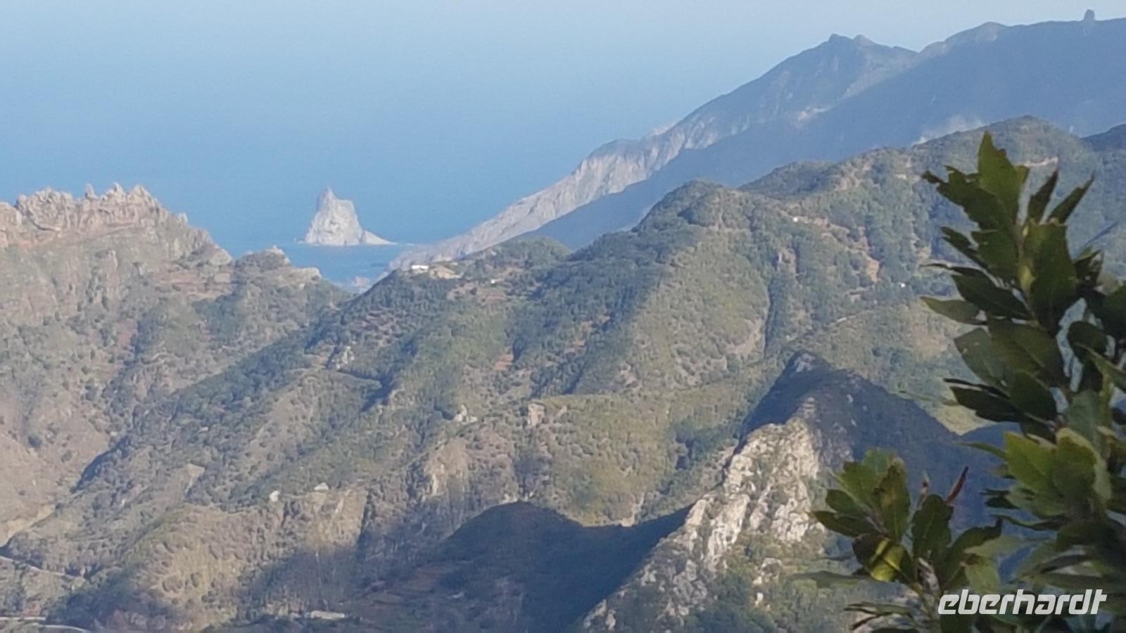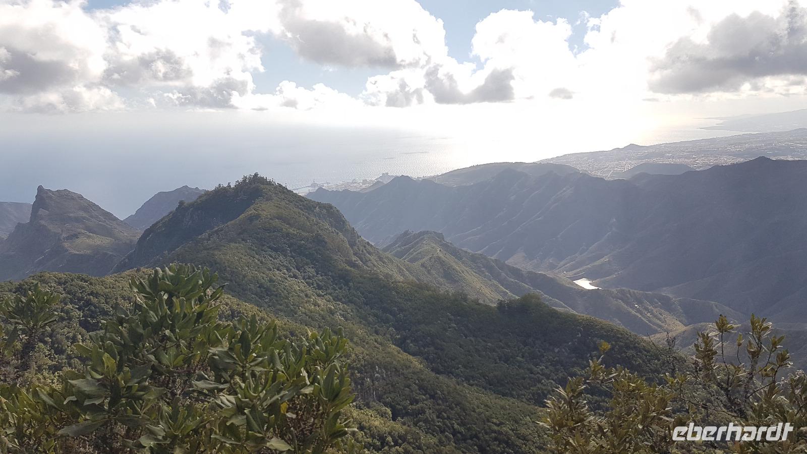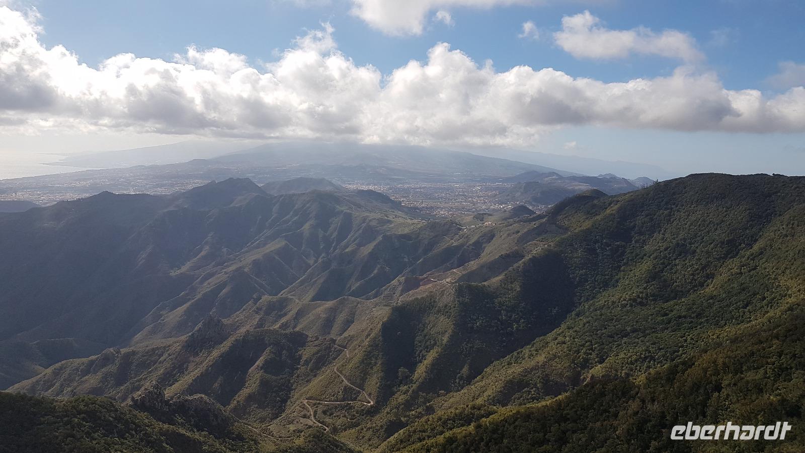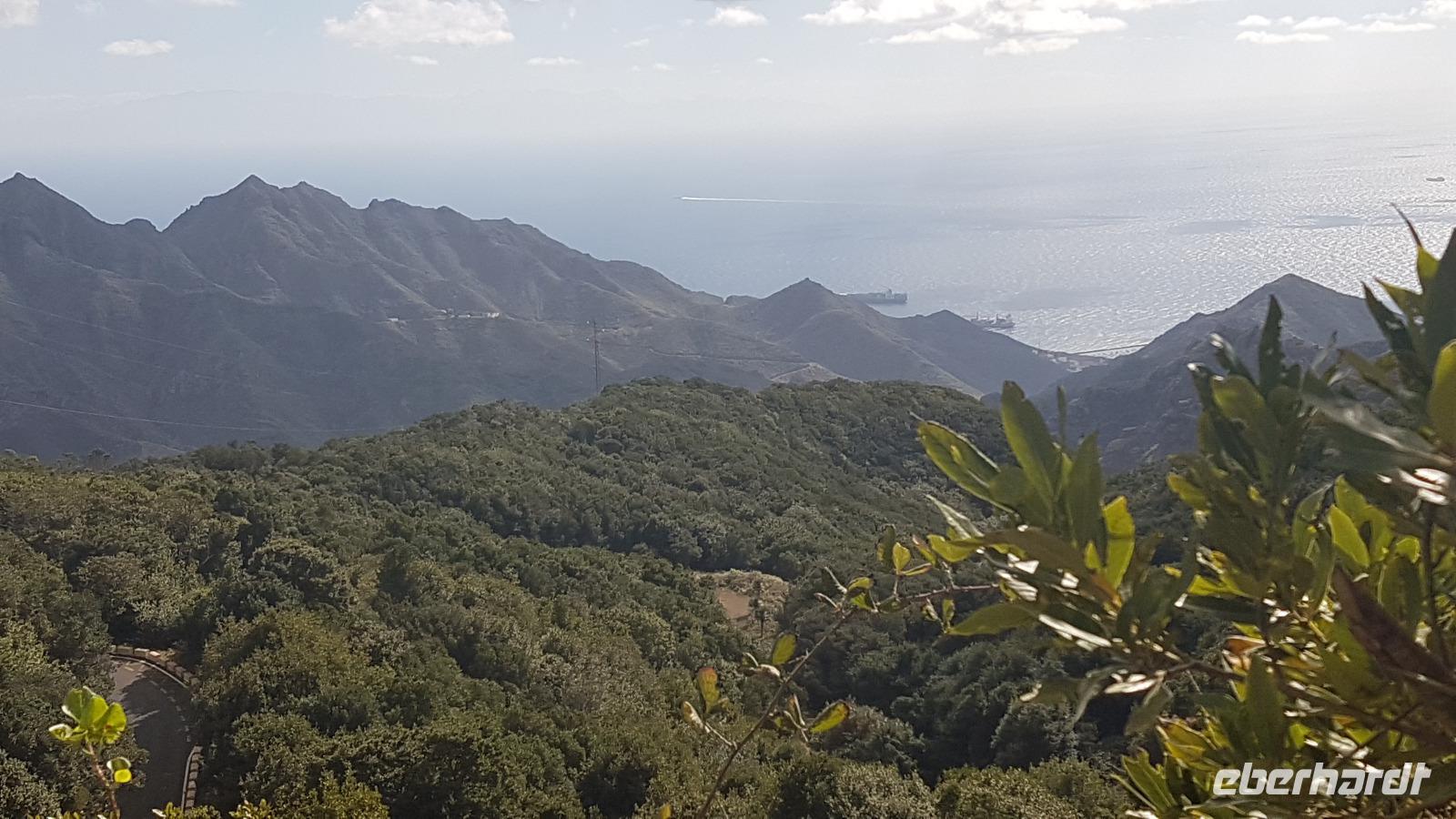 Im Anaga-Gebirge legen wir den nächsten Fotostopp ein. Das dicht bewaldete und zerklüftete Gebirge erreicht eine Höhe von über 1.000 m. Am Fotostopp können wir die südliche und die nördliche Seite der Insel sehen. Vom „Pico del Ingles" haben wir wieder einen Blick Richtung Teide.