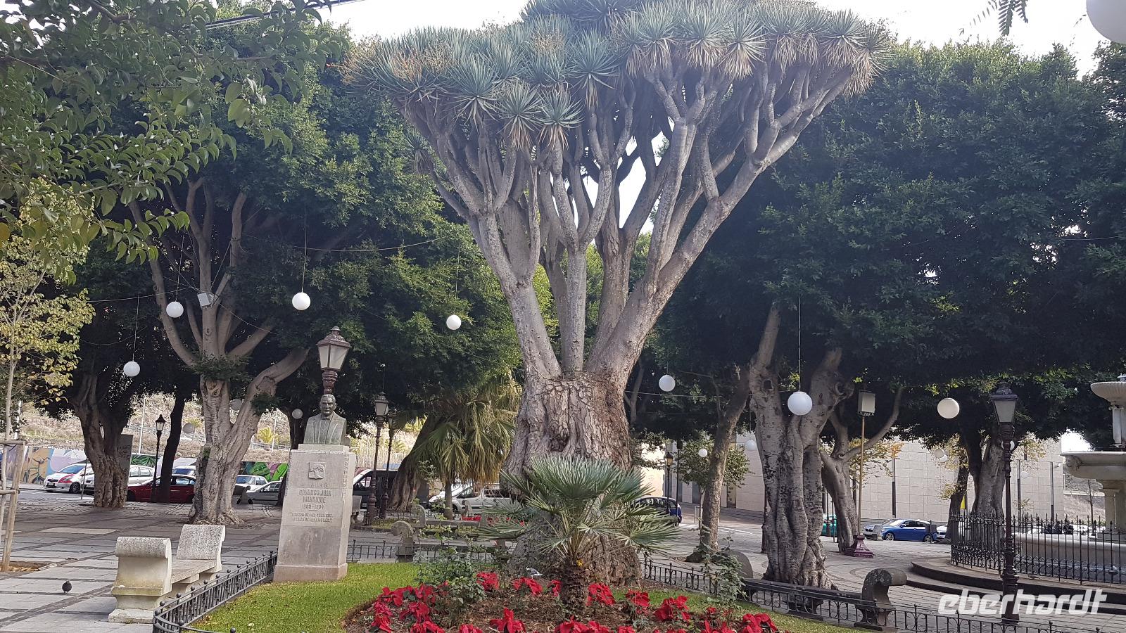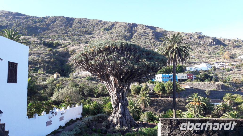 Um 09.00 Uhr starten wir jeden Tag, auch heute. Nach der Stärkung am Frühstücksbuffet begrüßt uns Eduardo, unser örtlicher Reiseführer. Zuerst geht es nach Igod de los Vinos. Hier bewundern wir das Wahrzeichen der Stadt, einen uralten, riesigen Drachenbaum.