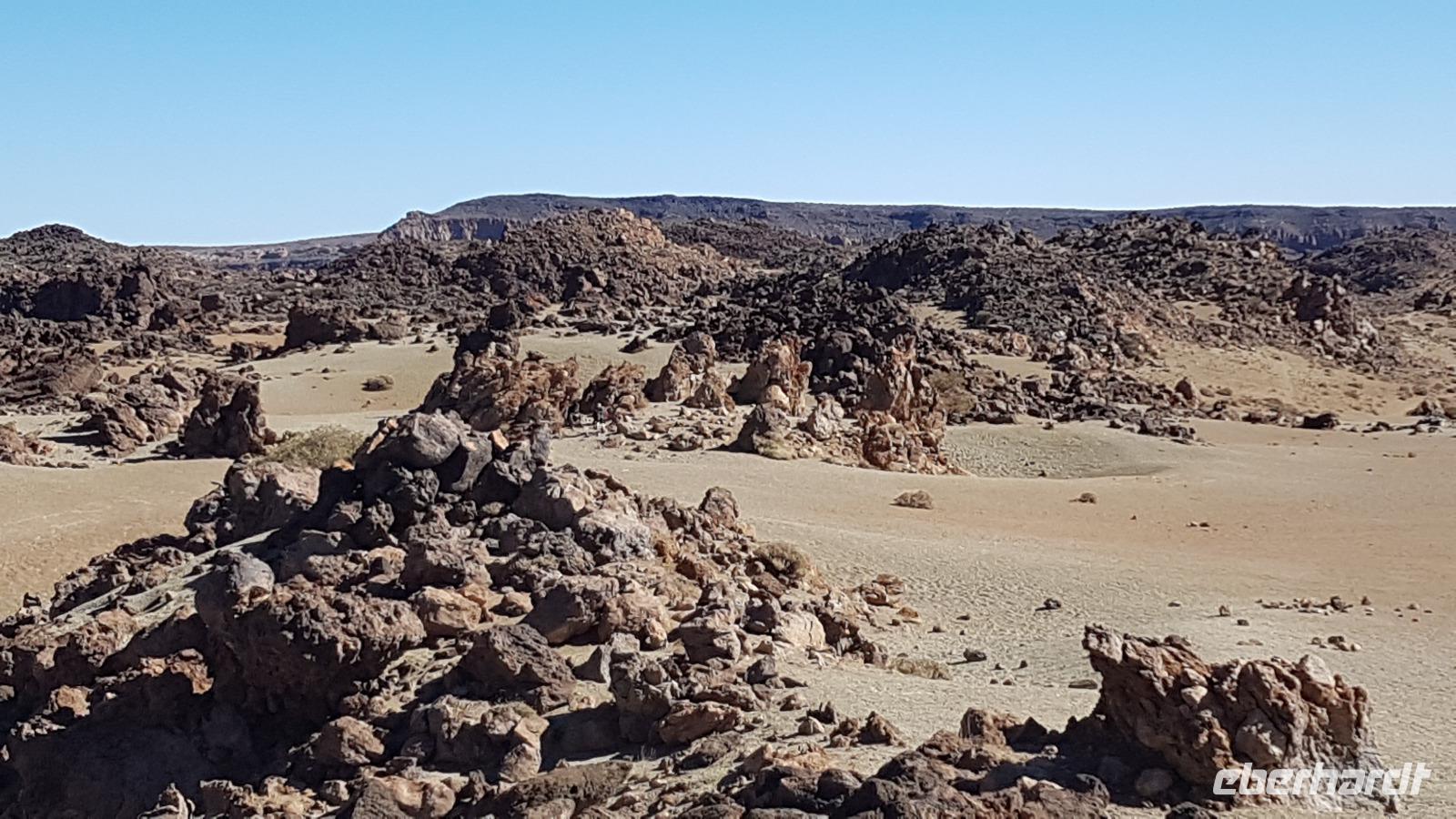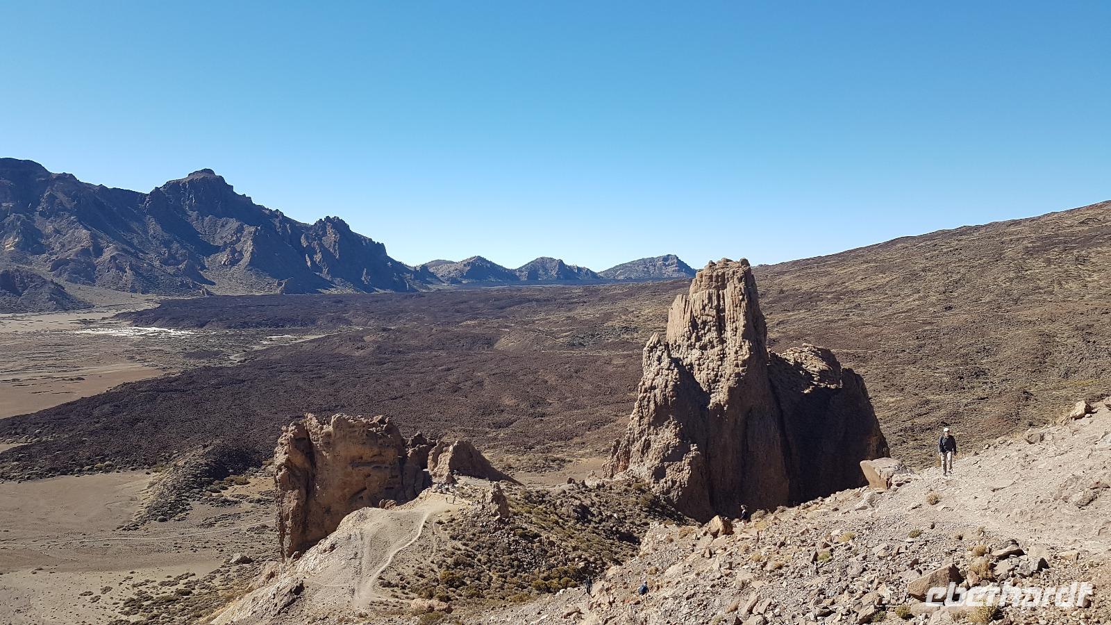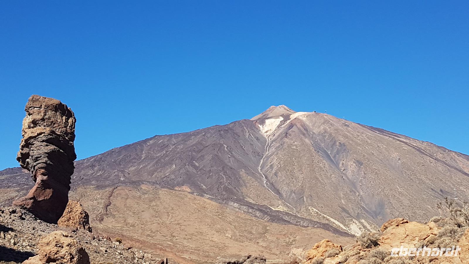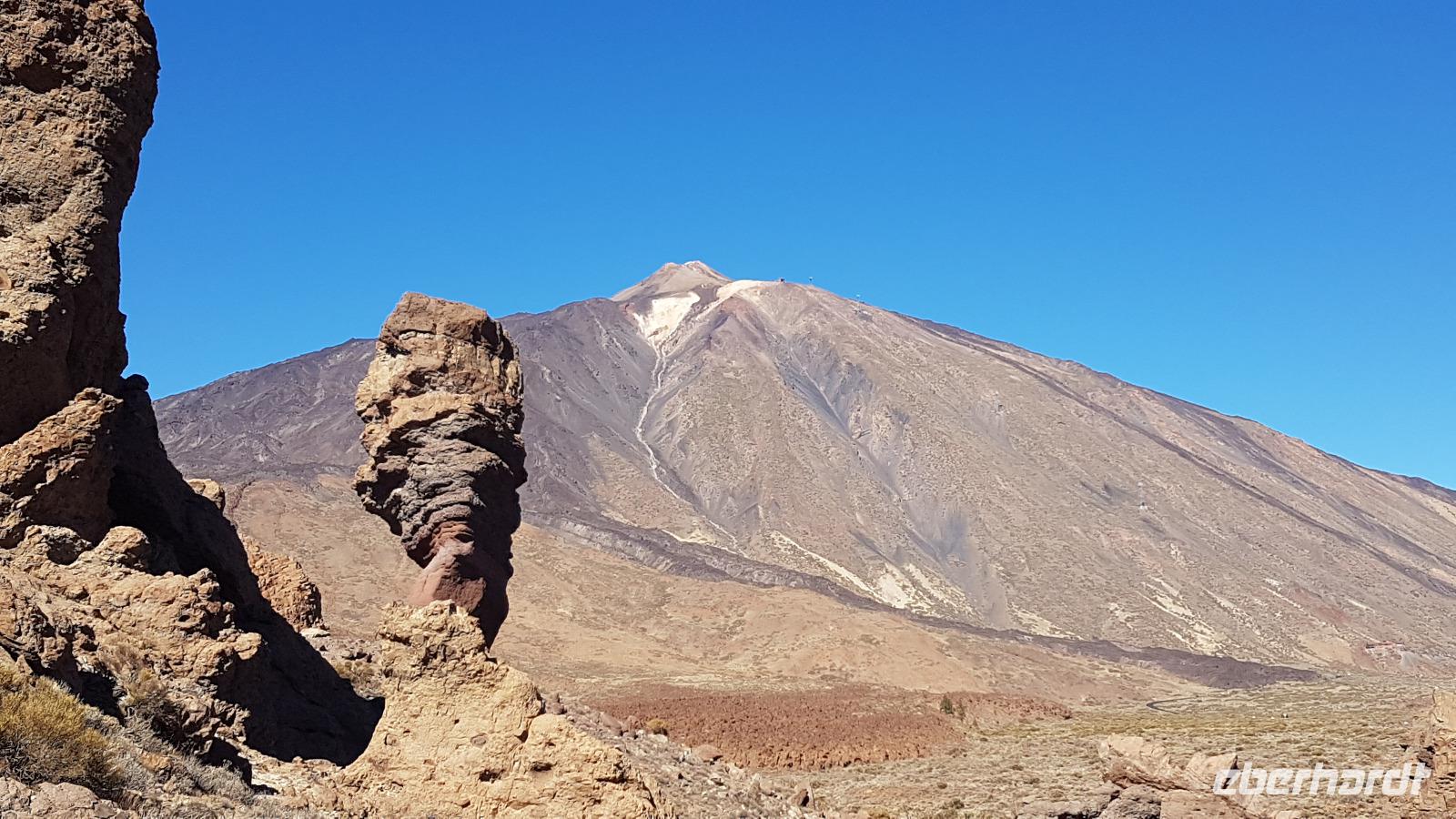 Die Straße schlängelt sich über Serpentinen hinauf in den Teide-Nationalpark. Nach einem kurzen Stop für einen Imbiss umgibt uns eine außerordentliche Landschaft. Im Krater des Teide, der "Canadas del Teide" die sich über Kilometer in einer Höhe von 2.100 m dahinzieht, erleben wir bizarre Steingebilde und Bimssteinfelder, einer Mondlandschaft gleich. Bei dem Sonnenschein werfen alle vom Winde geformten Steingebilde lange Schatten. Darüber majestätisch der Gipfel des Teide mit 3.718 m Höhe. Unterhalb der Observatorien legen wir noch einen weiteren Fotostopp ein.