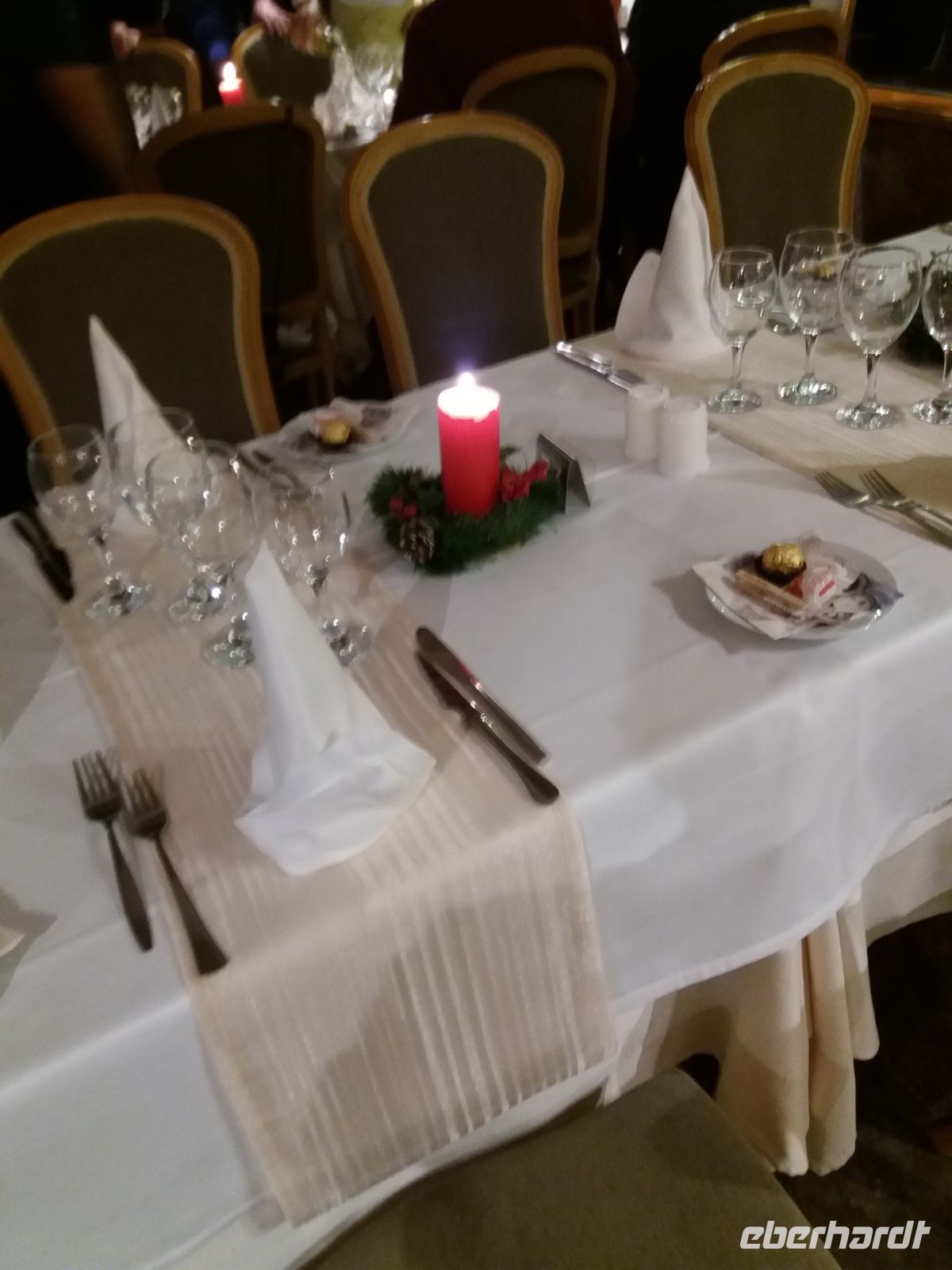 Uns erwartete ein Weihnachtsbuffet der besonderen Art. Festlich gedeckte Tische und auch das Personal