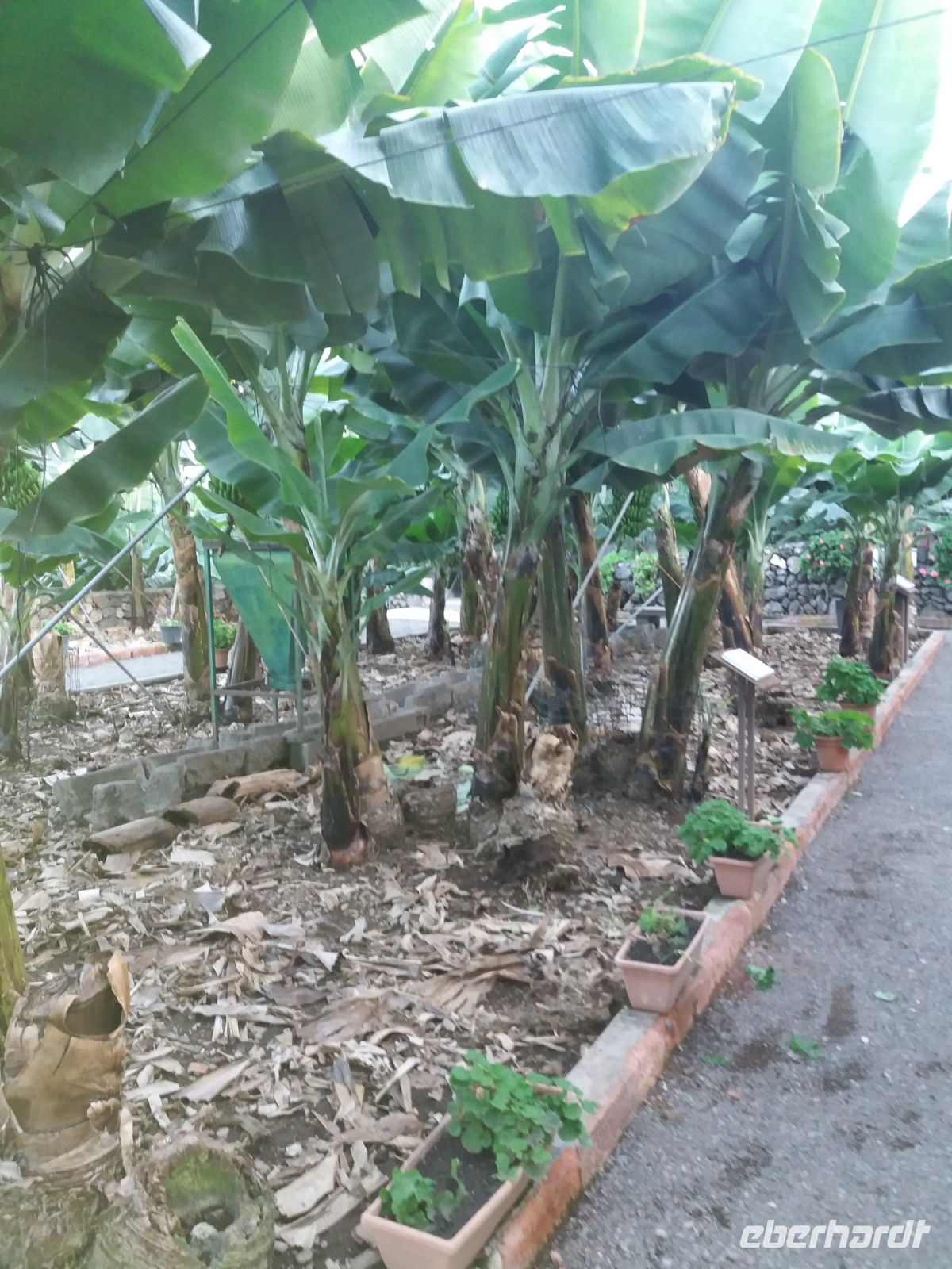Jede Bananenstaude trägt nur einmal und es wächst eine neue Staude an der alten heran. Der Garten ist nicht sehr groß