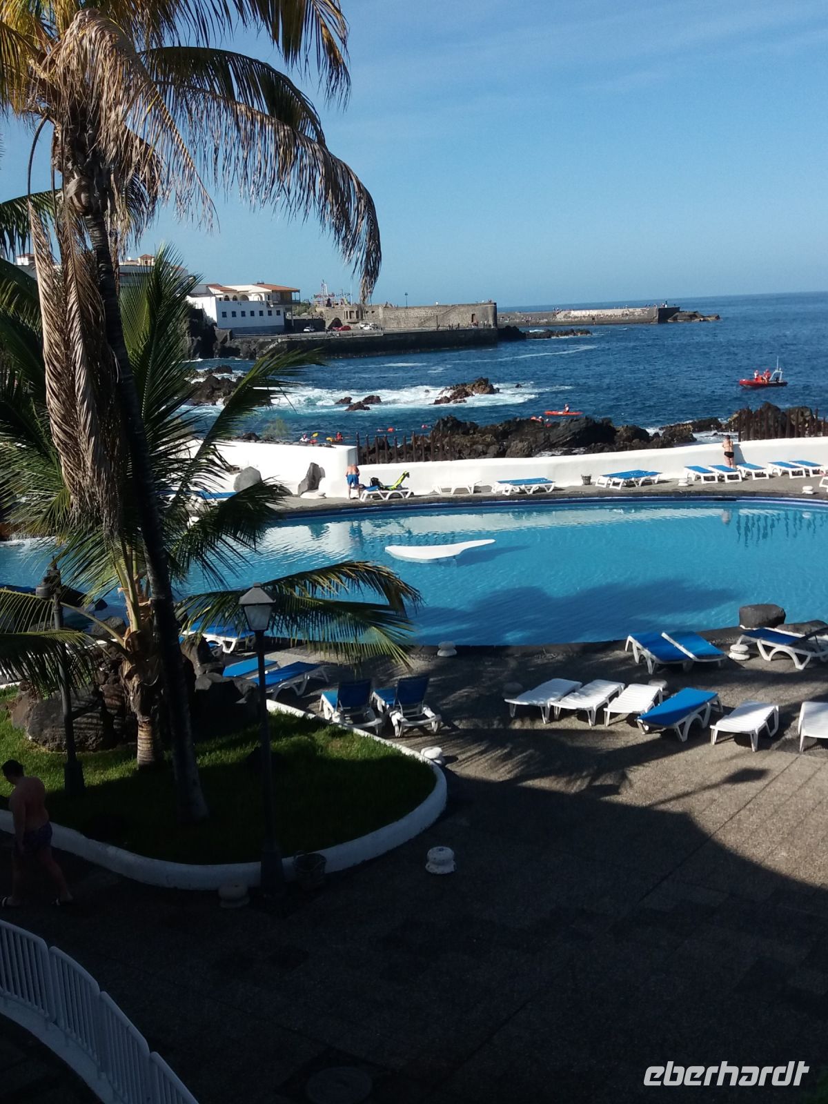 am Pool auf der Dachterrasse. Gegenüber des Hotels befinden sich die Meeresschwimmbecken.