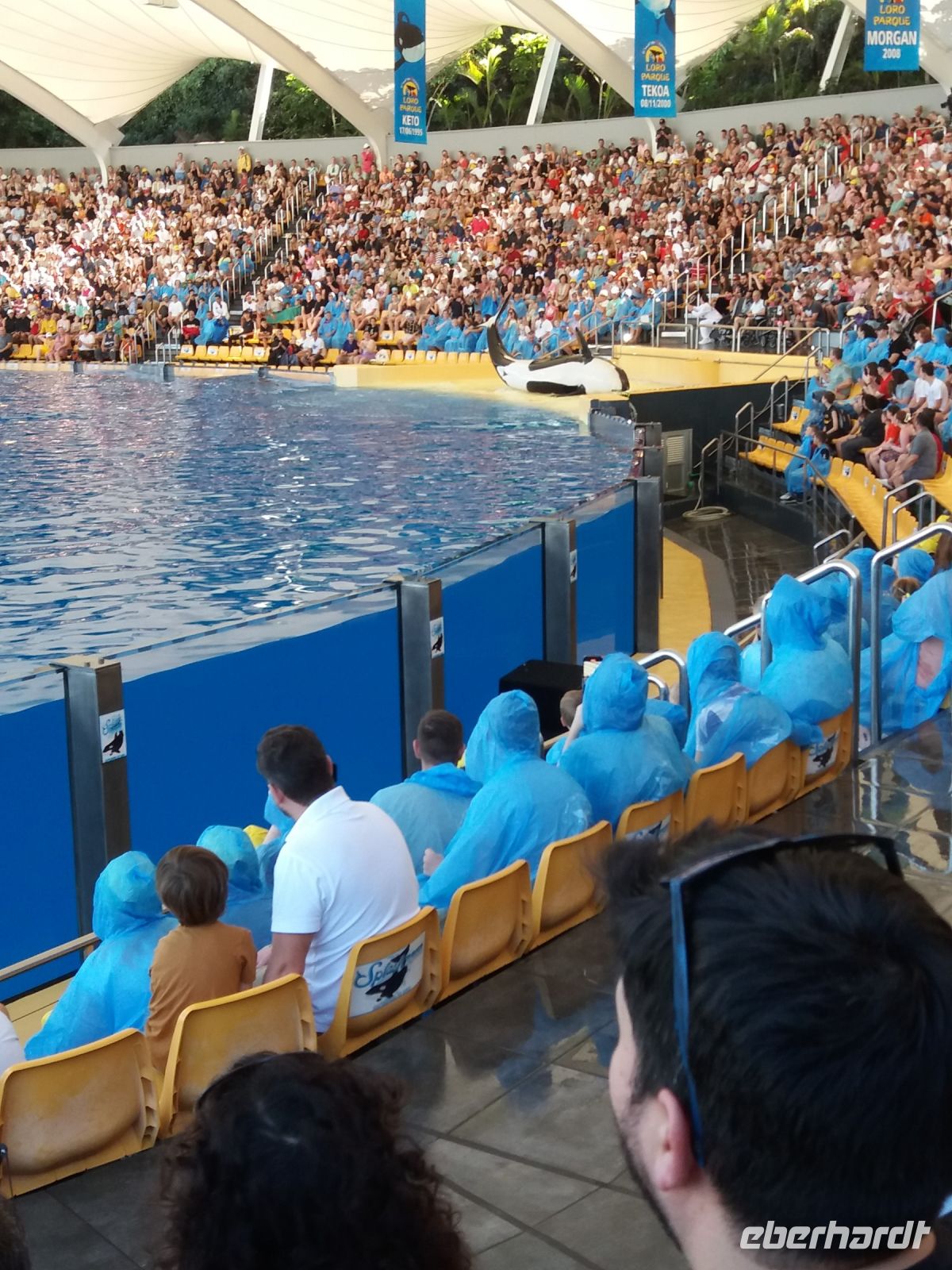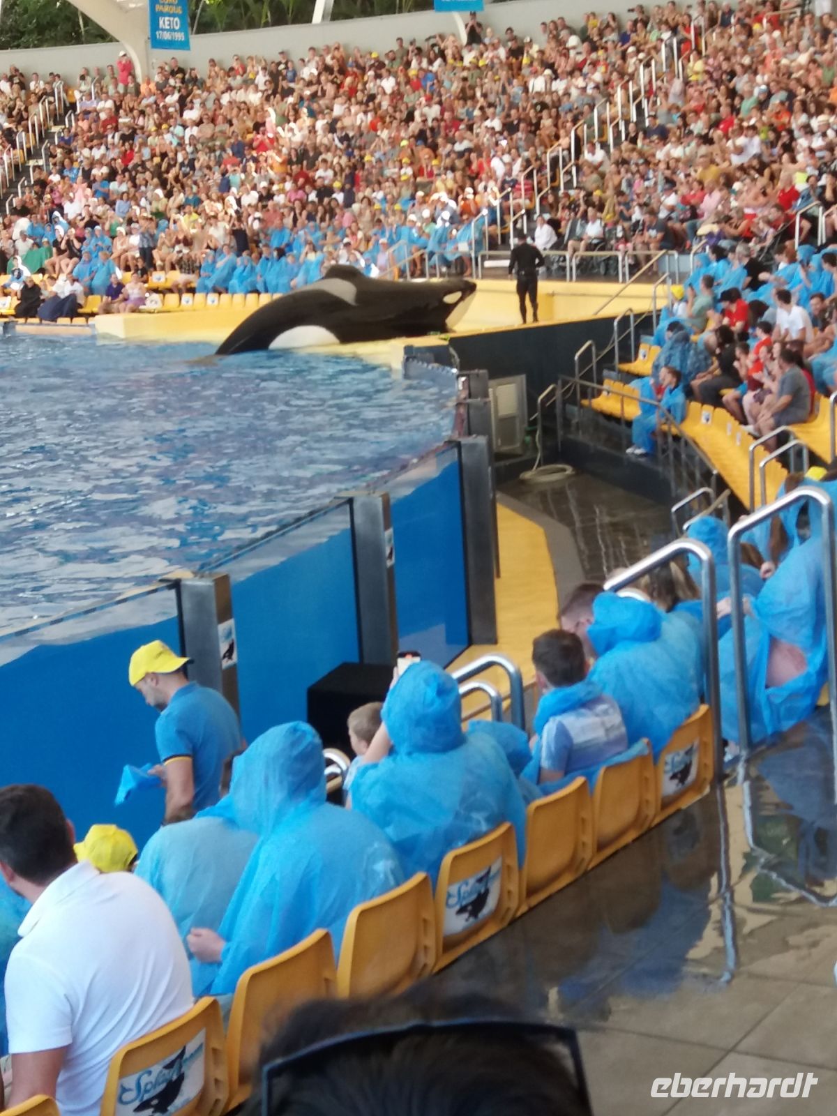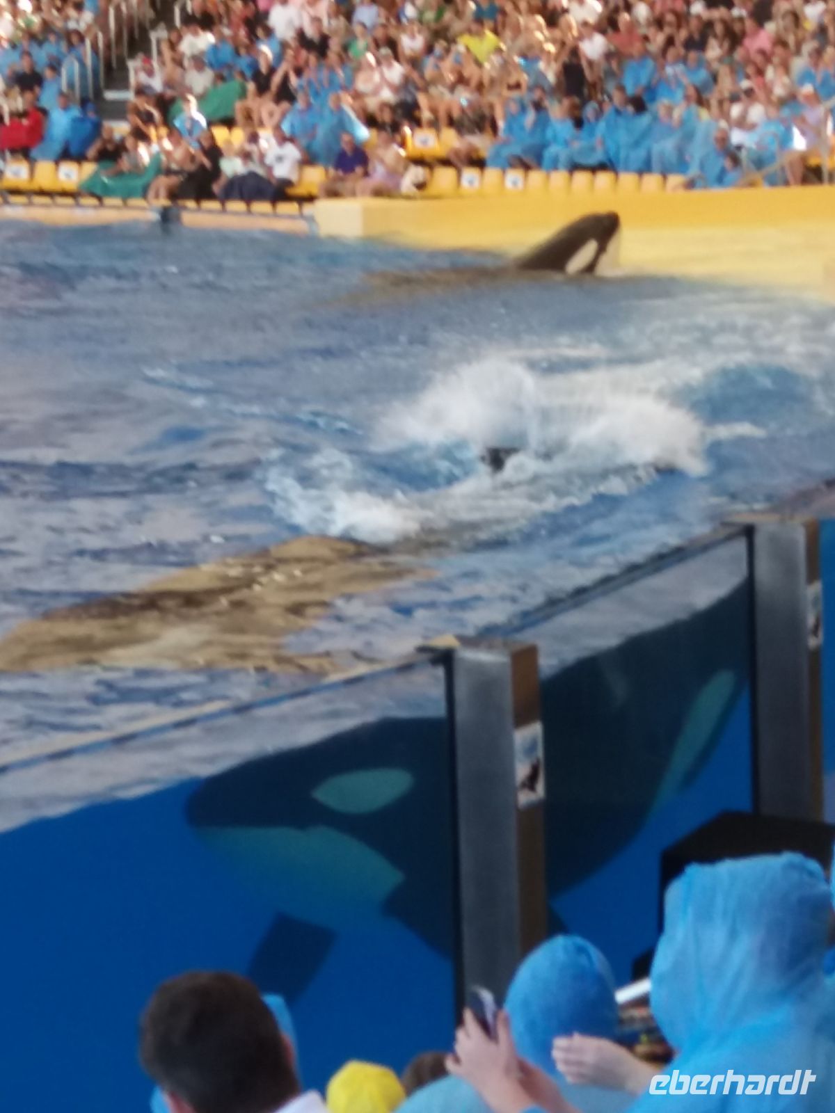 Orca-Show sollte man nicht zu nah am Beckenrand sitzen, denn das Wasser spritzt weit. Die Seelöwen-