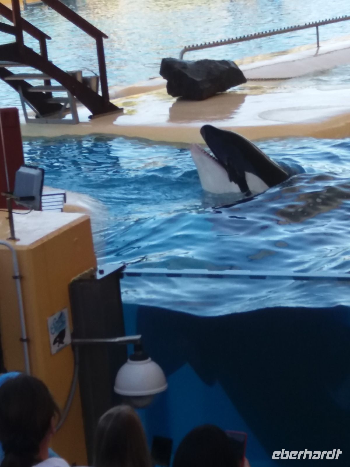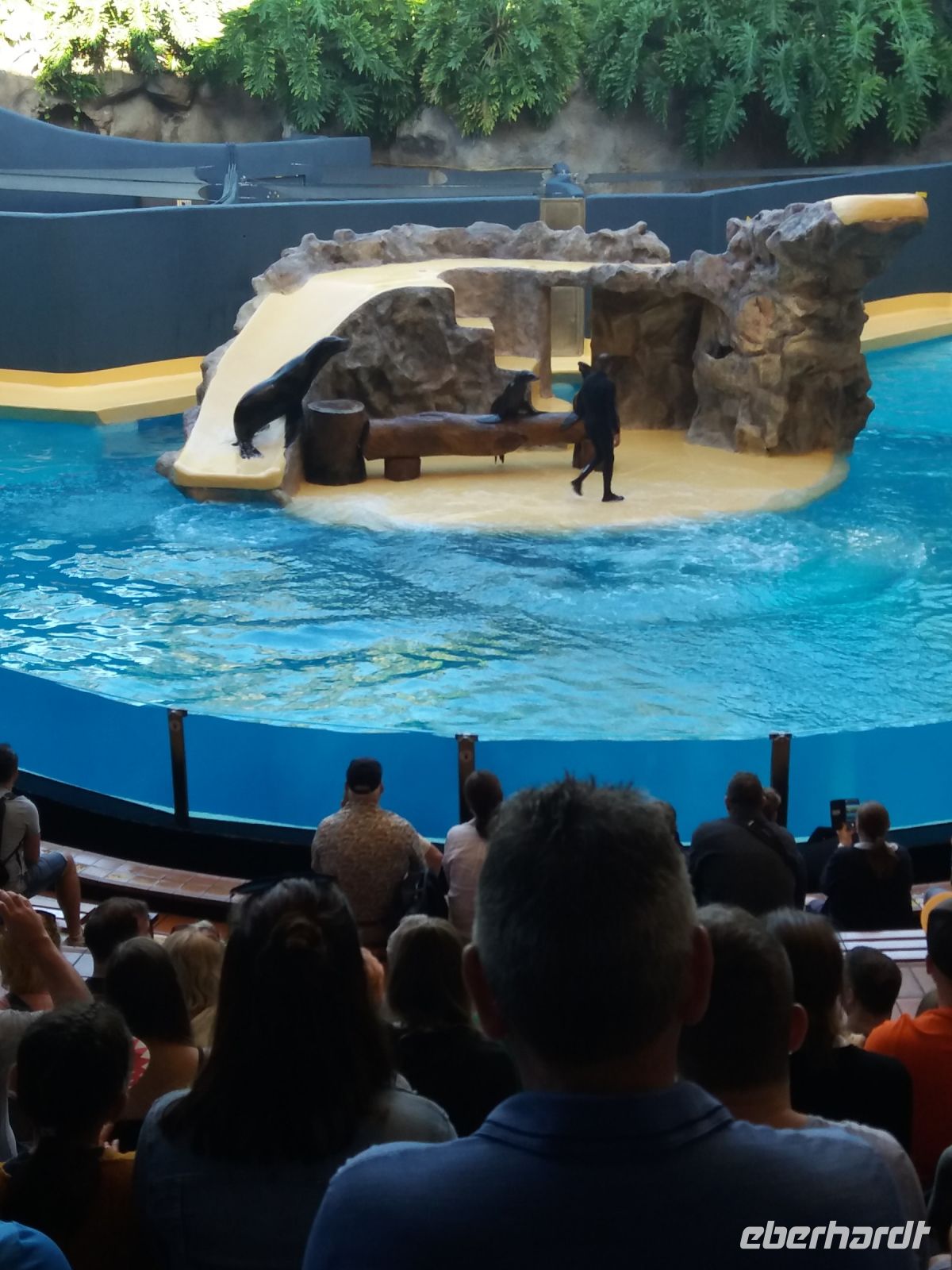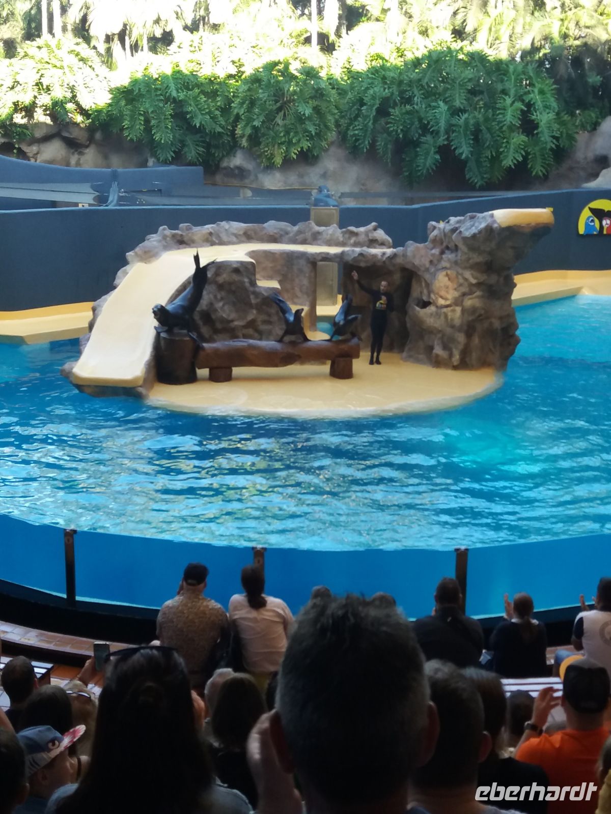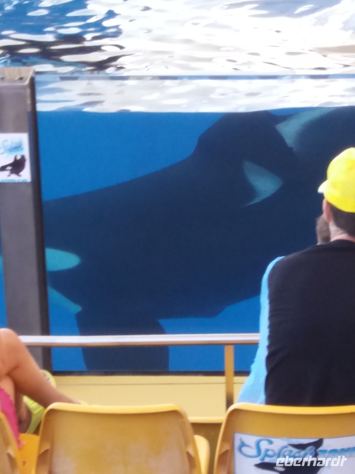 Orca-Show sollte man nicht zu nah am Beckenrand sitzen, denn das Wasser spritzt weit. Die Seelöwen-