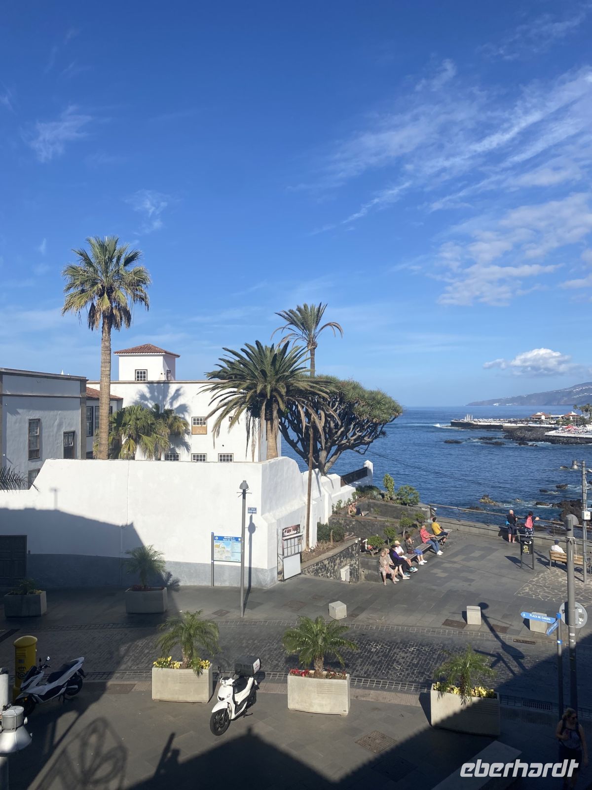 Um 09:30 Uhr treffen wir uns zum Stadtspaziergang durch die Altstadt von Puerto de la Cruz. Zunächst geht es über die Strandpromenade an der Kirche Nuestra Señora de la Peña de Francia mit ihrer schlichten, aber beeindruckenden Architektur und am Hafen vorbei zum Leuchtturm. Der Fischereihafen, wo man den frischen Seewind spürt und Schwimmer beobachten kann wirkt verträumt. Wir kehren in einem der zahlreichen Straßencafes ein, laufen weiter durch die engen, verwinkelten Gassen die gesäumt sind von charmanten, farbenfrohen Kolonialhäusern mit typisch kanarischen Holzbalkonen.
