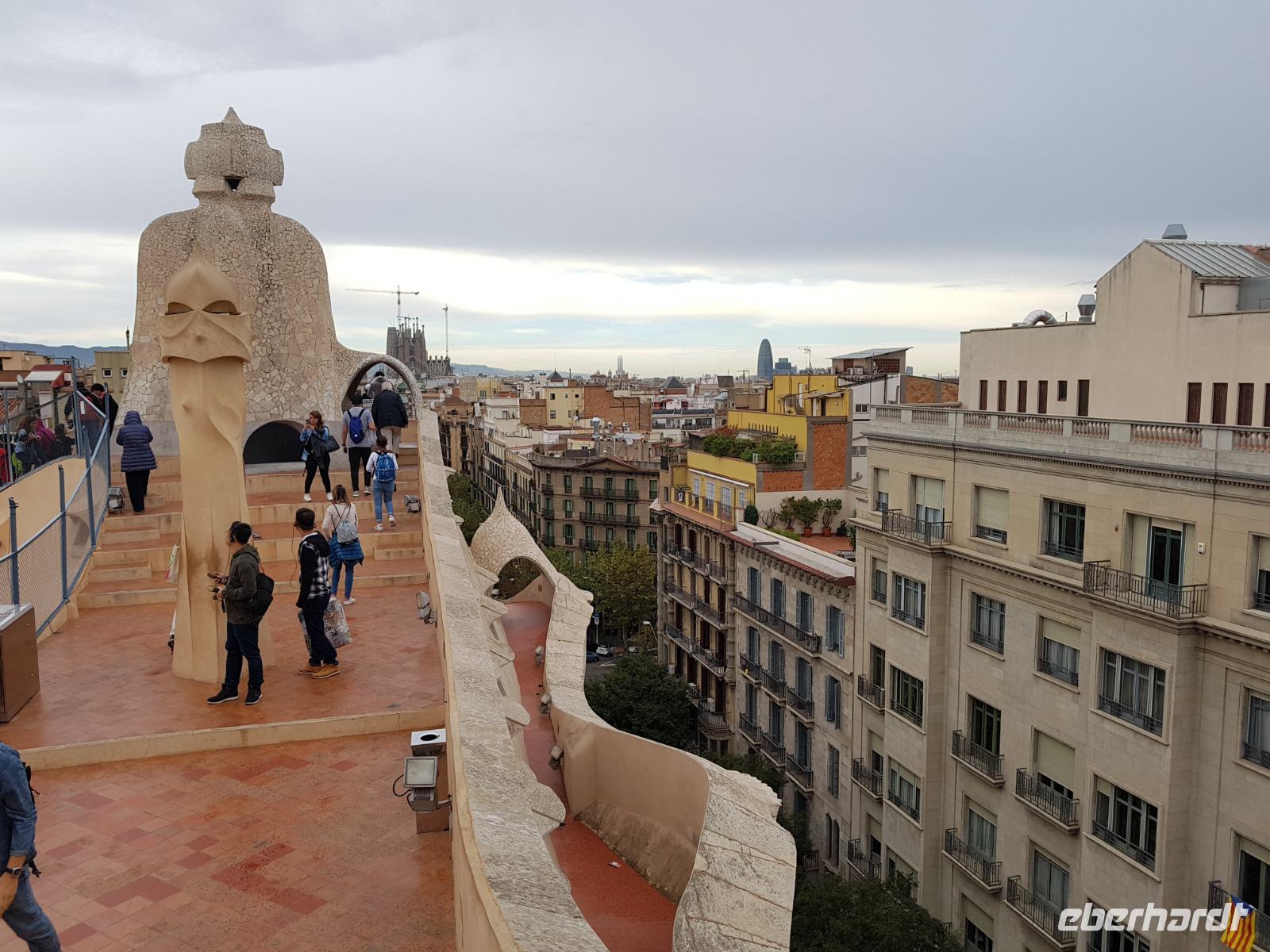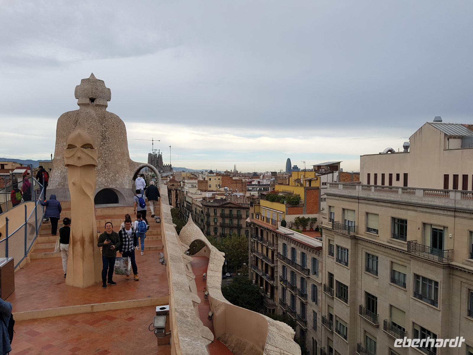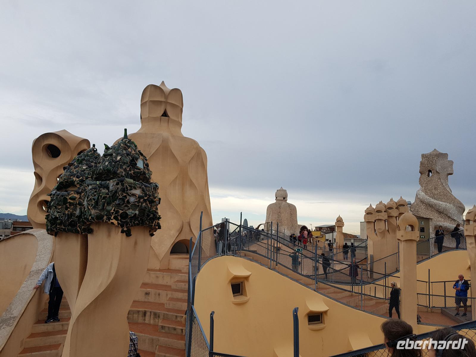 Nach diesem goldenen Gruß Barcelonas fahren wir so mit dem Bus erstmal am Casa Batlo vorbei, das wir von draußen bestaunen können. Danach besuchten wir die zwei Bauwerke von Gaudi auf diesem Paseo de Gracia: Casa Mila-Pedrera, einem Wohnhauskomplex, den Gaudi ebenfalls entwarf. Hier können wir exklusiv nach ganz oben gehen und einen fantastischen Blick auf dieser weltoffenen, kreativen und bunten Weltmetropole genießen. Danach im Museum wurden wir Zeuge von der detailreichen Arbeit, die verschiedenen Gebäude und einmaligen Ideen des Genies Gaudi kennen lernen. Ein echter Genie.