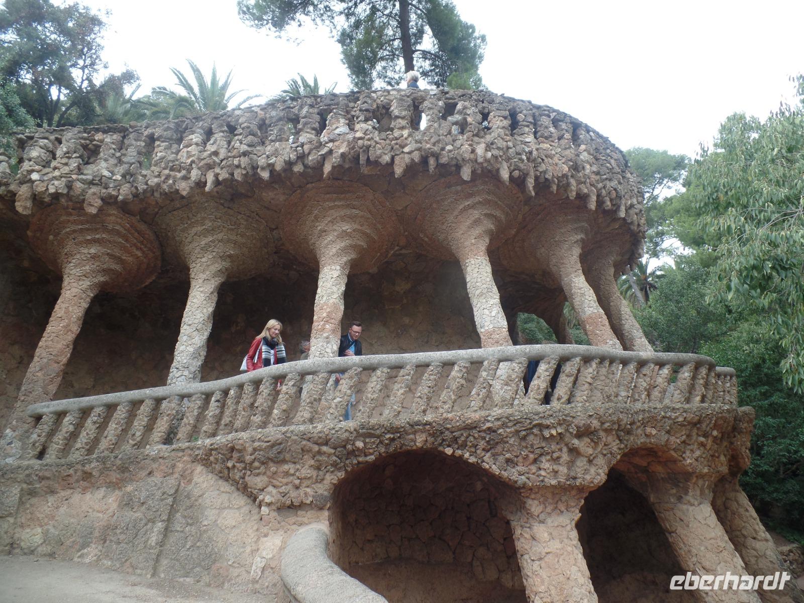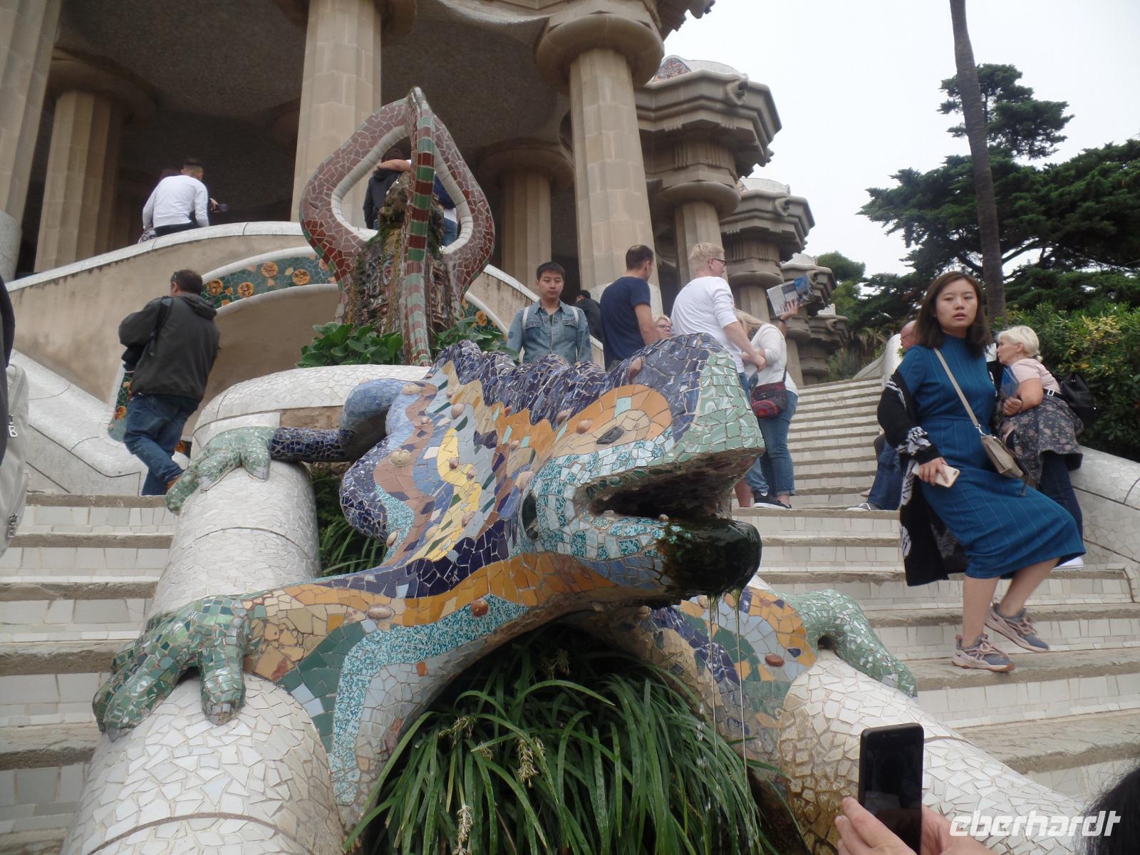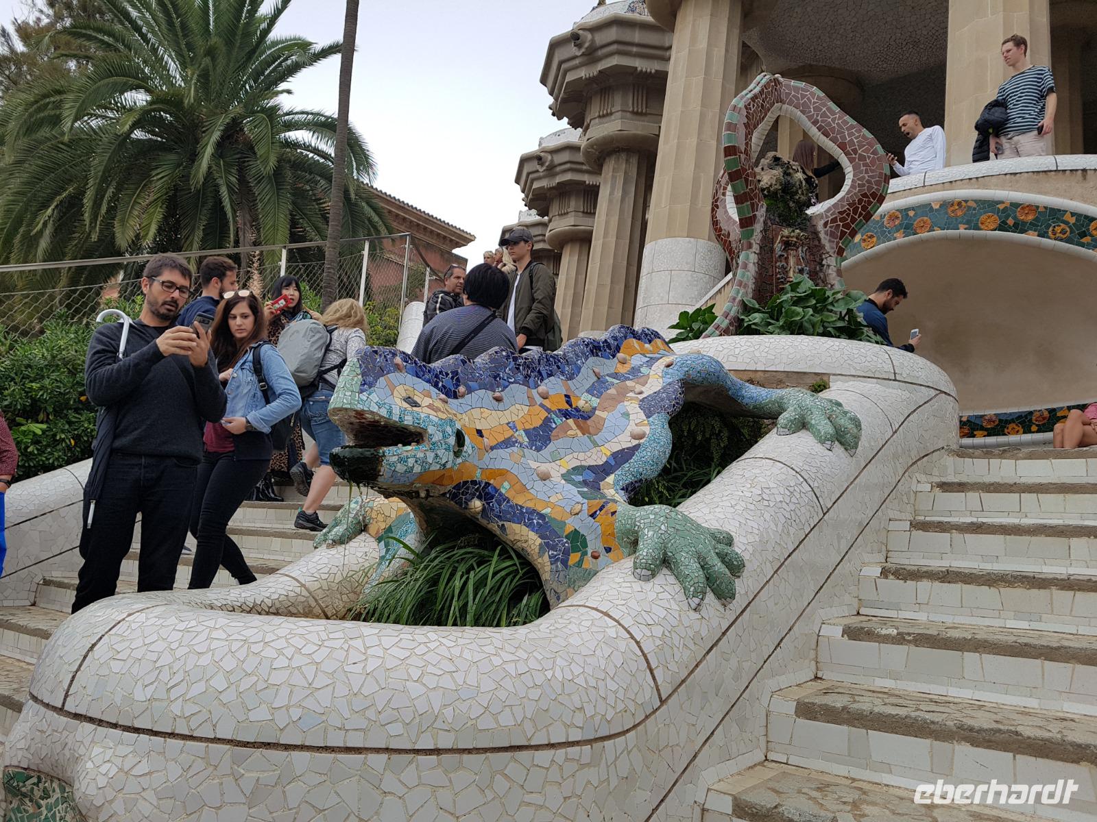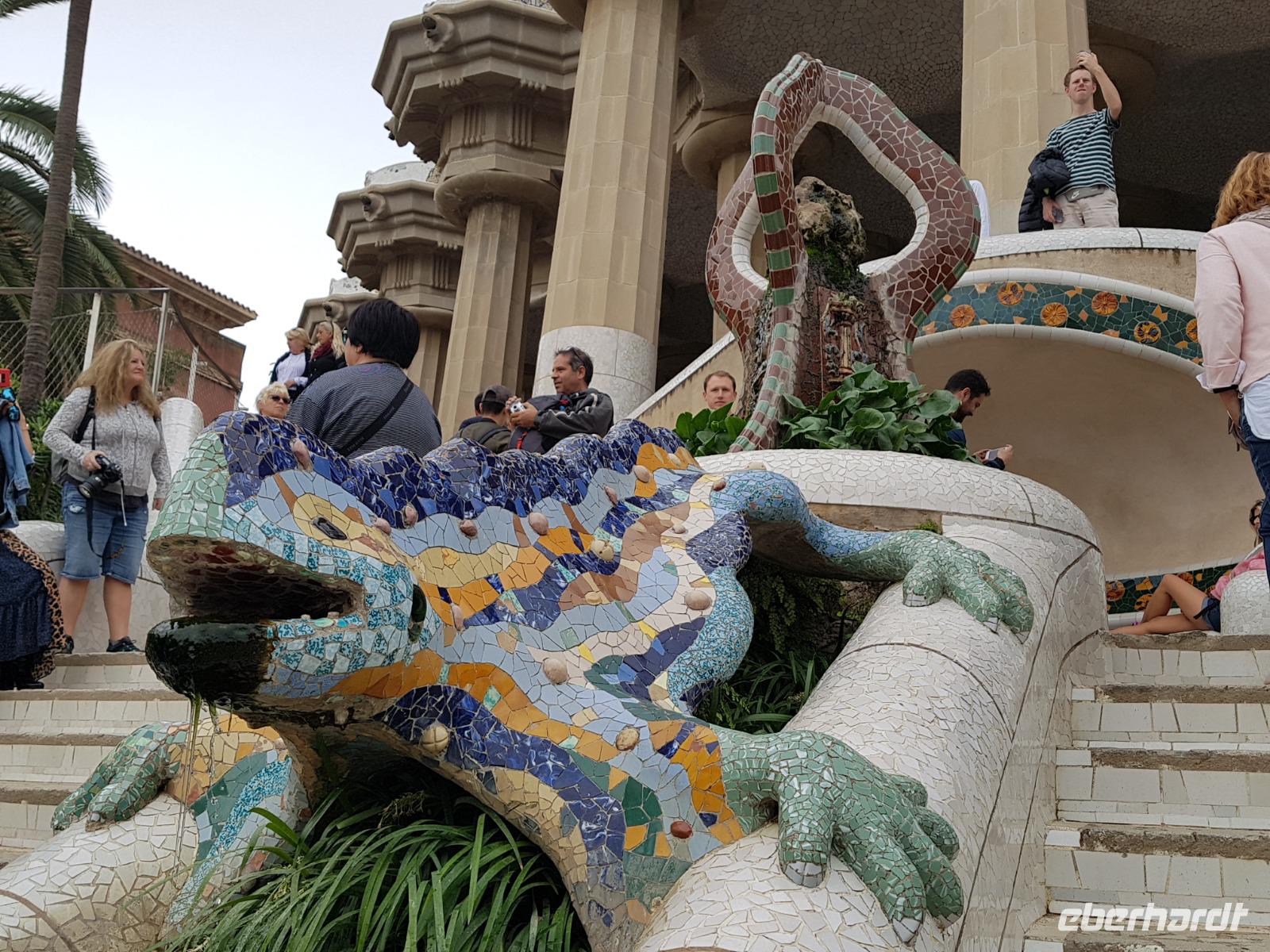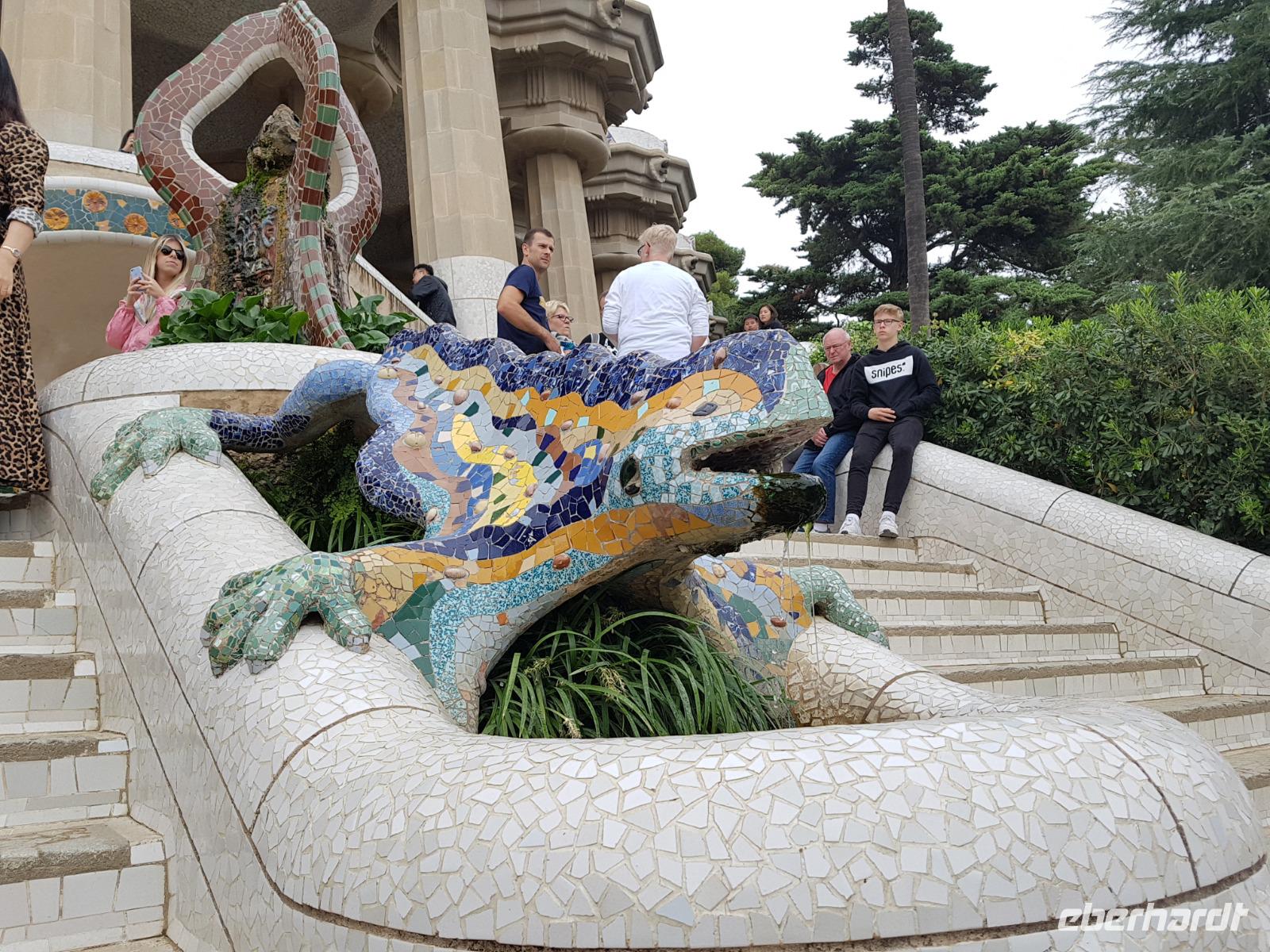 Von hier fuhren wir wieder mit dem Bus zum Besuch des Park Güell. Der Park war von den englischen Parkanlagen inspiriert und wurde zwischen 1900 und 1914 erbaut. Eusebi Güell, Industrieller und Namensgeber der riesigen Parkanlage, beauftragte Gaudi, ein Wohngebiet mit über 55 Villen zu gestalten. Dieses Vorhaben scheiterte jedoch und somit ist die Anlage uns heute als Touristen mit Eintrittskarten zugänglich. Die Anlage beeindruckt vor allem mit der schlangenförmigen Sitzbank aus Mosaiken. Uns gefällt es ser der Salamander-Brunner. Ist das beliebte Fotomotiv und befindet sich auf einem riesigen, von Säulen getragenen, Platz.