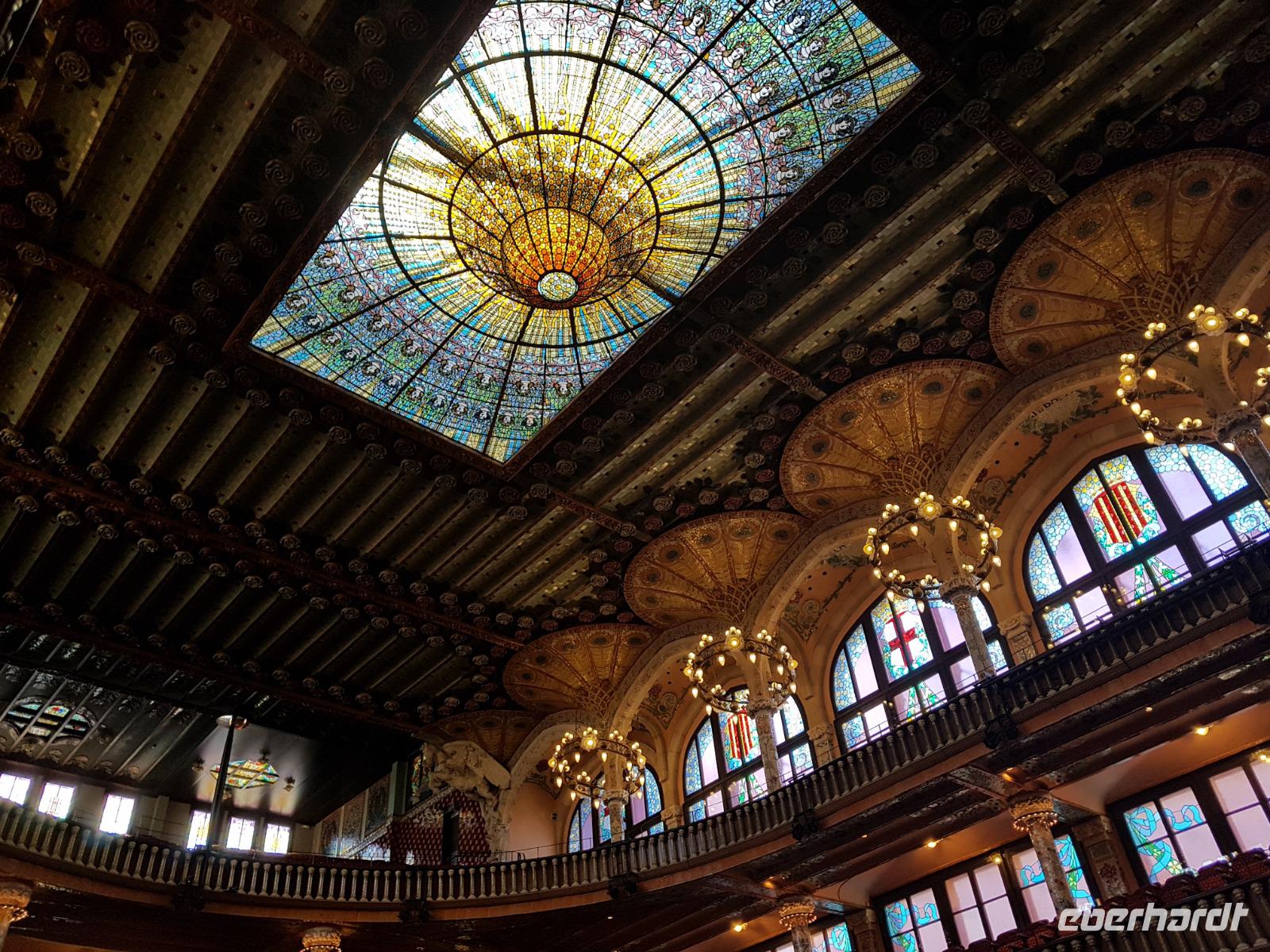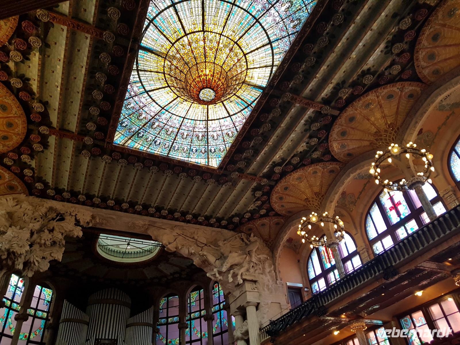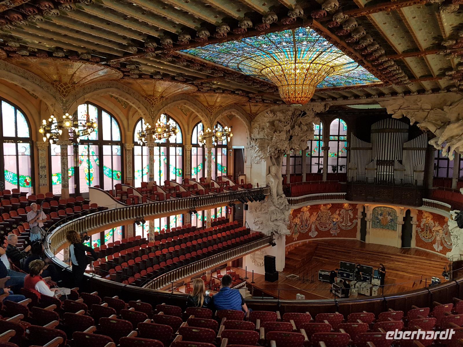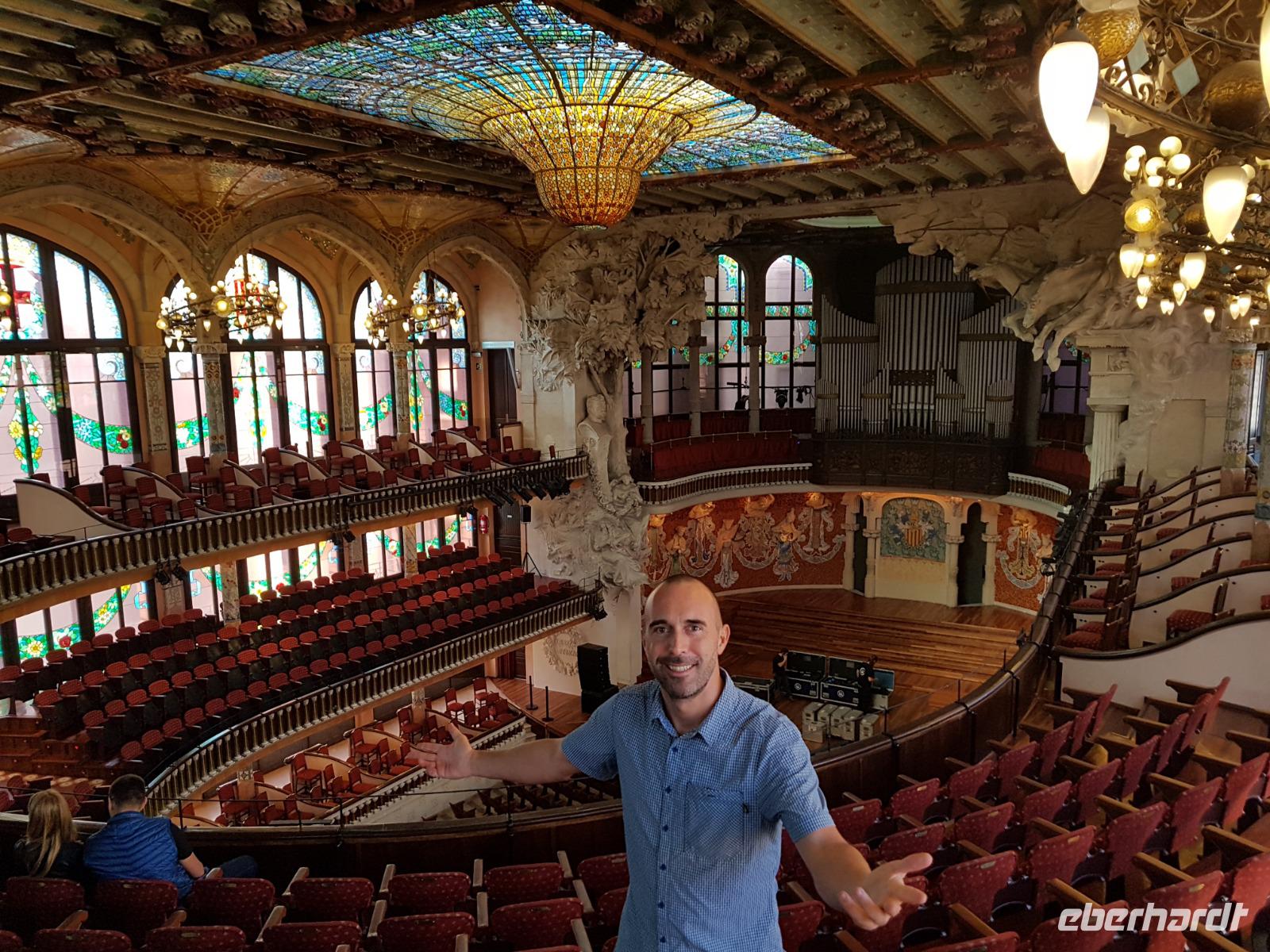 Nach diesem farbgewaltigen Erlebnis gingen wir weiter mit Quim durch die verträumten Gassen bis zum Palau de la Musica, einem Konzertsaal, entworfen von dem katalanischen Architekten Lluis Montaner ganz im Stil des Modernisme. Der Bau dauerte von 1905 bis 1908. Schon von Außen sah es wunderschön aus, noch viel eindrucksvoller wurde es aber dank unserer Entdeckungen während er Führung durch das Haus. Als Überraschung und fast am Ende der Führung, durfte Benjamin ein Lied im Konzertsaal vorsingen. Es war pure Gänsehaut, hier singen zu dürfen: „O Sole Mio ". Herrlich. Gemeinsam noch mit Quim liefen wir weiter bis zum Plaza del Rey. Der ehemalige Palast des Statthalters ist heute ein Archiv. Benjamin zeigte uns späeter und nicht weit von hier den römischen Tempel Barcino. Auf diesem kleinen Hügel wurde Barcelona damals gegründet.