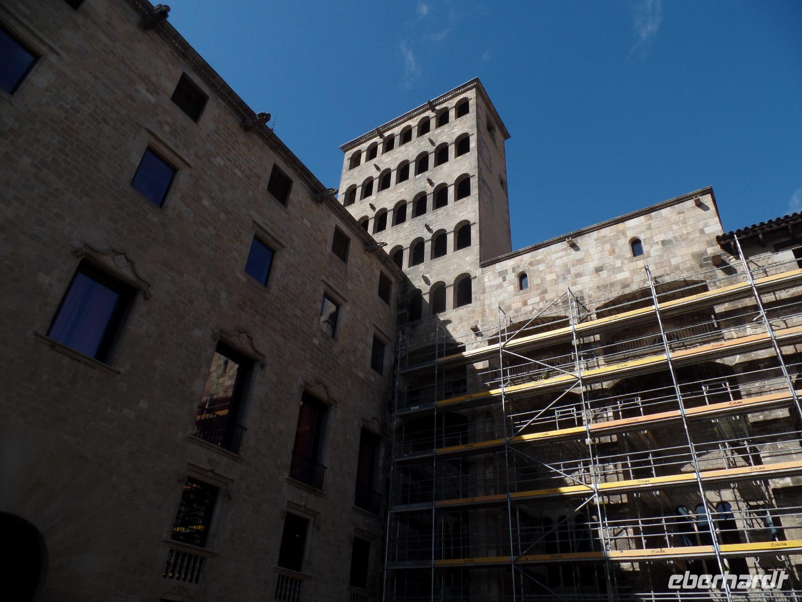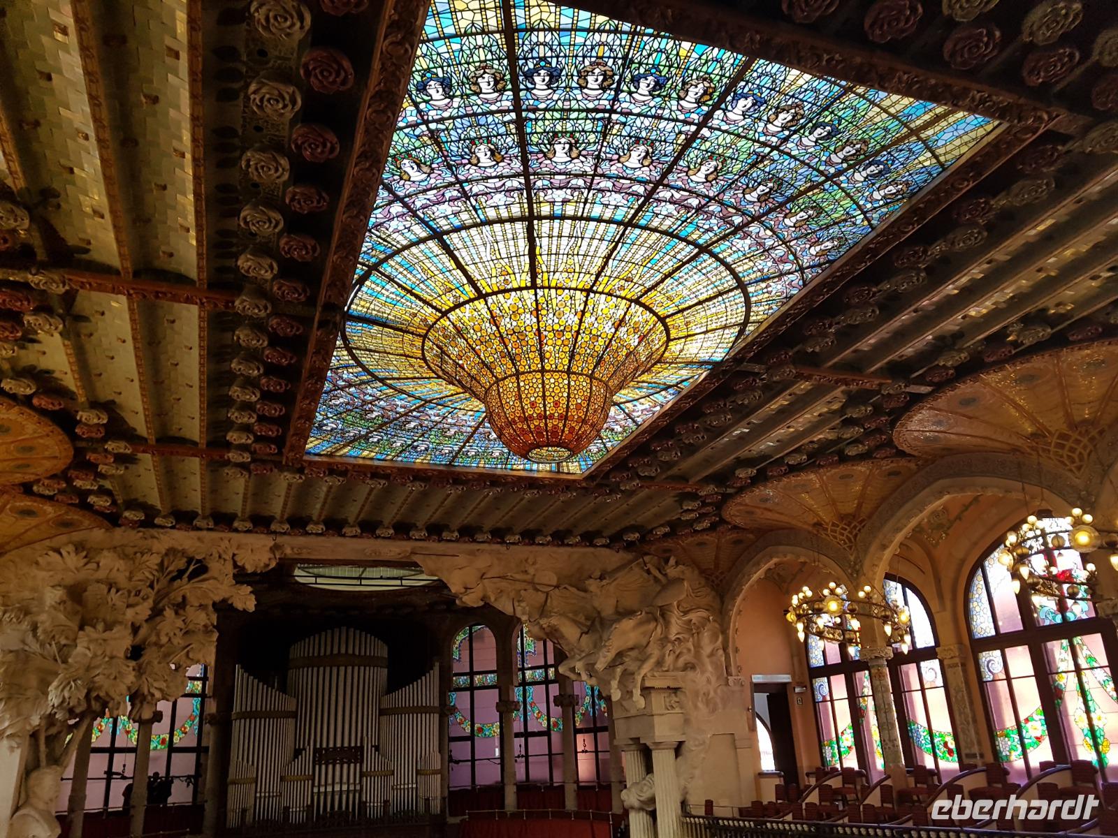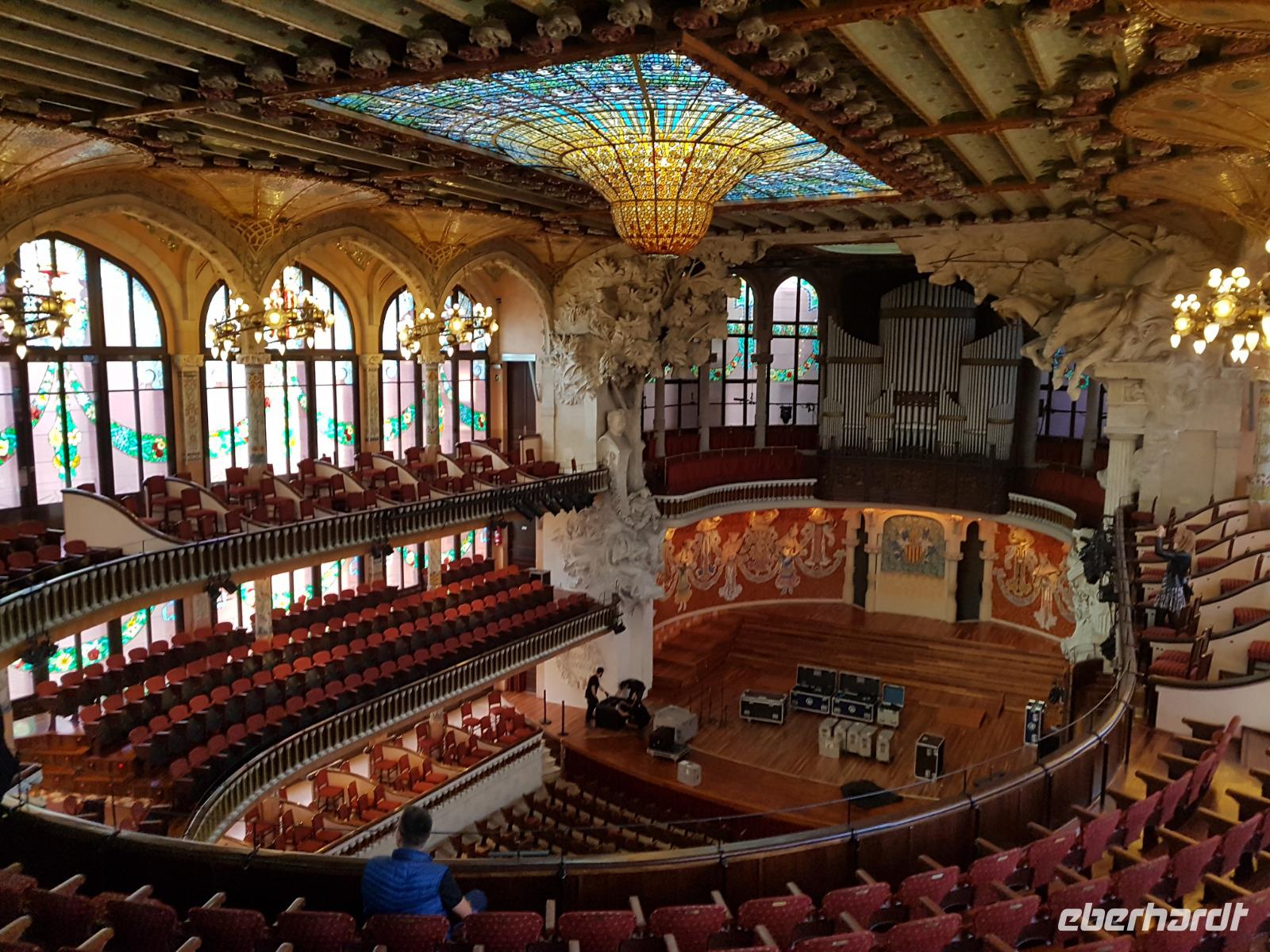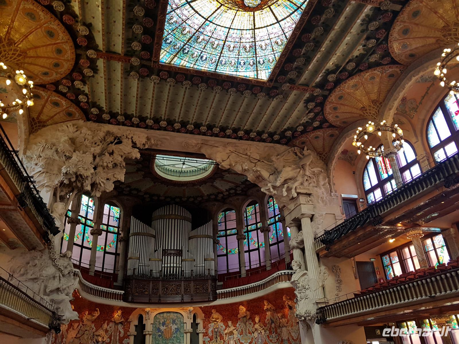 Nach diesem farbgewaltigen Erlebnis gingen wir weiter mit Quim durch die verträumten Gassen bis zum Palau de la Musica, einem Konzertsaal, entworfen von dem katalanischen Architekten Lluis Montaner ganz im Stil des Modernisme. Der Bau dauerte von 1905 bis 1908. Schon von Außen sah es wunderschön aus, noch viel eindrucksvoller wurde es aber dank unserer Entdeckungen während er Führung durch das Haus. Als Überraschung und fast am Ende der Führung, durfte Benjamin ein Lied im Konzertsaal vorsingen. Es war pure Gänsehaut, hier singen zu dürfen: „O Sole Mio ". Herrlich. Gemeinsam noch mit Quim liefen wir weiter bis zum Plaza del Rey. Der ehemalige Palast des Statthalters ist heute ein Archiv. Benjamin zeigte uns späeter und nicht weit von hier den römischen Tempel Barcino. Auf diesem kleinen Hügel wurde Barcelona damals gegründet.
