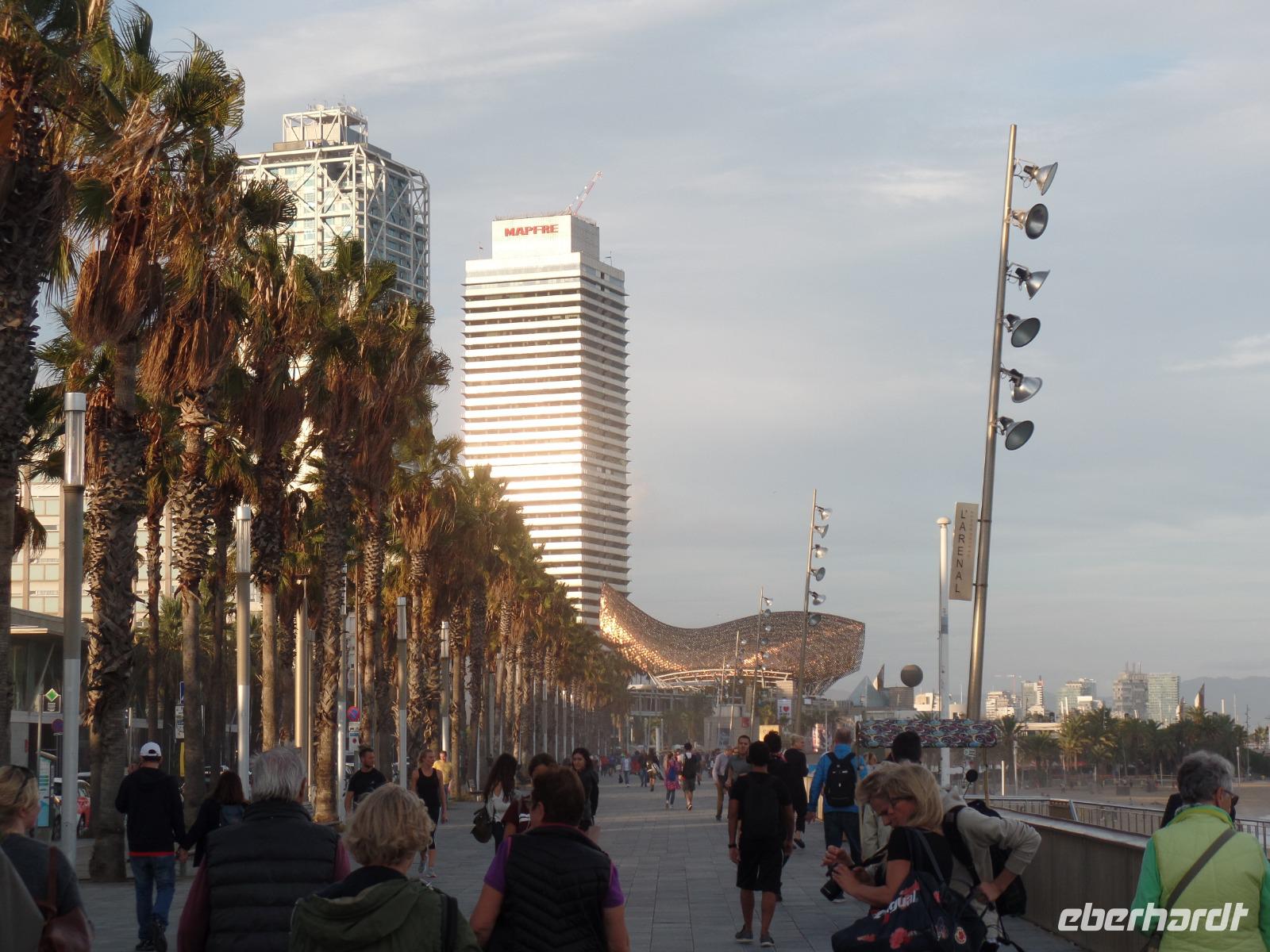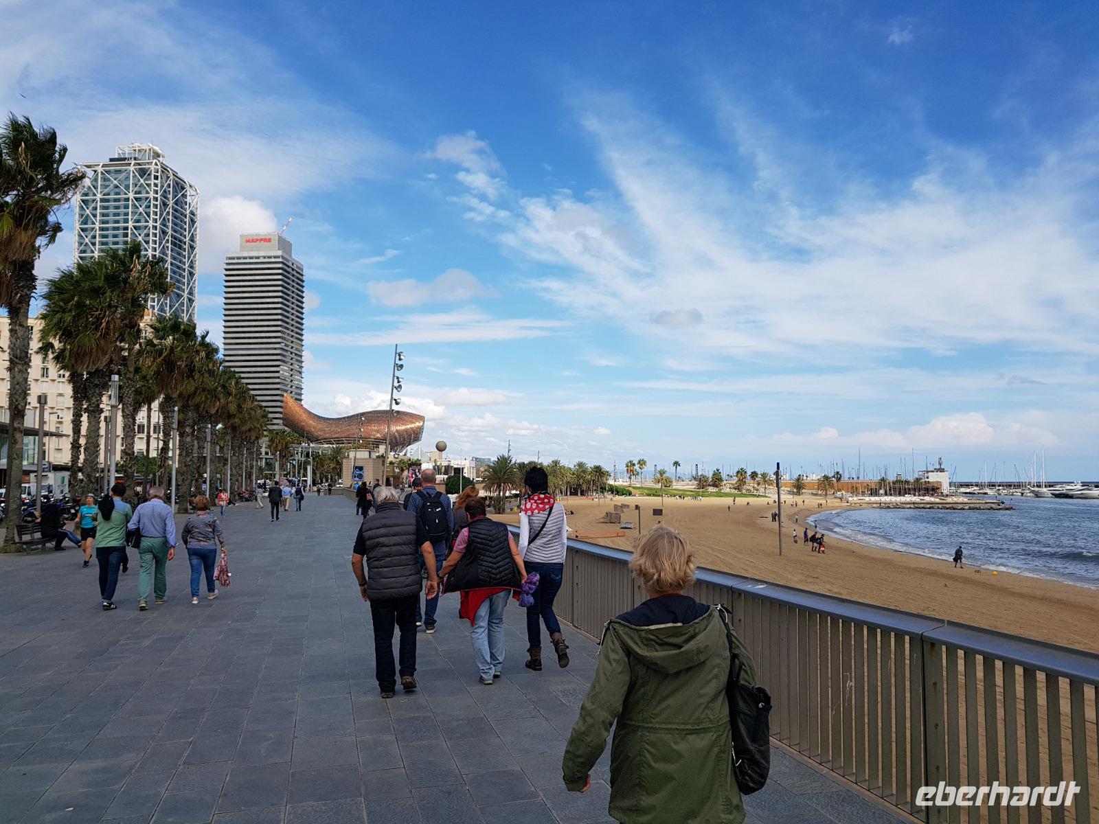 Am früh Nachmittag trafen wir uns alle wieder. Gemeinsam mit Benjamin gingen wir erstmal zum Sant Jaume Platz wo das Rathaus und gegenüber davon das Gebäude von der Regierungs Catalunya sich befinden. Wir waren schon mitten drin im Gassengewirr der Altstadt und gelangten schließlich über den Plaza Real wieder zur weltbekannten Einkaufsstraße La Rambla. Da Stand der Markt-Halle La Boqueria mit ihrem delikaten Angebot im Mittelpunkt, die viele von uns schon heute vormittags in Ruhe besuchten. Wir fuhren mit einem Zahnradbahn hoch auf dem Montjuic Hügel und von dort zu Fuß bis zum Seilbahn Station mit wieder eine Terrasse mit tollen Blick auf Barcelona. Mit dem Seilbahn fuhren wir zum Strand La Barceloneta und immer am Strand entlang bis zum Restaurant. Es lag direkt an der Olympischen Villa am Strand! Herrlich. Benjamin hat hier ein typisch spanisches und erlesenes Abendessen bestellt, das allen sehr gut schmeckte: Vier verschiedene Vorspeisen, von Garnelen über kleine Tintenfische, spanische Salami, Käse und frische kleine Fische durften wir probieren. Wir waren schon satt, als das Hauptgericht serviert wurde: Seehecht, Thunfisch-Filet, gegrilltes Gemüse oder Paella, alles ausnahmslos köstlich. Wir als Reiseveranstalter übernahmen für die Gäste die Getränke. Das Dessert war auch sehr gut so wie einen heimischen Kräuterlikör. Fantastisch! Wir waren eigentlich alle satt, aber Benjamin hatte noch eine Überraschung. Als Abschluss für die Reise gingen wir auf die Dach Terrasse des Hotels Iberostar direkt an dem Plaza Catalunya. Wir genossen zum Abschluss einen köstlichen Cocktail hoch oben auf dieser herrlichen Dachterrasse über der Stadt. Es war so schön, dass wir es nicht vergessen werden und nicht weggehen wollten. Von hier sah man vieles oder alles: Sagrada Familia, Montjuic, die Kathedrale... Uns geht es gut;) Auf Barcelona und auf uns??