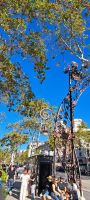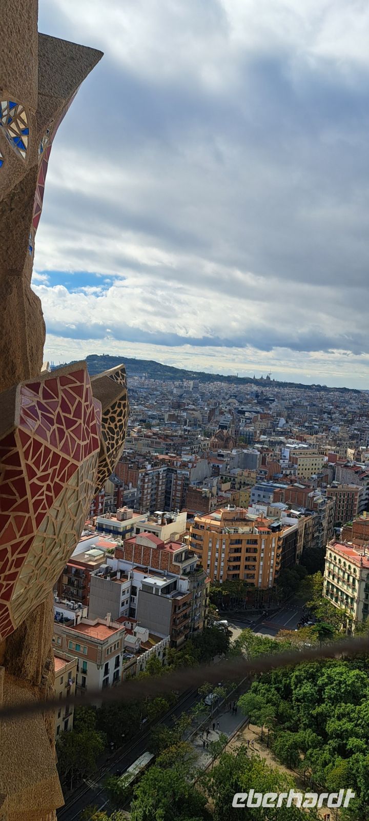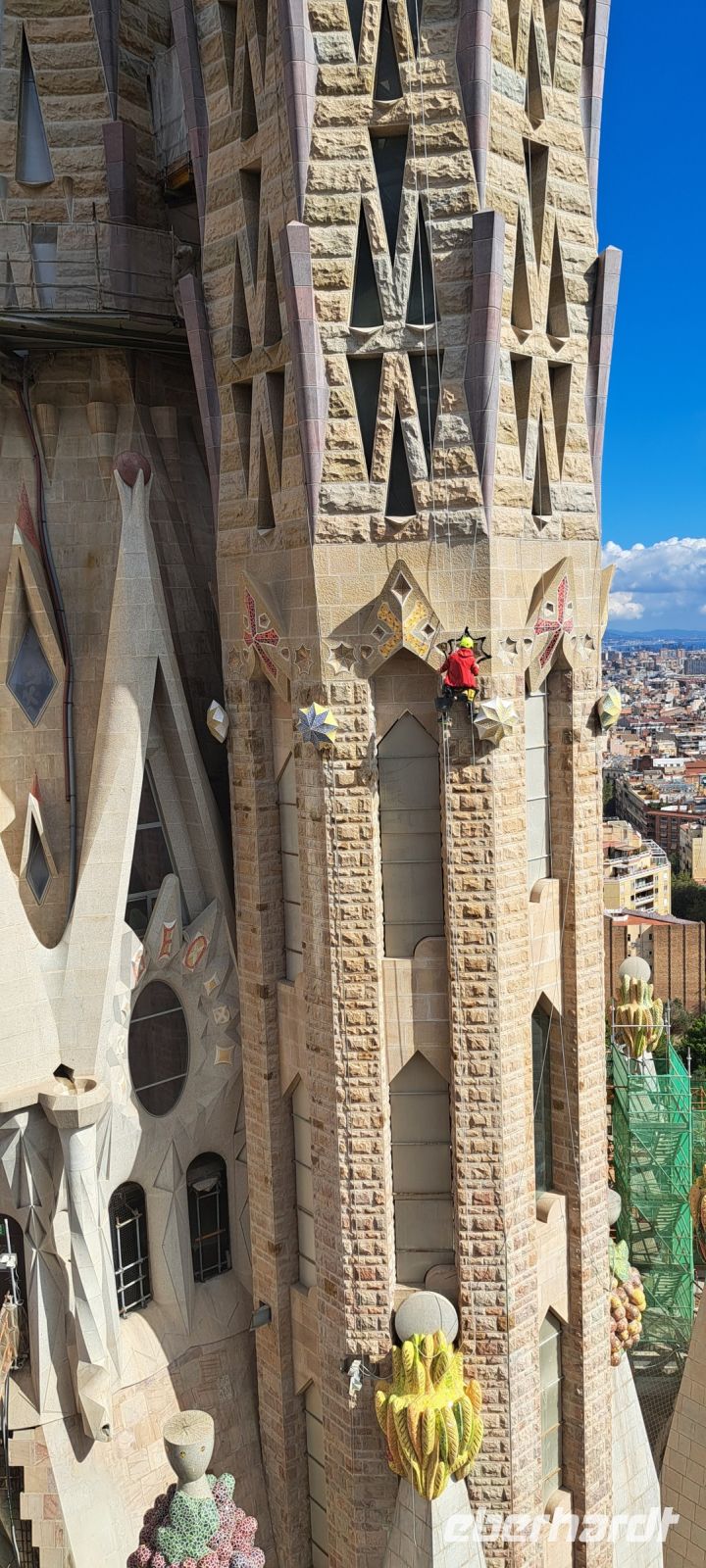 Wir bewundern die Kirche auch von innen. Die fantastischen Glasfenster. Gaudi hat sich immer von der Natur inspirieren lassen das ist allgegenwärtig. Einige fahren noch mit einem Aufzug hoch in einen der bis jetzt 8 fertiggestellten Türme (es werden insgesamt 12, die den Jüngern Jesu gewidmet sind ), es eröffnet eine weitere interessante Sicht auf die Kirche. Natürlich hat man von hier oben eine sensationelle Aussicht. Runter muss man viele Stufen laufen und es wird uns fast schwindelig. Doch es hat sich gelohnt. Bruno erzählt uns noch, dass der Kranfahrer, der an den Türmen arbeitet morgens die Leiter mit unendlich vielen Stufen heraufklettert und abends wieder hinunter. Das Kranfahrerhaus verfügt in schwindelerregender Höhe über eine Küche und ein Bad.