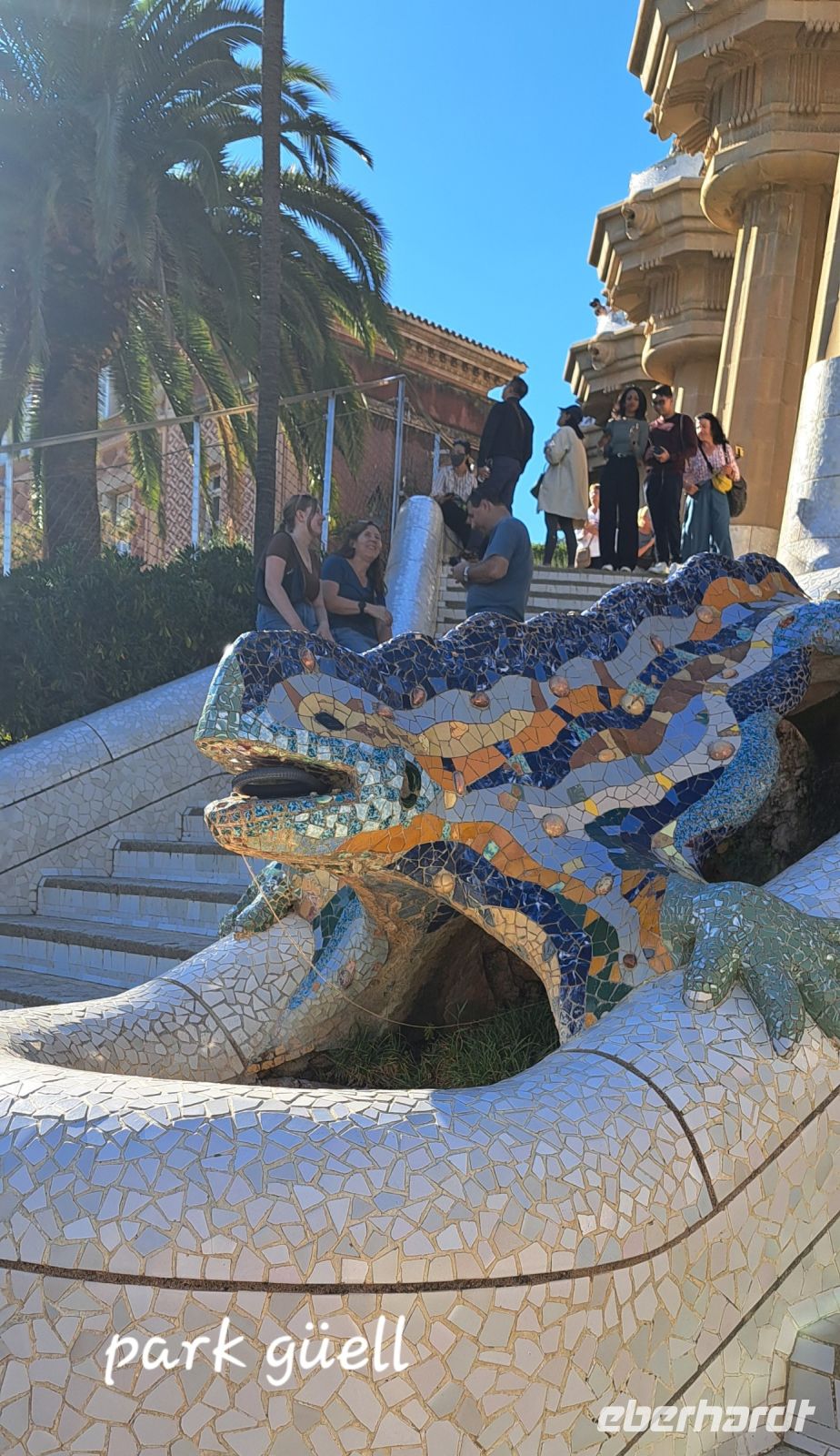 Der Park Güell ist sicherlich der schönste Park in Barcelona. Der Park war eine Auftragsarbeit für den Industriellen Eusebi Güell. Gaudi plante daraufhin eine von der Natur inspirierte Gartenstadt, der Plan scheiterte allerdings da wenig Interesse bei der Bevölkerung bestand, damals soweit aus der Stadt zu ziehen. Heute zieht der Park mit seinen Mosaikbänken, vielen Säulen, Salamanderbrunnen, und "Zuckerbäckerhäuschen" sehr viele Touristen an. Wir mussten uns an ein Zeitfenster von einer Stunde halten, was eigentlich zu wenig Zeit war den Park mit seiner Vielfalt zu bestaunen.
