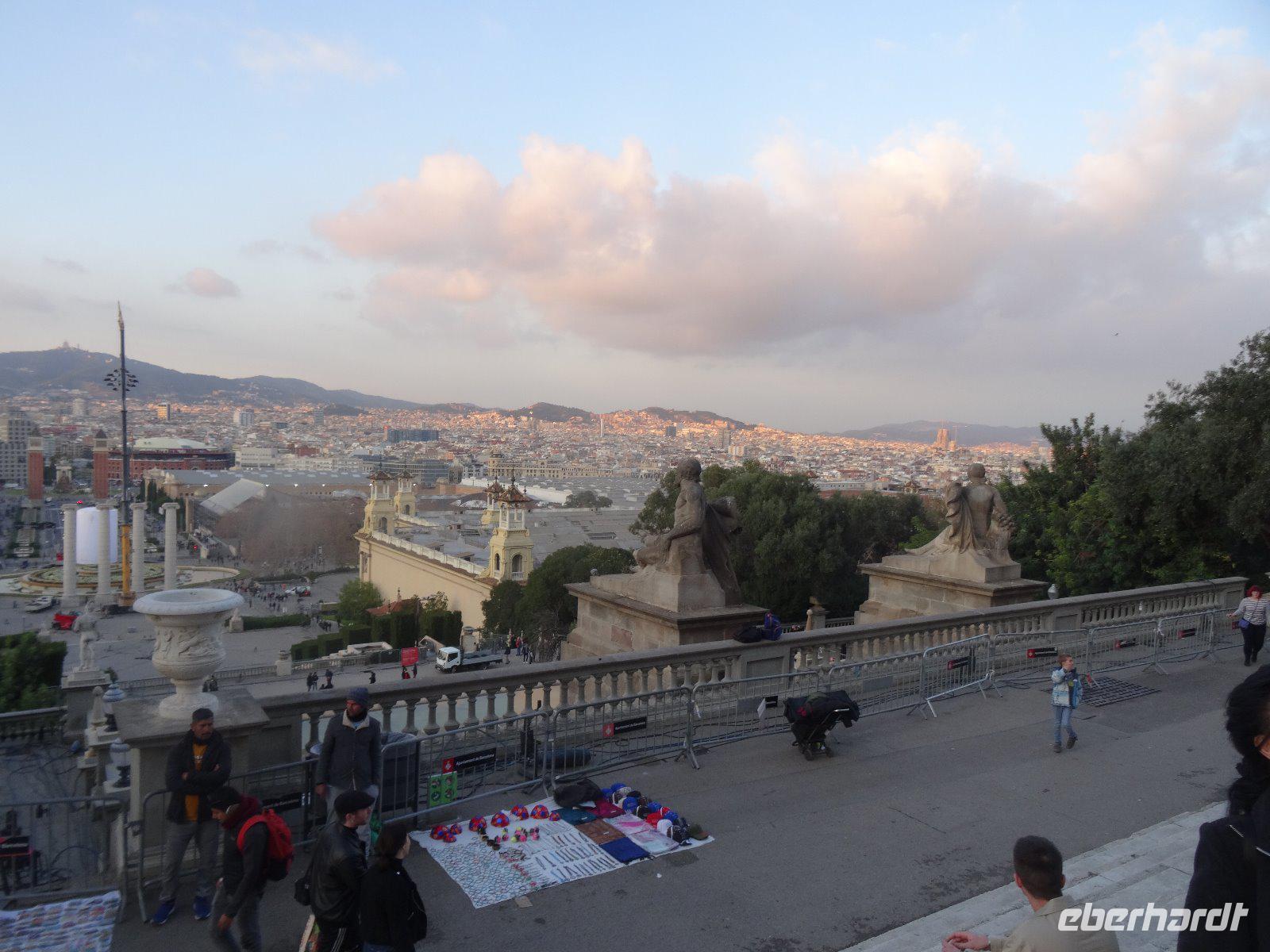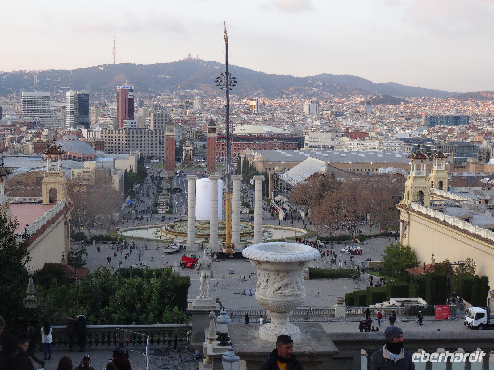 Bevor wir den Berg verlassen, fahren wir zum Palau Nacional, das Gebäude ist das Kunstmuseum Kataloniens. Von hier genießen wir nochmals die Aussicht und sehen auch die "Stadtmauern" des Poble Espanyol, es beherbergt hinter seinen Mauern Gebäude aus allen Regionen Spaniens. Die magischen Springbrunnen sind leider nicht in Aktion, und so beschauen wir noch den deutschen Pavillon von Mies van der Rohe von der Weltausstellung 1929 und passieren das Ausstellungsgebäude mit Werken des Malers Joan Miro. Zu Füßen der Burg spazieren wir zum Aussichtspunkt "Mirador de Alcalde" und erfreuen uns nochmals an der herrlichen Aussicht. Vom Bus aus sehen wir einige Einrichtungen, die der Olympiade 1992 dienten, wie das Stadion, 1929 errichtet und 1992 umgebaut und modernisiert, die Schwimmbecken und den Funkturm von Calatrava sowie den Palast Sant Jordi vom Stararchitekten Isozaki.