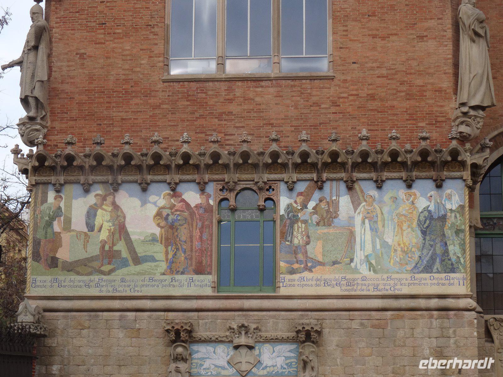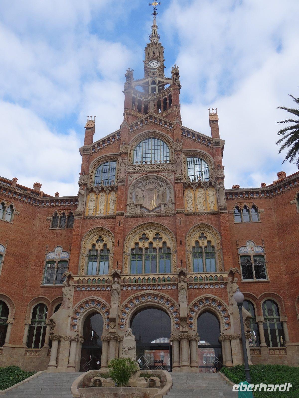 Nach diesem schönen Spaziergang besuchen wir noch ein weiteres Zeugnis von Barcelonas Jugendstil - das Hospital de la Santa Creu i Sant Pau. Es wurde 1902 von Lluis Domenech i Montaner entworfen und im wesentlichen von dem katalanischen Bankier Pau Gil finanziert. Das Krankenhaus ist wie eine kleine Stadt mit einzelnen Häusern und viel Grün dazwischen, dadurch sollte die Genesung der Kranken schneller vorangehen. Die Verbindung zwischen den Häusern und die Diensträume befanden sich unter der Erde. 1930 wurde das Krankenhaus eingeweiht und war bis in die 1970er Jahre noch in Betrieb, gegenwärtig ist es Museum und Veranstaltungsort.
