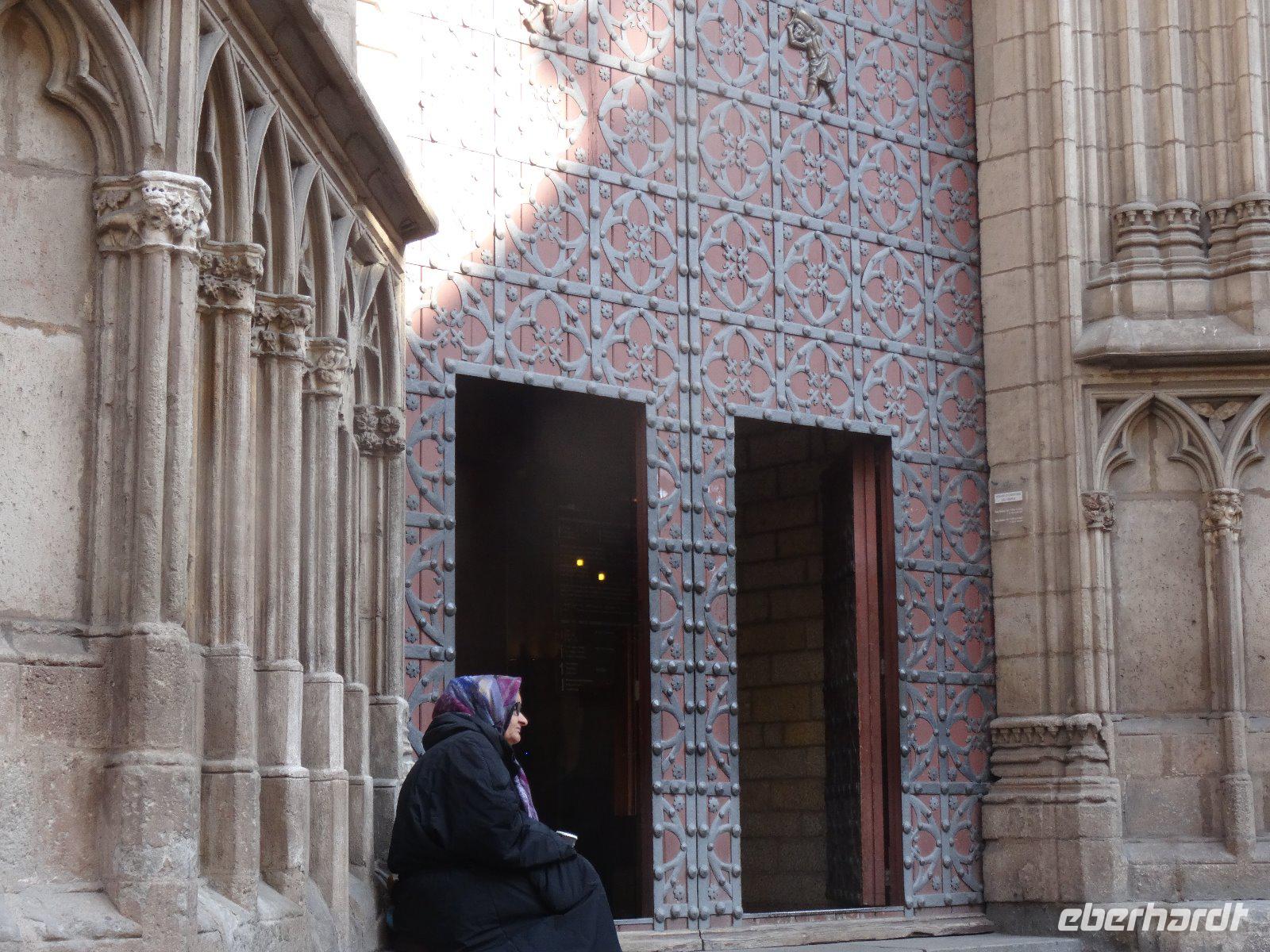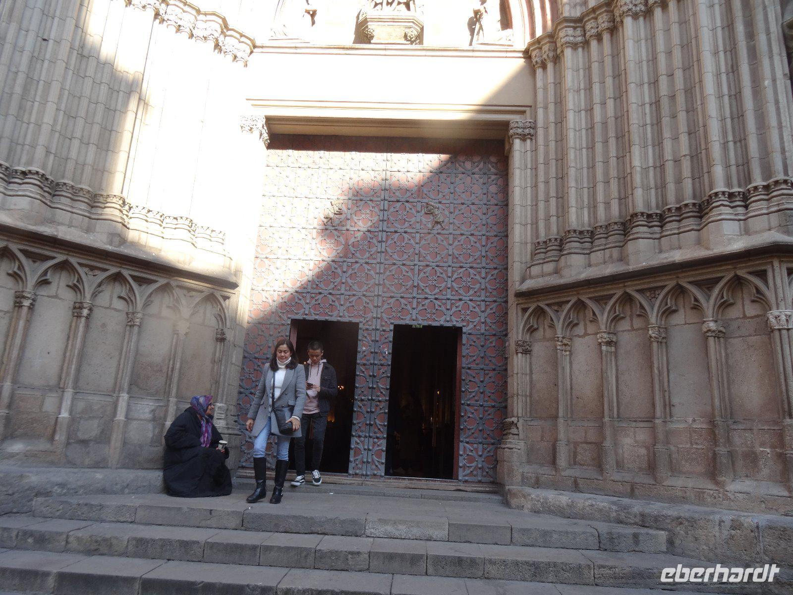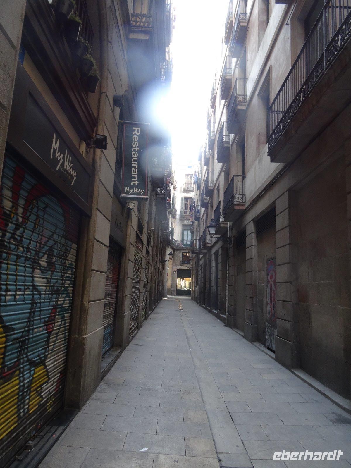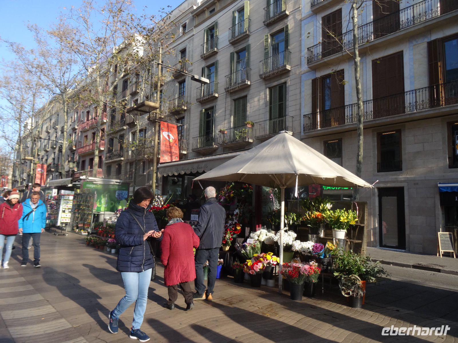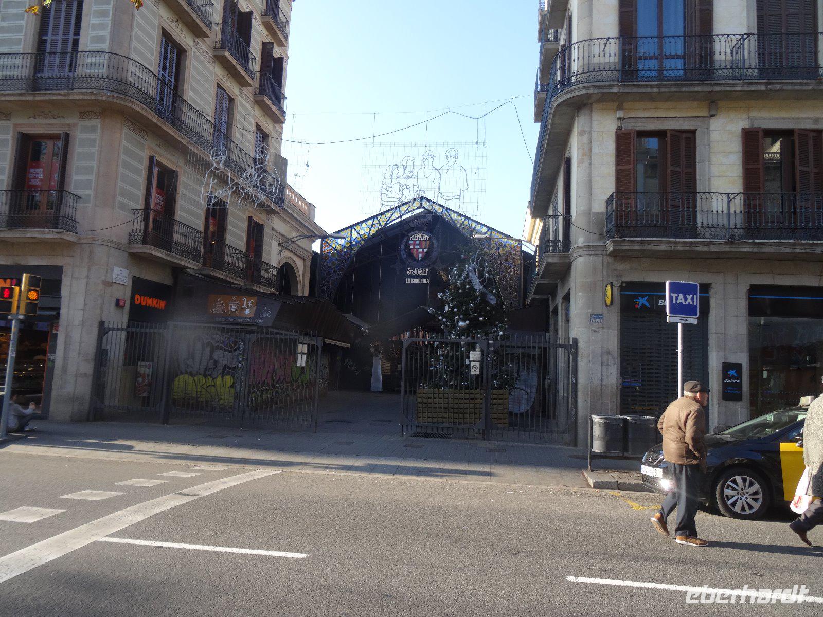 Um 10:00 Uhr starten wir zum Spaziergang durch die Altstadt. Noch sind wenige Fußgänger unterwegs und so erfreuen wir uns an der morgendlichen Ruhe auf der Rambla. Sie beginnt ja in der Nähe unseres Hotels und heißt im ersten Abschnitt Font de Canaletes wegen des eisernen Brunnens. Die Straße selbst ist in einem ausgetrockneten Flussbett angelegt. Danach folgt der Abschnitt "Vogel-Rambla", es wurden hier viele Singvögel verkauft. Heute gibt es hier auch andere Haustiere zu kaufen,d.h.am 1.1. nicht, da ist alles geschlossen. Der nächste Abschnitt ist die Blumen-Rambla, wegen der vielen Blumenverkäufer.Wir statten der nahegelegenen Kirche Mare de Deu de Betlem einen Besuch ab. Sie ist eine Barockkirche, aber sehr schlicht, da die Innenausstattung im spanischen Bürgerkrieg verbrannte. Sie war Teil eines Jesuitenklosters und am Eingang steht noch die Figur seines Gründers, Ignacio von Loyola. Wir sehen das imosante Gebäude, welches die "Riesen" beherbergt, große Figuren, in welche bei Umzügen die Menschen hineinschlüpfen und sie durch die Straßen tragen. Daneben befindet sich die altehrwürdige Musikalienhandlung Beethoven.