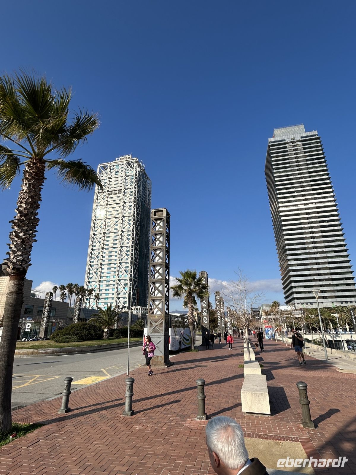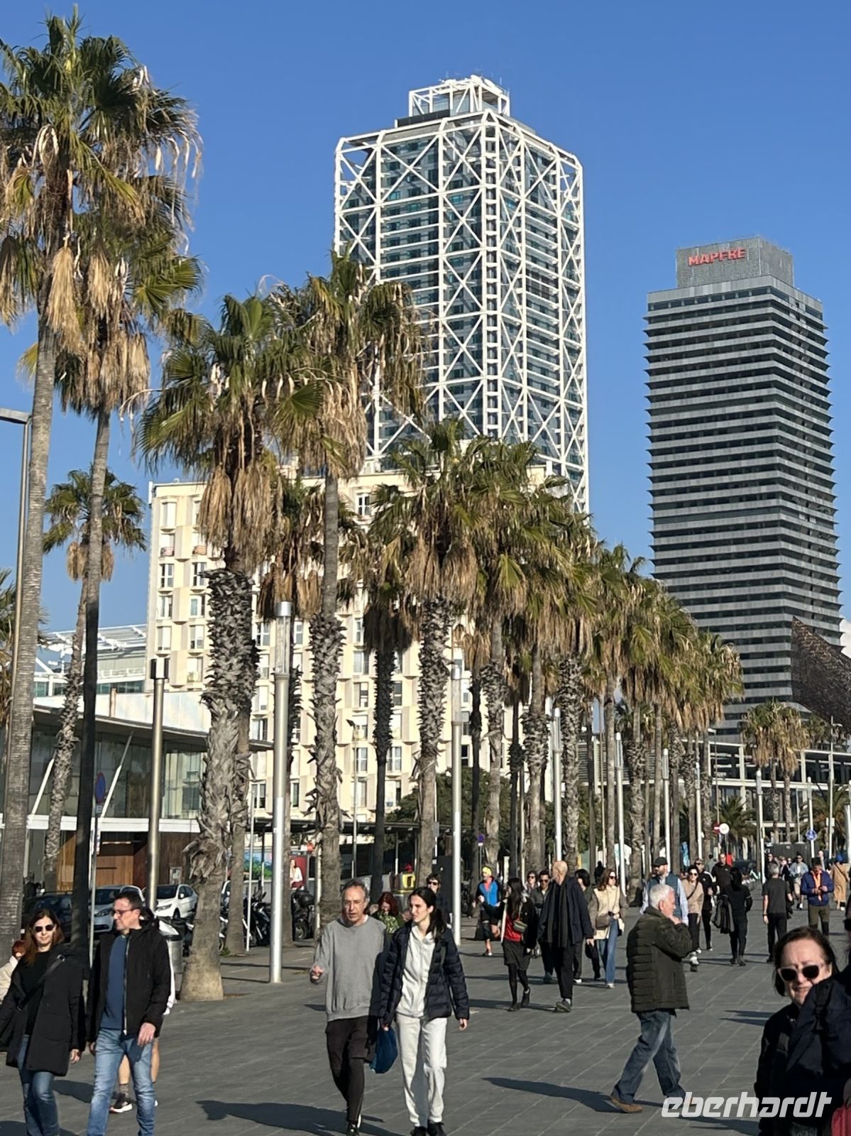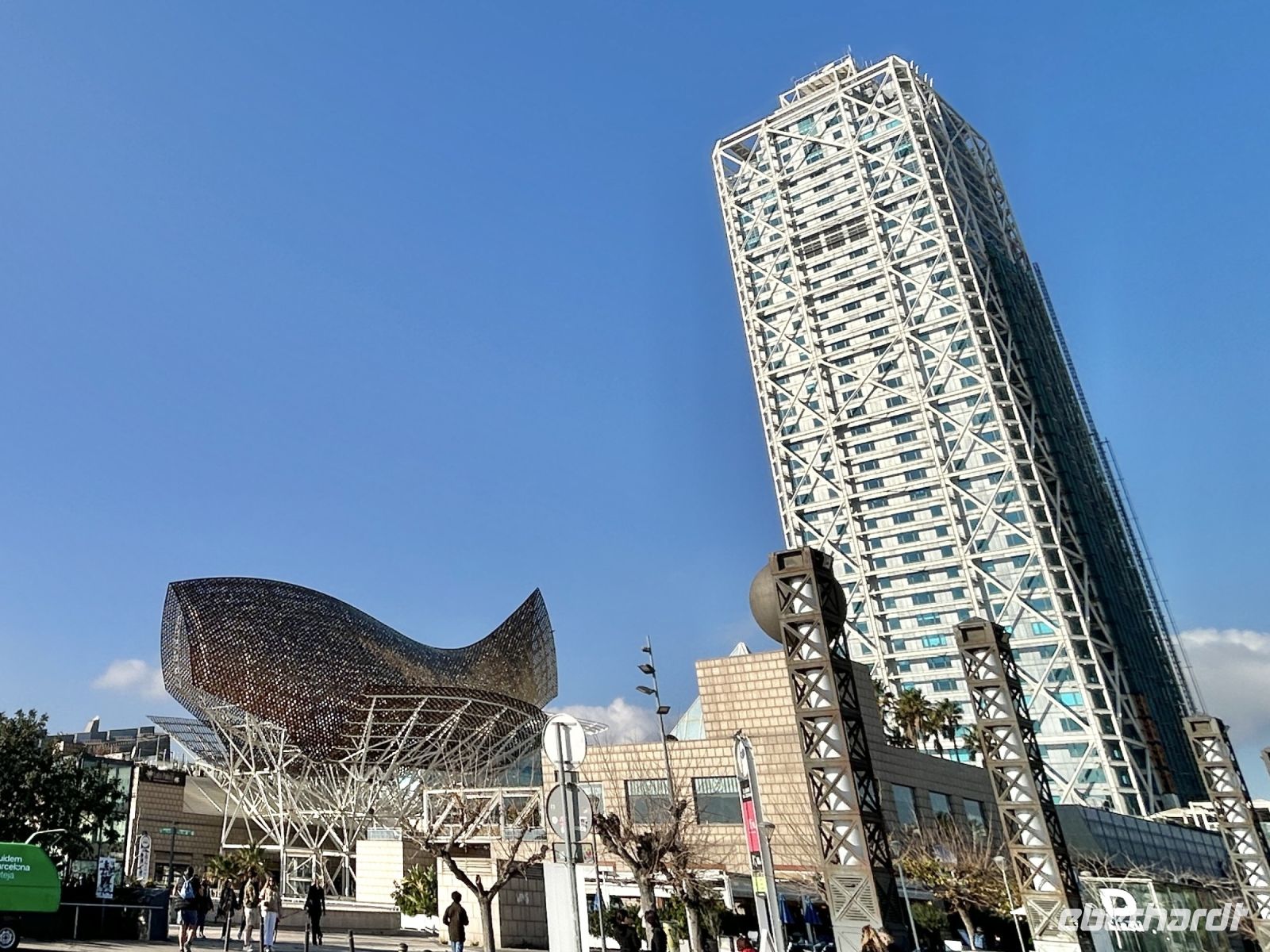 Der Puerto Olimpico ist Endstation der Buslinie D20 und von hier aus schlendern wir los, entlang der Promenade, und bestaunen auch die Skulptur in Form eines Fisches vor dem Hotel Arts.