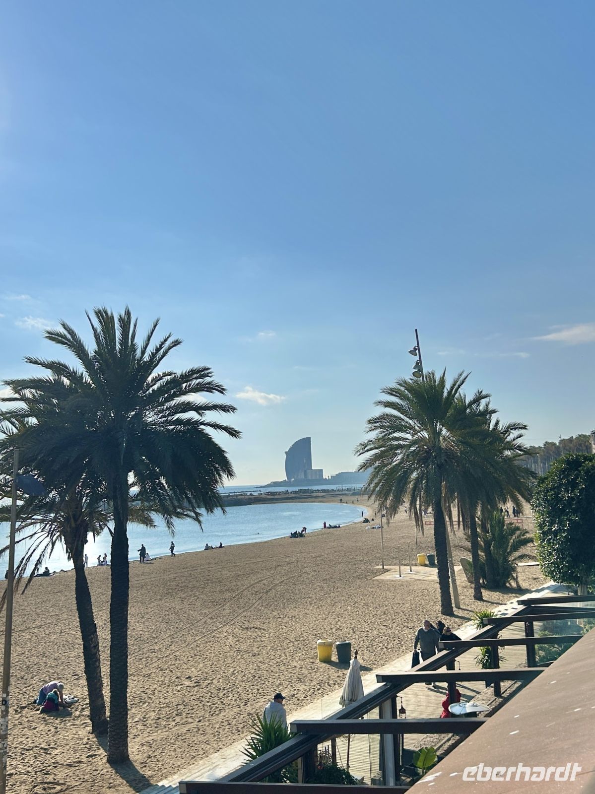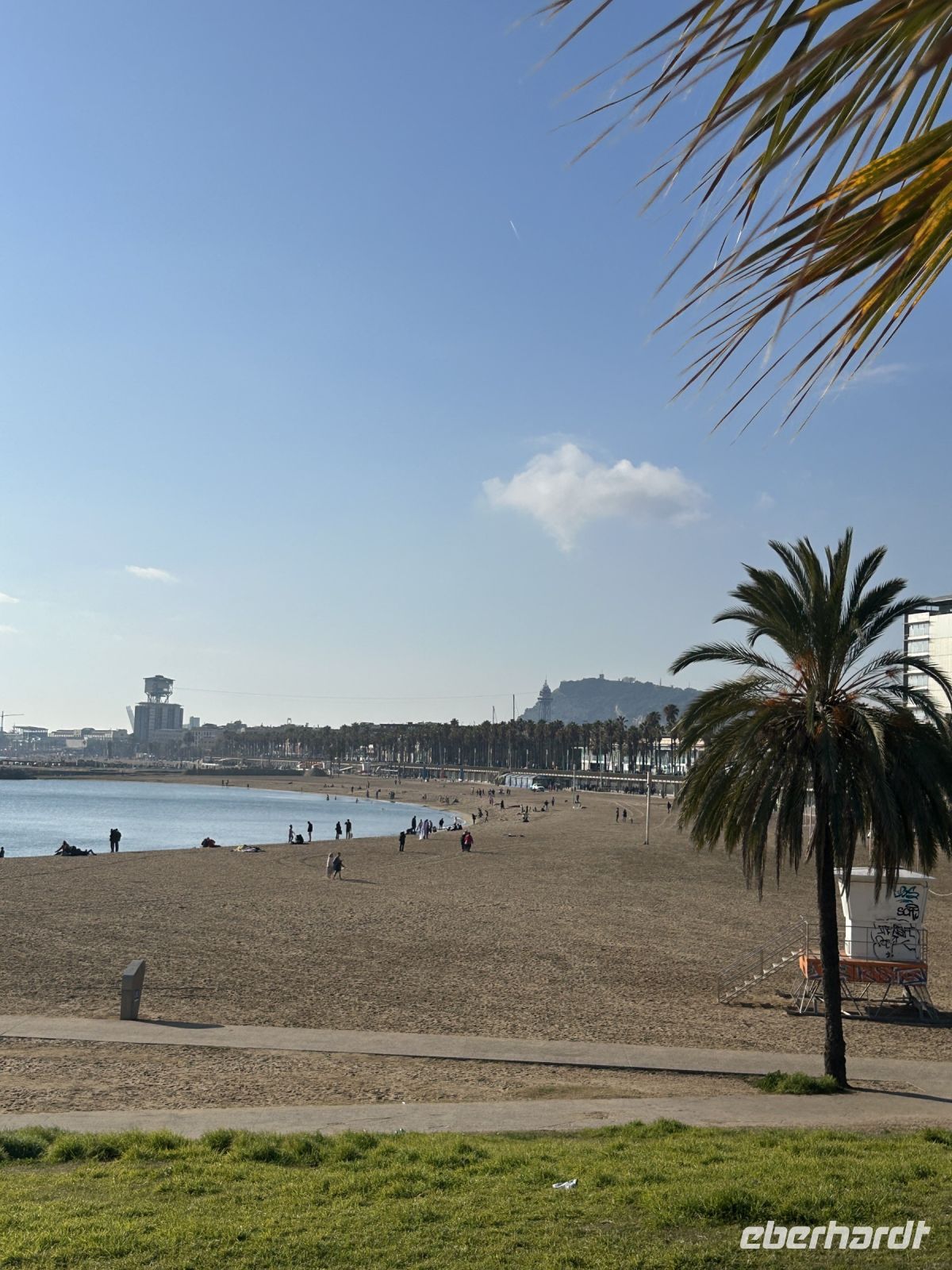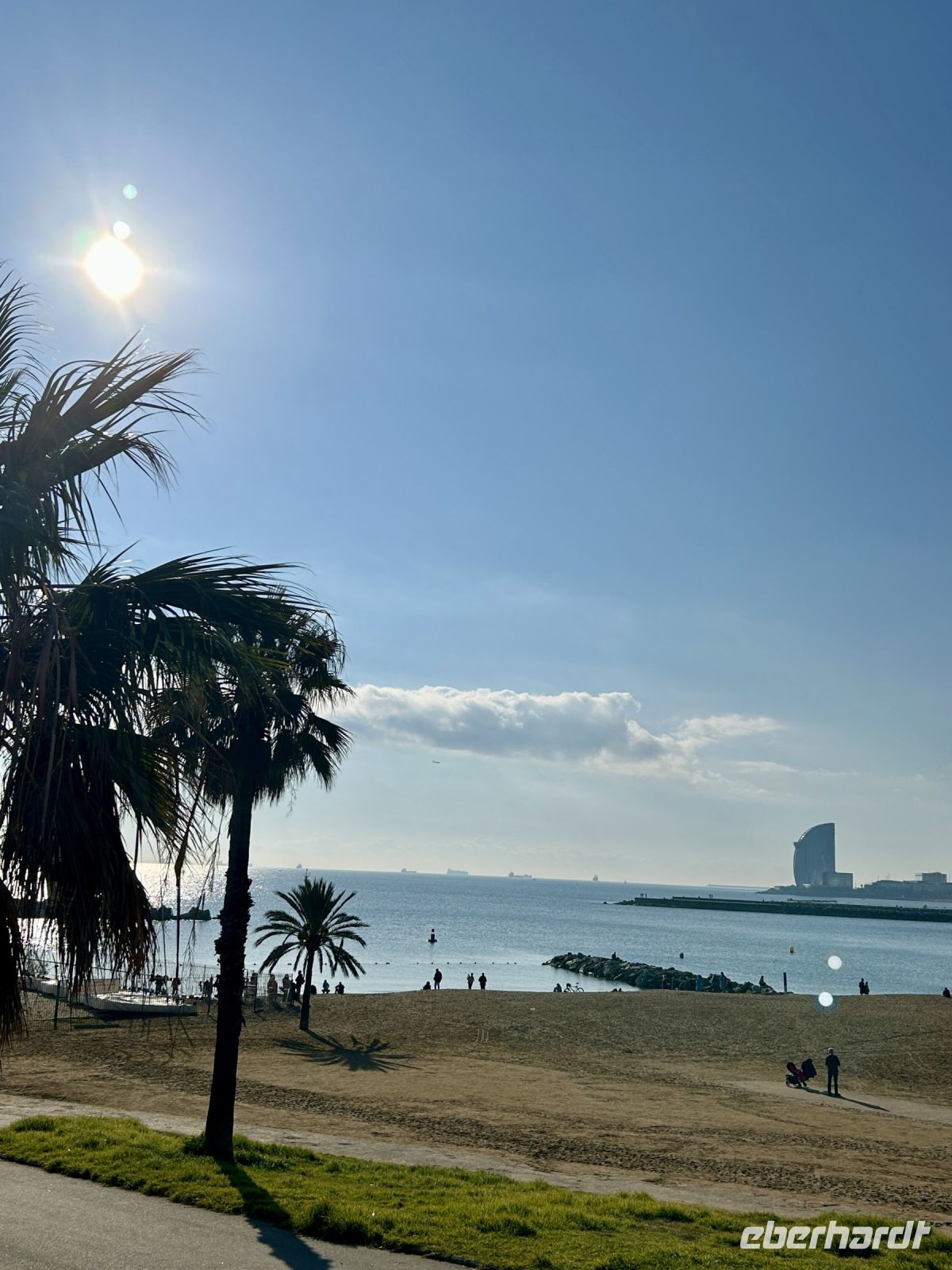 Am Neujahrsmorgen genießen wir die Meeresbrise am Strand von Barceloneta. Hier treffen sich Einheimische und Touristen gleichermaßen, um die Sonne zu genießen.