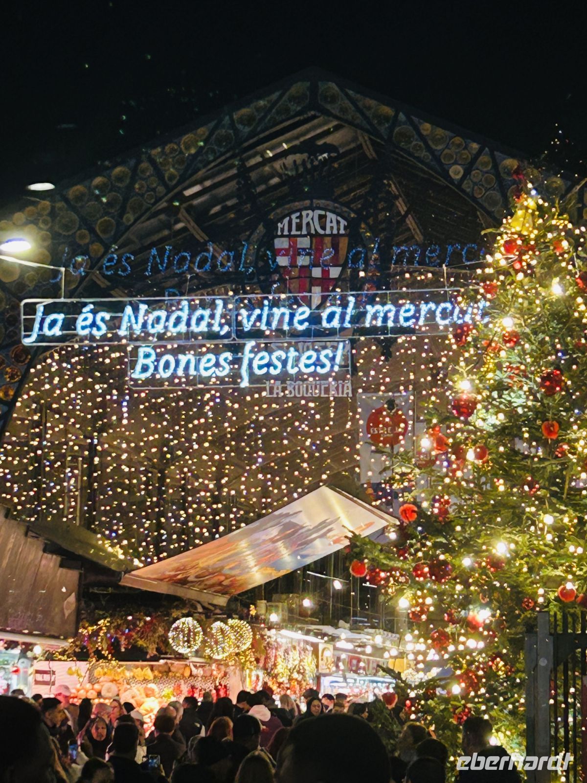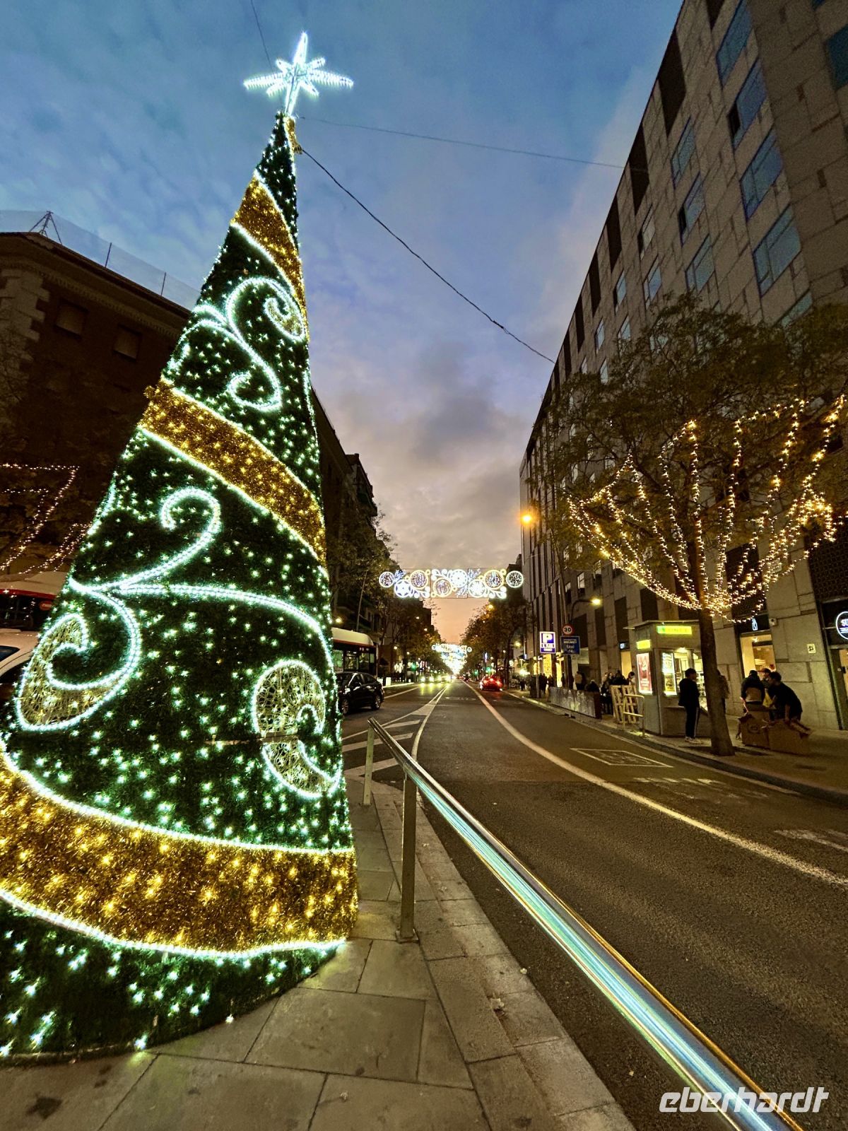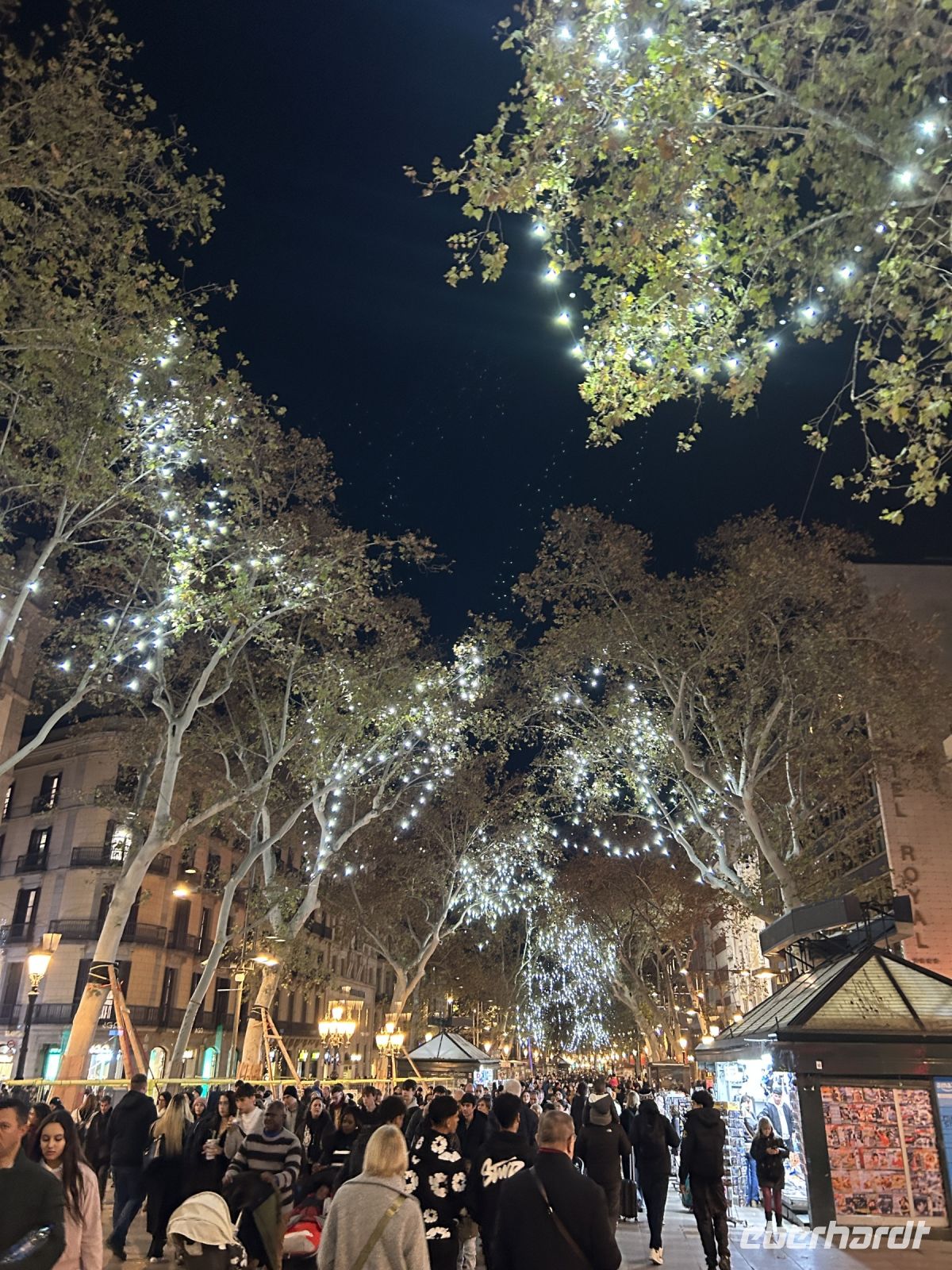 Am Abend machen wir uns (gemeinsam mit der Metro) auf den Weg zu den berühmten Ramblas – der pulsierenden Promenade, die sich vom Plaça de Catalunya bis zum Hafen erstreckt. Hier mischen sich Straßenkünstler, Blumenstände und Cafés zu einem bunten Mosaik. Und jetzt, zum Jahresende, beeindruckt eine üppig-fantasievolle Weihnachtsbeleuchtung.