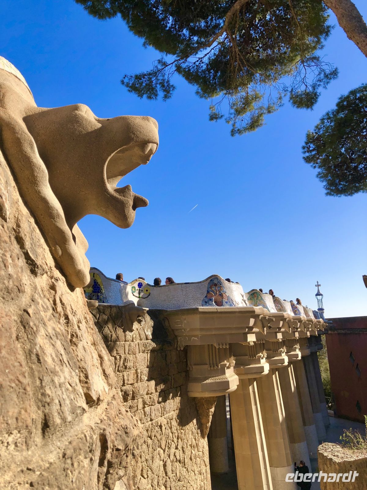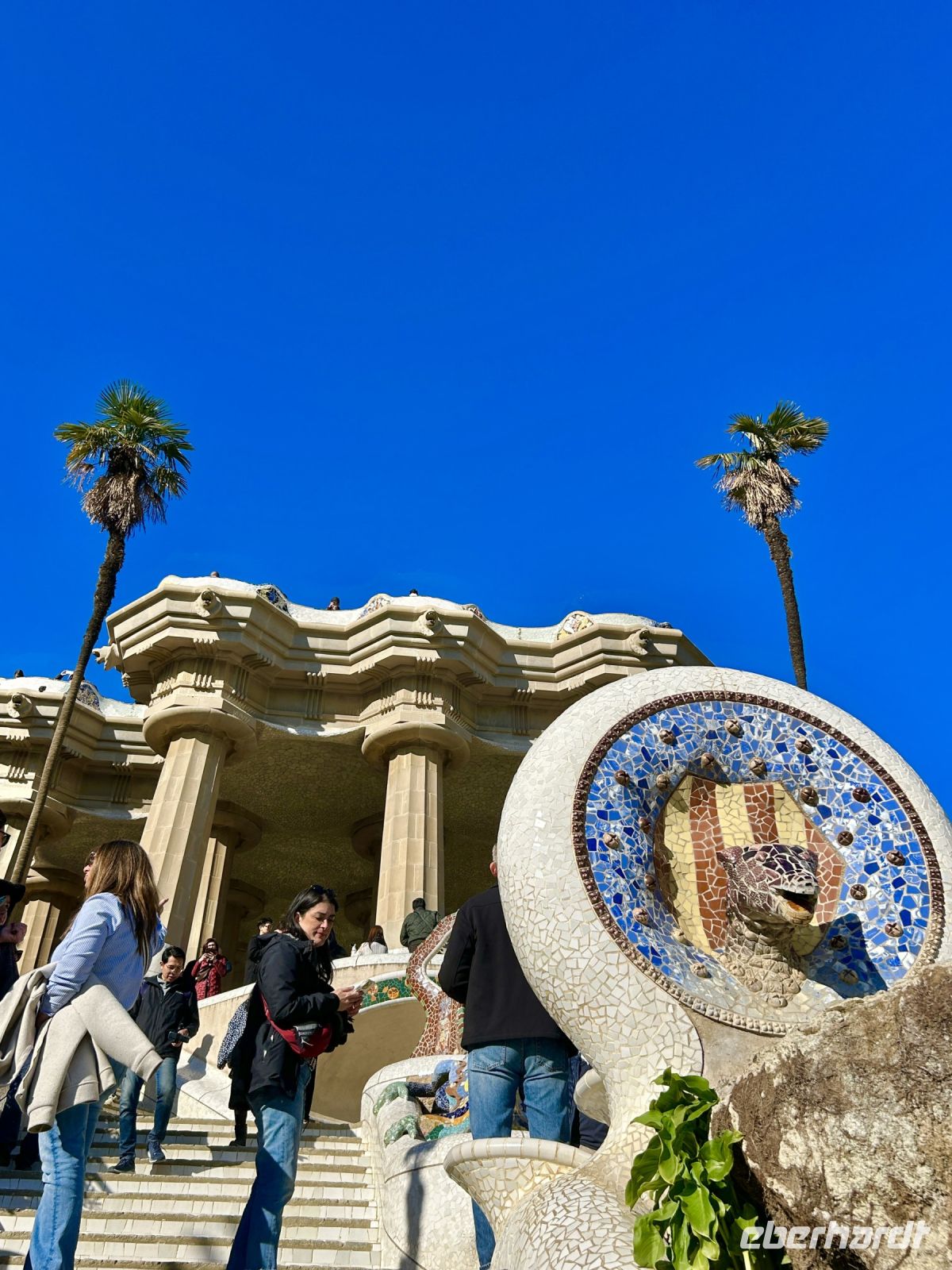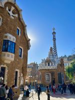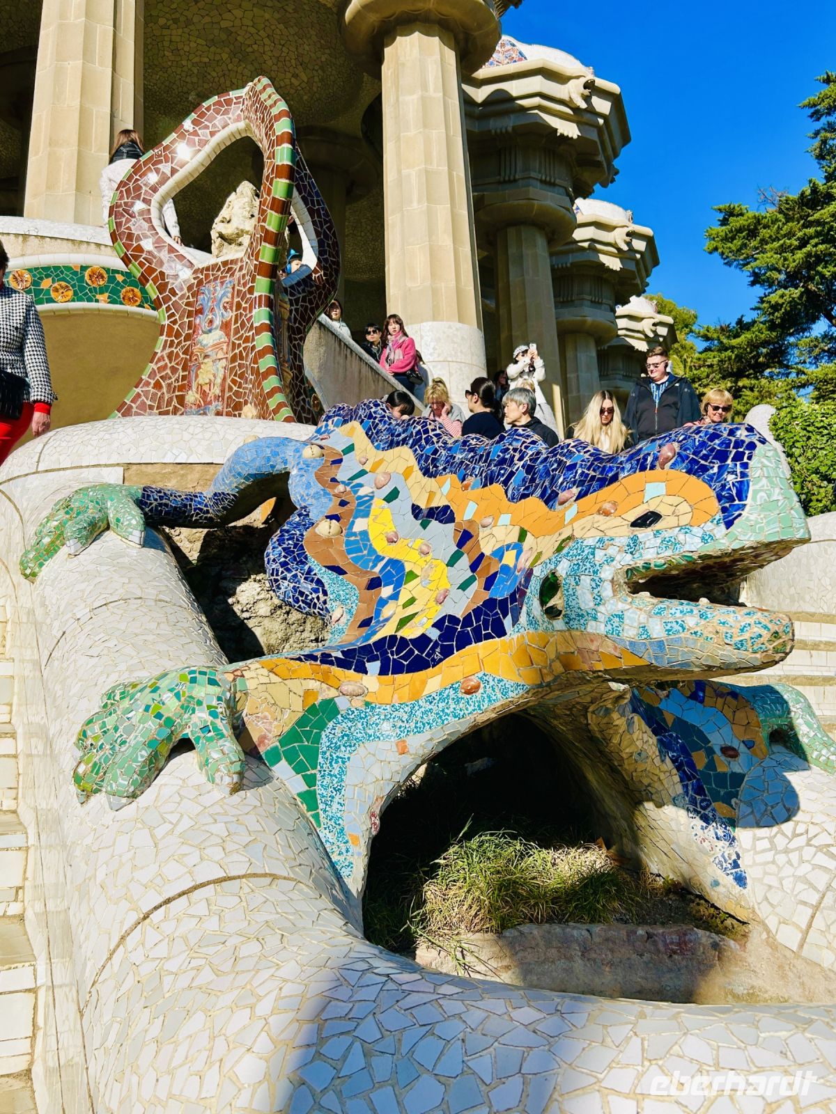 Am späten Vormittag fahren wir zum Park Güell, einer weiteren Vision Gaudís. Wir wussten gar nicht, dass der Park ursprünglich eine Wohnsiedlung werden sollte! Zum Glück wurde er stattdessen zum öffentlichen Garten! Die bunten Mosaikbänke, die schlangenförmig den Versammlungsplatz säumen, laden zum Ausruhen ein, mit Blick über die Stadt. Wir entdecken fantasievolle Skulpturen und die berühmte Echse „El Drac“. Auch die „Markthalle“ verfügt über imposante Details.