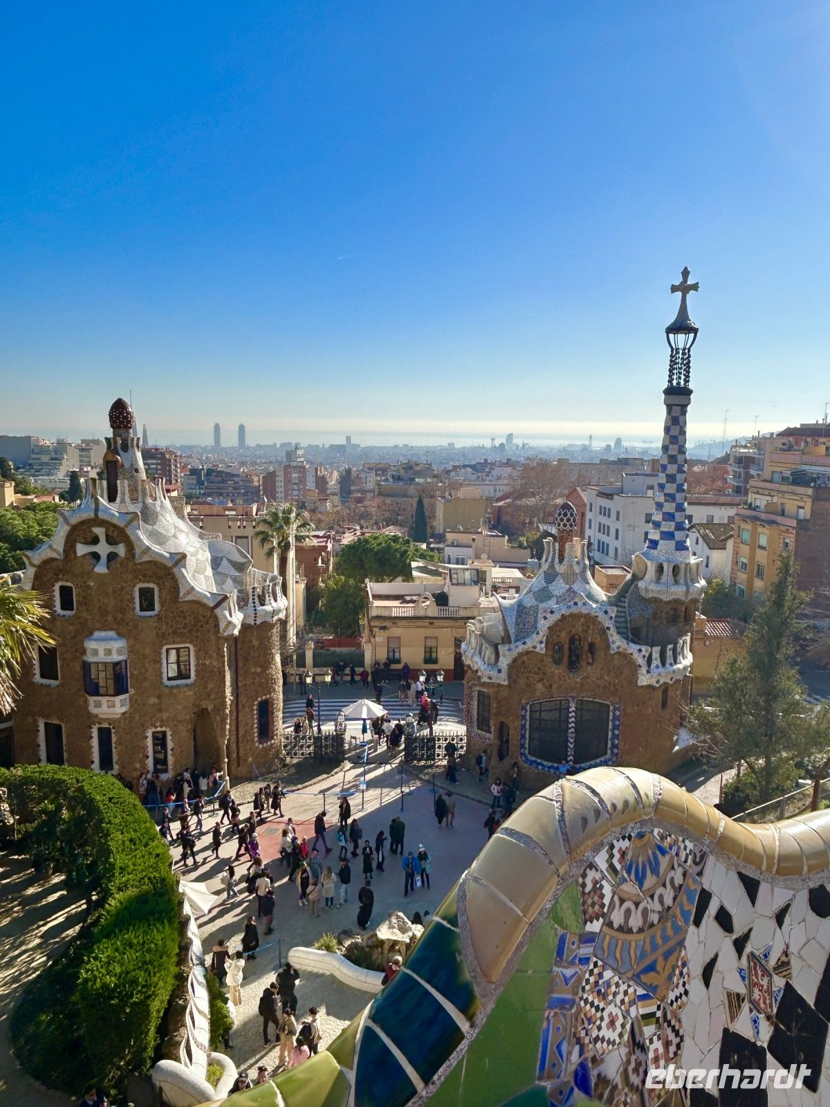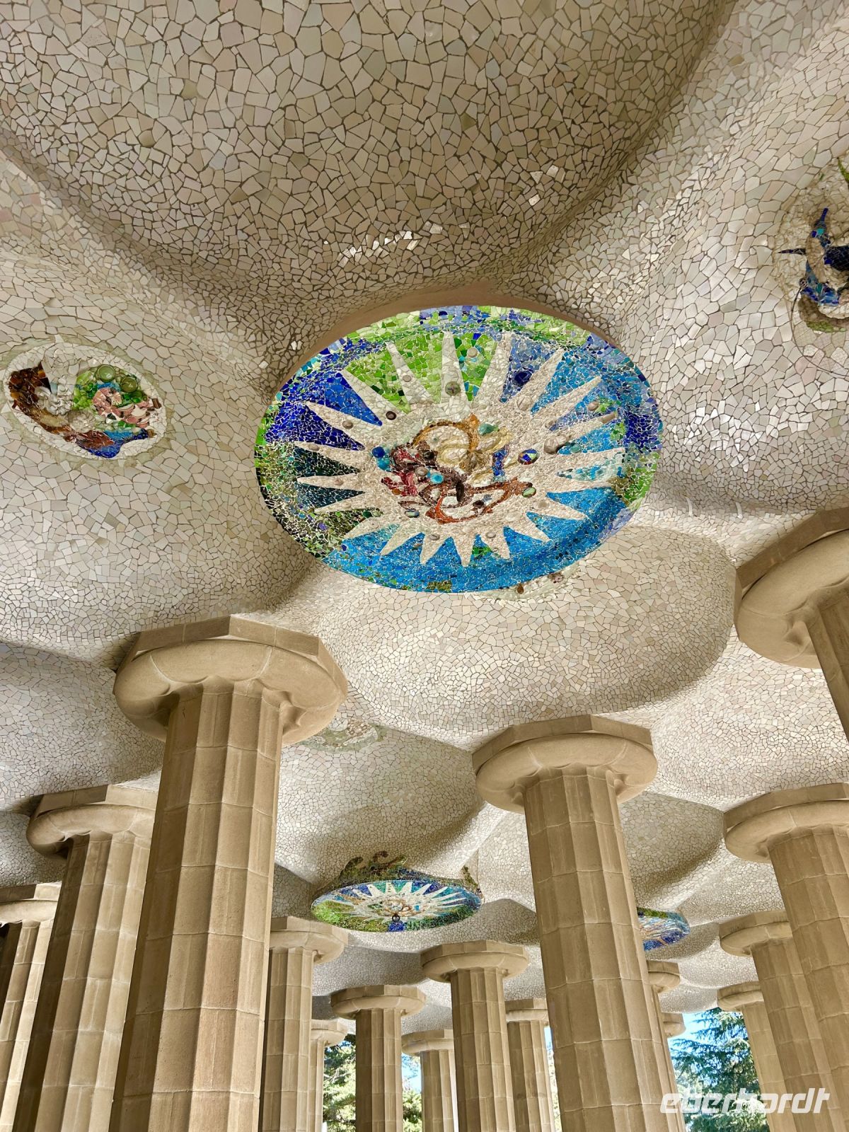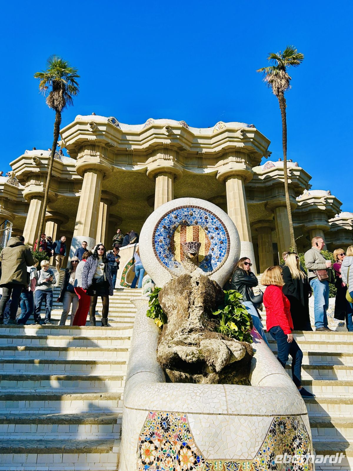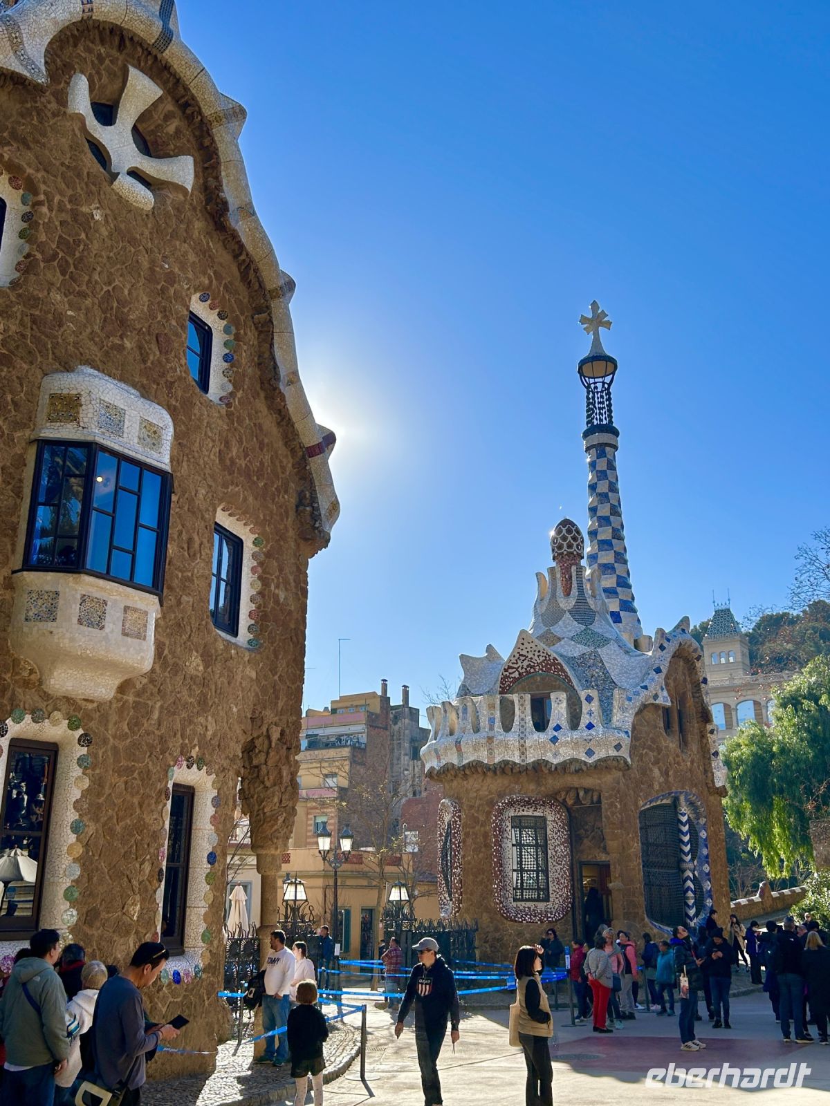 Am späten Vormittag fahren wir zum Park Güell, einer weiteren Vision Gaudís. Wir wussten gar nicht, dass der Park ursprünglich eine Wohnsiedlung werden sollte! Zum Glück wurde er stattdessen zum öffentlichen Garten! Die bunten Mosaikbänke, die schlangenförmig den Versammlungsplatz säumen, laden zum Ausruhen ein, mit Blick über die Stadt. Wir entdecken fantasievolle Skulpturen und die berühmte Echse „El Drac“. Auch die „Markthalle“ verfügt über imposante Details.