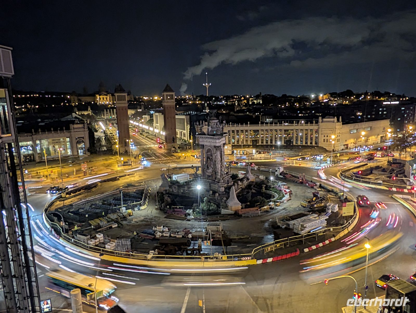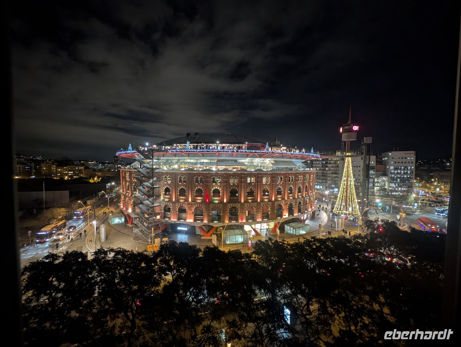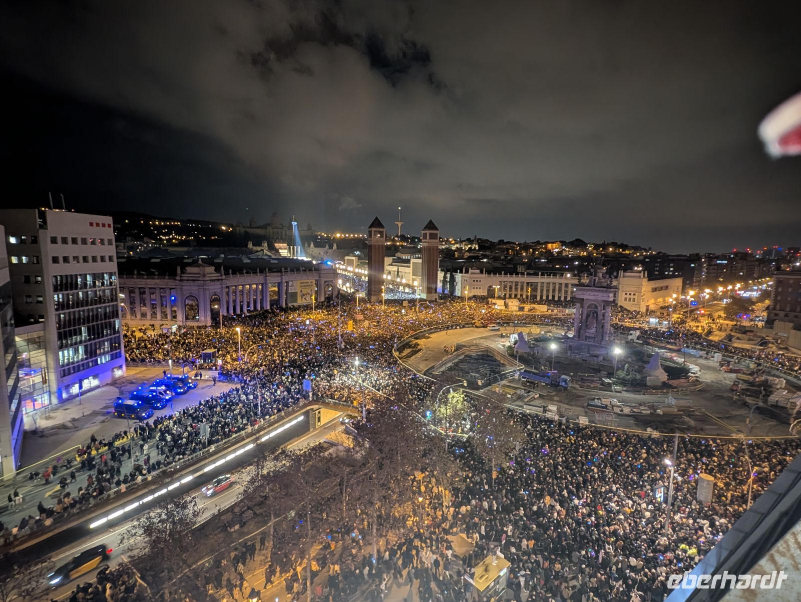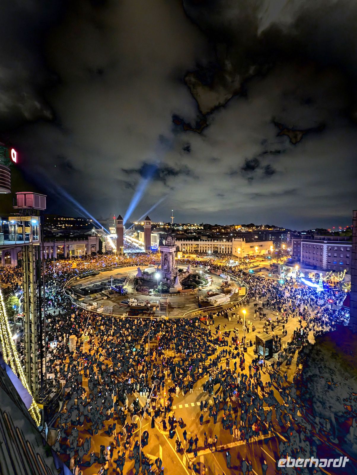 20:30 begann das Silvesteressen im schönen Restaurant "11 Nudos", welches sich auf dem Dach der ehemaligen Stierkampfarena befindet. Das Personal war auch im Vorfeld sehr freundlich und hat alle meine Fragen zur Silvesternacht geduldig und professionell geklärt. Es gab ein leckeres Menü inclusive Aperitif, Wein und nicht zu vergessen den unerlässlichen 12 Glückstrauben für Mitternacht. Zusätzlich gab es eine Party-Tüte, die von den Gästen gut genutzt wurde. Die Sicht von der Stierkampfarena auf das Feuerwerk, welches am Magischen Brunnen von Montjuïc, unterhalb des Nationalmuseums stattfand, war grandios. Menschenmassen standen auf der Plaza de España bis hoch zum Brunnen. Mit einem Teil der Gruppe bin ich kurz vor Mitternacht auf die Dachterrasse unseres Hotel gegangen und wir haben das Spektakel von dort genossen und auf das neue Jahr angestoßen. Es war ein einmaliges Erlebnis!