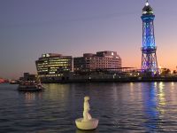 Die Rückfahrt führt uns teilweise an der Küste entlang und durch Badalona hindurch. Dieser Vorort liegt direkt neben Barcelona und nur der kleine Fluß Besos markiert die Grenze dazwischen. Im Stadtviertel Poblenou verabschieden wir uns dann für heute von Bruno und unserer charmanten Busfahrerin Carmen. Heike hat einen „Strandspaziergang“ vorgeschlagen und so lassen wir uns den frischen Meereswind um die Nase wehen und auch für einen Aperitivo in der Abendsonne ist noch Zeit. Die Mole entlang spazieren wir zum Hafen. Unterwegs kommen wir an der großen Monumental-Skulptur. „La Cara de Barcelona“ vorbei. Sie ist 15 Meter hoch und wurde vom US-amerikanischen Pop-Art-Künstler Roy Lichtenstein entworfen. Unweit davon ist die Riesenkrabbe Gambrinus, eine Skulptur von Javier Mariscal, zu sehen.