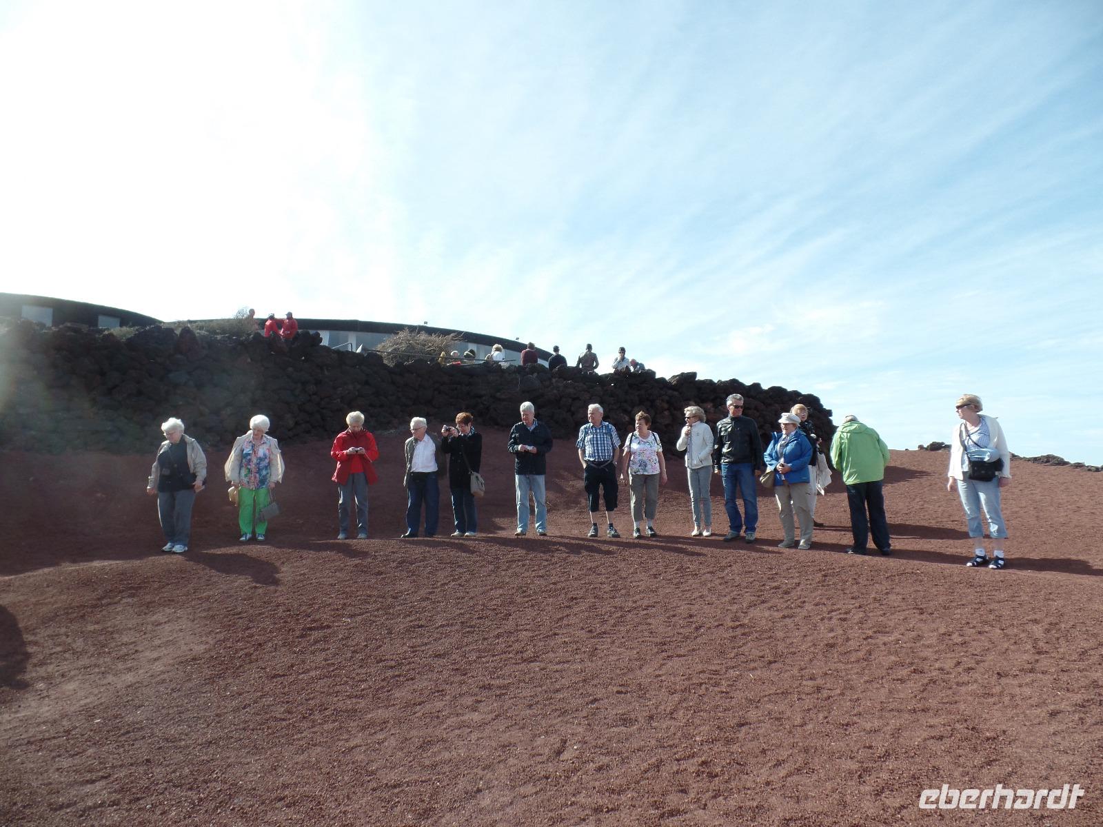 Nach einem reichhaltigen ersten Frühstück trafen wir auf unseren Reiseleiter Uwe. Unsere Gruppe war neugierig auf dieses schwarze Lavameer und den berühmtesten Künstler Lanzarotes. Wir fuhren bei Sonnenschein, aber doch recht kühlem Wind, den Montanas del Fuego entgegen. Der erste Stopp war das Besucherzentrum des Nationalparks. Uns wurde mit beeindruckenden Live-Experimenten die noch existierende unterirdische Hitze des Timfanfaya-Vulkans gezeigt. Wir fühlten heiße Vulkanerde, sahen wie ein Strohballen ganz leicht Feuer fing und anschließend bewunderten, wie die Vulkanhitze eingegossenes Wasser in einer Fontäne emporschießen ließ. Uwe zeigte uns, dass auch das örtliche Restaurant die Hitze des erloschenen Vulkans als natürliche Grillkohle nutzte. Nach ein wenig Freizeit fuhren wir anschließend durch die serpentinartige Straße des Nationalparks. In einer engen geschlungenen Straße konnte unser Busfahrer Antonio all sein Können unter Beweis stellen. Wir staunten nicht schlecht über die imposanten Vulkankrater und Lavablasen an denen wir vorbei fuhren. Kurzer Stopp an einer Kamelherde und weiter ging die Fahrt. Weiter in Richtung Westen, vorbei am Salzgarten Salinas de Janubio zur zerklüfteten Lavaküste Los Hervideros. Diese Küste wird auch der Wasserkocher Lanzarotes genannt. Ein kleiner Spaziergang näher an die brechenden Wellen heran, zeigte uns auch warum. Der nächste Stopp war im kleinen Fischerort El Golfo. Unsere kleine Wanderung führte uns zum Krater des Vulkans Montana de Golfo, welcher bereits teilweilse im Meer versunken war und eine kleine Lagune bildete. Im Anschluss kehrten wir in einem kleinen hübschen Fischrestaurant ein, welches auf seiner Terrasse eine wundervolle Aussicht aufs Meer zu leckeren frischen Fisch bot. Zum Abschluss des ersten Ausfluges besichtigten wir das Haus von dem Künster Cesar Manrique. Es war sein erstes Wohnhaus auf Lanzarote, was nach seinen Entwürfen gebaut wurde und welches er der Öffentlichkeit zugänglich machte. Wir schlenderten durch die ehemaligen Wohnräume und staunten über den organischen Grundriss und die in leeren Lavablasen hineingebauten Zimmer. Kein Raum glich dem Anderen. Ein kleiner Pool mit türkisfarbenem Wasser bildete das Herzstück des Kleinods. Wir genossen die warmen Sonnenstrahlen, der Ein oder Andere noch einen Kaffee dazu und fuhren ins Hotel zurück. Beim Abendessen ließen wir den Tag gemeinsam ausklingen.