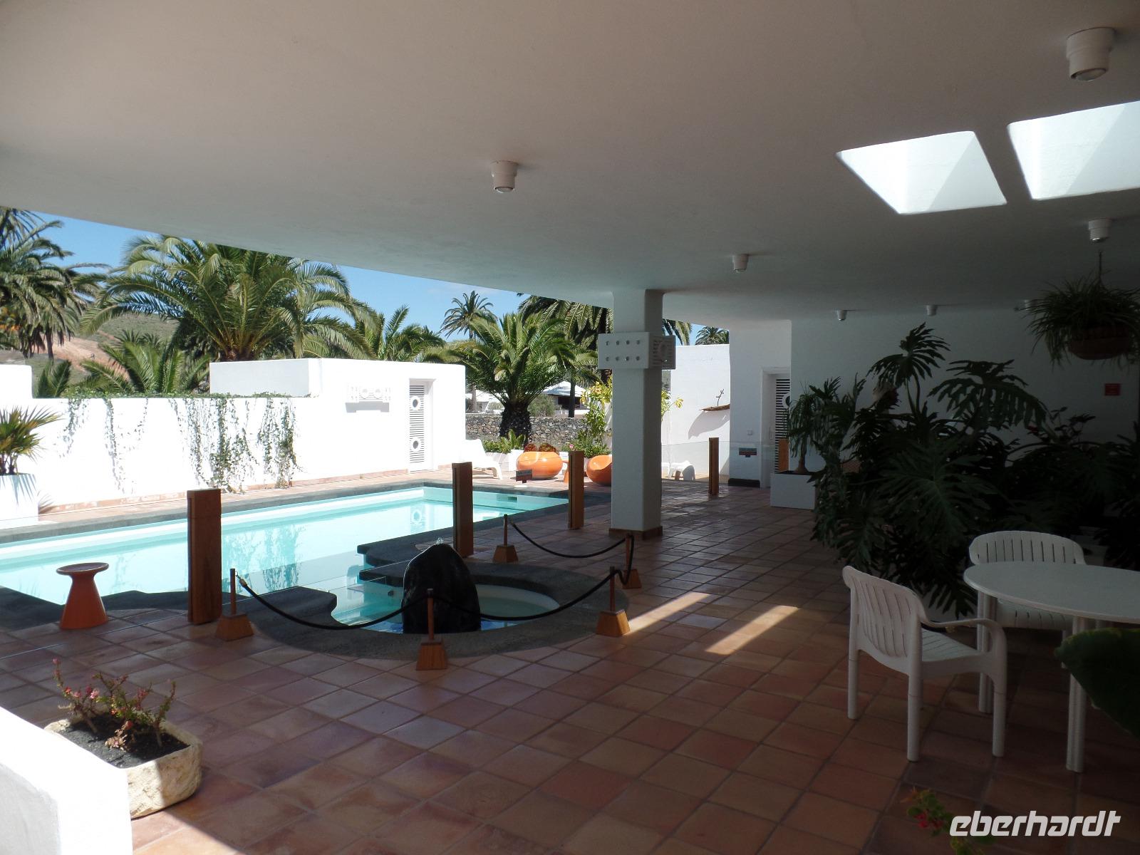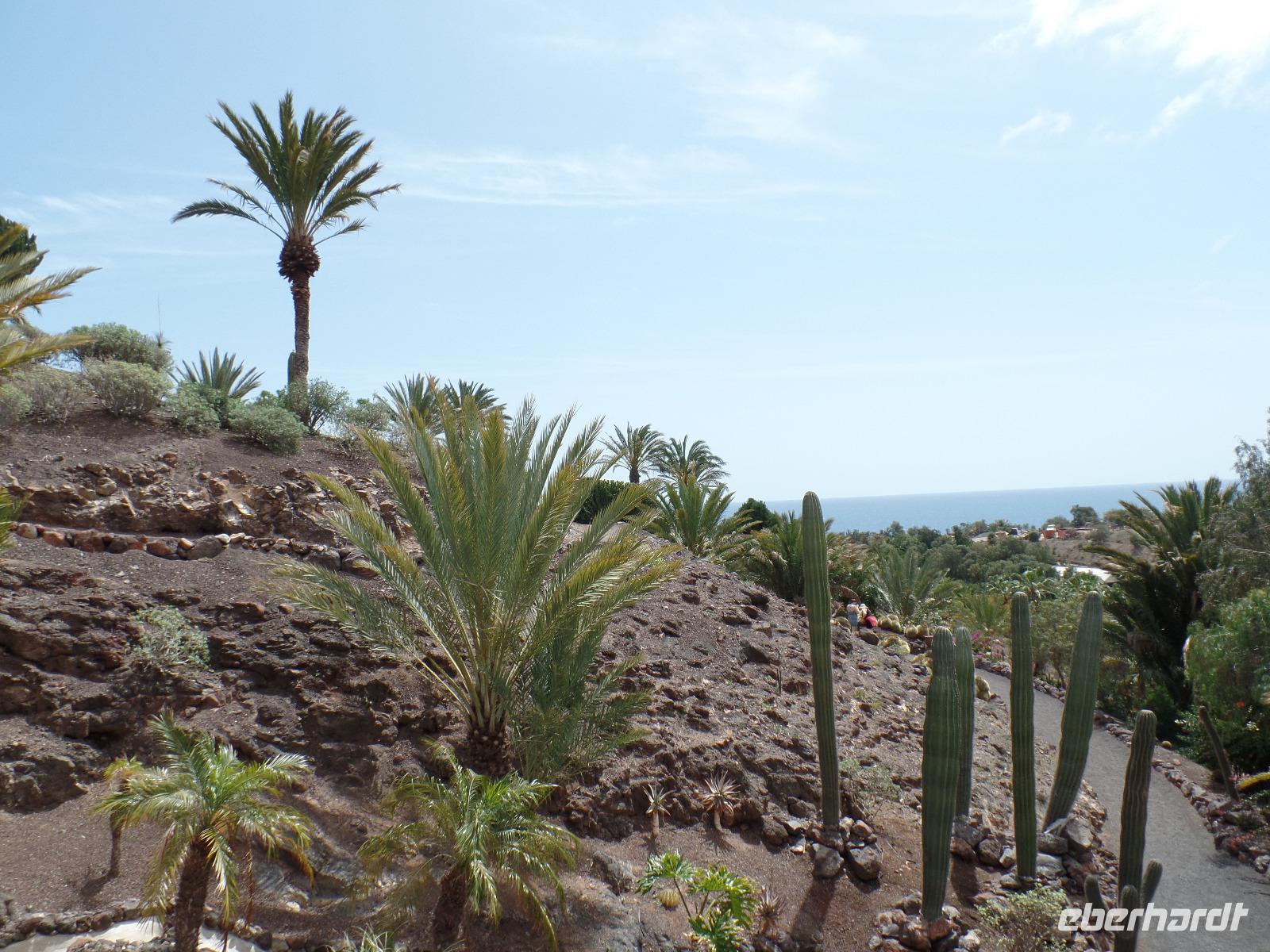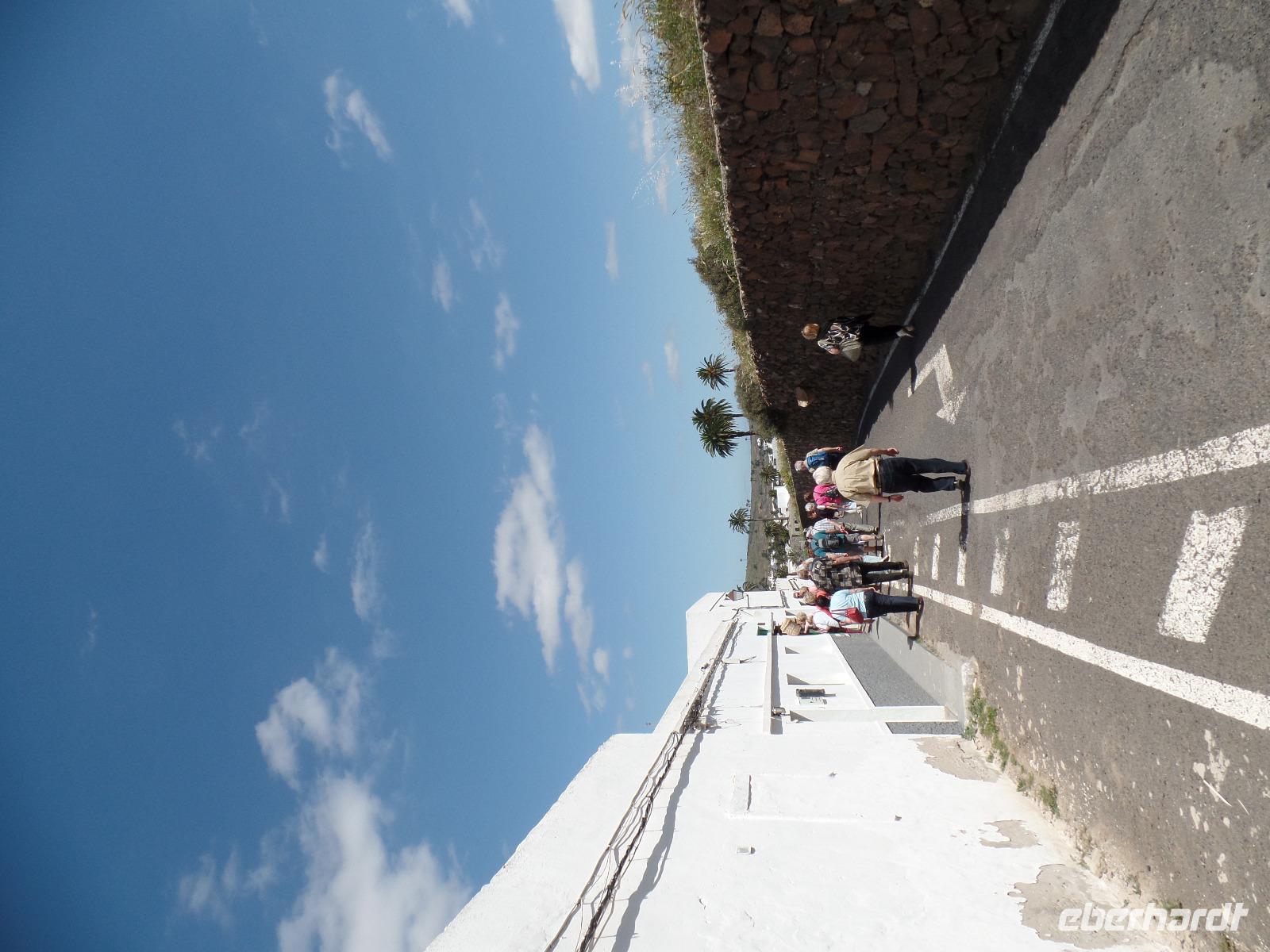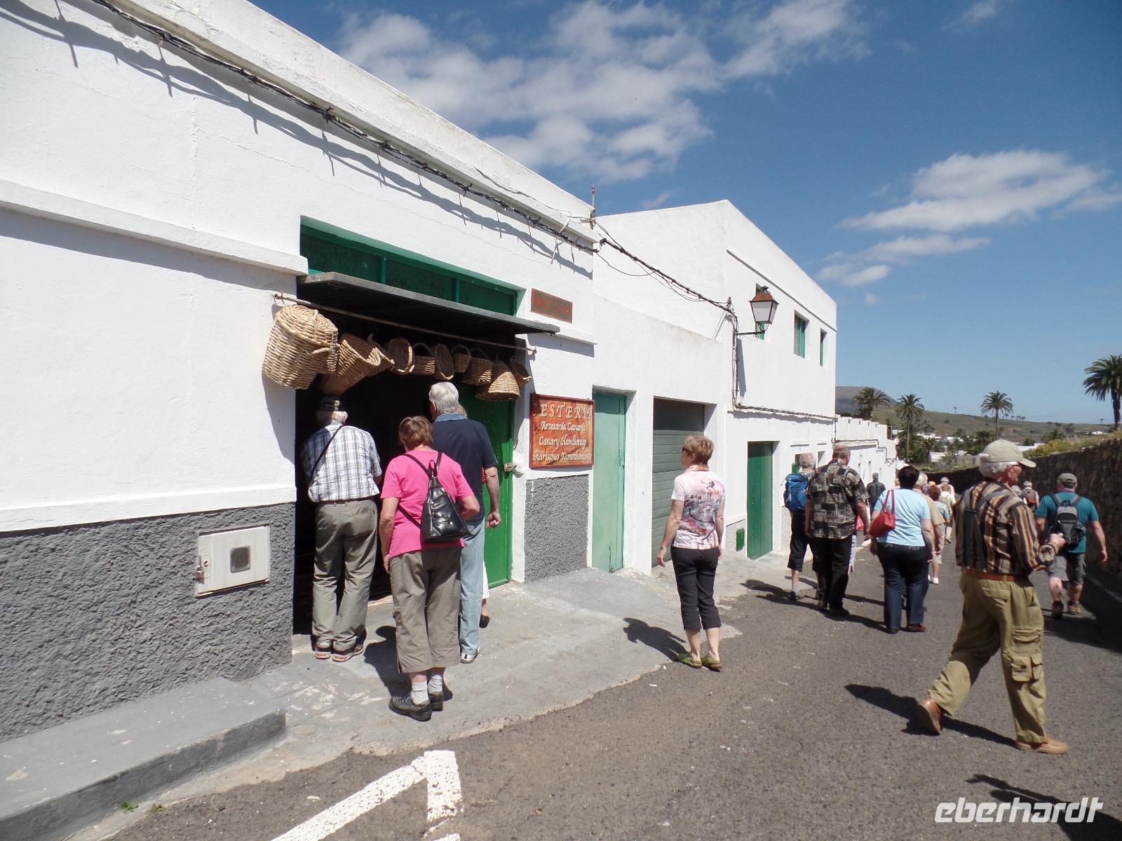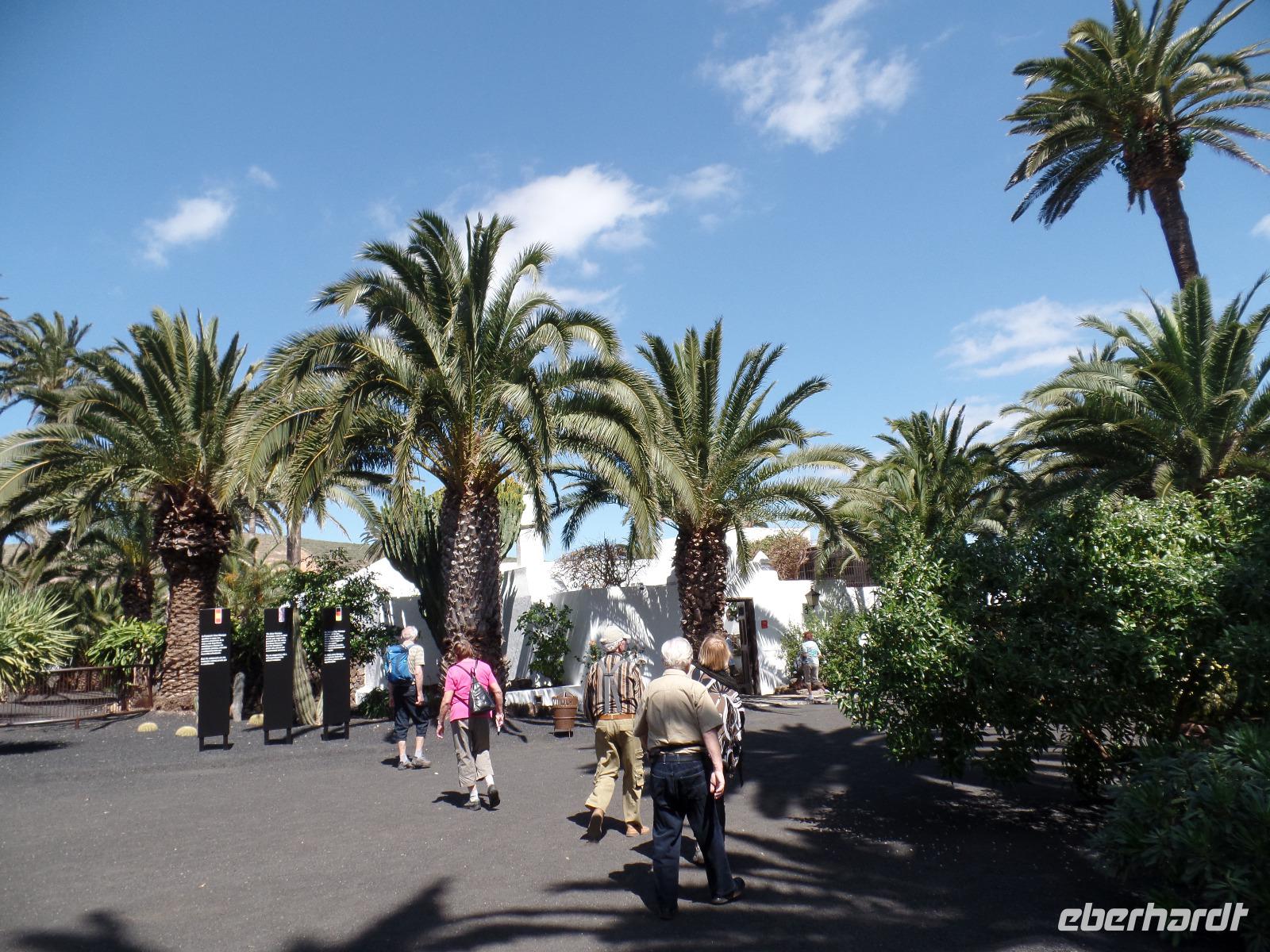 Blauer Himmel und Sonnenschein begrüßten uns am Morgen. Wir starteten den Tag mit einem Geburtstagsständchen und fuhren gut gelaunt in die Inselmitte von Lanzarote. Vorher hielten wir aber noch in La Caleta de Famara am schönen Famara-Strand um unsere Zehen in den kühlen Atlantik zu stecken und ein paar Mucheln zu sammeln. Am Horizont sahen wir das Bergmassiv, einige Surfer probierten bereits ihr Glück denn schließlich war der Strand bei den sporthungrigen Urlaubern sehr beliebt. Unterwegs hielten wir am Mirador De Los Helechos, einem Aussichtspunkt der uns einen imposanten Blick bis zum Meer und in das Tal der 1.000 Palmen bot. Im angrenzenden Restaurant probierten wir den ortsüblichen Guarapo, einen Palmenlikör und noch einige andere spanische Leckereien. Nach dieser kleinen Stärkung hieß uns das Zuhause von Cesar Manrique willkommen. Es war das Wohnhaus des Künstlers, in dem er lebte als er bei einem tragischen Autounfall ums Leben kam. Uns kam es vor, als ob er gerade noch da gewesen war und mit Freunden wie Pablo Picasso Kaffee am hauseigenen Pool getrunken hätte. Nicht nur sein Wohnhaus mit Wohn-, Schlaf- und Badezimmer war den Besuchern zugänglich. Auch das Atelier konnten wir uns mit den noch unfertigen Werken des Künstlers anschauen. Unser Ausflug führte uns weiter in das kleine Städtchen Tequise. Wir hatten ein wenig Freizeit, schlenderten durch die Gassen und stöberten in den Läden nach kleinen Mitbringseln für die Lieben zu Hause. Danach stand ein weitere Höhepunkt des Künstlers Manrique auf dem Programm. Wir besuchten das Bauernmuseum Monumento de la Fecundidad und erfuhren so mehr über die Handwerkstradition und die Lebensart der Bauern auf der Insel. Der Rückweg ins Hotel führte uns durch das berühmte Weinanbaugebiet von Lanzarote. Spontan statteten wir der Bodega La Geria einen Besuch ab, kosteten den schmackhaften Weiswein und schmunzelten über die Namensgleichheit zu unserem Hotel. Unsere Gruppe verabschiedete sich von unserem Reiseleiter Uwe und ein ereignisreicher Tag ging bei unserem Abendessen im Hotel zu Ende.
