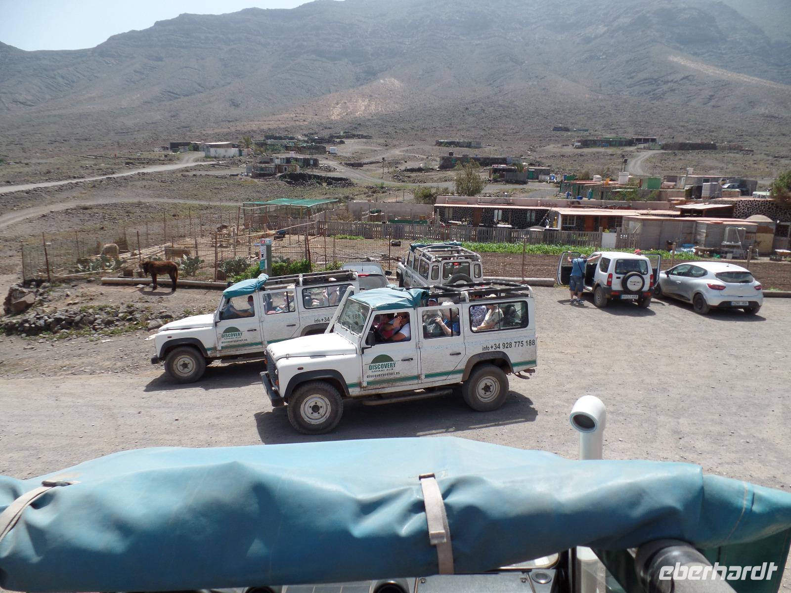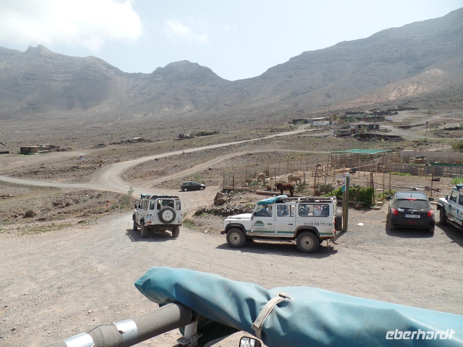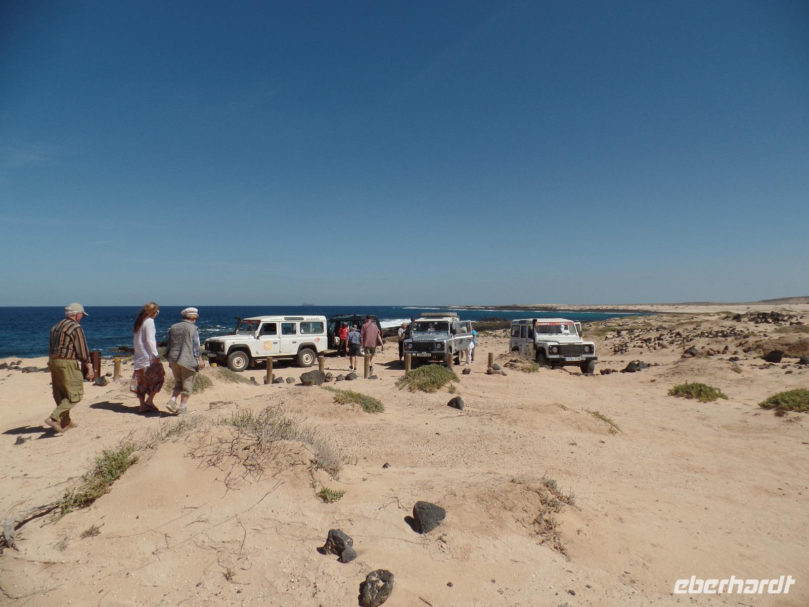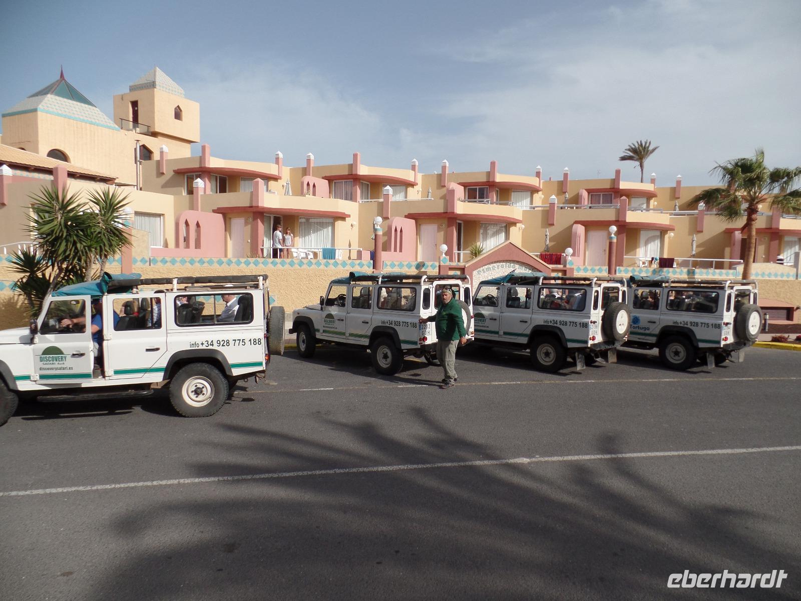 Der heutige Tagesausflug versprach spannend zu werden. Unser Reiseleiter Adolfo stand mit einer Gefolgschaft von Jeepfahrern vor dem Hotel und erwartete uns mit einem breiten Lächeln und fünf fahrbereiten Jeeps. Der erste Stopp war im Hafen von Morro Jable. Fix noch Wasser gekauft und die schwimmenden Rochen im Hafenbecken bewundert, besuchten wir eine Hilfsstation für Meeresschildkröten. Nun ging es aber los. Die Jeeps düsten hintereinander durch die wüstenhafte Landschaft des Südhalbinsel Jandia. Wir hielten mehrmals an um von der eindrucksvollen Kulisse, die sich uns bot, Fotos zu machen. An der rauhen Westküste angekommen, sahen wir die berühmt berüchtigte Villa Winter - aber auch Adolfo konnte kein Licht in das Mysterium des Anwesens bringen. Am Strand machten wir dann Bekanntschaft mit der 21. Welle die uns fast due Schuhe auszog :-) Bei einer anschließenden Getränkepause in Cofete konnten wir noch einmal den Blick auf die tosenden Wellen am Strand und die Villa Winter genießen, bevor uns die abenteuerliche Jeepsafari wieder zur Ostküste brachte. Unsere Mittagspause verbrachten wir in Puerto de la Cruz in einer kleinen Fischtaverne direkt am Meer. Wir probierten typisch spanische Paella bei Wein und Sonnenschein. Wenn wir schon so weit südlich waren wollten wir bis zu äußeren Spitze. Die rasante Fahrt ging bis zum Leuchturm El Farito. Dort genossen wir einen großartigen Panoramablick auf die Buchten, die millionenalten Lavaberge und das Meer. In dieses wollten wir auch noch baden gehen. Nach einer kurzen Fahrt gelangten wir zu einen kleinen Strand und es dauerte nicht lang, da waren die ersten Gäste bereits im Wasser. Diese Erfrischung in den Wellen war einfach klasse. Staubig von der langen Fahrt gelangten wir am späten Nachmittag in Hotel und liesen das Erlebte des Tages beim Abendessen noch einmal Revue passieren.