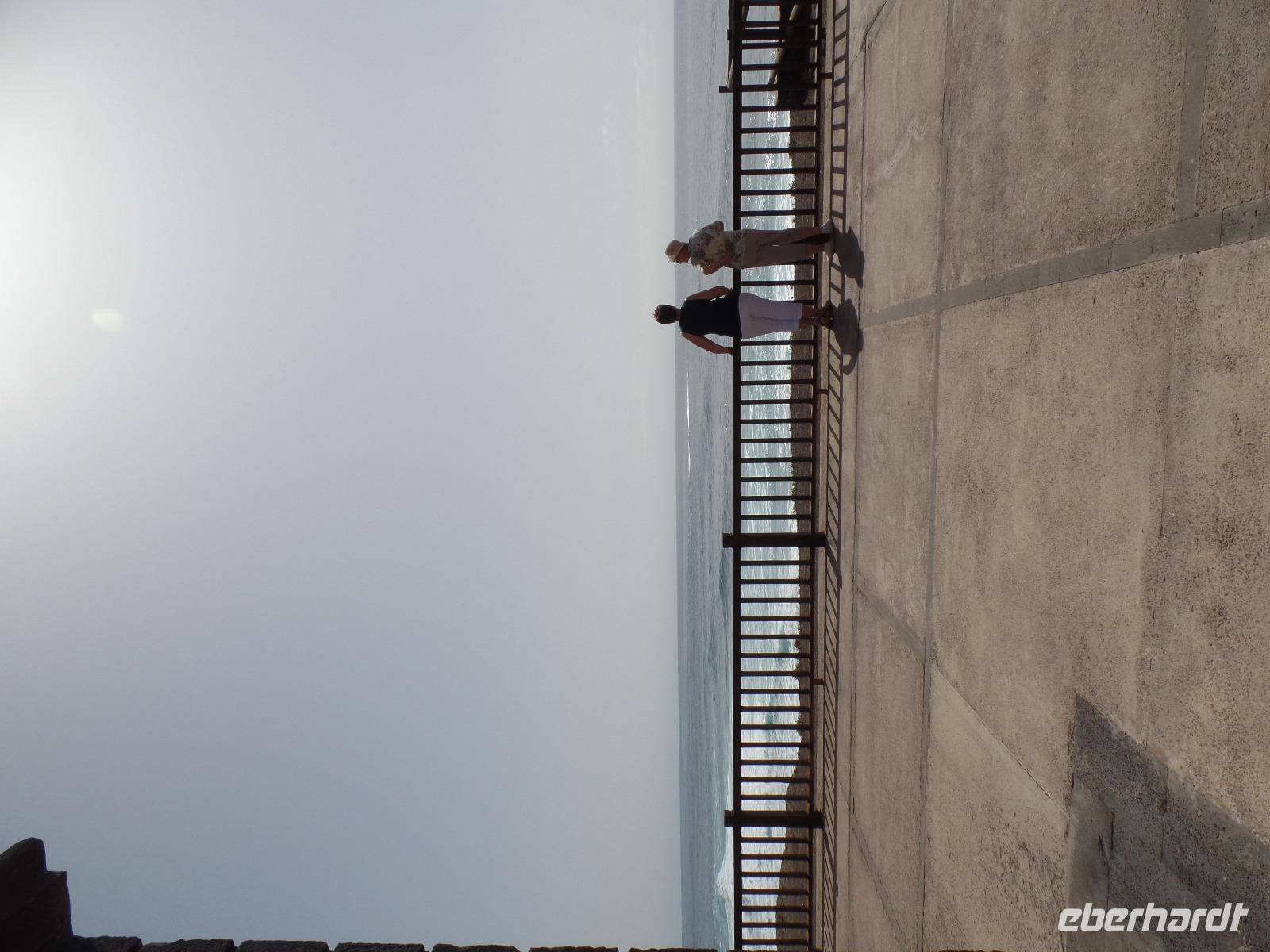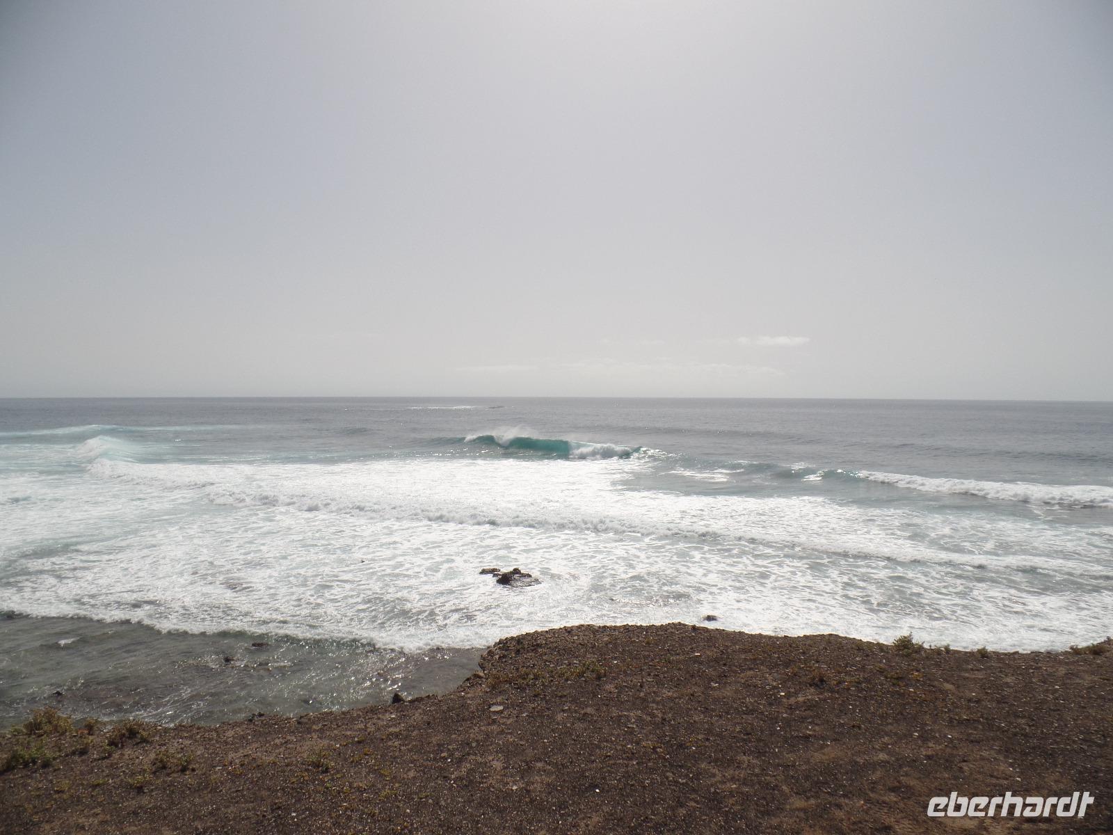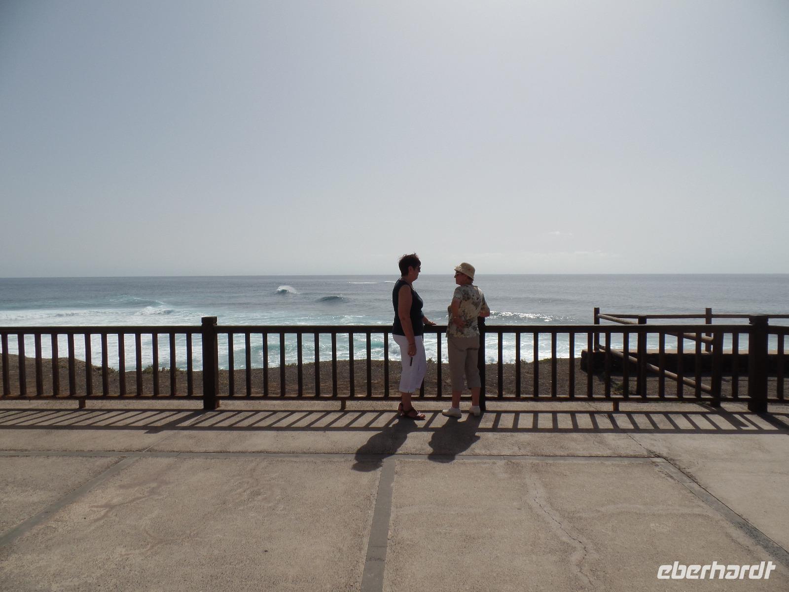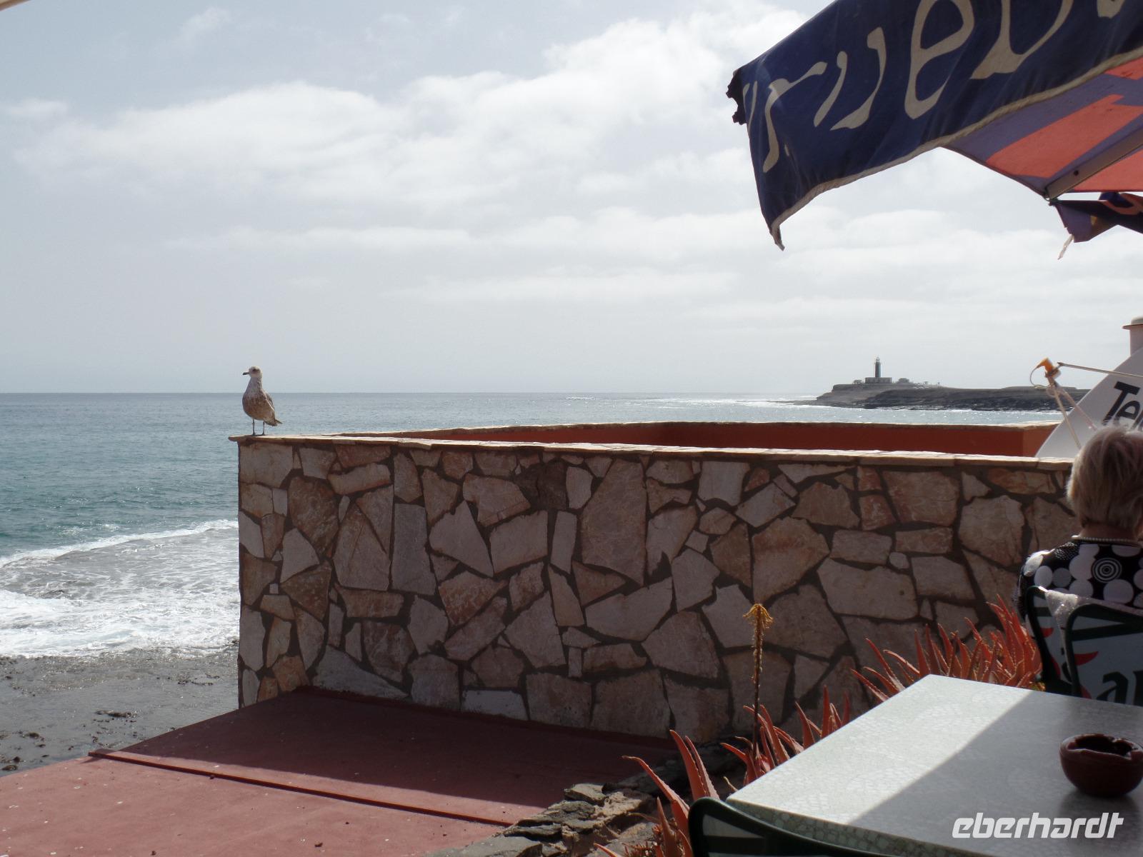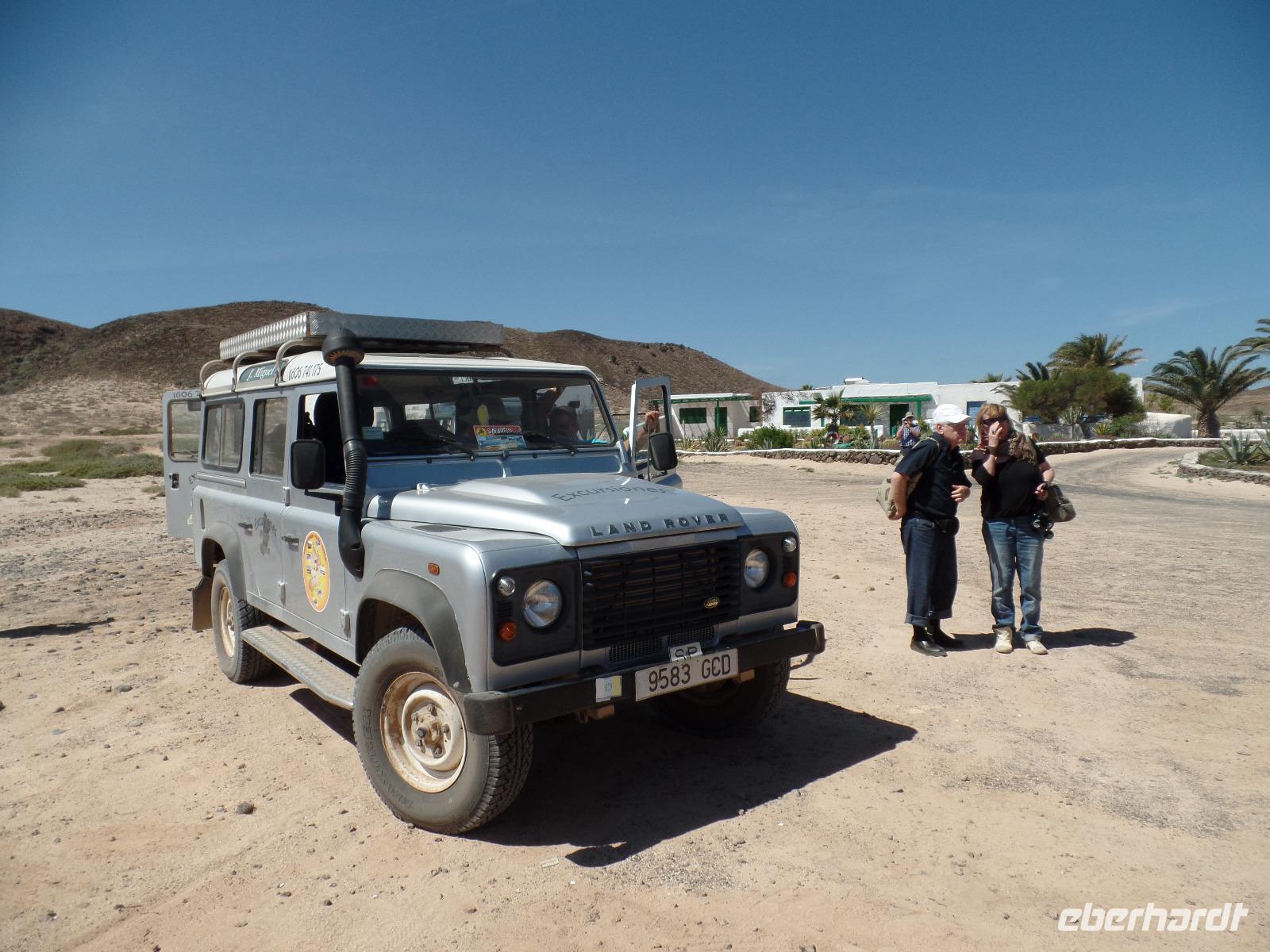 Der heutige Tagesausflug versprach spannend zu werden. Unser Reiseleiter Adolfo stand mit einer Gefolgschaft von Jeepfahrern vor dem Hotel und erwartete uns mit einem breiten Lächeln und fünf fahrbereiten Jeeps. Der erste Stopp war im Hafen von Morro Jable. Fix noch Wasser gekauft und die schwimmenden Rochen im Hafenbecken bewundert, besuchten wir eine Hilfsstation für Meeresschildkröten. Nun ging es aber los. Die Jeeps düsten hintereinander durch die wüstenhafte Landschaft des Südhalbinsel Jandia. Wir hielten mehrmals an um von der eindrucksvollen Kulisse, die sich uns bot, Fotos zu machen. An der rauhen Westküste angekommen, sahen wir die berühmt berüchtigte Villa Winter - aber auch Adolfo konnte kein Licht in das Mysterium des Anwesens bringen. Am Strand machten wir dann Bekanntschaft mit der 21. Welle die uns fast due Schuhe auszog :-) Bei einer anschließenden Getränkepause in Cofete konnten wir noch einmal den Blick auf die tosenden Wellen am Strand und die Villa Winter genießen, bevor uns die abenteuerliche Jeepsafari wieder zur Ostküste brachte. Unsere Mittagspause verbrachten wir in Puerto de la Cruz in einer kleinen Fischtaverne direkt am Meer. Wir probierten typisch spanische Paella bei Wein und Sonnenschein. Wenn wir schon so weit südlich waren wollten wir bis zu äußeren Spitze. Die rasante Fahrt ging bis zum Leuchturm El Farito. Dort genossen wir einen großartigen Panoramablick auf die Buchten, die millionenalten Lavaberge und das Meer. In dieses wollten wir auch noch baden gehen. Nach einer kurzen Fahrt gelangten wir zu einen kleinen Strand und es dauerte nicht lang, da waren die ersten Gäste bereits im Wasser. Diese Erfrischung in den Wellen war einfach klasse. Staubig von der langen Fahrt gelangten wir am späten Nachmittag in Hotel und liesen das Erlebte des Tages beim Abendessen noch einmal Revue passieren.