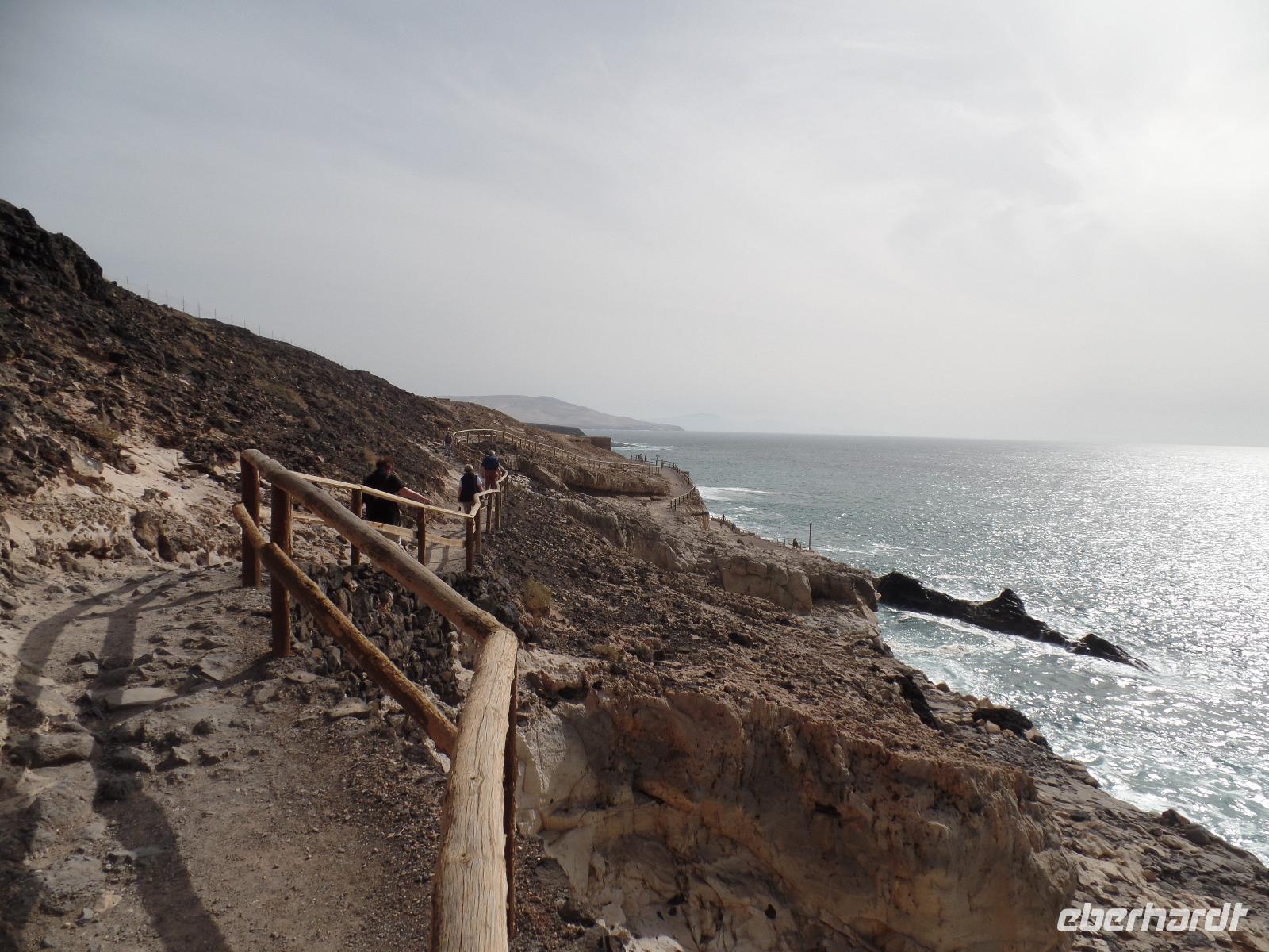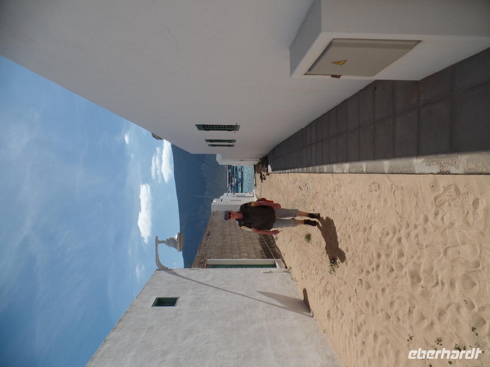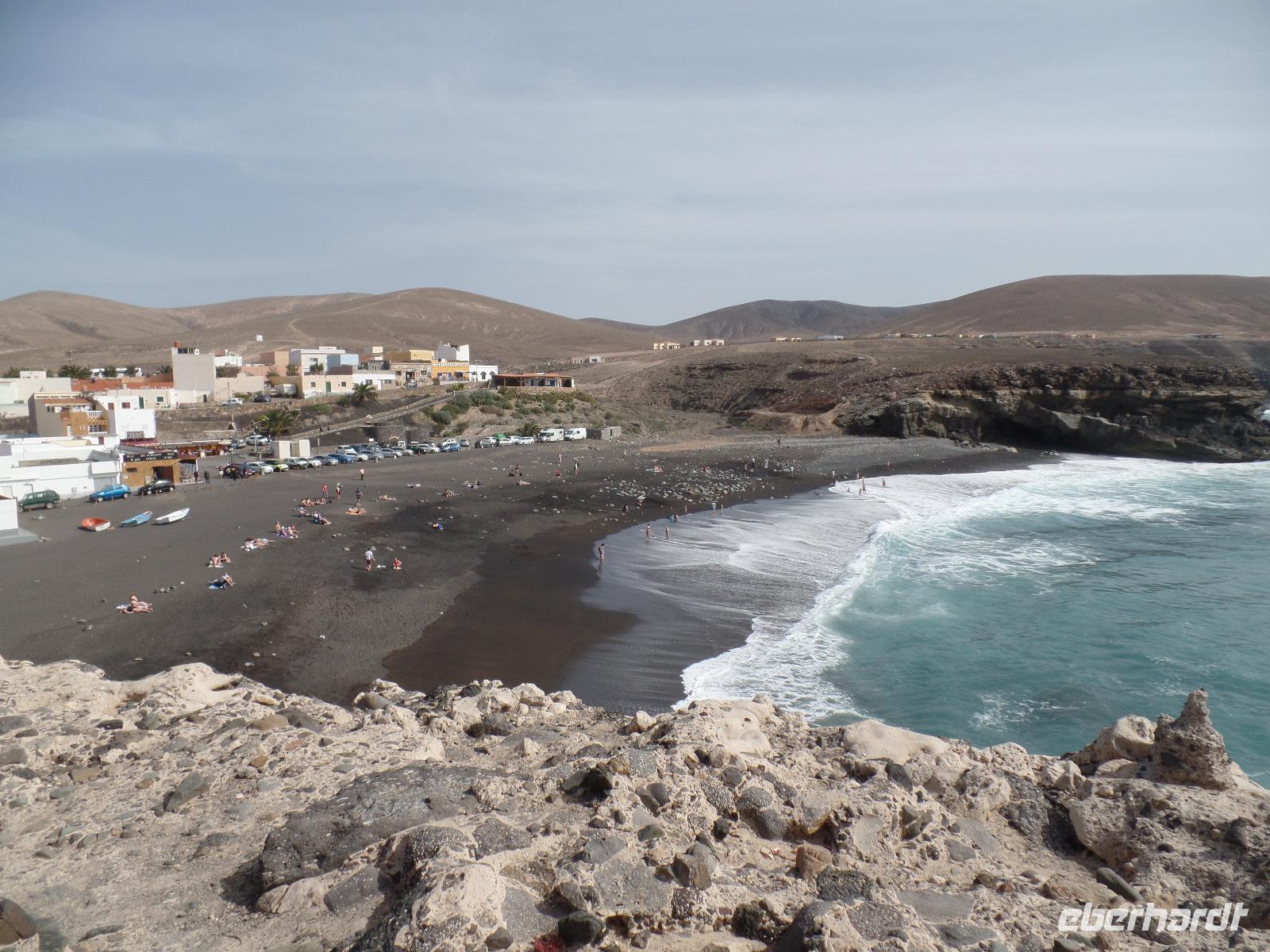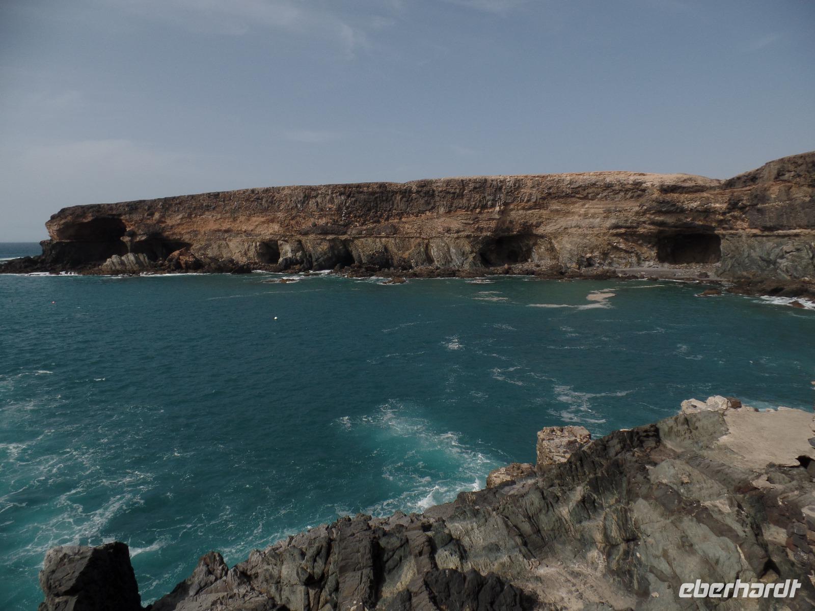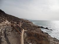Der heutige Tagesausflug versprach spannend zu werden. Unser Reiseleiter Adolfo stand mit einer Gefolgschaft von Jeepfahrern vor dem Hotel und erwartete uns mit einem breiten Lächeln und fünf fahrbereiten Jeeps. Der erste Stopp war im Hafen von Morro Jable. Fix noch Wasser gekauft und die schwimmenden Rochen im Hafenbecken bewundert, besuchten wir eine Hilfsstation für Meeresschildkröten. Nun ging es aber los. Die Jeeps düsten hintereinander durch die wüstenhafte Landschaft des Südhalbinsel Jandia. Wir hielten mehrmals an um von der eindrucksvollen Kulisse, die sich uns bot, Fotos zu machen. An der rauhen Westküste angekommen, sahen wir die berühmt berüchtigte Villa Winter - aber auch Adolfo konnte kein Licht in das Mysterium des Anwesens bringen. Am Strand machten wir dann Bekanntschaft mit der 21. Welle die uns fast due Schuhe auszog :-) Bei einer anschließenden Getränkepause in Cofete konnten wir noch einmal den Blick auf die tosenden Wellen am Strand und die Villa Winter genießen, bevor uns die abenteuerliche Jeepsafari wieder zur Ostküste brachte. Unsere Mittagspause verbrachten wir in Puerto de la Cruz in einer kleinen Fischtaverne direkt am Meer. Wir probierten typisch spanische Paella bei Wein und Sonnenschein. Wenn wir schon so weit südlich waren wollten wir bis zu äußeren Spitze. Die rasante Fahrt ging bis zum Leuchturm El Farito. Dort genossen wir einen großartigen Panoramablick auf die Buchten, die millionenalten Lavaberge und das Meer. In dieses wollten wir auch noch baden gehen. Nach einer kurzen Fahrt gelangten wir zu einen kleinen Strand und es dauerte nicht lang, da waren die ersten Gäste bereits im Wasser. Diese Erfrischung in den Wellen war einfach klasse. Staubig von der langen Fahrt gelangten wir am späten Nachmittag in Hotel und liesen das Erlebte des Tages beim Abendessen noch einmal Revue passieren.