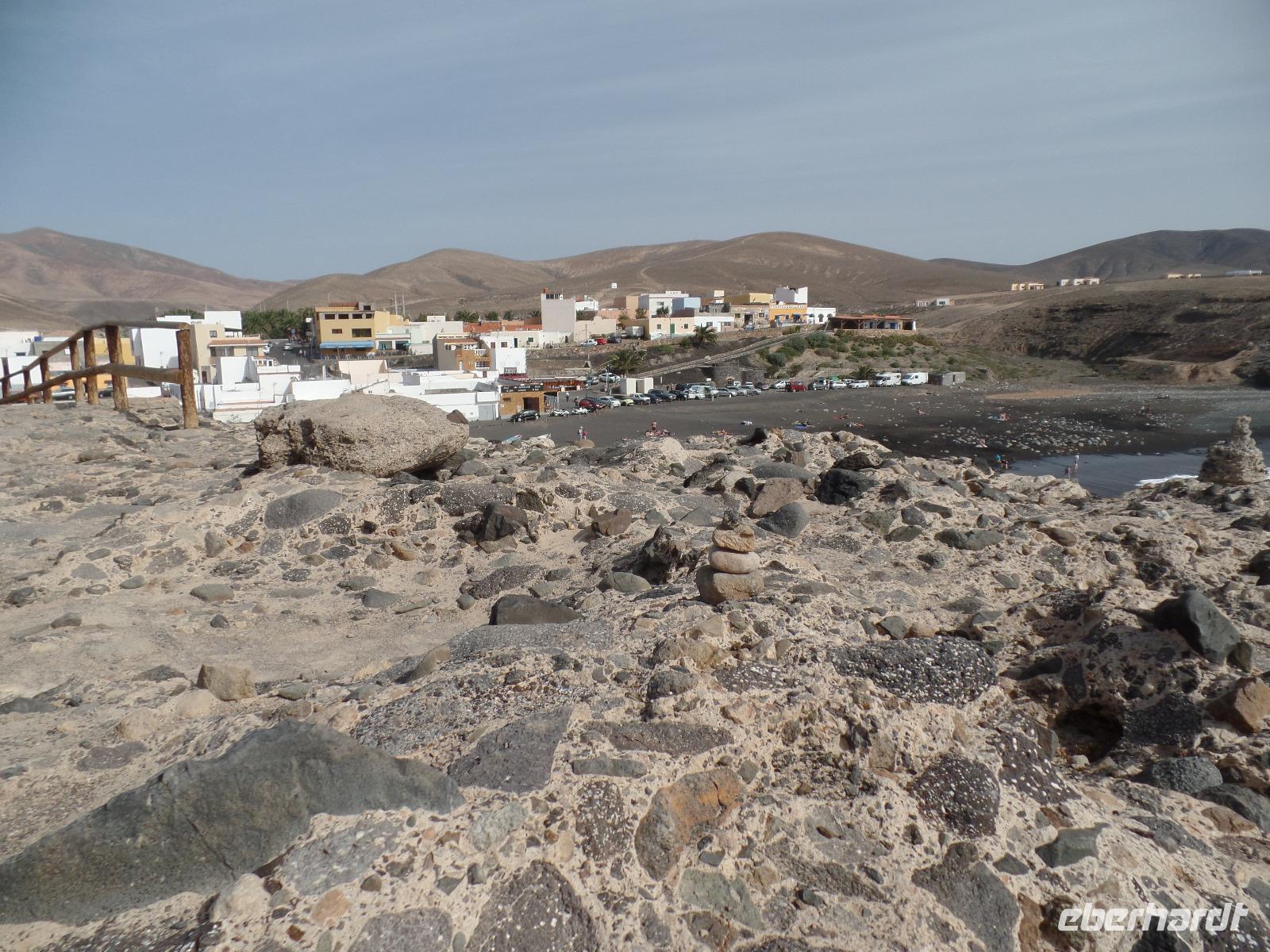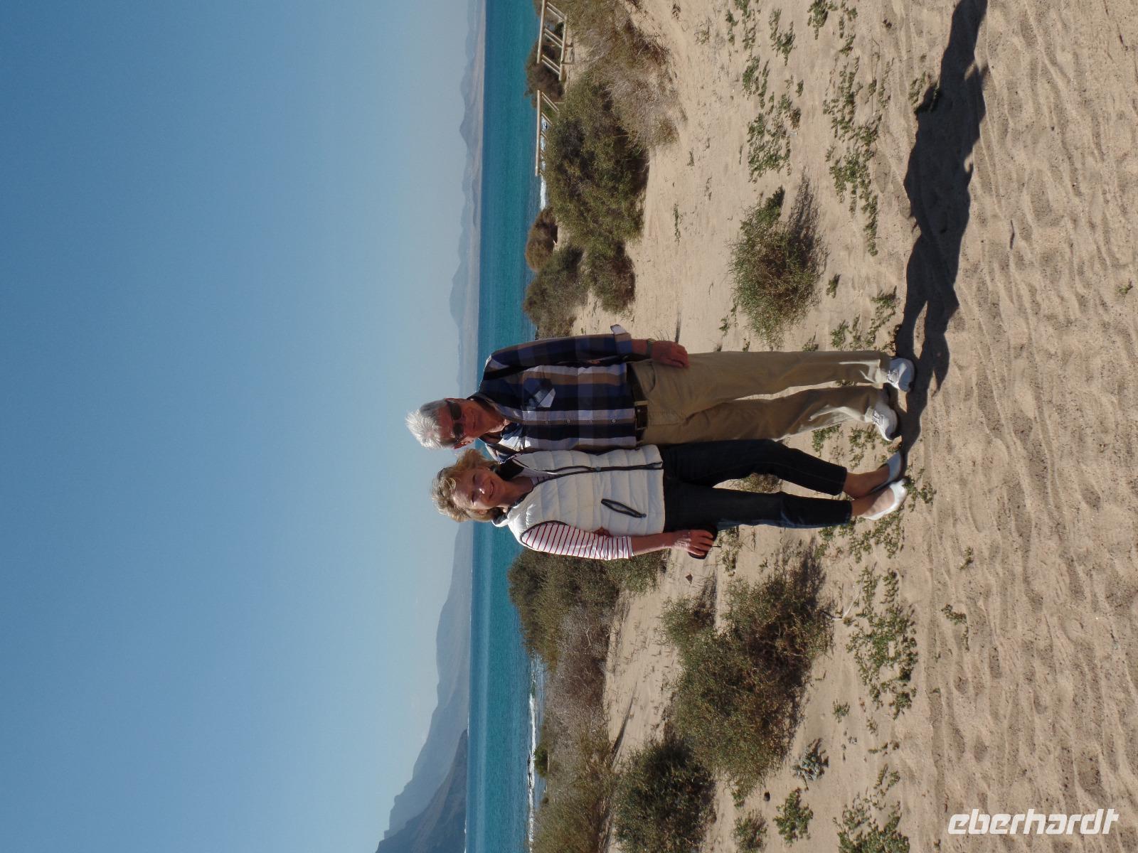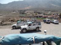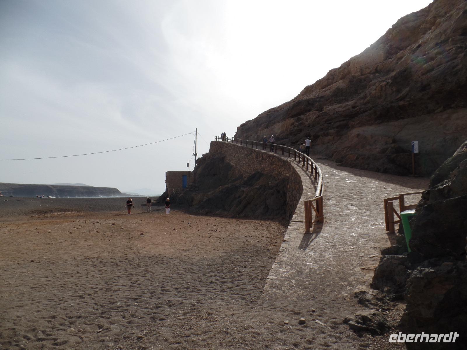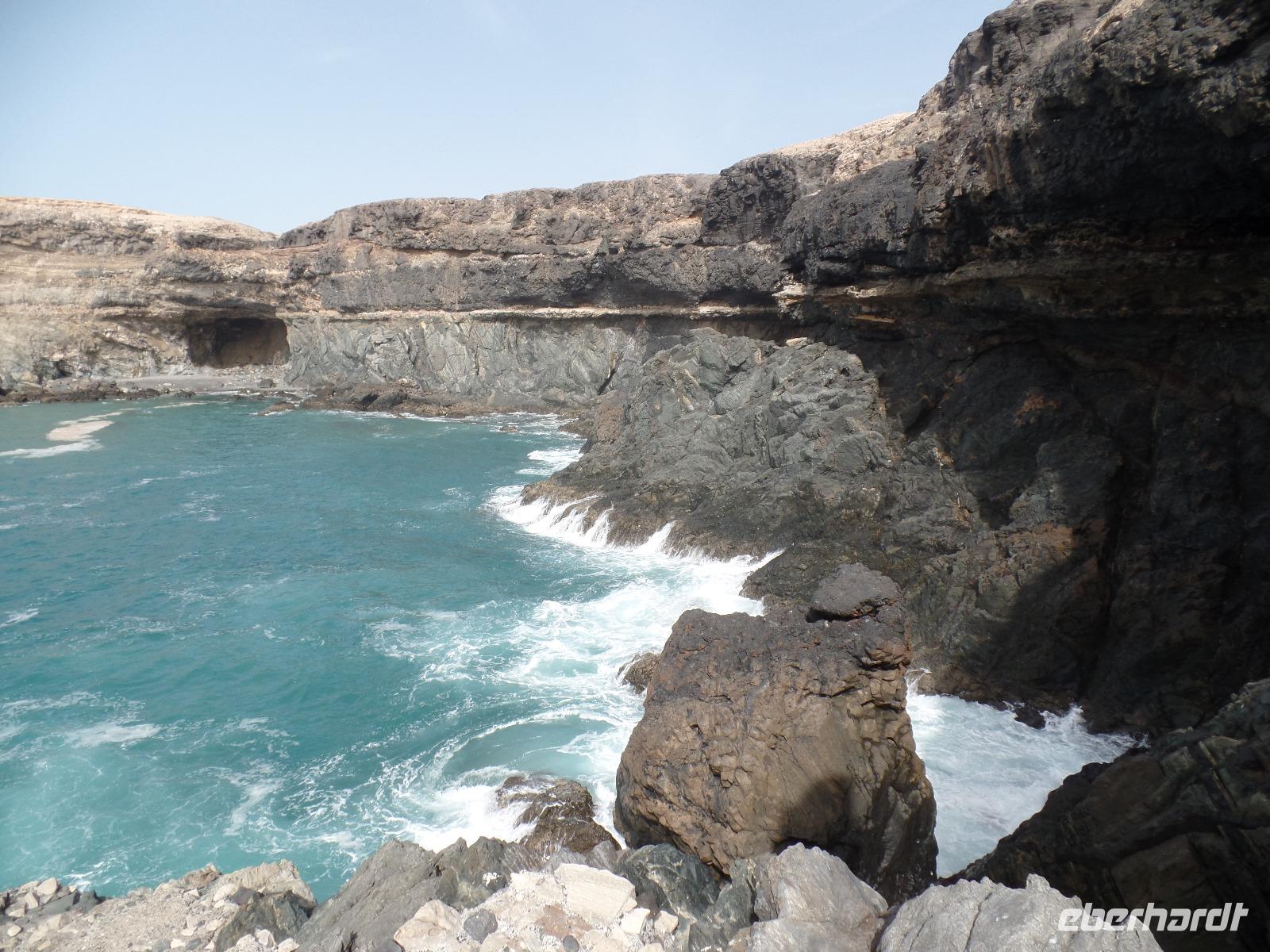 Der heutige Tagesausflug versprach spannend zu werden. Unser Reiseleiter Adolfo stand mit einer Gefolgschaft von Jeepfahrern vor dem Hotel und erwartete uns mit einem breiten Lächeln und fünf fahrbereiten Jeeps. Der erste Stopp war im Hafen von Morro Jable. Fix noch Wasser gekauft und die schwimmenden Rochen im Hafenbecken bewundert, besuchten wir eine Hilfsstation für Meeresschildkröten. Nun ging es aber los. Die Jeeps düsten hintereinander durch die wüstenhafte Landschaft des Südhalbinsel Jandia. Wir hielten mehrmals an um von der eindrucksvollen Kulisse, die sich uns bot, Fotos zu machen. An der rauhen Westküste angekommen, sahen wir die berühmt berüchtigte Villa Winter - aber auch Adolfo konnte kein Licht in das Mysterium des Anwesens bringen. Am Strand machten wir dann Bekanntschaft mit der 21. Welle die uns fast due Schuhe auszog :-) Bei einer anschließenden Getränkepause in Cofete konnten wir noch einmal den Blick auf die tosenden Wellen am Strand und die Villa Winter genießen, bevor uns die abenteuerliche Jeepsafari wieder zur Ostküste brachte. Unsere Mittagspause verbrachten wir in Puerto de la Cruz in einer kleinen Fischtaverne direkt am Meer. Wir probierten typisch spanische Paella bei Wein und Sonnenschein. Wenn wir schon so weit südlich waren wollten wir bis zu äußeren Spitze. Die rasante Fahrt ging bis zum Leuchturm El Farito. Dort genossen wir einen großartigen Panoramablick auf die Buchten, die millionenalten Lavaberge und das Meer. In dieses wollten wir auch noch baden gehen. Nach einer kurzen Fahrt gelangten wir zu einen kleinen Strand und es dauerte nicht lang, da waren die ersten Gäste bereits im Wasser. Diese Erfrischung in den Wellen war einfach klasse. Staubig von der langen Fahrt gelangten wir am späten Nachmittag in Hotel und liesen das Erlebte des Tages beim Abendessen noch einmal Revue passieren.