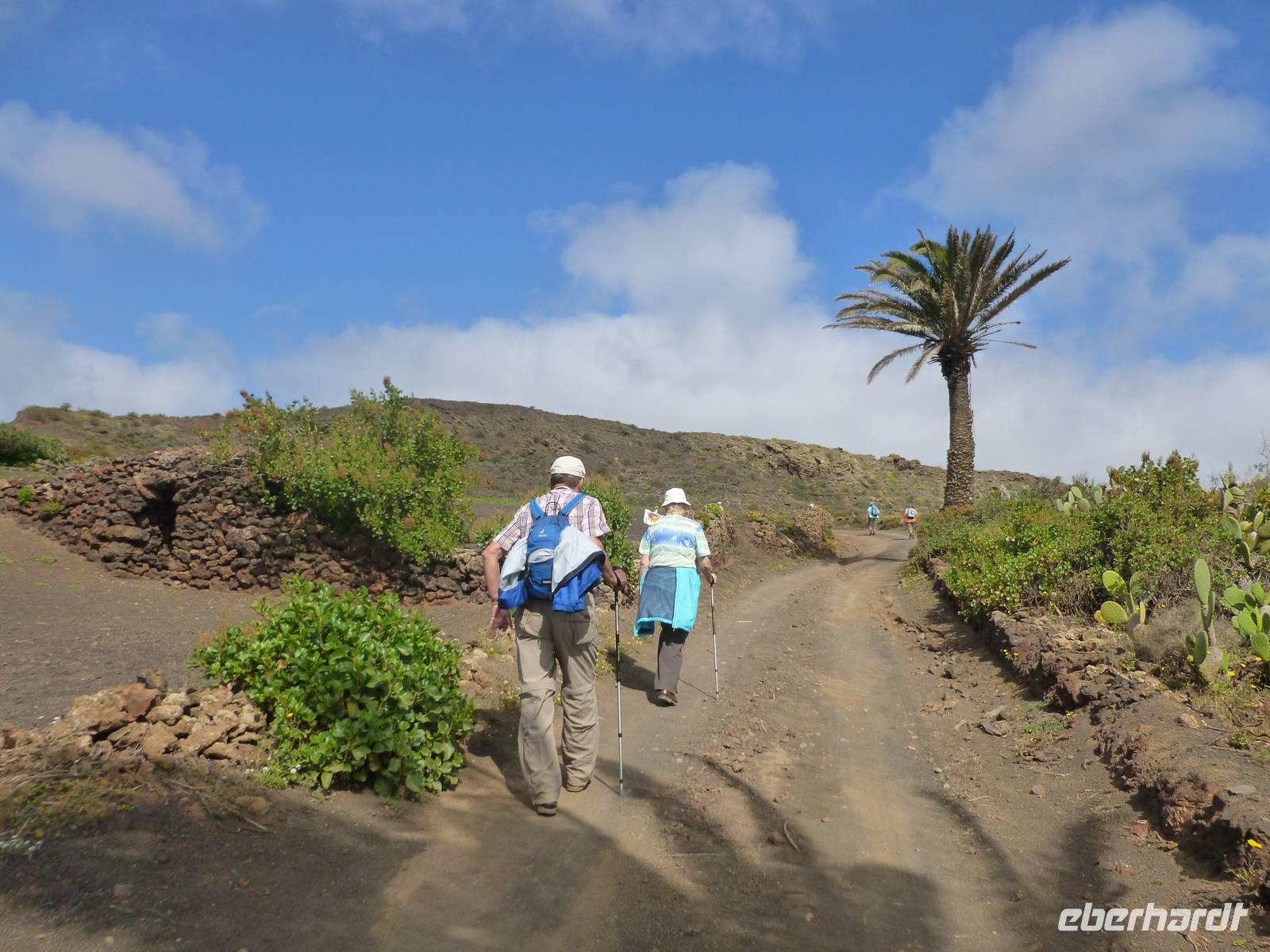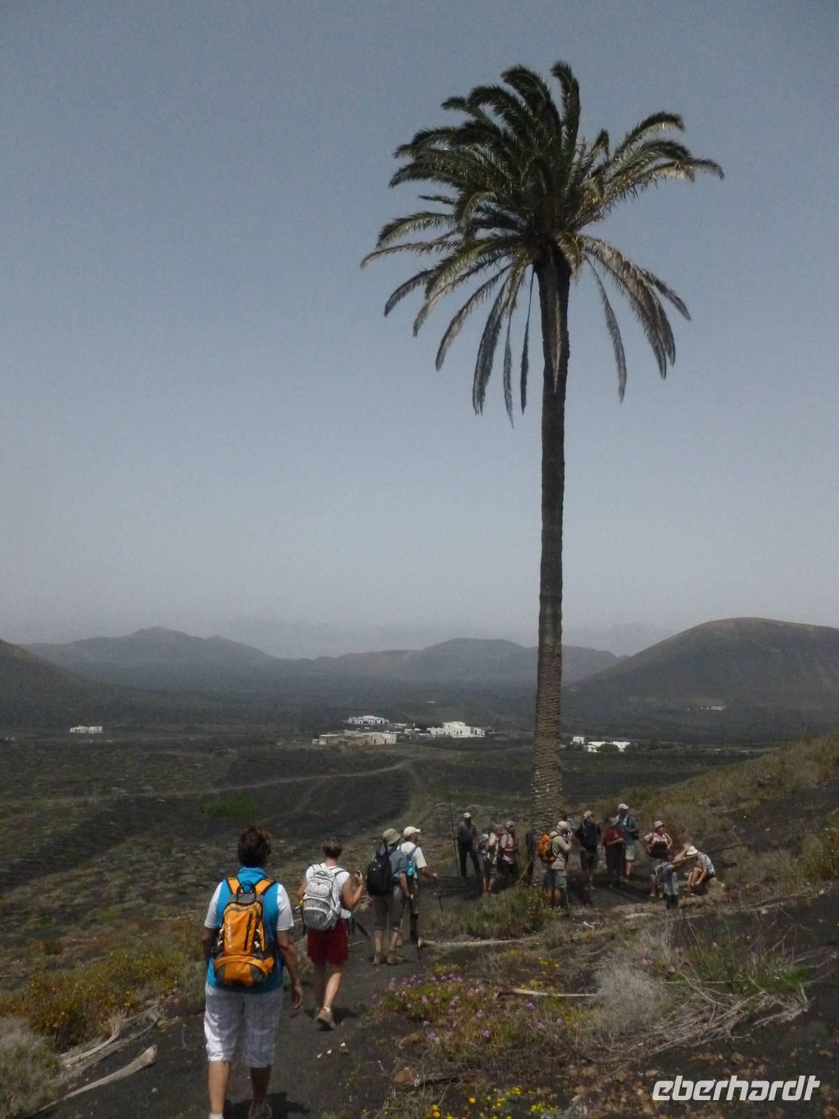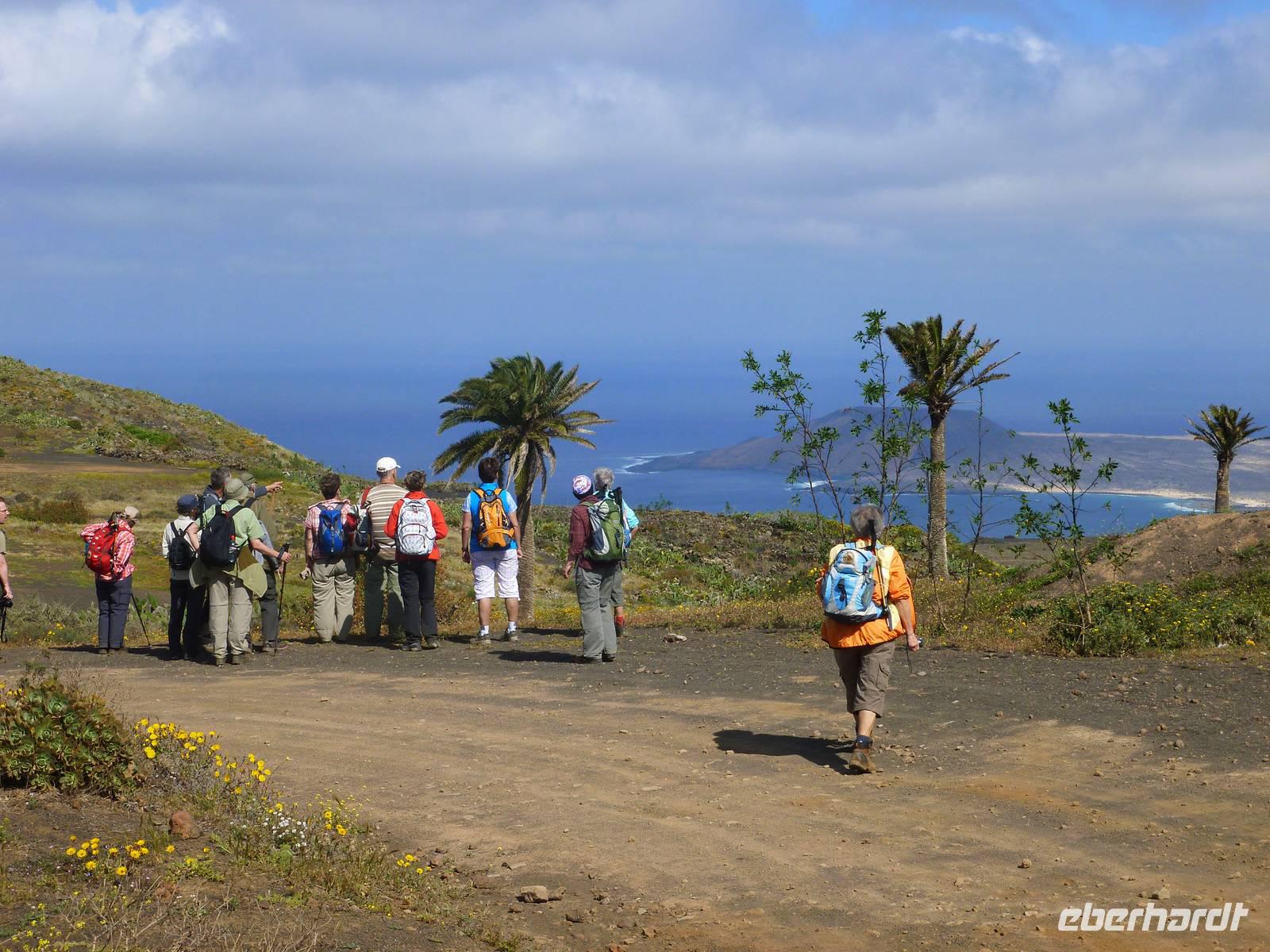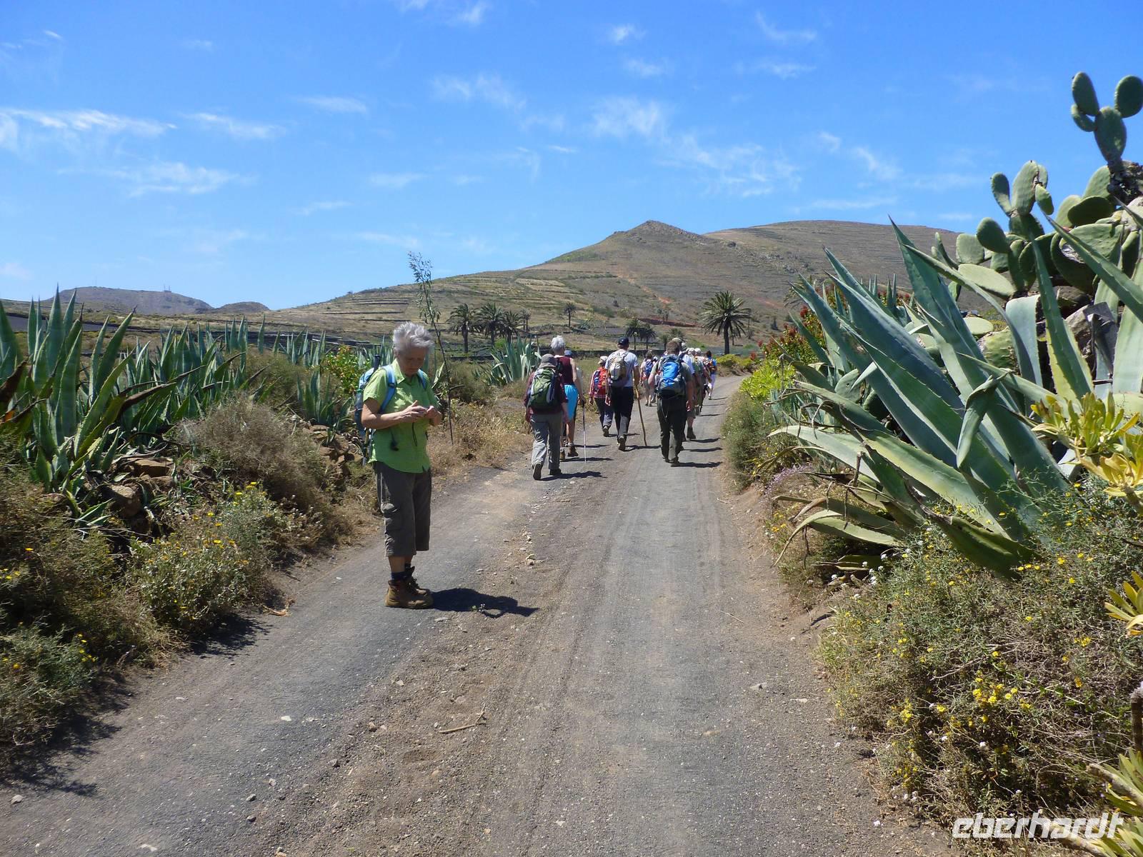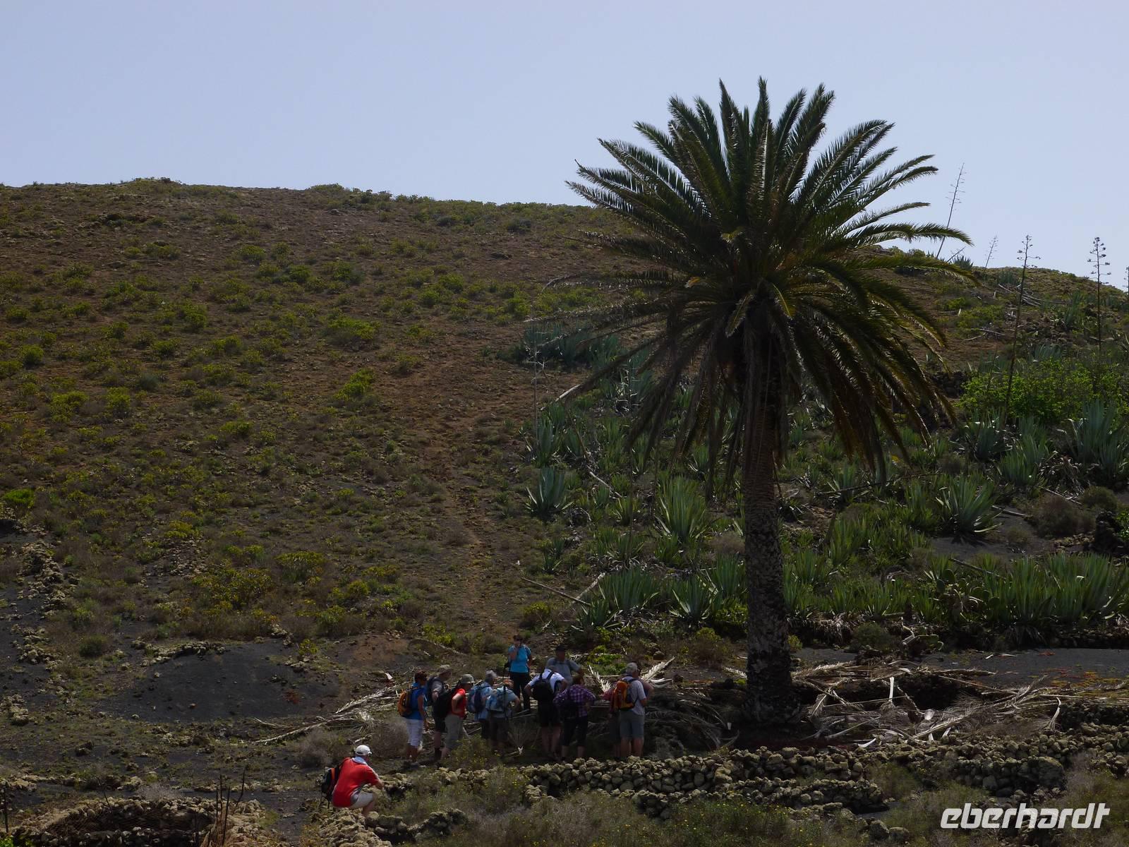 Heute rüsteten wir uns zum ersten Wandertag in den Nordosten der Insel. Am Morgen holte uns Roland gutgelaunt ab und unser Busfahrer Washington chauffierte uns an Tahiche und dem Kaktusgarten vorbei in Richtung des Monte Corona, dem Corona-Vulkan. An der Südseite schnürten wir die Wanderschuhe und den Rucksack und liefen erst einmal bergan - immer mit Blick auf den Vulkan. Der Vulkankegel ist der zweithöchste der Insel und wurde zum Naturdenkmal erklärt. Wir streiften das Dörfchen Guinate und gingen den Höhenweg entlang in Richtung Famara-Felsen. Doch vorher ließ ich meine Reisegäste kanarischen Kaktuslikör verkosten, sozusagen Benzin um die nächsten Höhenmeter gut zu meistern. Unterwegs erklärte Roland uns immer wieder interessantes zu Flora und Fauna und Geschichten aus der Vergangenheit. Schließlich am „Risco de Famara" angekommen, hatten wir einen grandiosen Blick auf das Meer und die Nachbarinseln „La Graciosa", „Montana Clara" und „Alegranza". Diese tolle Kulisse nutzten wir für ein Gruppenfoto und eine kurze Verschnaufpause. Weiter ging es immer mal bergauf und bergab in Richtung Maguez, dem ruhigen Wallfahrtsort. Zum Schluss wanderten wir durch den schönen Palmenhain und konnten schon unser heutiges Ziel zwischen Maguez und Haria vor Augen sehen. Zum Abschluss des ersten Wandertages kehrten wir noch in diesem kleinen Café ein und erfrischten uns bei einem leckeren Eis, einem Kaffee oder auch einem kühlen Bier. Anschließend ging es wieder zurück nach Puerto del Carmen. Der restliche Nachmittag stand wieder für eigene Aktivitäten zur Verfügung.