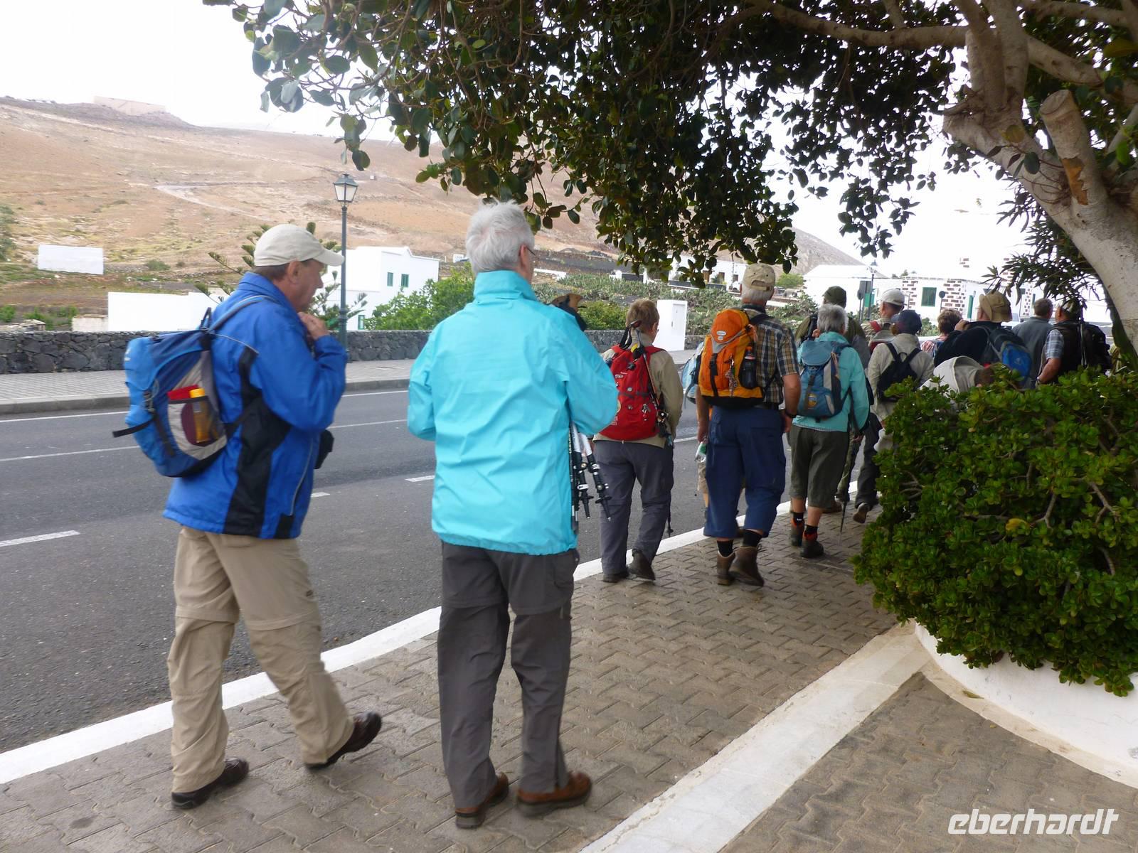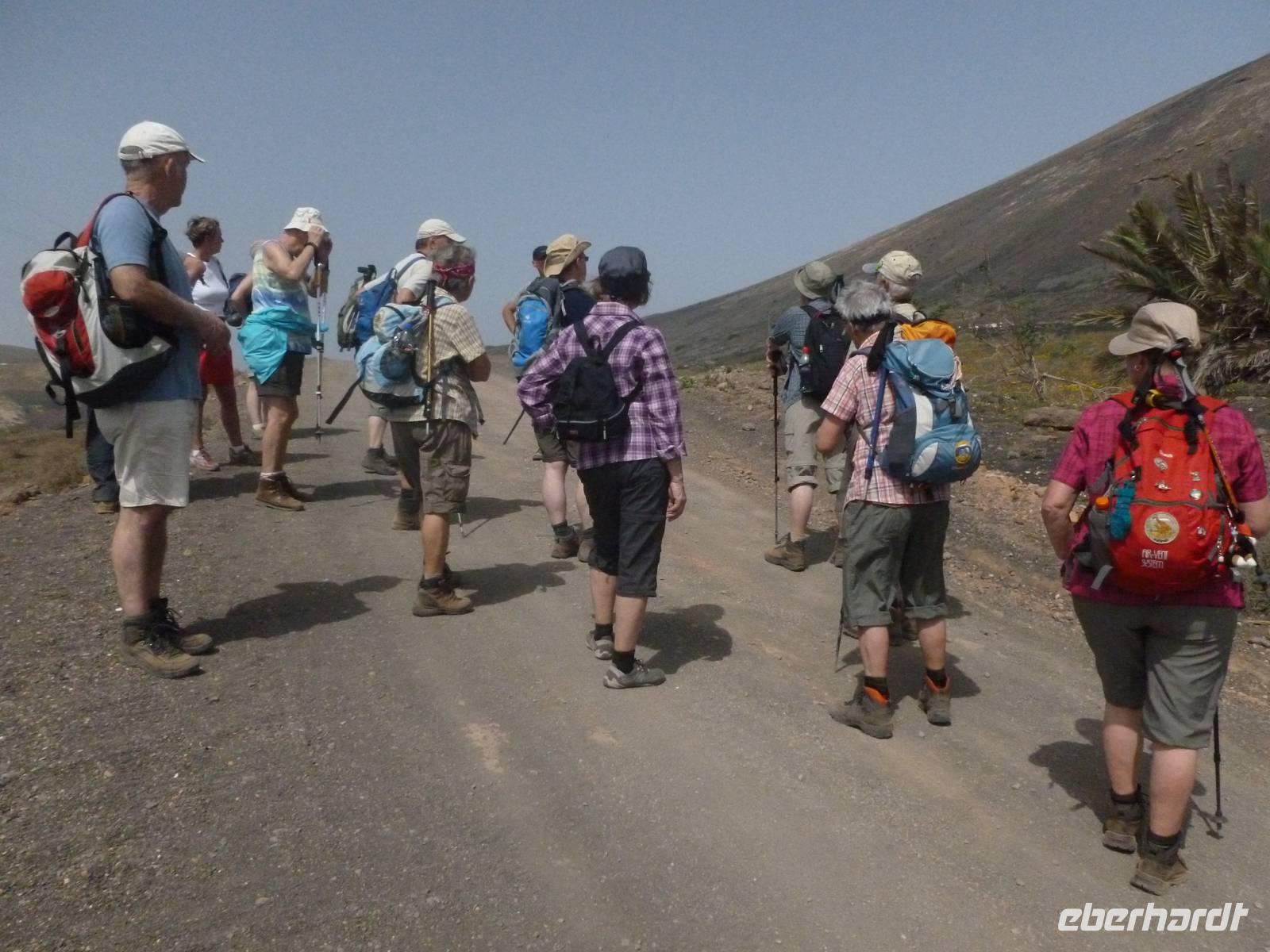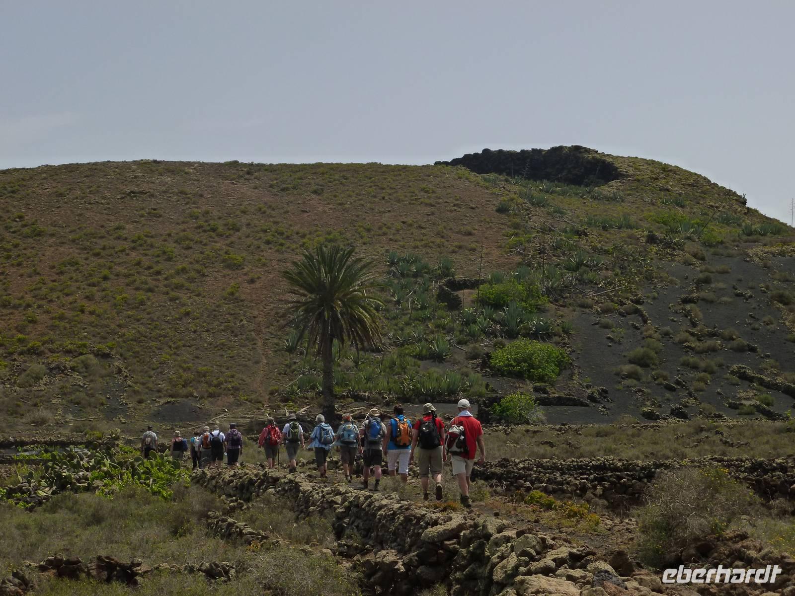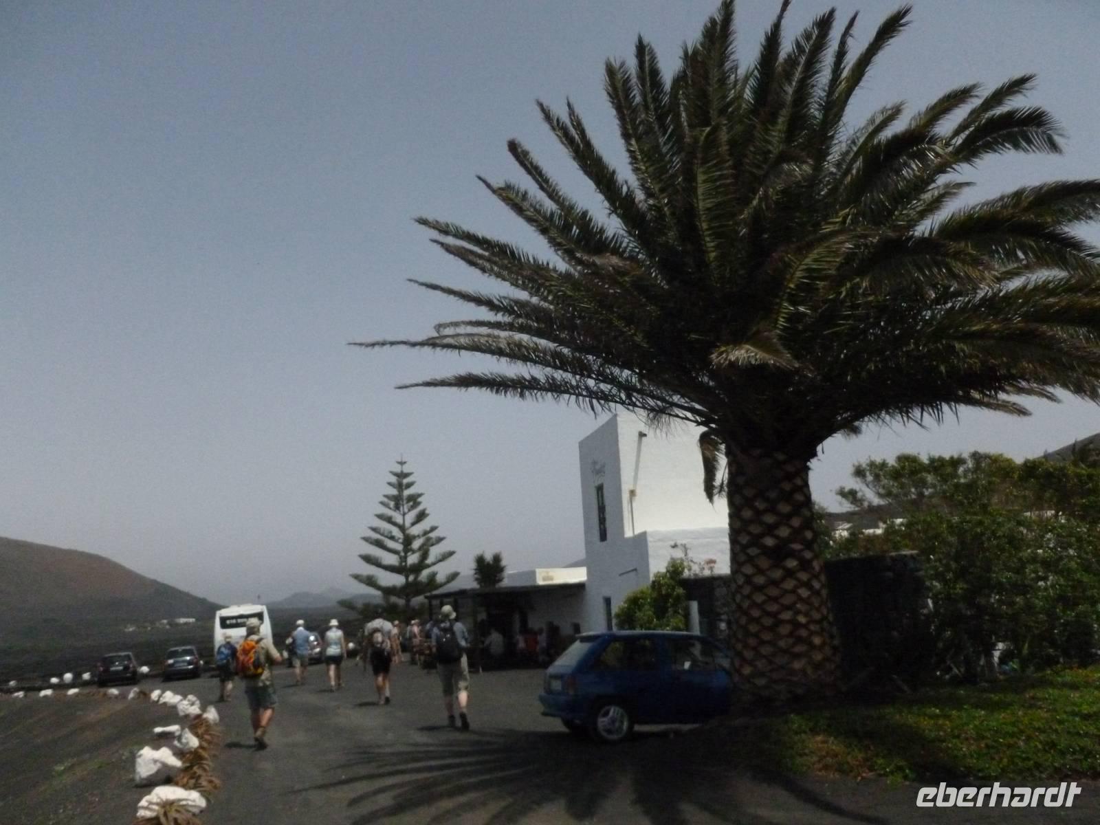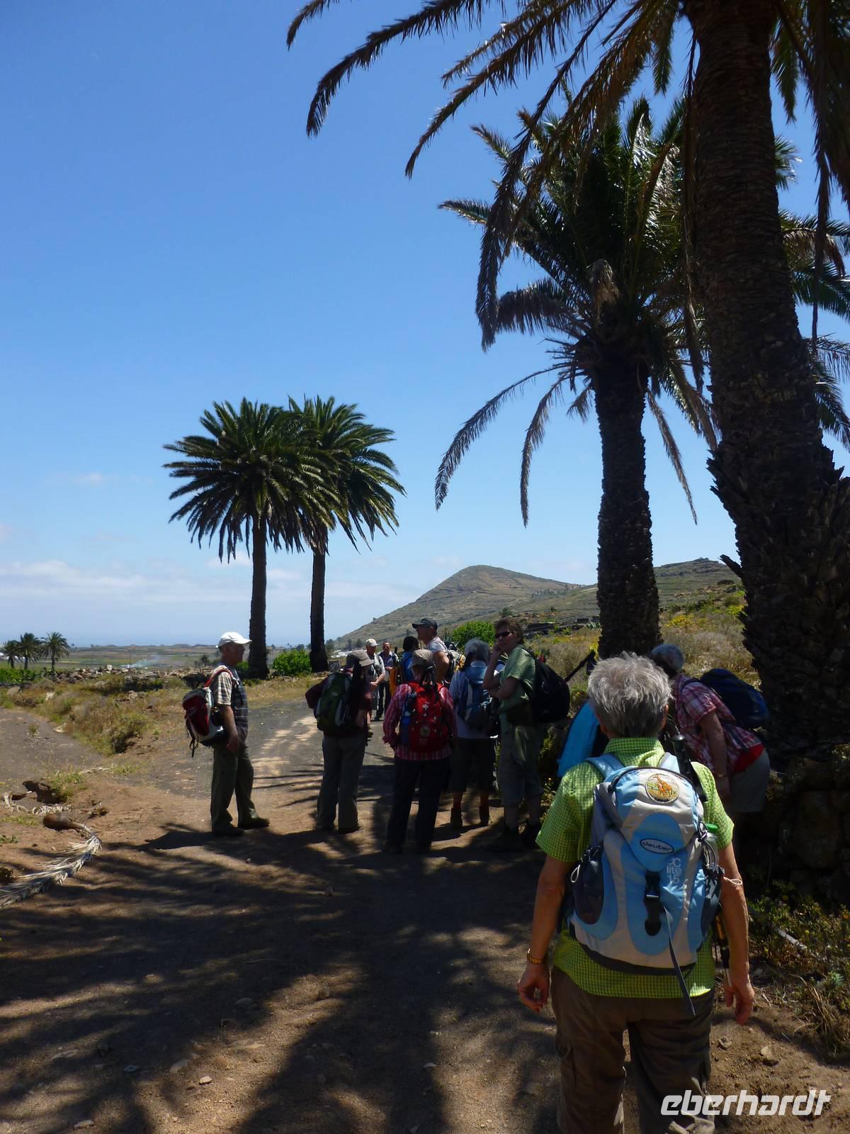 Heute rüsteten wir uns zum ersten Wandertag in den Nordosten der Insel. Am Morgen holte uns Roland gutgelaunt ab und unser Busfahrer Washington chauffierte uns an Tahiche und dem Kaktusgarten vorbei in Richtung des Monte Corona, dem Corona-Vulkan. An der Südseite schnürten wir die Wanderschuhe und den Rucksack und liefen erst einmal bergan - immer mit Blick auf den Vulkan. Der Vulkankegel ist der zweithöchste der Insel und wurde zum Naturdenkmal erklärt. Wir streiften das Dörfchen Guinate und gingen den Höhenweg entlang in Richtung Famara-Felsen. Doch vorher ließ ich meine Reisegäste kanarischen Kaktuslikör verkosten, sozusagen Benzin um die nächsten Höhenmeter gut zu meistern. Unterwegs erklärte Roland uns immer wieder interessantes zu Flora und Fauna und Geschichten aus der Vergangenheit. Schließlich am „Risco de Famara" angekommen, hatten wir einen grandiosen Blick auf das Meer und die Nachbarinseln „La Graciosa", „Montana Clara" und „Alegranza". Diese tolle Kulisse nutzten wir für ein Gruppenfoto und eine kurze Verschnaufpause. Weiter ging es immer mal bergauf und bergab in Richtung Maguez, dem ruhigen Wallfahrtsort. Zum Schluss wanderten wir durch den schönen Palmenhain und konnten schon unser heutiges Ziel zwischen Maguez und Haria vor Augen sehen. Zum Abschluss des ersten Wandertages kehrten wir noch in diesem kleinen Café ein und erfrischten uns bei einem leckeren Eis, einem Kaffee oder auch einem kühlen Bier. Anschließend ging es wieder zurück nach Puerto del Carmen. Der restliche Nachmittag stand wieder für eigene Aktivitäten zur Verfügung.