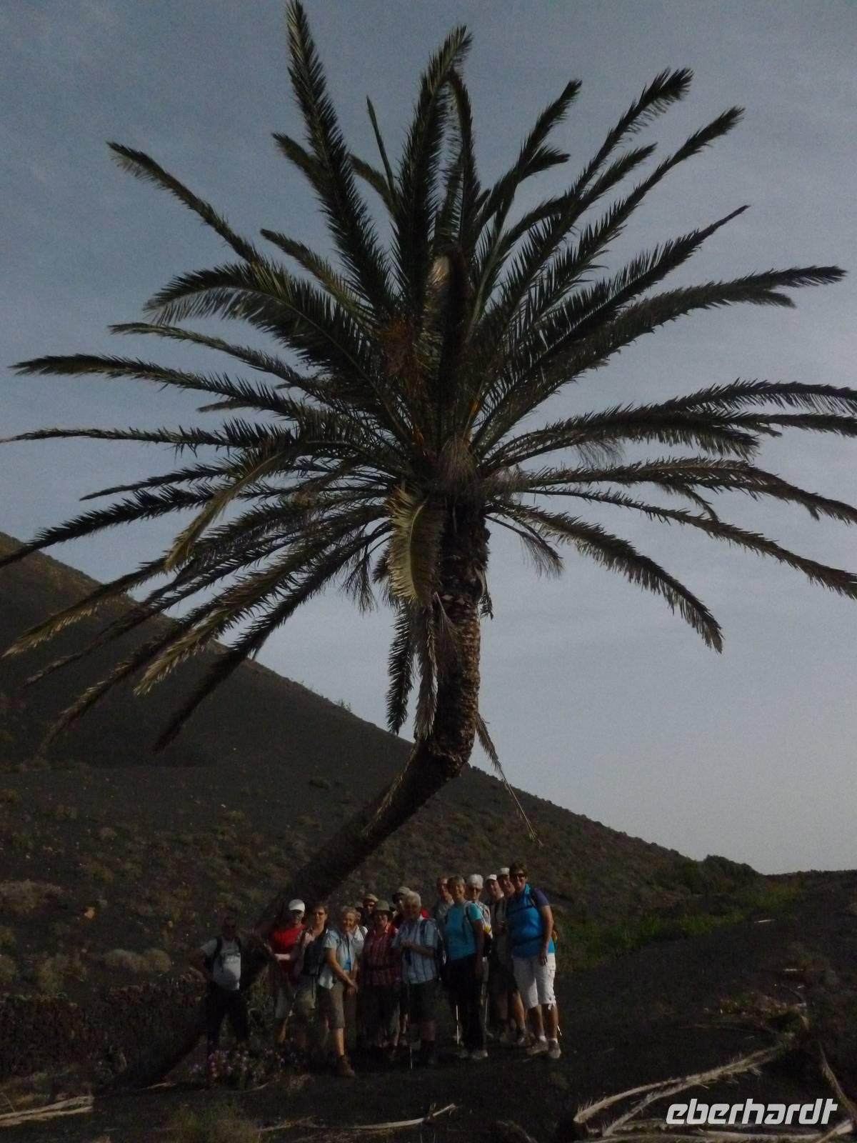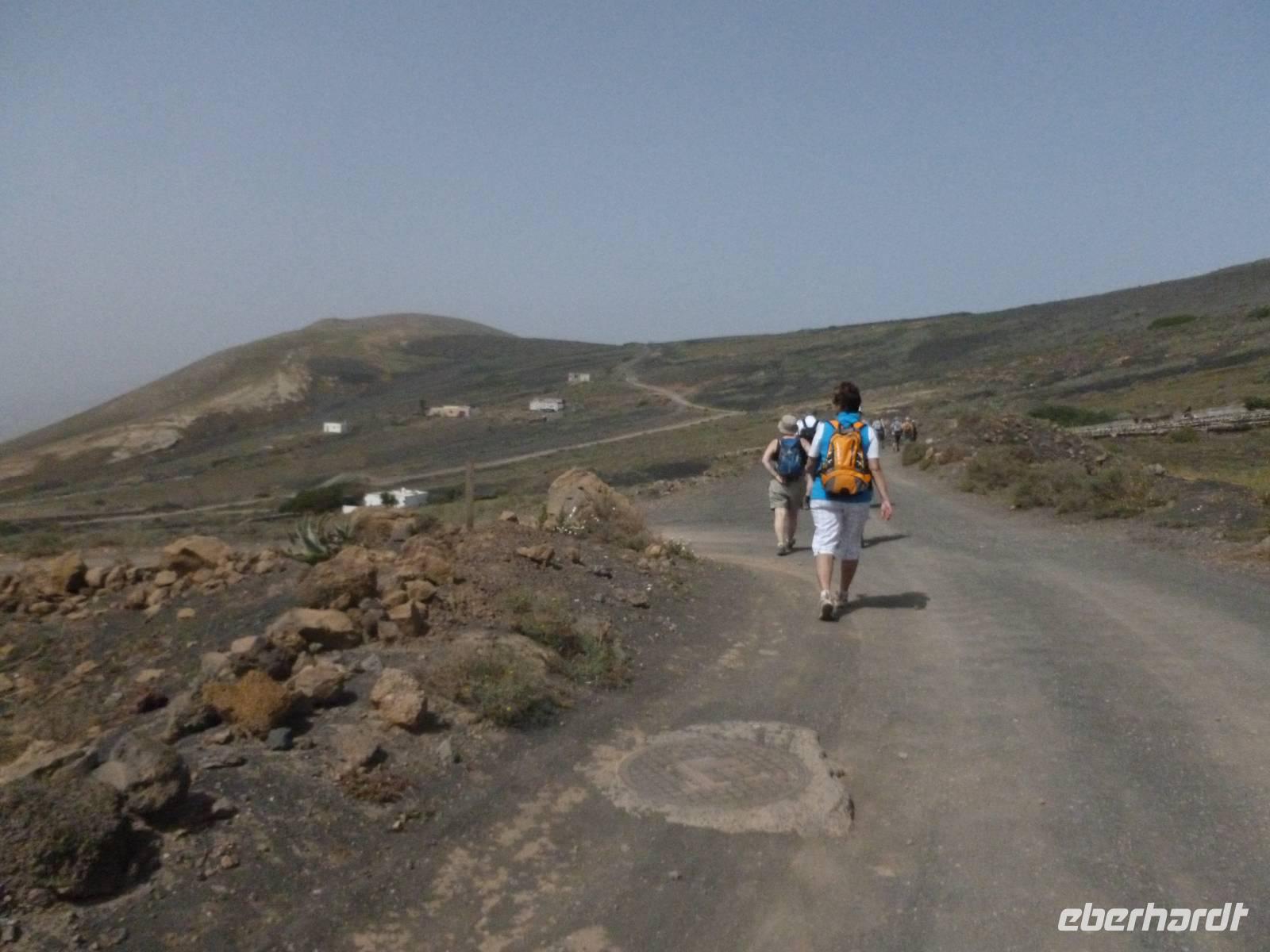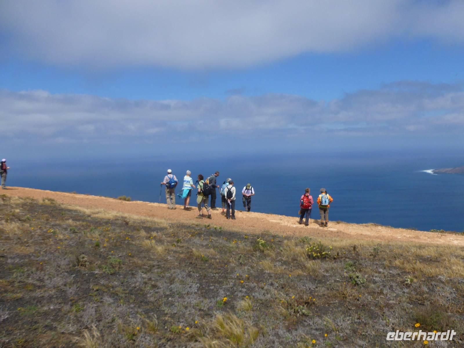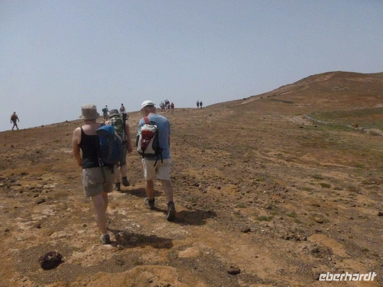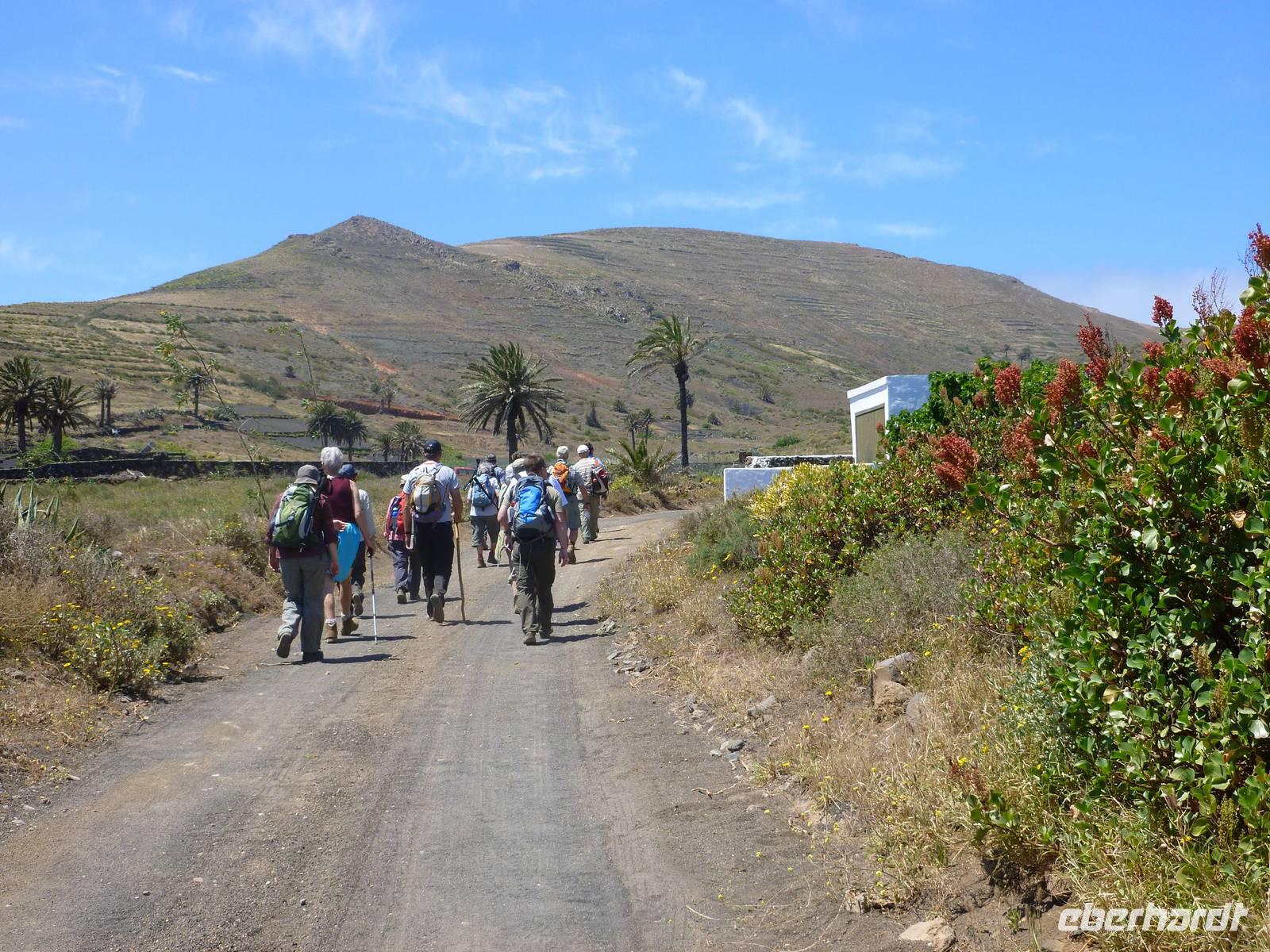 Heute rüsteten wir uns zum ersten Wandertag in den Nordosten der Insel. Am Morgen holte uns Roland gutgelaunt ab und unser Busfahrer Washington chauffierte uns an Tahiche und dem Kaktusgarten vorbei in Richtung des Monte Corona, dem Corona-Vulkan. An der Südseite schnürten wir die Wanderschuhe und den Rucksack und liefen erst einmal bergan - immer mit Blick auf den Vulkan. Der Vulkankegel ist der zweithöchste der Insel und wurde zum Naturdenkmal erklärt. Wir streiften das Dörfchen Guinate und gingen den Höhenweg entlang in Richtung Famara-Felsen. Doch vorher ließ ich meine Reisegäste kanarischen Kaktuslikör verkosten, sozusagen Benzin um die nächsten Höhenmeter gut zu meistern. Unterwegs erklärte Roland uns immer wieder interessantes zu Flora und Fauna und Geschichten aus der Vergangenheit. Schließlich am „Risco de Famara" angekommen, hatten wir einen grandiosen Blick auf das Meer und die Nachbarinseln „La Graciosa", „Montana Clara" und „Alegranza". Diese tolle Kulisse nutzten wir für ein Gruppenfoto und eine kurze Verschnaufpause. Weiter ging es immer mal bergauf und bergab in Richtung Maguez, dem ruhigen Wallfahrtsort. Zum Schluss wanderten wir durch den schönen Palmenhain und konnten schon unser heutiges Ziel zwischen Maguez und Haria vor Augen sehen. Zum Abschluss des ersten Wandertages kehrten wir noch in diesem kleinen Café ein und erfrischten uns bei einem leckeren Eis, einem Kaffee oder auch einem kühlen Bier. Anschließend ging es wieder zurück nach Puerto del Carmen. Der restliche Nachmittag stand wieder für eigene Aktivitäten zur Verfügung.