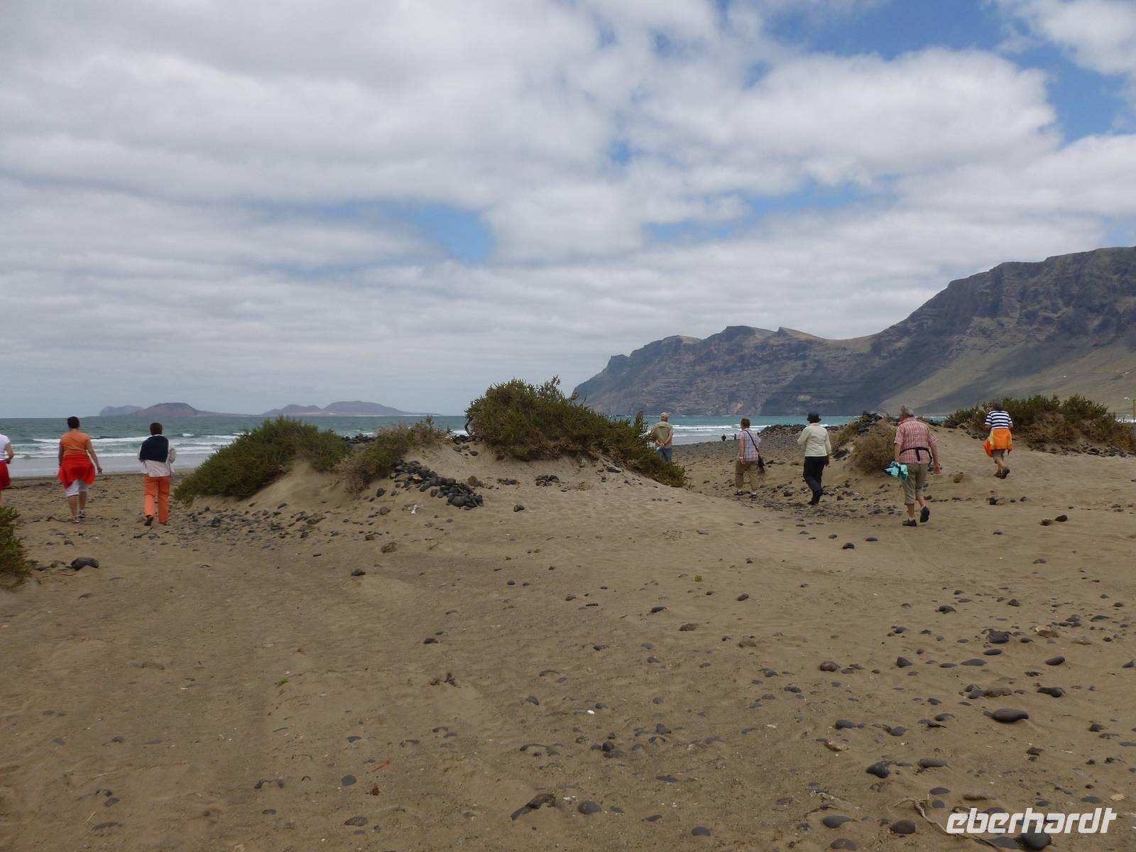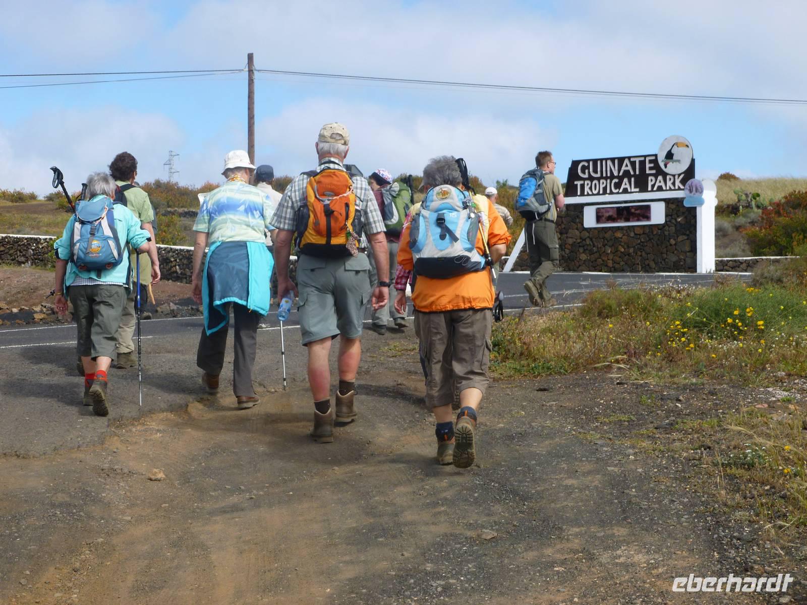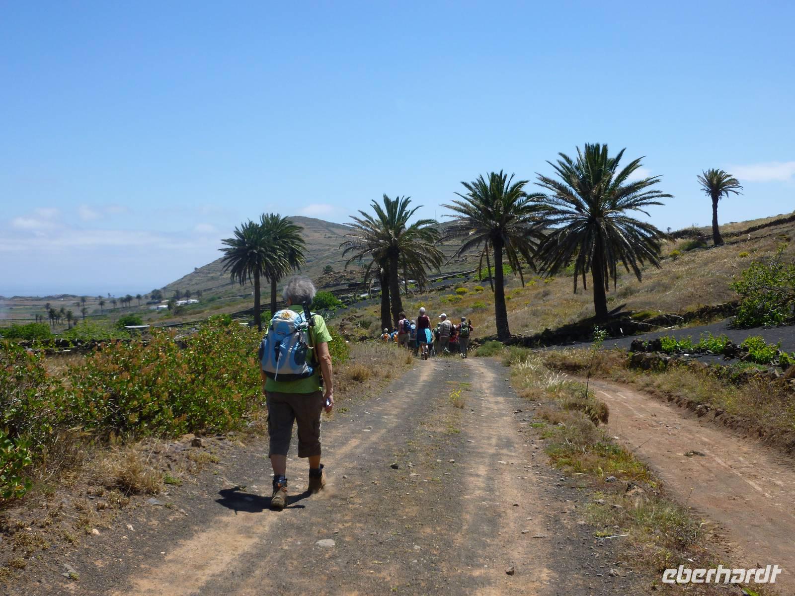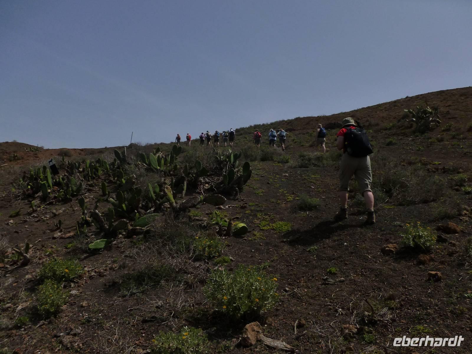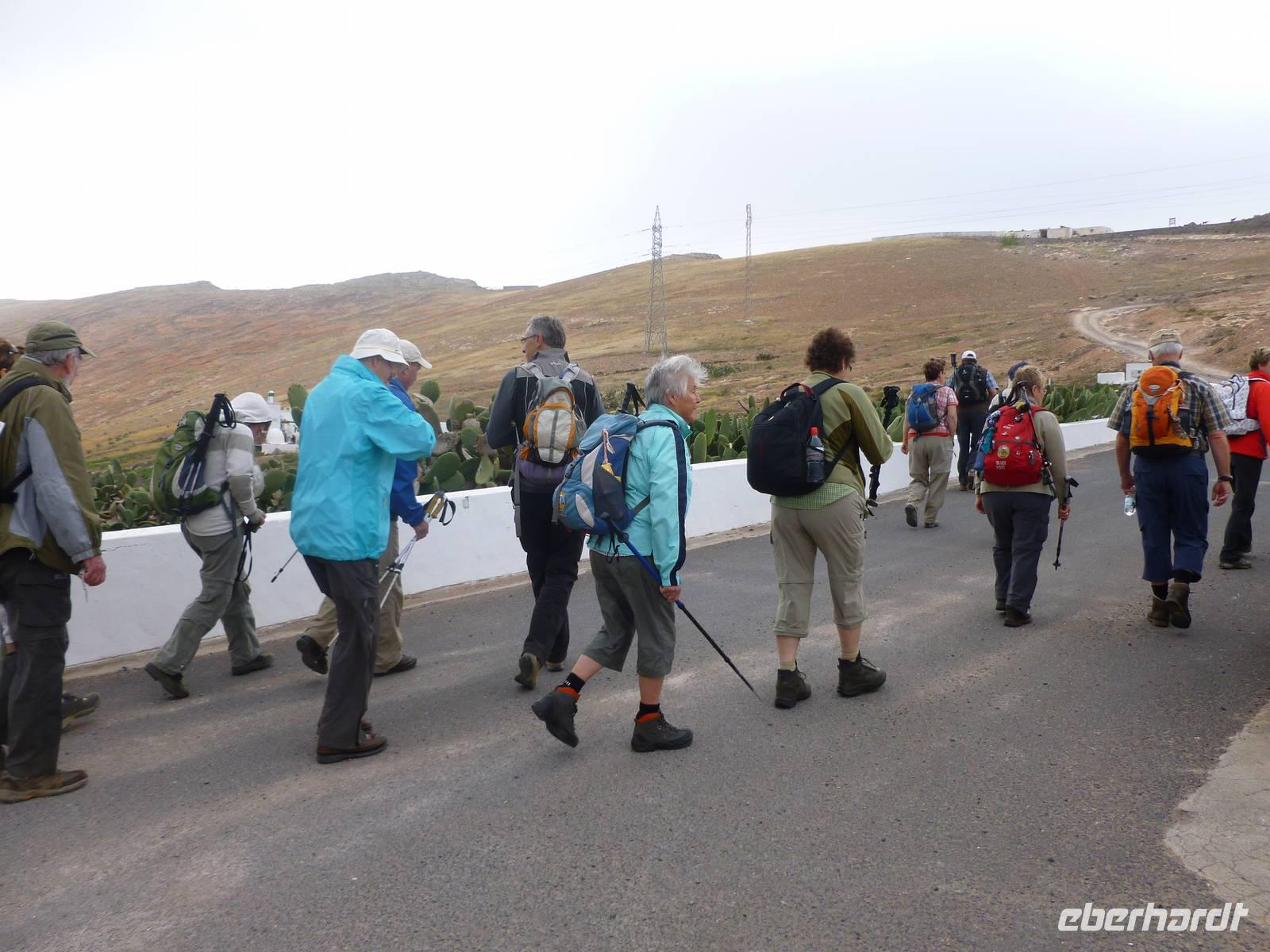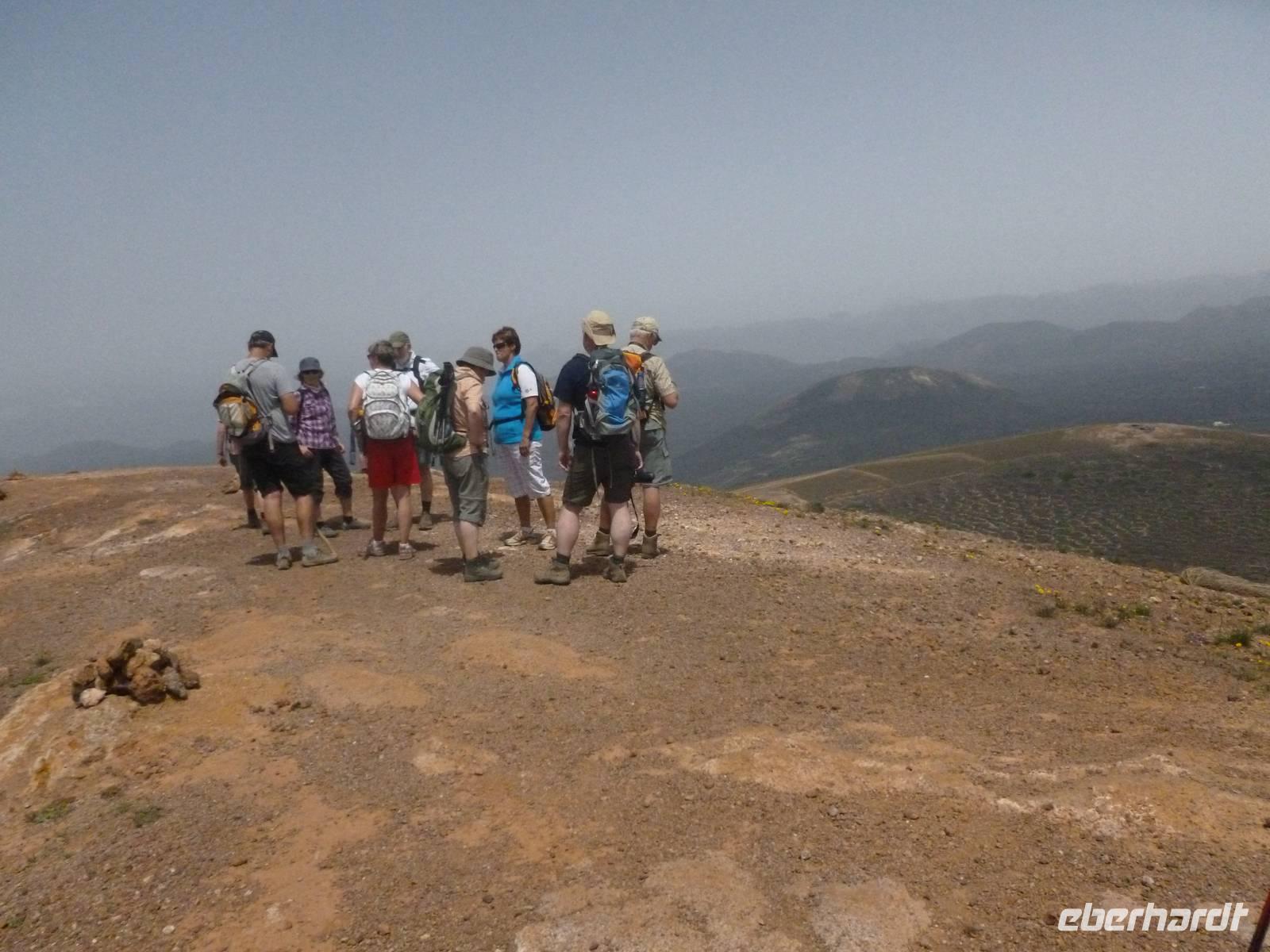 Heute rüsteten wir uns zum ersten Wandertag in den Nordosten der Insel. Am Morgen holte uns Roland gutgelaunt ab und unser Busfahrer Washington chauffierte uns an Tahiche und dem Kaktusgarten vorbei in Richtung des Monte Corona, dem Corona-Vulkan. An der Südseite schnürten wir die Wanderschuhe und den Rucksack und liefen erst einmal bergan - immer mit Blick auf den Vulkan. Der Vulkankegel ist der zweithöchste der Insel und wurde zum Naturdenkmal erklärt. Wir streiften das Dörfchen Guinate und gingen den Höhenweg entlang in Richtung Famara-Felsen. Doch vorher ließ ich meine Reisegäste kanarischen Kaktuslikör verkosten, sozusagen Benzin um die nächsten Höhenmeter gut zu meistern. Unterwegs erklärte Roland uns immer wieder interessantes zu Flora und Fauna und Geschichten aus der Vergangenheit. Schließlich am „Risco de Famara" angekommen, hatten wir einen grandiosen Blick auf das Meer und die Nachbarinseln „La Graciosa", „Montana Clara" und „Alegranza". Diese tolle Kulisse nutzten wir für ein Gruppenfoto und eine kurze Verschnaufpause. Weiter ging es immer mal bergauf und bergab in Richtung Maguez, dem ruhigen Wallfahrtsort. Zum Schluss wanderten wir durch den schönen Palmenhain und konnten schon unser heutiges Ziel zwischen Maguez und Haria vor Augen sehen. Zum Abschluss des ersten Wandertages kehrten wir noch in diesem kleinen Café ein und erfrischten uns bei einem leckeren Eis, einem Kaffee oder auch einem kühlen Bier. Anschließend ging es wieder zurück nach Puerto del Carmen. Der restliche Nachmittag stand wieder für eigene Aktivitäten zur Verfügung.