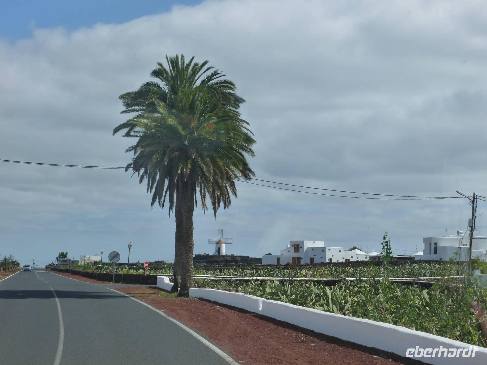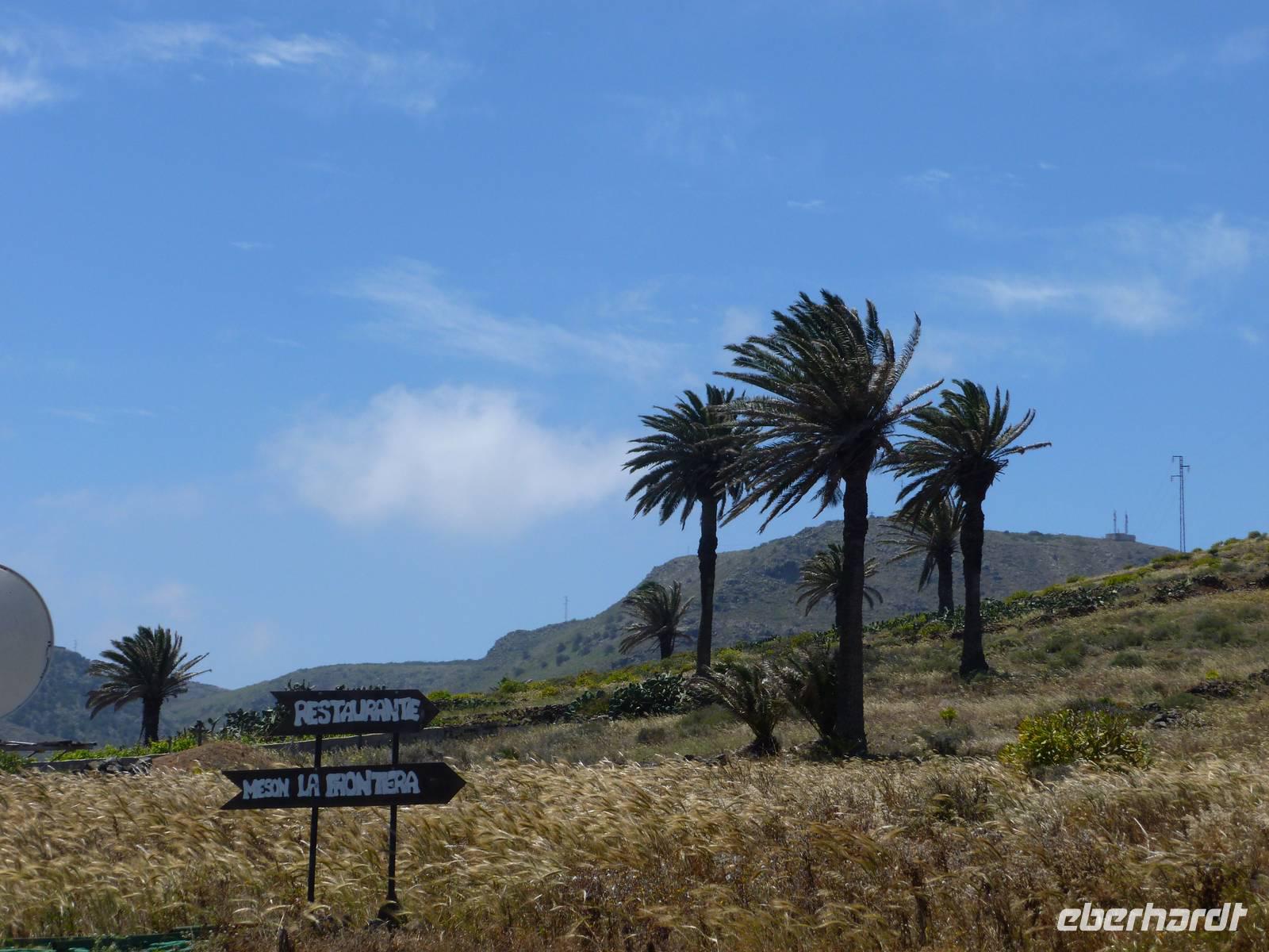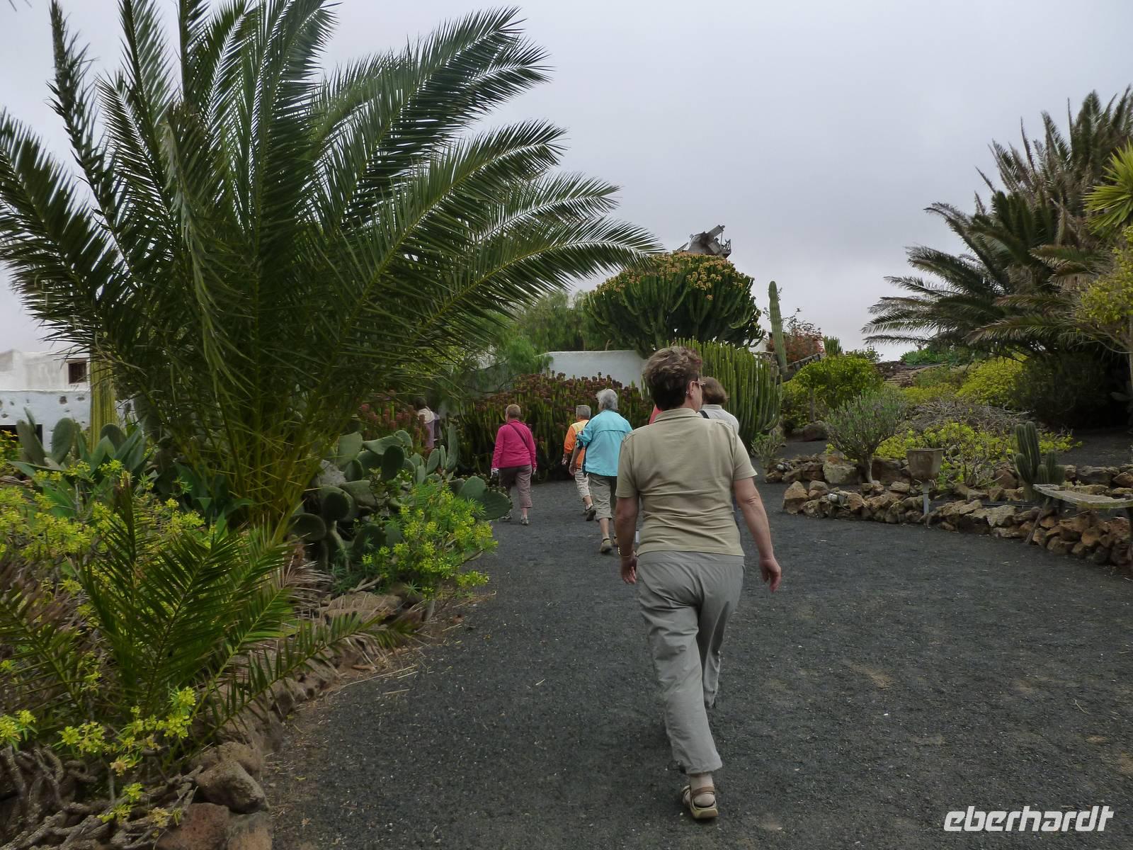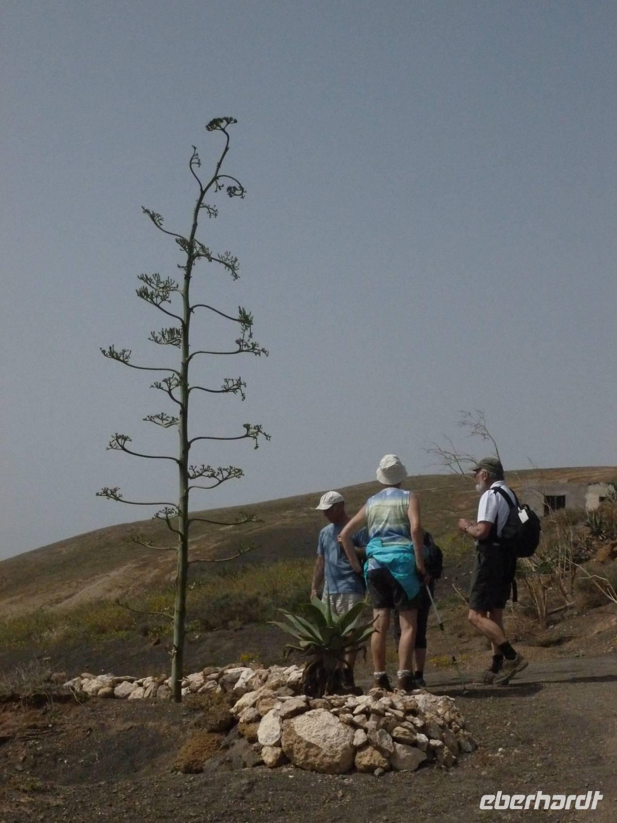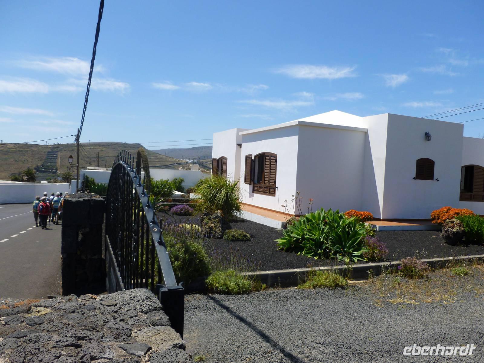 Heute rüsteten wir uns zum ersten Wandertag in den Nordosten der Insel. Am Morgen holte uns Roland gutgelaunt ab und unser Busfahrer Washington chauffierte uns an Tahiche und dem Kaktusgarten vorbei in Richtung des Monte Corona, dem Corona-Vulkan. An der Südseite schnürten wir die Wanderschuhe und den Rucksack und liefen erst einmal bergan - immer mit Blick auf den Vulkan. Der Vulkankegel ist der zweithöchste der Insel und wurde zum Naturdenkmal erklärt. Wir streiften das Dörfchen Guinate und gingen den Höhenweg entlang in Richtung Famara-Felsen. Doch vorher ließ ich meine Reisegäste kanarischen Kaktuslikör verkosten, sozusagen Benzin um die nächsten Höhenmeter gut zu meistern. Unterwegs erklärte Roland uns immer wieder interessantes zu Flora und Fauna und Geschichten aus der Vergangenheit. Schließlich am „Risco de Famara" angekommen, hatten wir einen grandiosen Blick auf das Meer und die Nachbarinseln „La Graciosa", „Montana Clara" und „Alegranza". Diese tolle Kulisse nutzten wir für ein Gruppenfoto und eine kurze Verschnaufpause. Weiter ging es immer mal bergauf und bergab in Richtung Maguez, dem ruhigen Wallfahrtsort. Zum Schluss wanderten wir durch den schönen Palmenhain und konnten schon unser heutiges Ziel zwischen Maguez und Haria vor Augen sehen. Zum Abschluss des ersten Wandertages kehrten wir noch in diesem kleinen Café ein und erfrischten uns bei einem leckeren Eis, einem Kaffee oder auch einem kühlen Bier. Anschließend ging es wieder zurück nach Puerto del Carmen. Der restliche Nachmittag stand wieder für eigene Aktivitäten zur Verfügung.