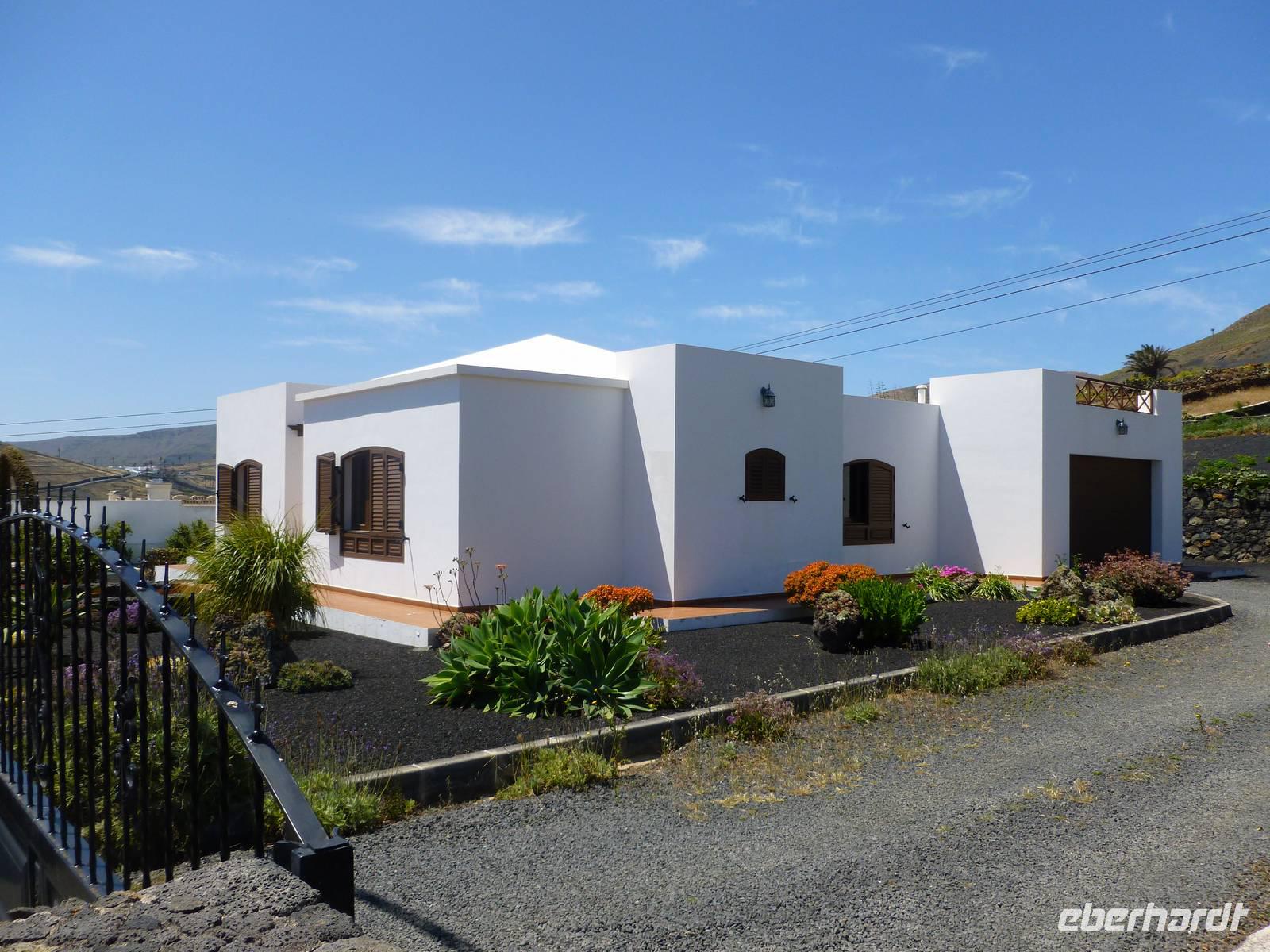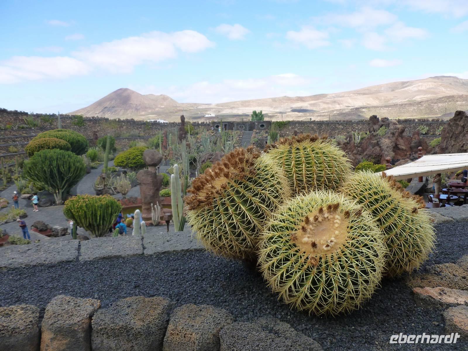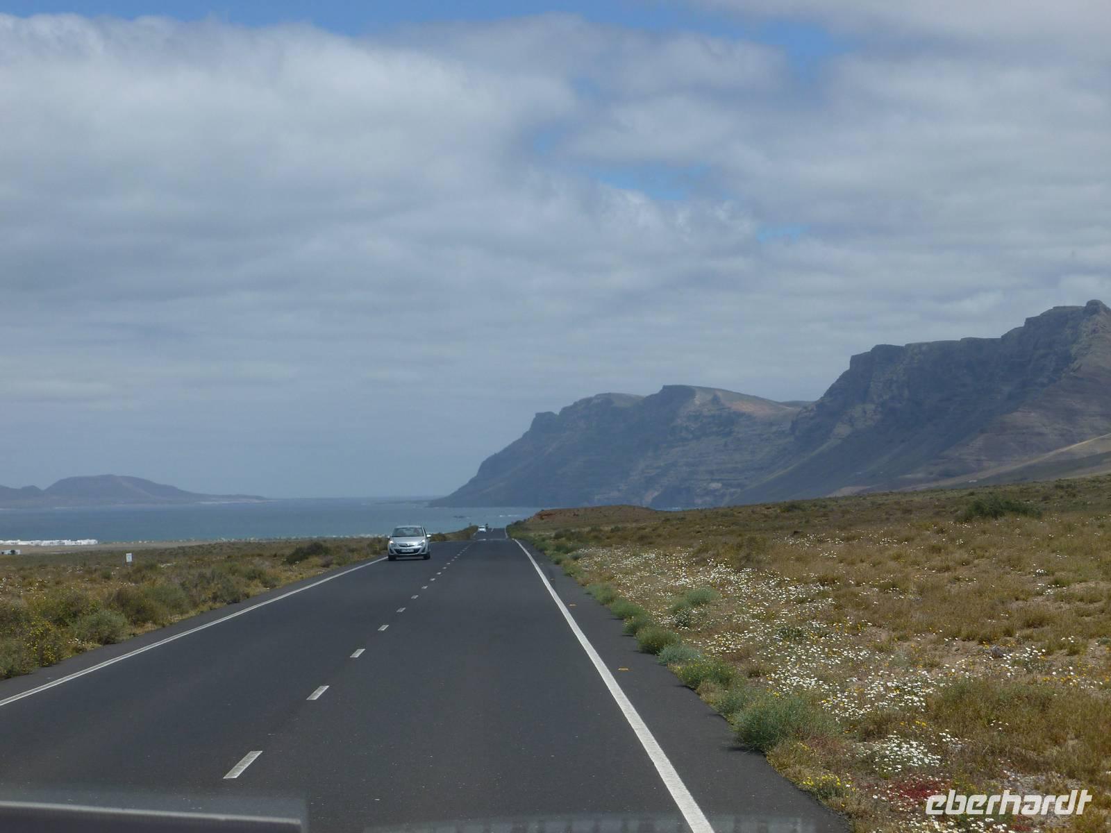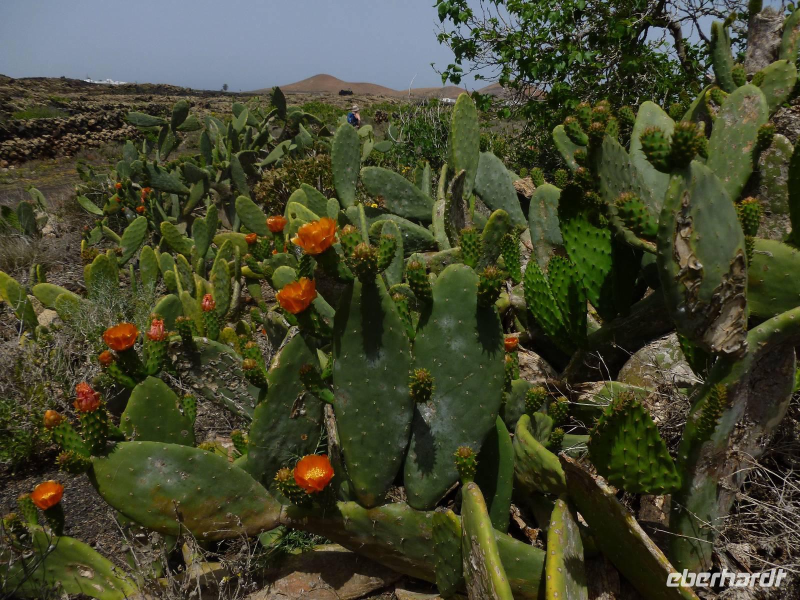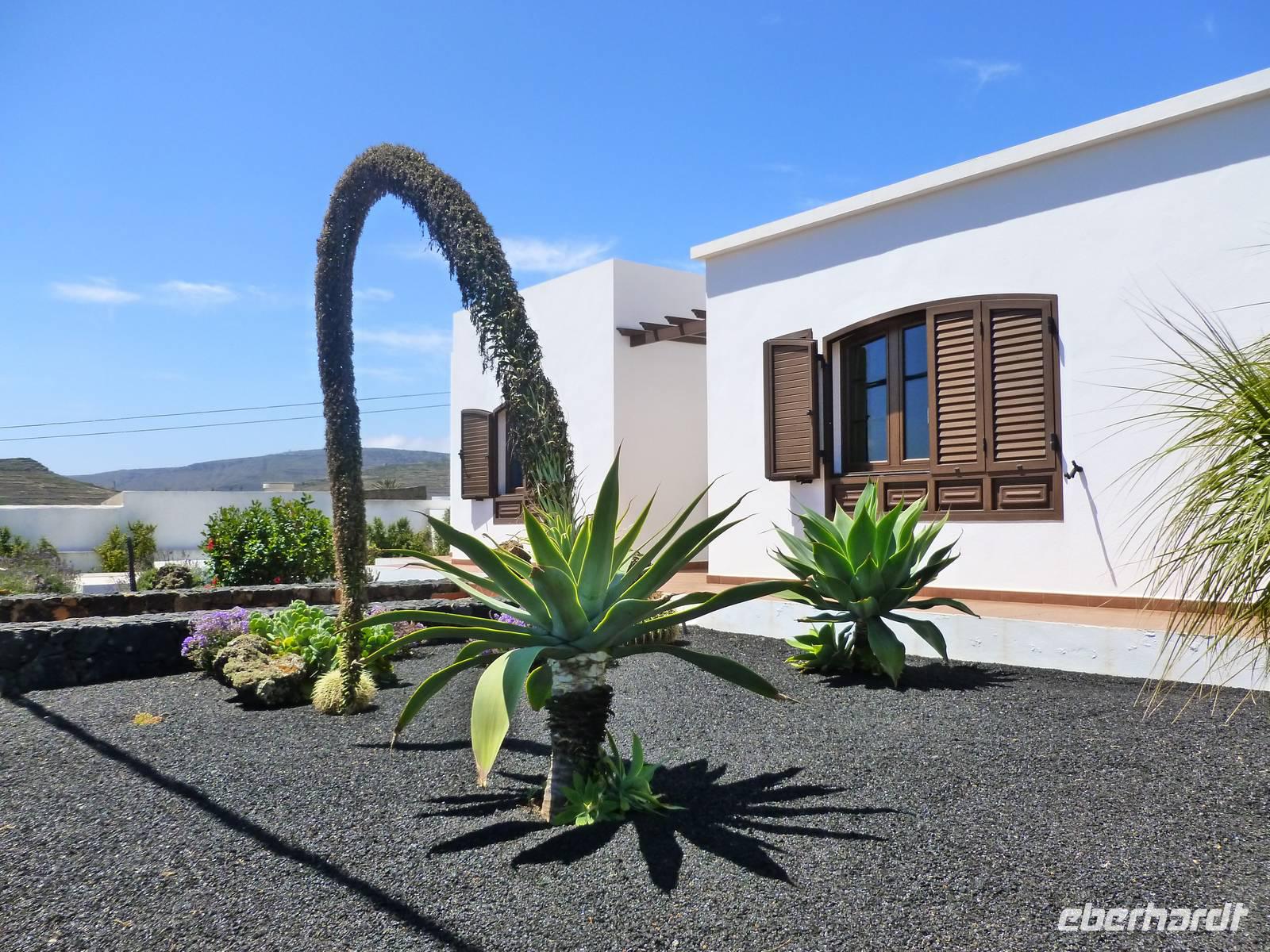 Heute rüsteten wir uns zum ersten Wandertag in den Nordosten der Insel. Am Morgen holte uns Roland gutgelaunt ab und unser Busfahrer Washington chauffierte uns an Tahiche und dem Kaktusgarten vorbei in Richtung des Monte Corona, dem Corona-Vulkan. An der Südseite schnürten wir die Wanderschuhe und den Rucksack und liefen erst einmal bergan - immer mit Blick auf den Vulkan. Der Vulkankegel ist der zweithöchste der Insel und wurde zum Naturdenkmal erklärt. Wir streiften das Dörfchen Guinate und gingen den Höhenweg entlang in Richtung Famara-Felsen. Doch vorher ließ ich meine Reisegäste kanarischen Kaktuslikör verkosten, sozusagen Benzin um die nächsten Höhenmeter gut zu meistern. Unterwegs erklärte Roland uns immer wieder interessantes zu Flora und Fauna und Geschichten aus der Vergangenheit. Schließlich am „Risco de Famara" angekommen, hatten wir einen grandiosen Blick auf das Meer und die Nachbarinseln „La Graciosa", „Montana Clara" und „Alegranza". Diese tolle Kulisse nutzten wir für ein Gruppenfoto und eine kurze Verschnaufpause. Weiter ging es immer mal bergauf und bergab in Richtung Maguez, dem ruhigen Wallfahrtsort. Zum Schluss wanderten wir durch den schönen Palmenhain und konnten schon unser heutiges Ziel zwischen Maguez und Haria vor Augen sehen. Zum Abschluss des ersten Wandertages kehrten wir noch in diesem kleinen Café ein und erfrischten uns bei einem leckeren Eis, einem Kaffee oder auch einem kühlen Bier. Anschließend ging es wieder zurück nach Puerto del Carmen. Der restliche Nachmittag stand wieder für eigene Aktivitäten zur Verfügung.