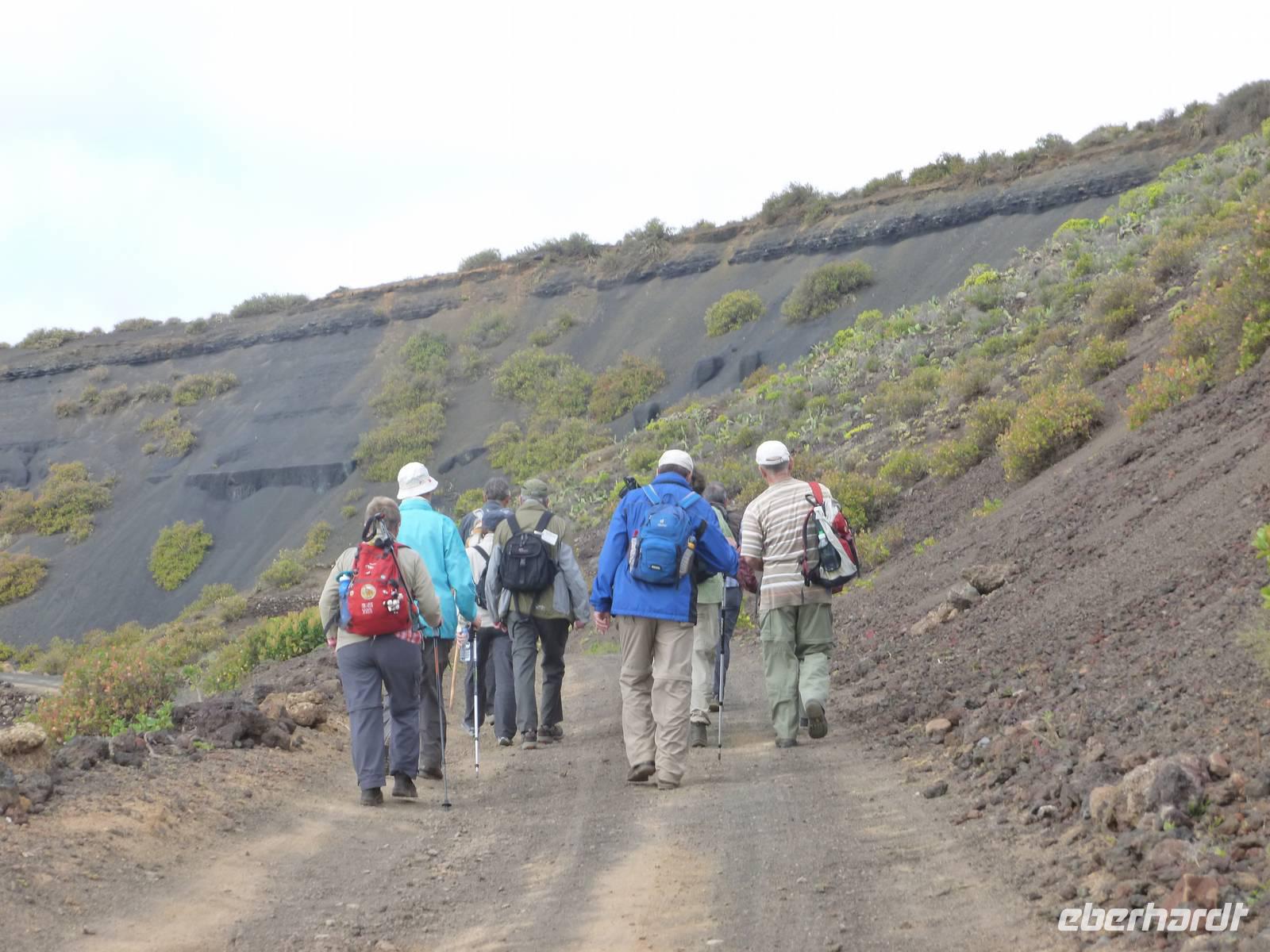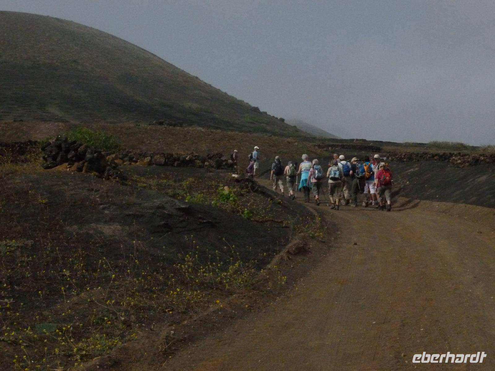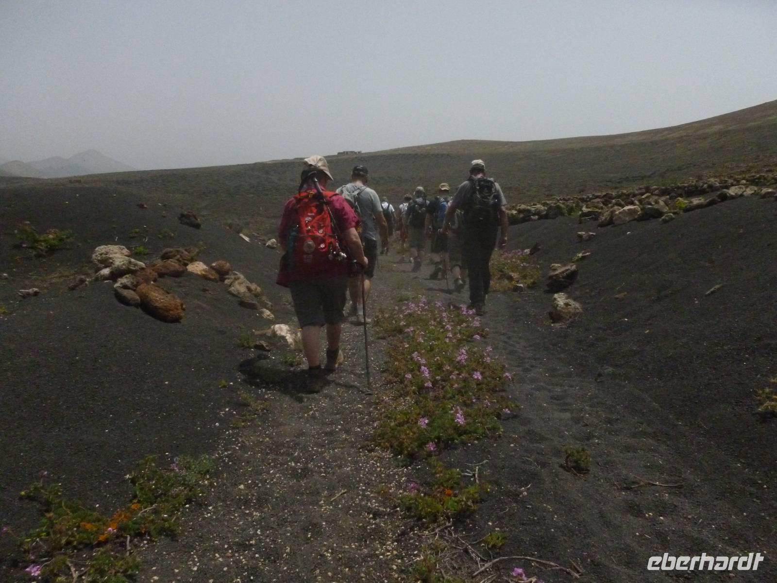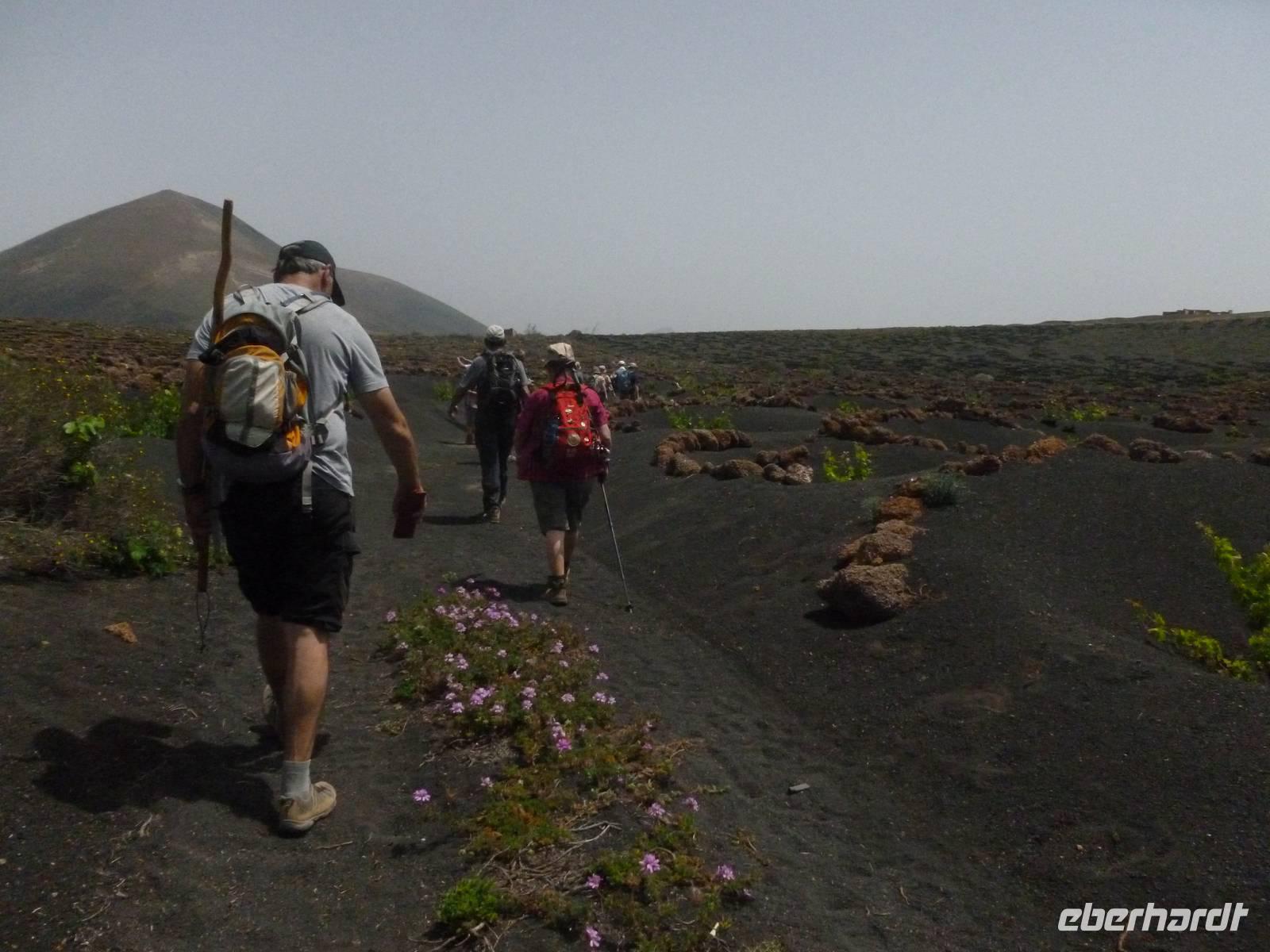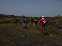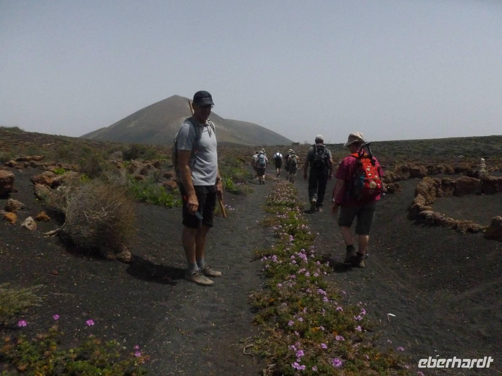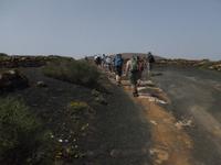 Heute konnten wir das ausgiebige Frühstück noch länger genießen, da uns Roland erst gegen 10 Uhr vom Hotel abgeholt hatte. Unser heutiger Anfangspunkt lag nur ca. 20 Minuten entfernt, oberhalb von La Asomada. Der erste Teil ging leicht bergan, immer in Richtung „Guardilama". Die Sicht war leider etwas diesig, aber dafür zeigte sich die Sonne heute wieder von ihrer besten Seite. Auch die Temperaturen waren deutlich gestiegen. Links und rechts konnten wir immer wieder die mühsam angelegten Weinfelder begutachten, die sehr akribisch von den Landsleuten gepflegt wurden. Auch Rolands Haus konnten wir von Weitem sichten. Weiter ging es nun bergauf in Richtung des Vulkanes „Guardilamas". Dort sind wir am Kraterrand oberhalb in Richtung des Vulkanes „Montana Tinasoria" gelaufen. Der Abstieg war dann stückchenweise sehr steil durch weiche, schwarze Kiesfelder in denen immer wieder bunte Blumen aufblitzten. Anschließend stiegen wir zum Tinasoria auf und machten an der Ruine Rast, um uns bei etwas Obst und einem Müsliriegel zu stärken. Zwischendurch erklärte uns Roland allerlei Wissenswertes aus dem Leben der Lanzarotener. Unser Wanderweg führte nun einmal auf und ab, bis wir unser Ziel, die Bodega „El Chupadero" in Sicht hatten. Das kleine Restaurant, das die Deutsche Barbara seit vielen Jahren betreibt, ist sehr individuell, da keine großen Gruppen abgefertigt werden. Somit konnten wir die verschiedenen Weine bei Serrano-Schinken und Ziegenkäse ganz abseits des Massentourismus genießen. Der Abschied fiel uns sichtlich schwer...