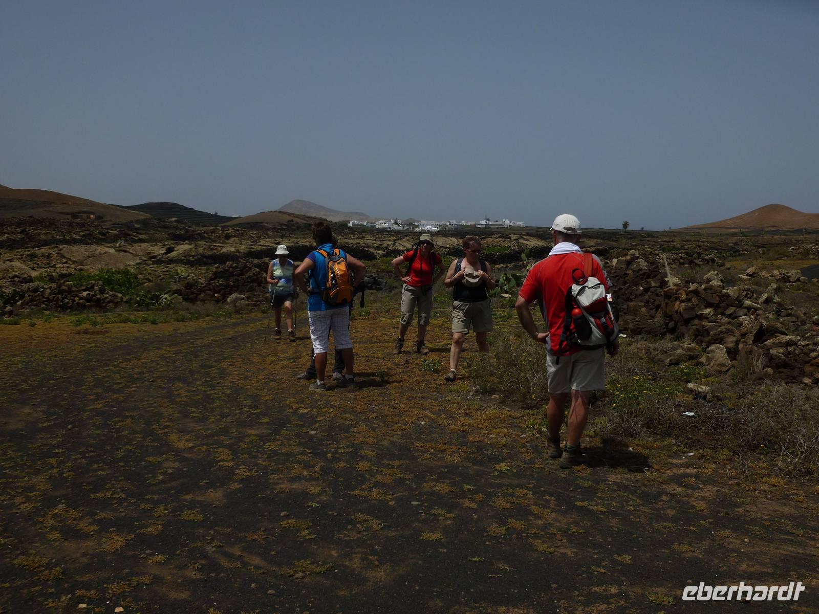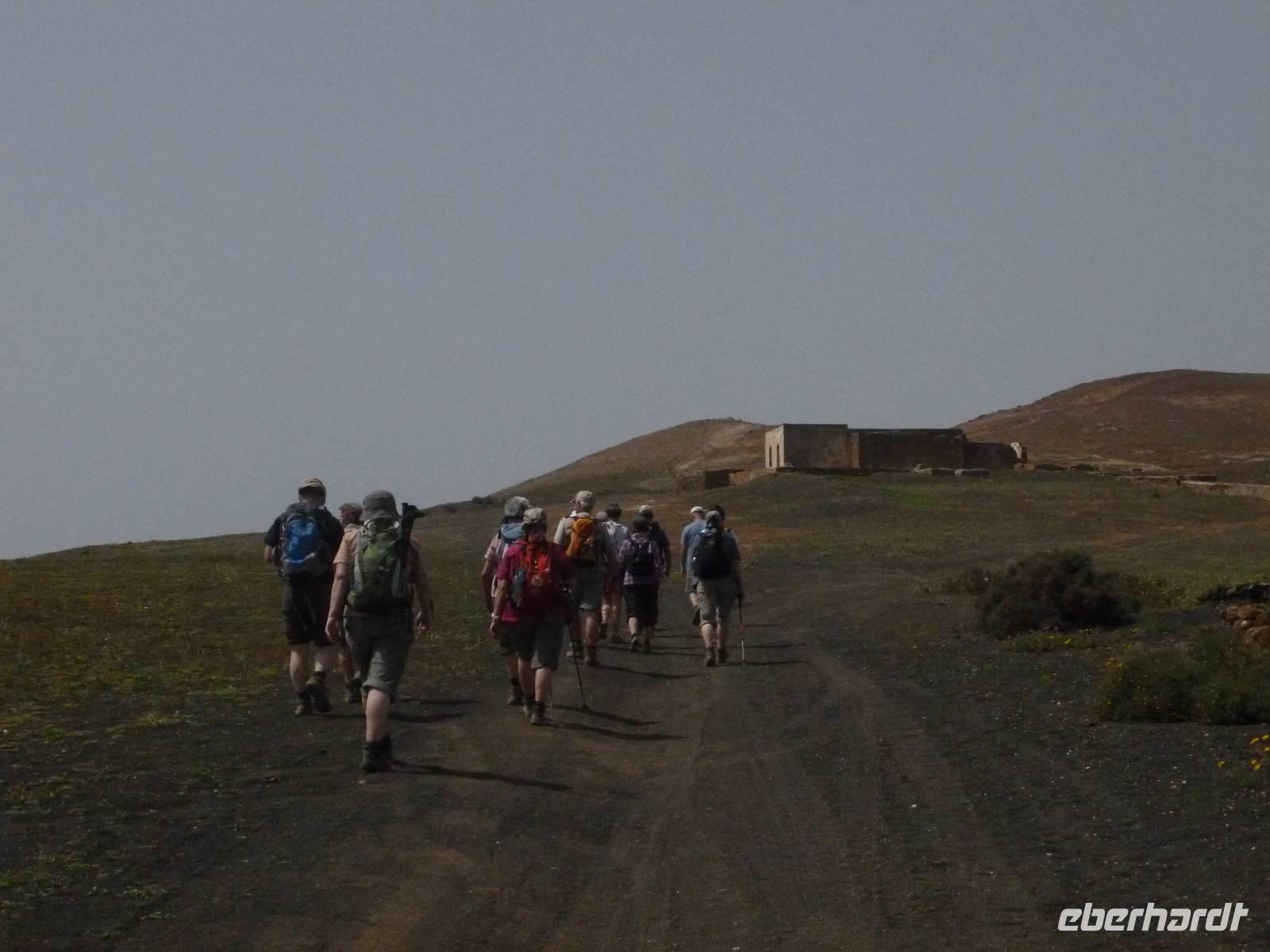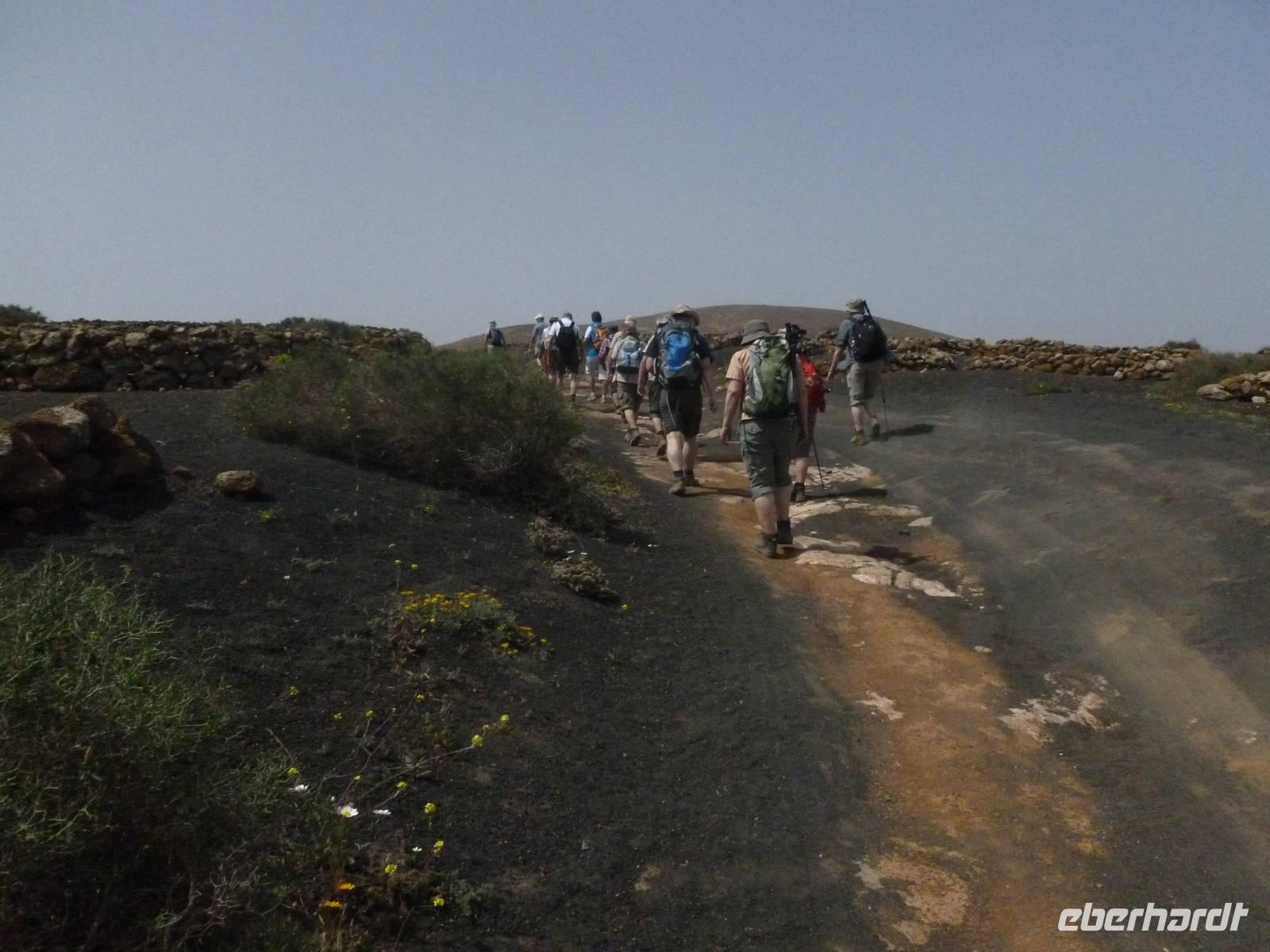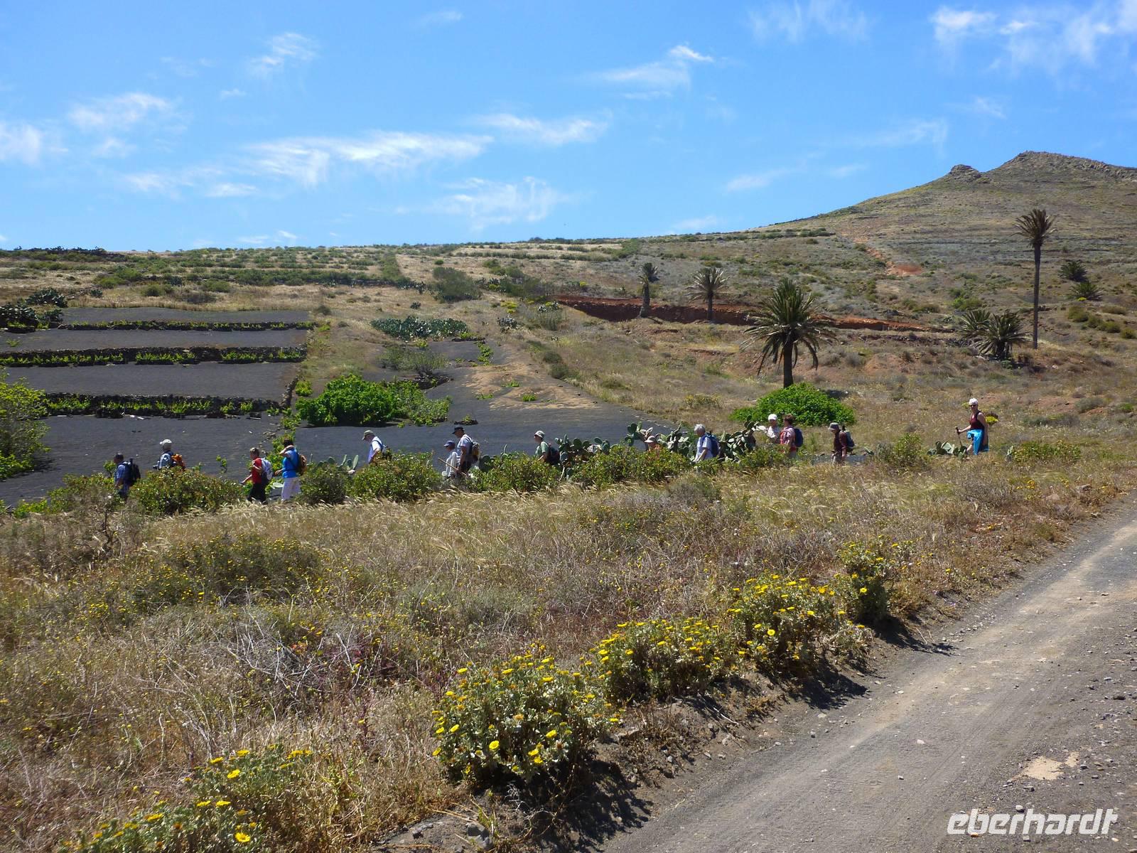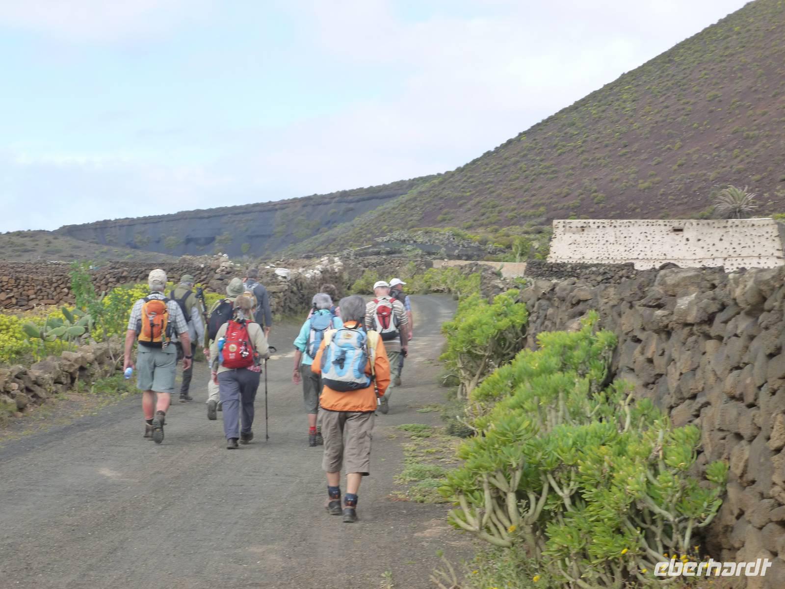 Heute konnten wir das ausgiebige Frühstück noch länger genießen, da uns Roland erst gegen 10 Uhr vom Hotel abgeholt hatte. Unser heutiger Anfangspunkt lag nur ca. 20 Minuten entfernt, oberhalb von La Asomada. Der erste Teil ging leicht bergan, immer in Richtung „Guardilama". Die Sicht war leider etwas diesig, aber dafür zeigte sich die Sonne heute wieder von ihrer besten Seite. Auch die Temperaturen waren deutlich gestiegen. Links und rechts konnten wir immer wieder die mühsam angelegten Weinfelder begutachten, die sehr akribisch von den Landsleuten gepflegt wurden. Auch Rolands Haus konnten wir von Weitem sichten. Weiter ging es nun bergauf in Richtung des Vulkanes „Guardilamas". Dort sind wir am Kraterrand oberhalb in Richtung des Vulkanes „Montana Tinasoria" gelaufen. Der Abstieg war dann stückchenweise sehr steil durch weiche, schwarze Kiesfelder in denen immer wieder bunte Blumen aufblitzten. Anschließend stiegen wir zum Tinasoria auf und machten an der Ruine Rast, um uns bei etwas Obst und einem Müsliriegel zu stärken. Zwischendurch erklärte uns Roland allerlei Wissenswertes aus dem Leben der Lanzarotener. Unser Wanderweg führte nun einmal auf und ab, bis wir unser Ziel, die Bodega „El Chupadero" in Sicht hatten. Das kleine Restaurant, das die Deutsche Barbara seit vielen Jahren betreibt, ist sehr individuell, da keine großen Gruppen abgefertigt werden. Somit konnten wir die verschiedenen Weine bei Serrano-Schinken und Ziegenkäse ganz abseits des Massentourismus genießen. Der Abschied fiel uns sichtlich schwer...