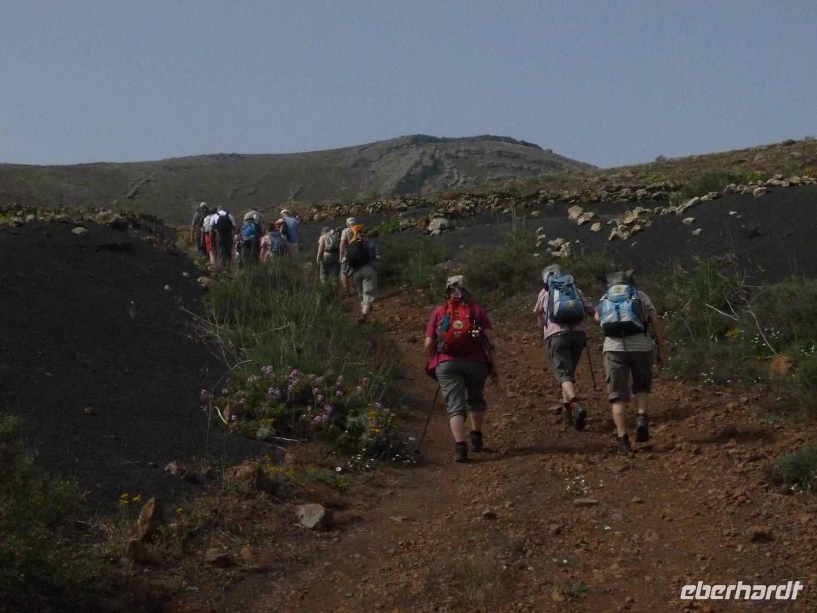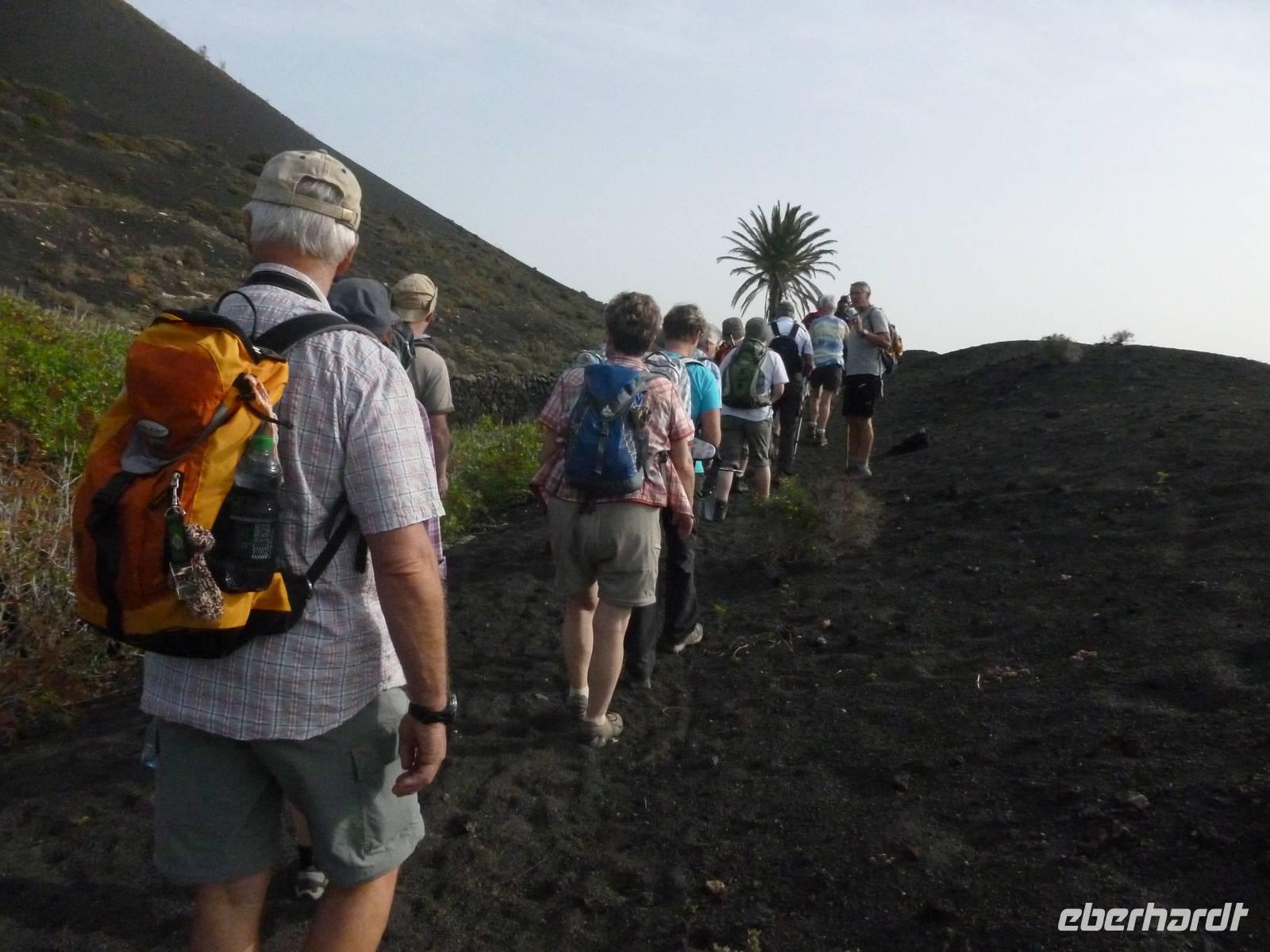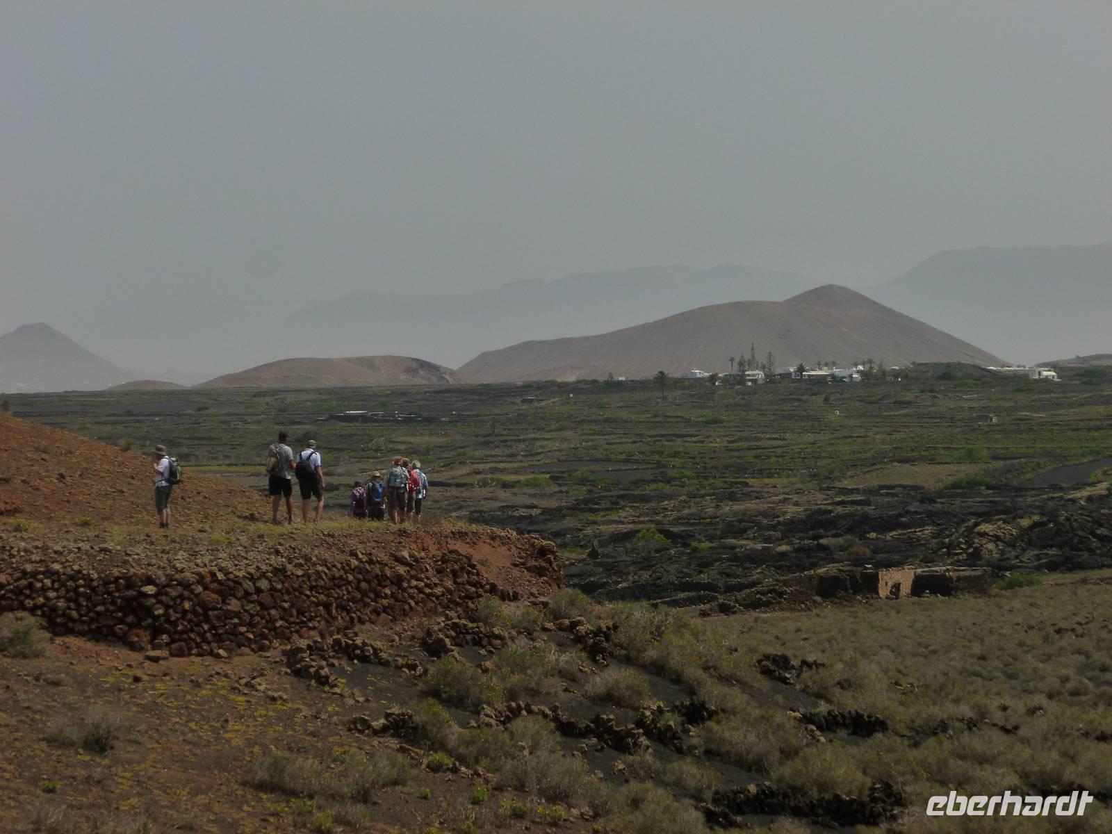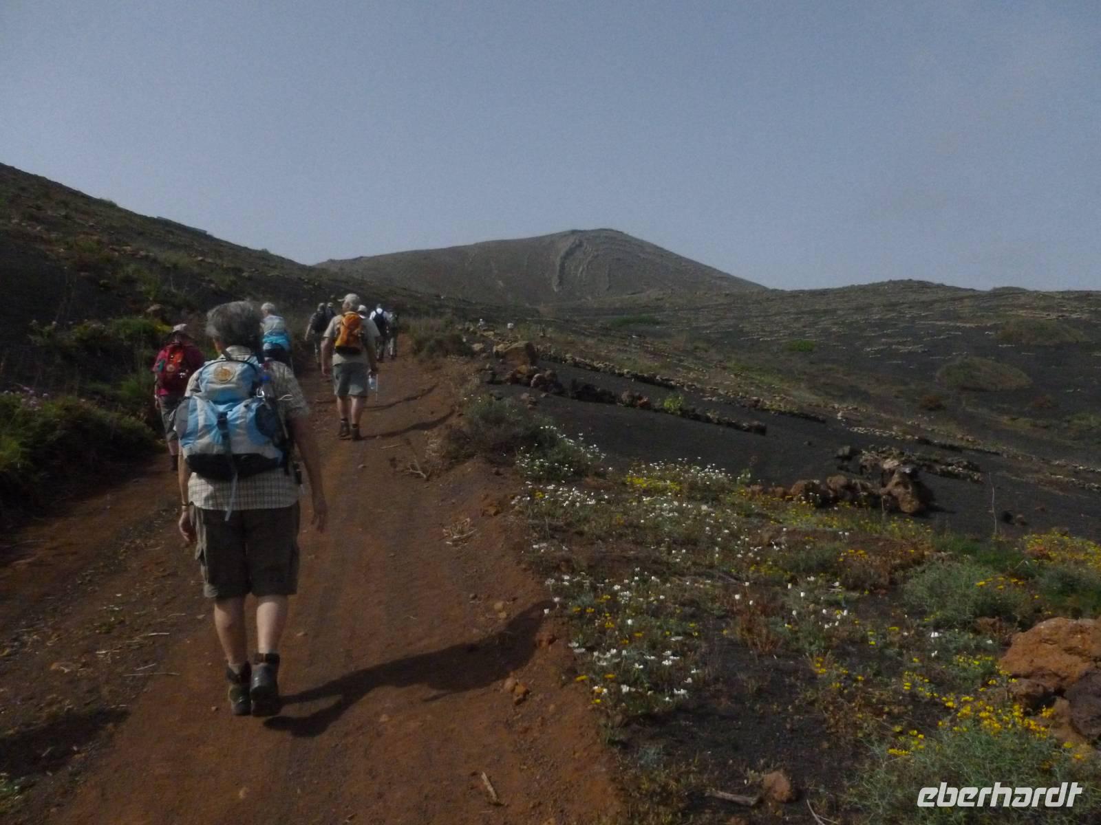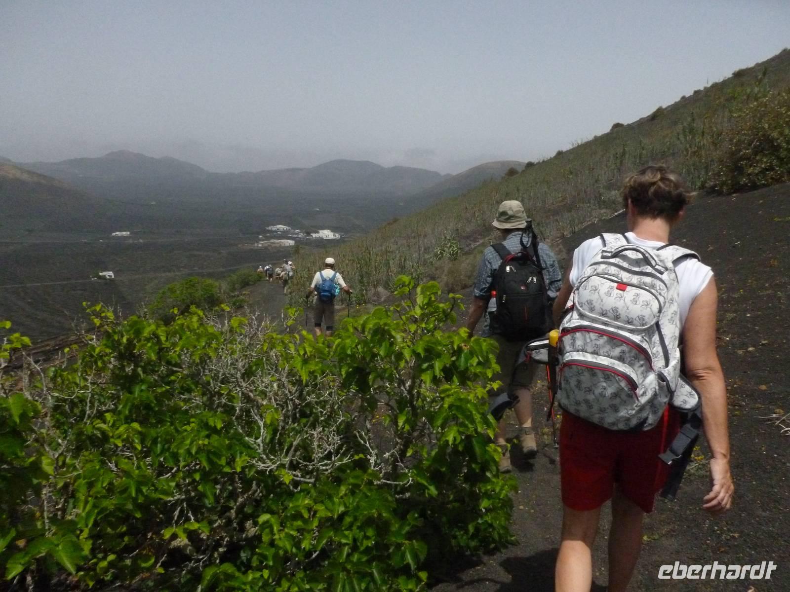 Heute konnten wir das ausgiebige Frühstück noch länger genießen, da uns Roland erst gegen 10 Uhr vom Hotel abgeholt hatte. Unser heutiger Anfangspunkt lag nur ca. 20 Minuten entfernt, oberhalb von La Asomada. Der erste Teil ging leicht bergan, immer in Richtung „Guardilama". Die Sicht war leider etwas diesig, aber dafür zeigte sich die Sonne heute wieder von ihrer besten Seite. Auch die Temperaturen waren deutlich gestiegen. Links und rechts konnten wir immer wieder die mühsam angelegten Weinfelder begutachten, die sehr akribisch von den Landsleuten gepflegt wurden. Auch Rolands Haus konnten wir von Weitem sichten. Weiter ging es nun bergauf in Richtung des Vulkanes „Guardilamas". Dort sind wir am Kraterrand oberhalb in Richtung des Vulkanes „Montana Tinasoria" gelaufen. Der Abstieg war dann stückchenweise sehr steil durch weiche, schwarze Kiesfelder in denen immer wieder bunte Blumen aufblitzten. Anschließend stiegen wir zum Tinasoria auf und machten an der Ruine Rast, um uns bei etwas Obst und einem Müsliriegel zu stärken. Zwischendurch erklärte uns Roland allerlei Wissenswertes aus dem Leben der Lanzarotener. Unser Wanderweg führte nun einmal auf und ab, bis wir unser Ziel, die Bodega „El Chupadero" in Sicht hatten. Das kleine Restaurant, das die Deutsche Barbara seit vielen Jahren betreibt, ist sehr individuell, da keine großen Gruppen abgefertigt werden. Somit konnten wir die verschiedenen Weine bei Serrano-Schinken und Ziegenkäse ganz abseits des Massentourismus genießen. Der Abschied fiel uns sichtlich schwer...