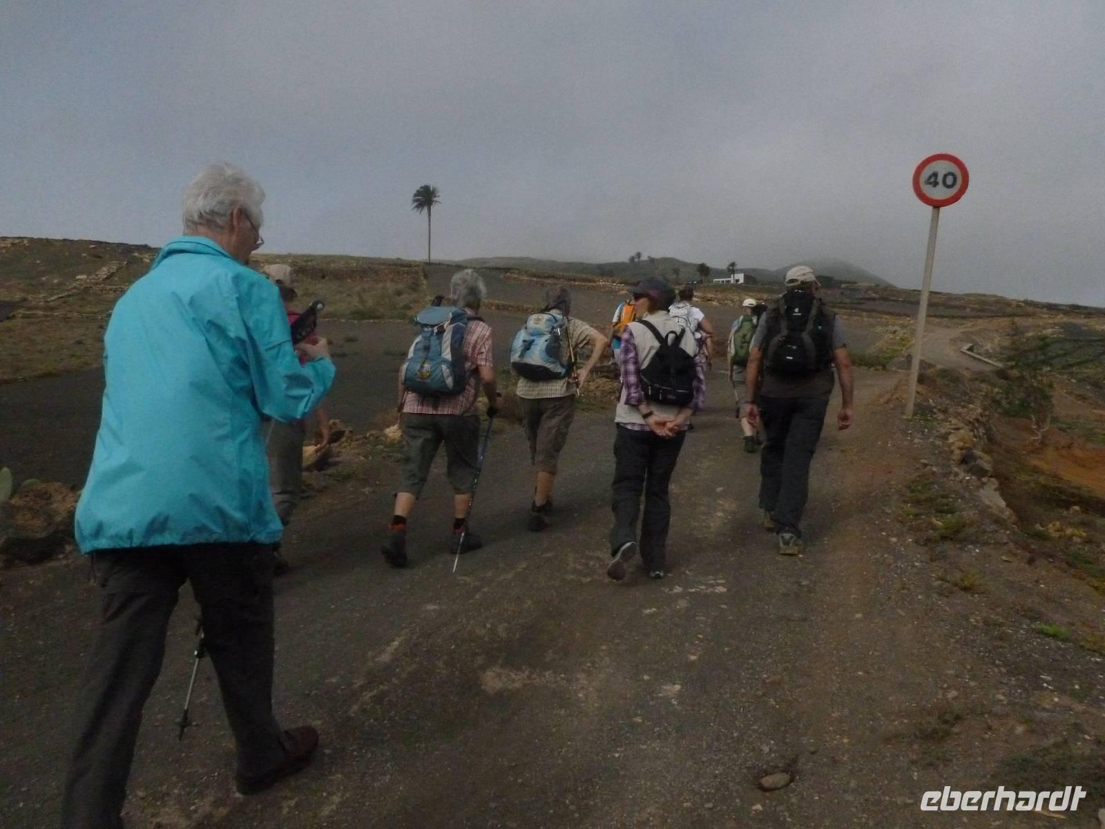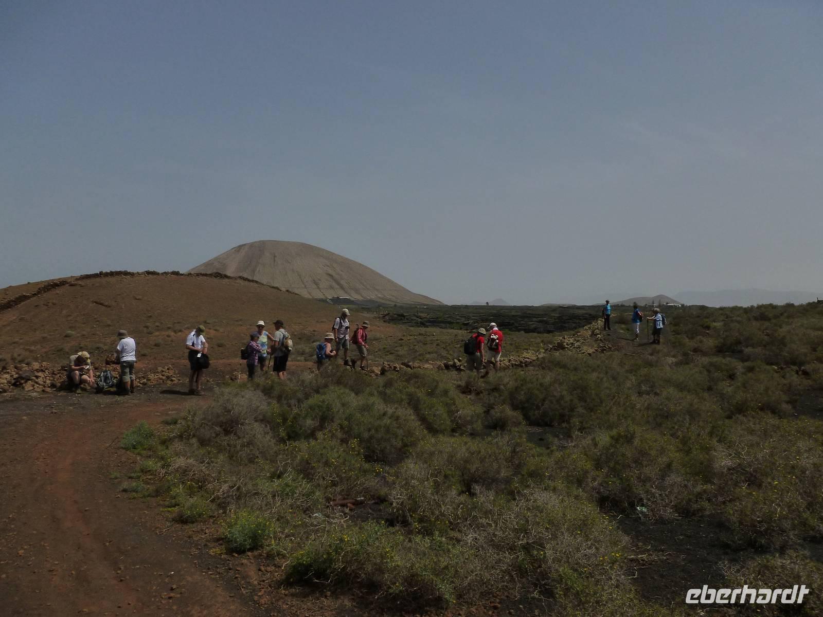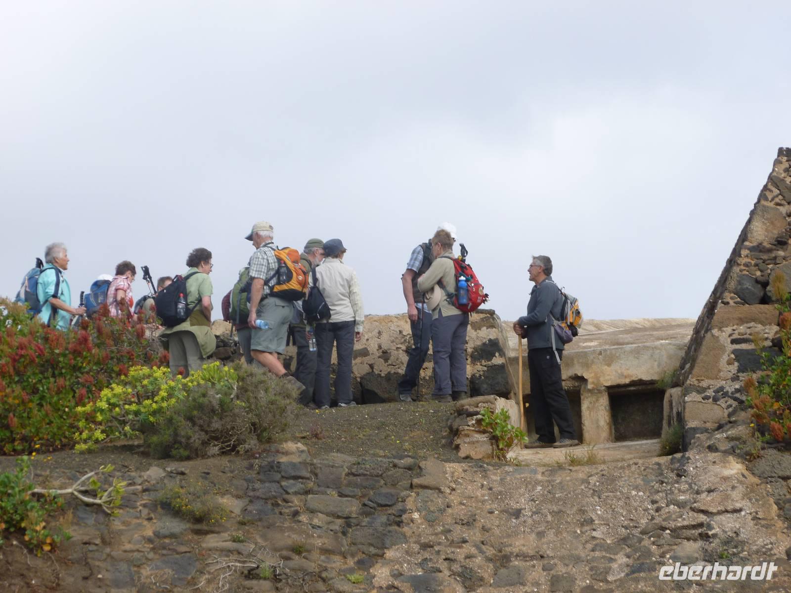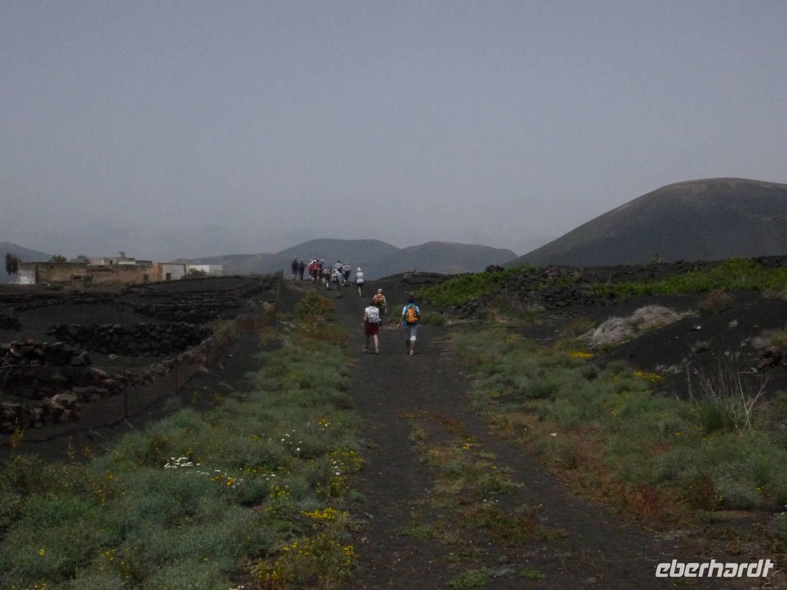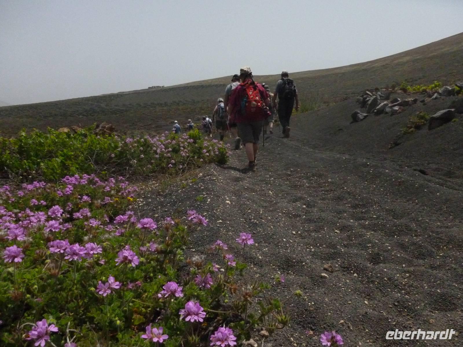 Heute konnten wir das ausgiebige Frühstück noch länger genießen, da uns Roland erst gegen 10 Uhr vom Hotel abgeholt hatte. Unser heutiger Anfangspunkt lag nur ca. 20 Minuten entfernt, oberhalb von La Asomada. Der erste Teil ging leicht bergan, immer in Richtung „Guardilama". Die Sicht war leider etwas diesig, aber dafür zeigte sich die Sonne heute wieder von ihrer besten Seite. Auch die Temperaturen waren deutlich gestiegen. Links und rechts konnten wir immer wieder die mühsam angelegten Weinfelder begutachten, die sehr akribisch von den Landsleuten gepflegt wurden. Auch Rolands Haus konnten wir von Weitem sichten. Weiter ging es nun bergauf in Richtung des Vulkanes „Guardilamas". Dort sind wir am Kraterrand oberhalb in Richtung des Vulkanes „Montana Tinasoria" gelaufen. Der Abstieg war dann stückchenweise sehr steil durch weiche, schwarze Kiesfelder in denen immer wieder bunte Blumen aufblitzten. Anschließend stiegen wir zum Tinasoria auf und machten an der Ruine Rast, um uns bei etwas Obst und einem Müsliriegel zu stärken. Zwischendurch erklärte uns Roland allerlei Wissenswertes aus dem Leben der Lanzarotener. Unser Wanderweg führte nun einmal auf und ab, bis wir unser Ziel, die Bodega „El Chupadero" in Sicht hatten. Das kleine Restaurant, das die Deutsche Barbara seit vielen Jahren betreibt, ist sehr individuell, da keine großen Gruppen abgefertigt werden. Somit konnten wir die verschiedenen Weine bei Serrano-Schinken und Ziegenkäse ganz abseits des Massentourismus genießen. Der Abschied fiel uns sichtlich schwer...