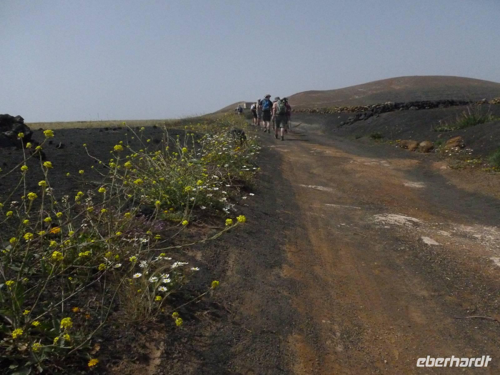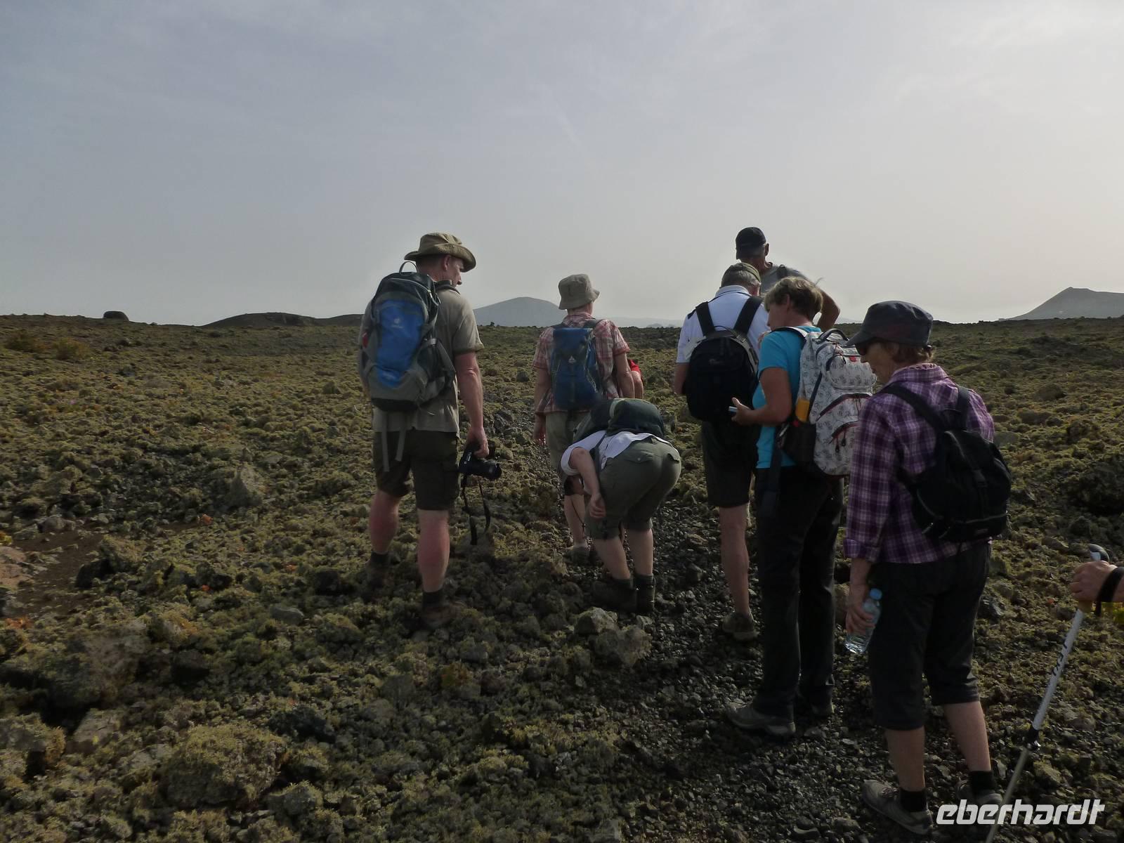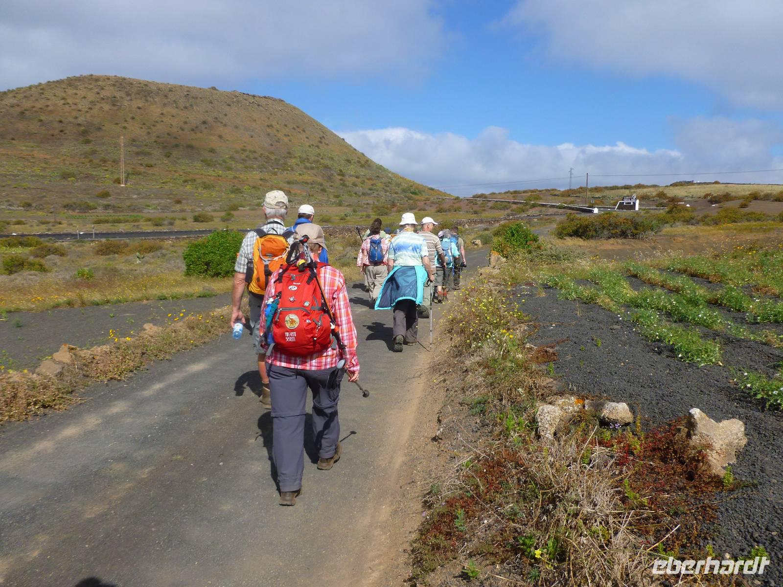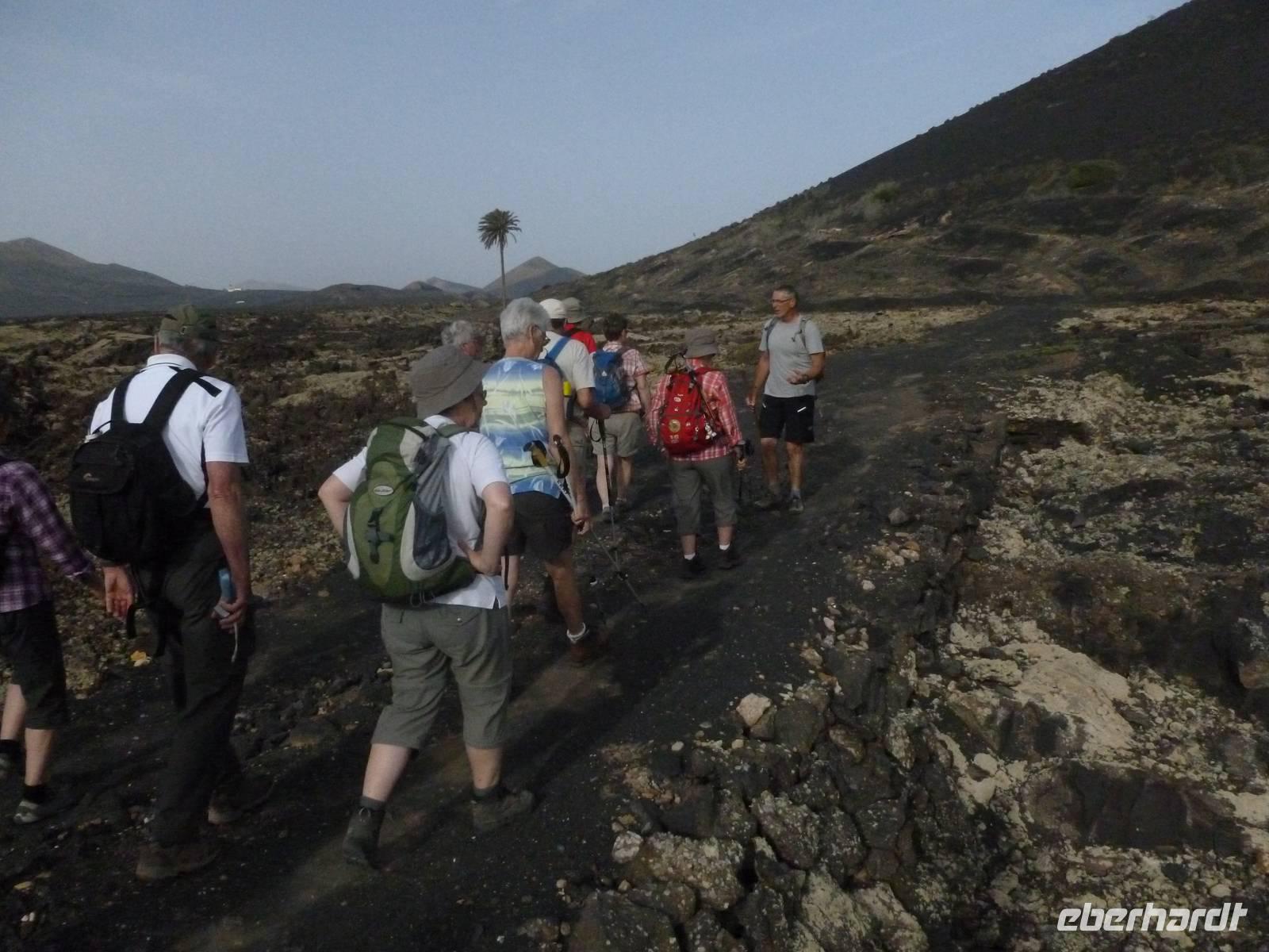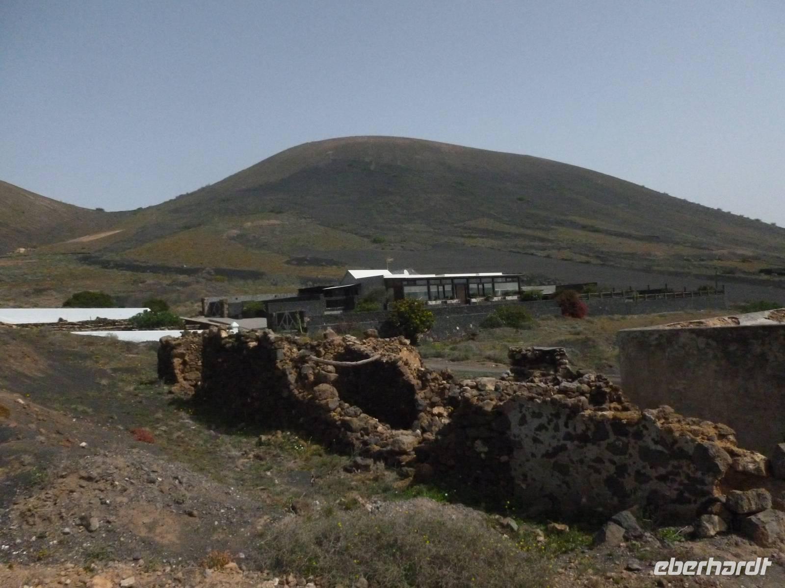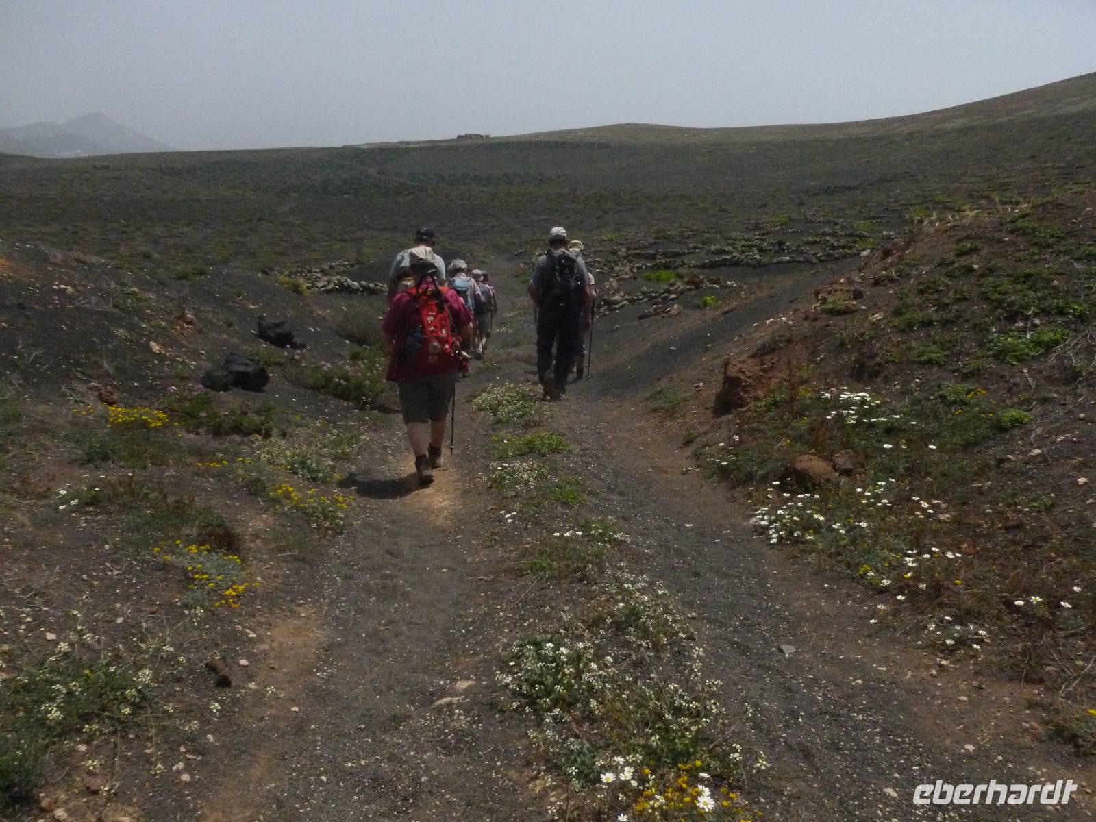 Heute konnten wir das ausgiebige Frühstück noch länger genießen, da uns Roland erst gegen 10 Uhr vom Hotel abgeholt hatte. Unser heutiger Anfangspunkt lag nur ca. 20 Minuten entfernt, oberhalb von La Asomada. Der erste Teil ging leicht bergan, immer in Richtung „Guardilama". Die Sicht war leider etwas diesig, aber dafür zeigte sich die Sonne heute wieder von ihrer besten Seite. Auch die Temperaturen waren deutlich gestiegen. Links und rechts konnten wir immer wieder die mühsam angelegten Weinfelder begutachten, die sehr akribisch von den Landsleuten gepflegt wurden. Auch Rolands Haus konnten wir von Weitem sichten. Weiter ging es nun bergauf in Richtung des Vulkanes „Guardilamas". Dort sind wir am Kraterrand oberhalb in Richtung des Vulkanes „Montana Tinasoria" gelaufen. Der Abstieg war dann stückchenweise sehr steil durch weiche, schwarze Kiesfelder in denen immer wieder bunte Blumen aufblitzten. Anschließend stiegen wir zum Tinasoria auf und machten an der Ruine Rast, um uns bei etwas Obst und einem Müsliriegel zu stärken. Zwischendurch erklärte uns Roland allerlei Wissenswertes aus dem Leben der Lanzarotener. Unser Wanderweg führte nun einmal auf und ab, bis wir unser Ziel, die Bodega „El Chupadero" in Sicht hatten. Das kleine Restaurant, das die Deutsche Barbara seit vielen Jahren betreibt, ist sehr individuell, da keine großen Gruppen abgefertigt werden. Somit konnten wir die verschiedenen Weine bei Serrano-Schinken und Ziegenkäse ganz abseits des Massentourismus genießen. Der Abschied fiel uns sichtlich schwer...
