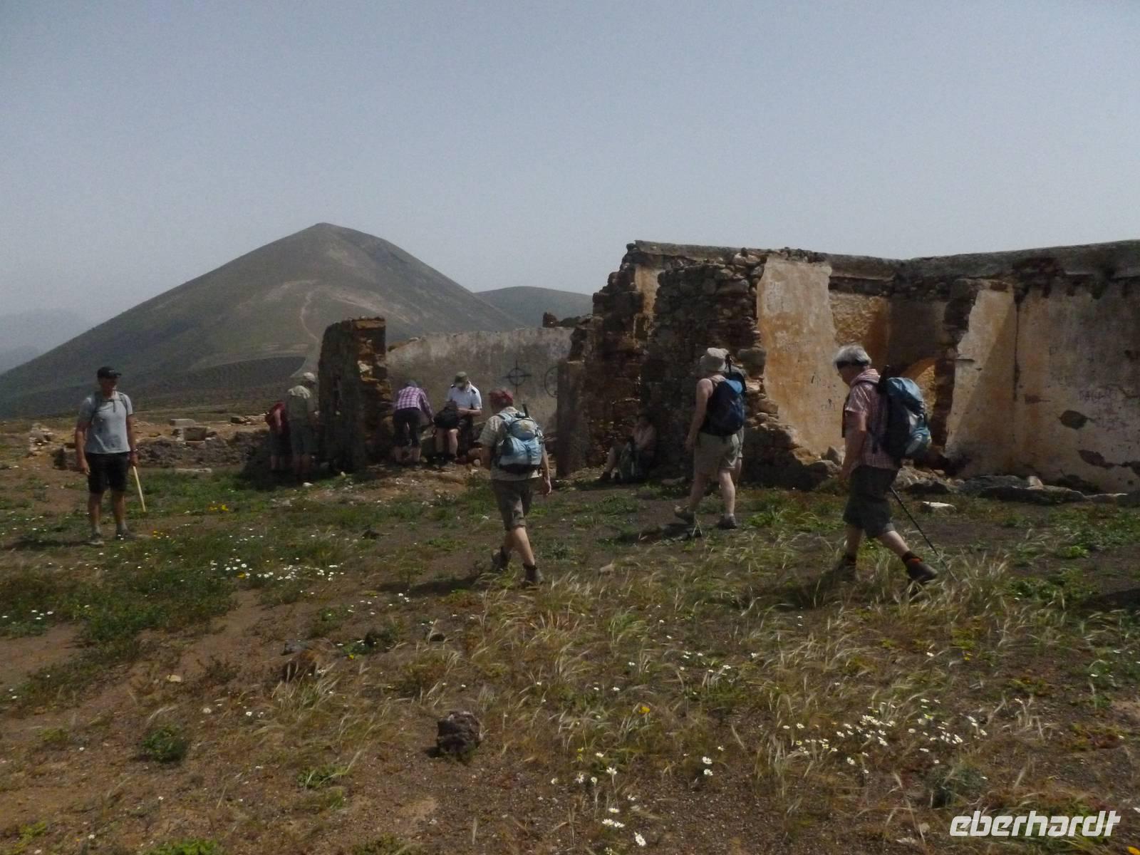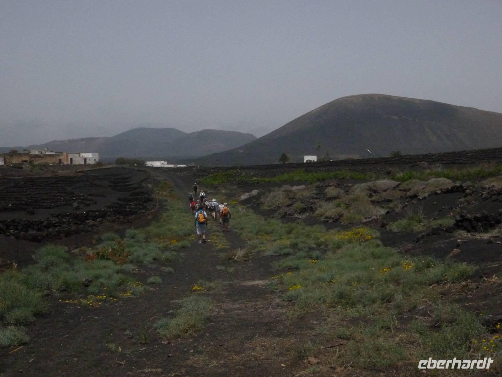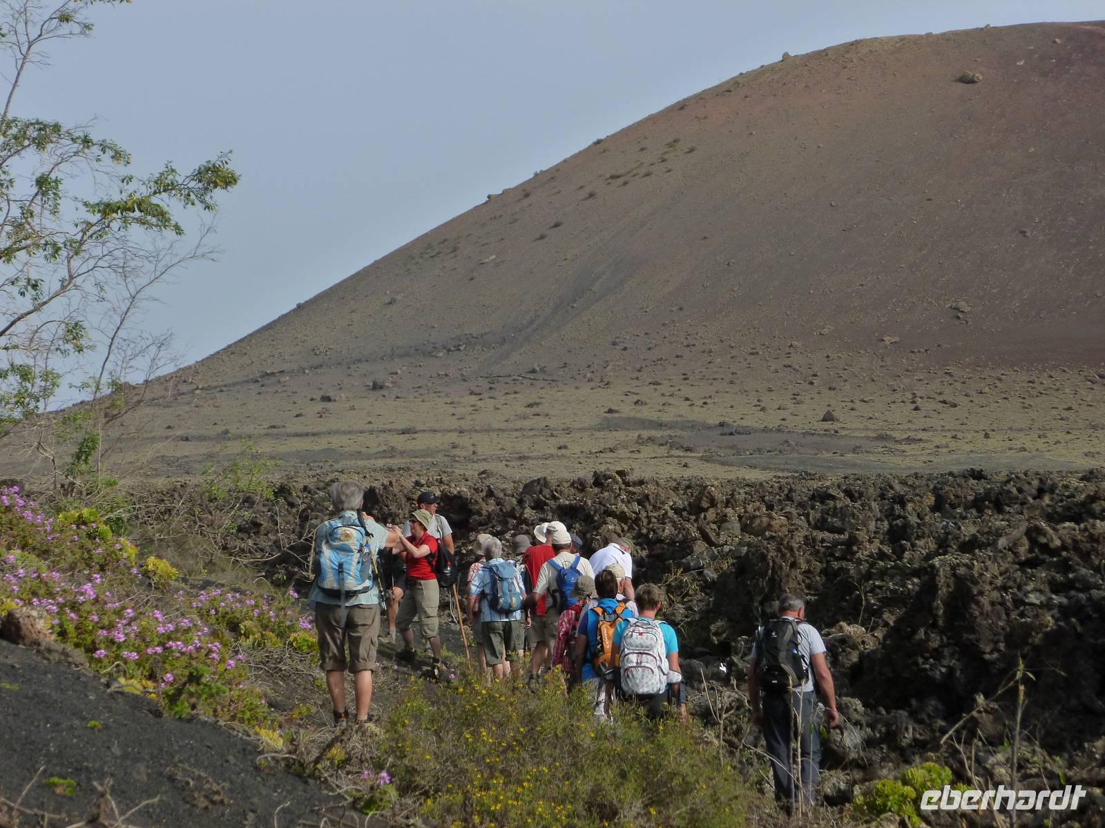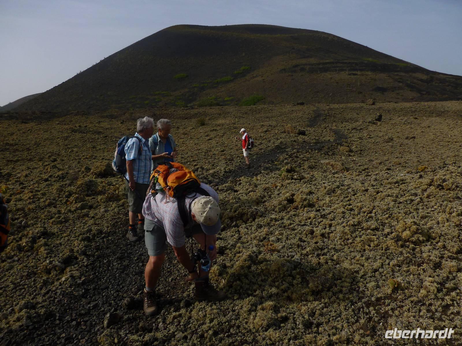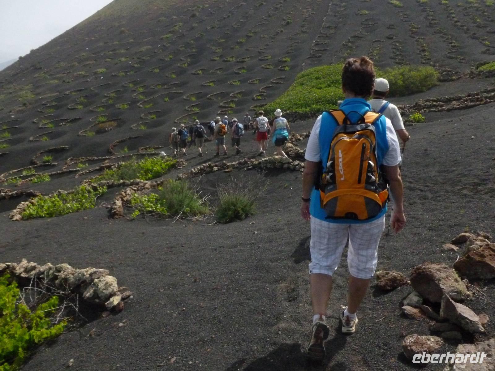 Heute konnten wir das ausgiebige Frühstück noch länger genießen, da uns Roland erst gegen 10 Uhr vom Hotel abgeholt hatte. Unser heutiger Anfangspunkt lag nur ca. 20 Minuten entfernt, oberhalb von La Asomada. Der erste Teil ging leicht bergan, immer in Richtung „Guardilama". Die Sicht war leider etwas diesig, aber dafür zeigte sich die Sonne heute wieder von ihrer besten Seite. Auch die Temperaturen waren deutlich gestiegen. Links und rechts konnten wir immer wieder die mühsam angelegten Weinfelder begutachten, die sehr akribisch von den Landsleuten gepflegt wurden. Auch Rolands Haus konnten wir von Weitem sichten. Weiter ging es nun bergauf in Richtung des Vulkanes „Guardilamas". Dort sind wir am Kraterrand oberhalb in Richtung des Vulkanes „Montana Tinasoria" gelaufen. Der Abstieg war dann stückchenweise sehr steil durch weiche, schwarze Kiesfelder in denen immer wieder bunte Blumen aufblitzten. Anschließend stiegen wir zum Tinasoria auf und machten an der Ruine Rast, um uns bei etwas Obst und einem Müsliriegel zu stärken. Zwischendurch erklärte uns Roland allerlei Wissenswertes aus dem Leben der Lanzarotener. Unser Wanderweg führte nun einmal auf und ab, bis wir unser Ziel, die Bodega „El Chupadero" in Sicht hatten. Das kleine Restaurant, das die Deutsche Barbara seit vielen Jahren betreibt, ist sehr individuell, da keine großen Gruppen abgefertigt werden. Somit konnten wir die verschiedenen Weine bei Serrano-Schinken und Ziegenkäse ganz abseits des Massentourismus genießen. Der Abschied fiel uns sichtlich schwer...